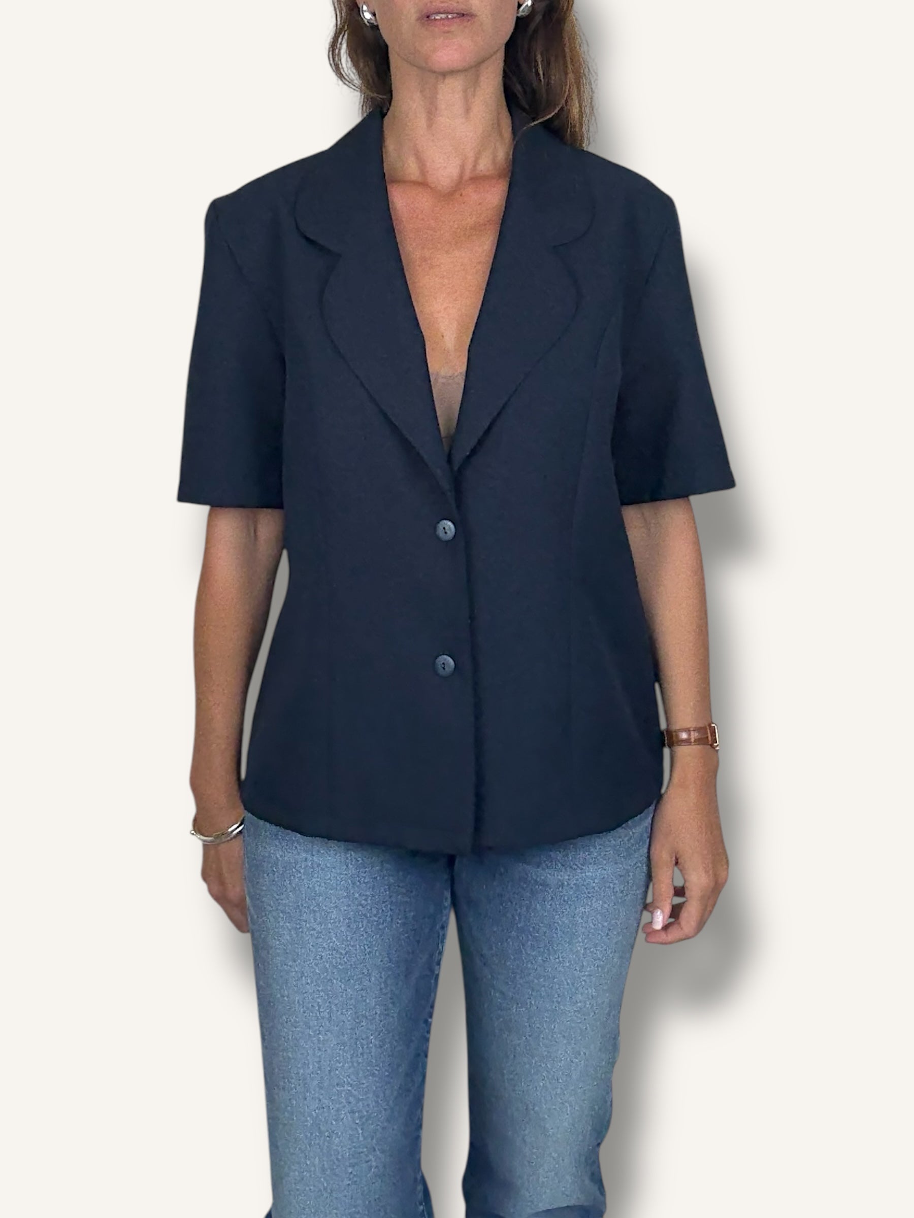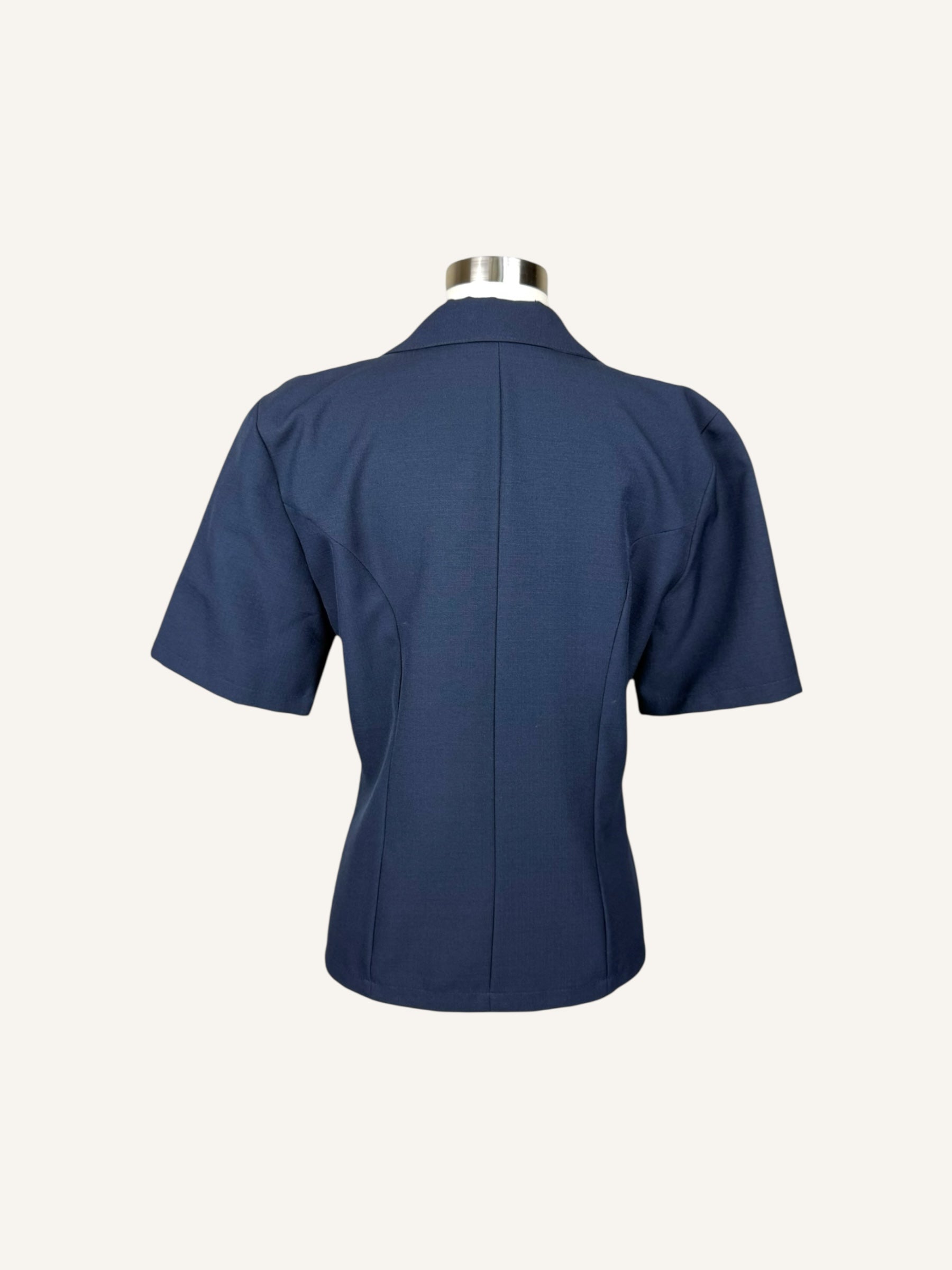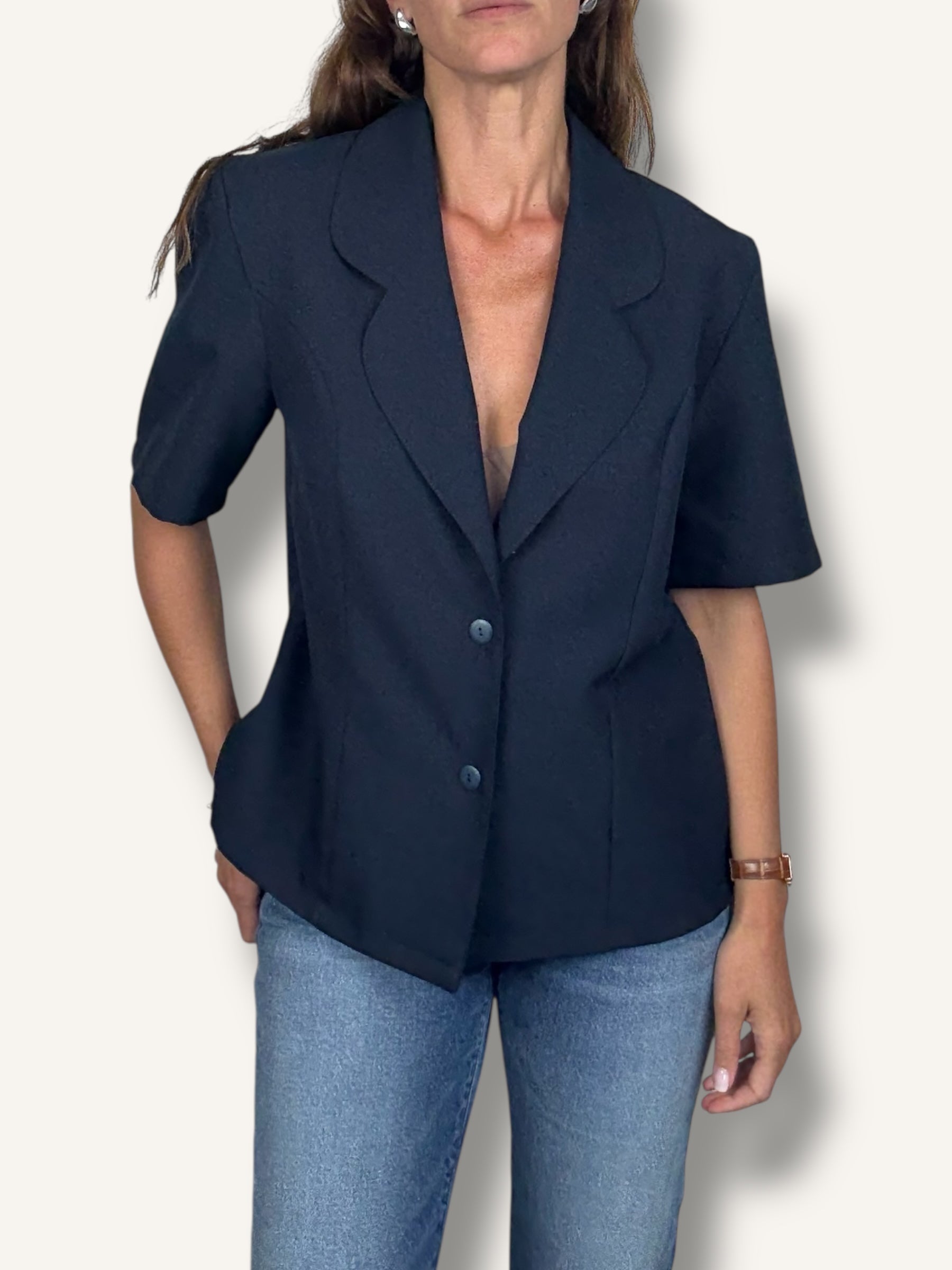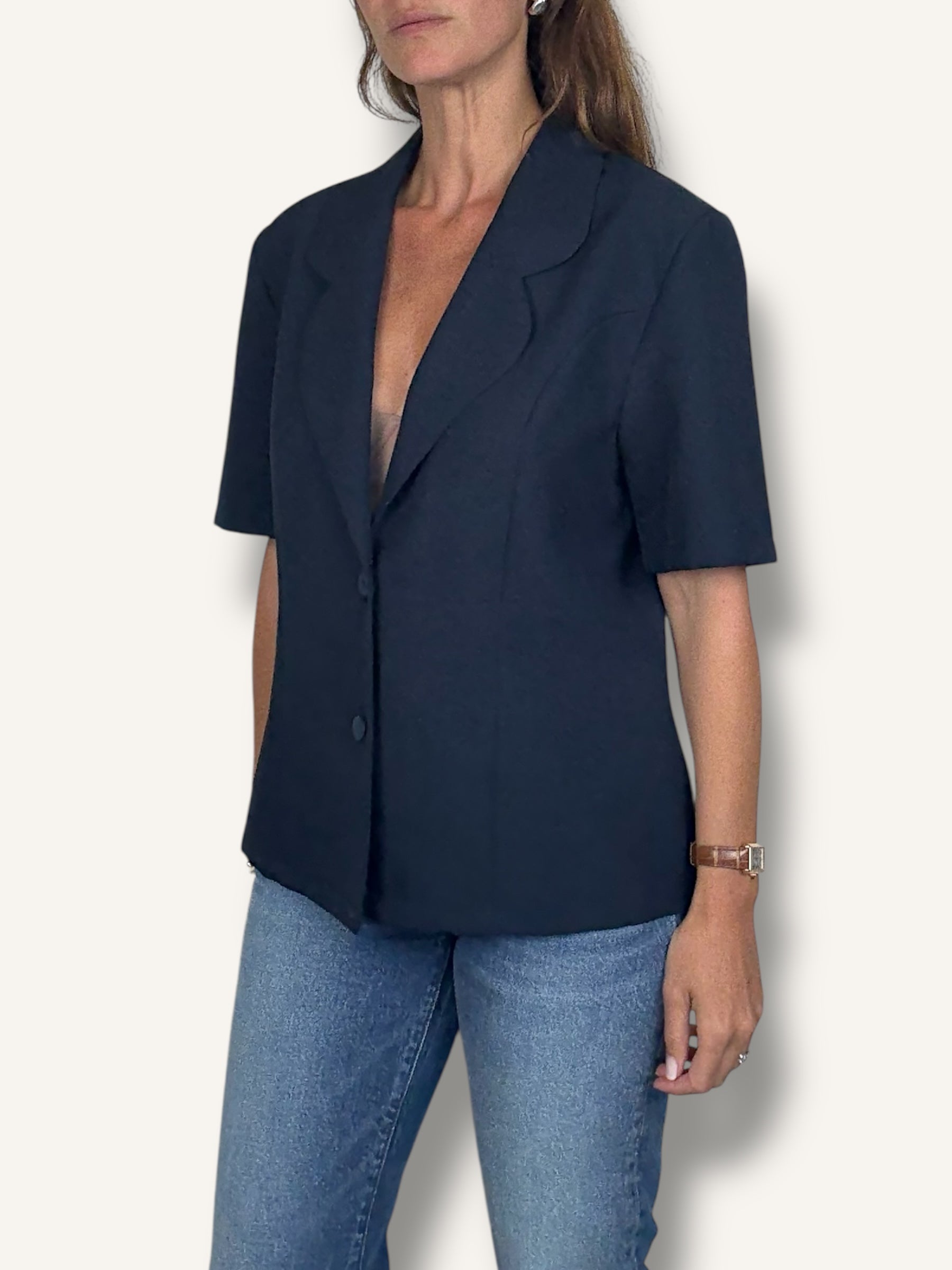 Vintage light tailored blazer from the 90's in a deep navy with short sleeves and a sculpted, nipped-in waist. Designed with sharp notched lapels, subtle shoulder structure, and two buttons at the front.