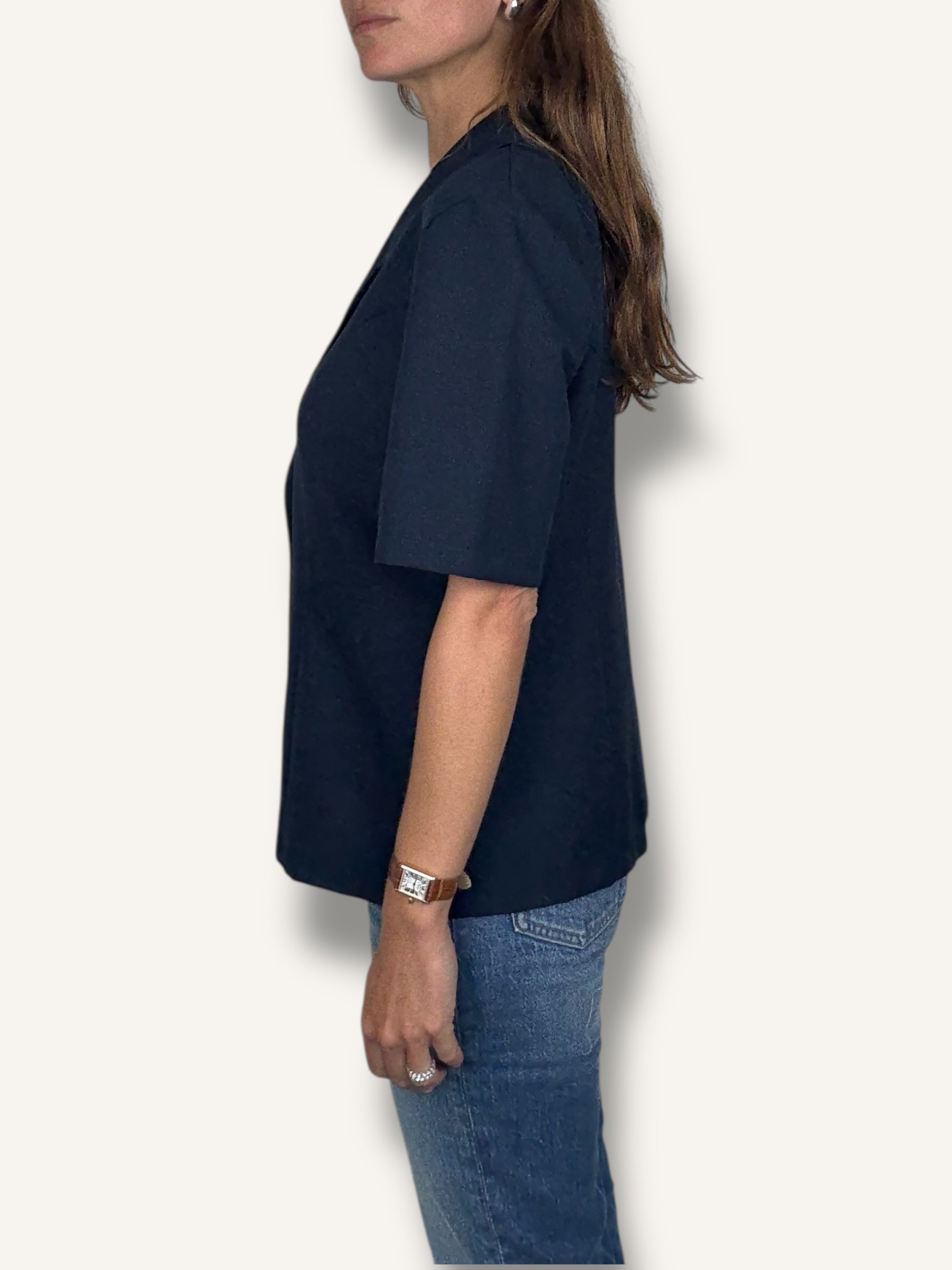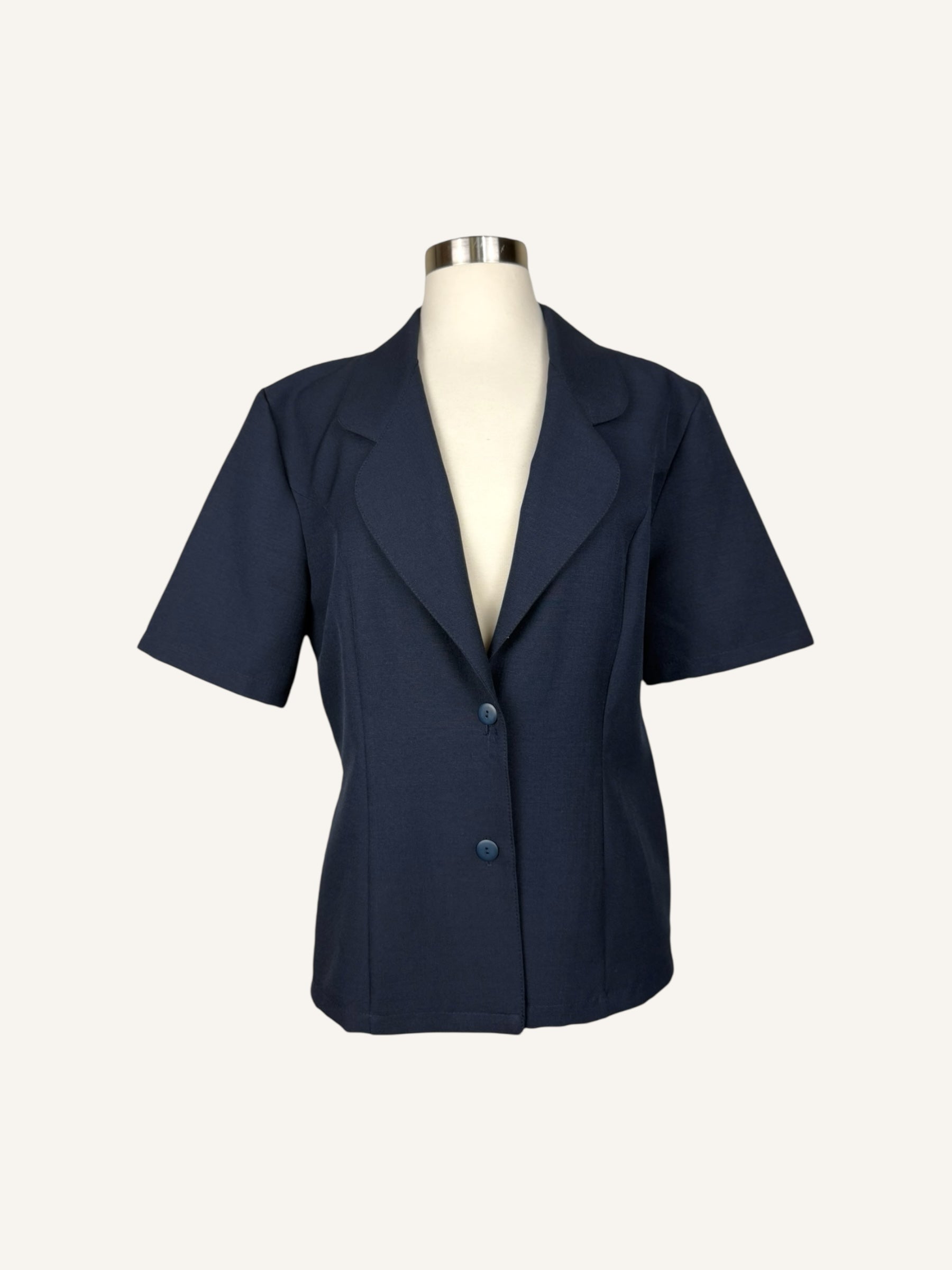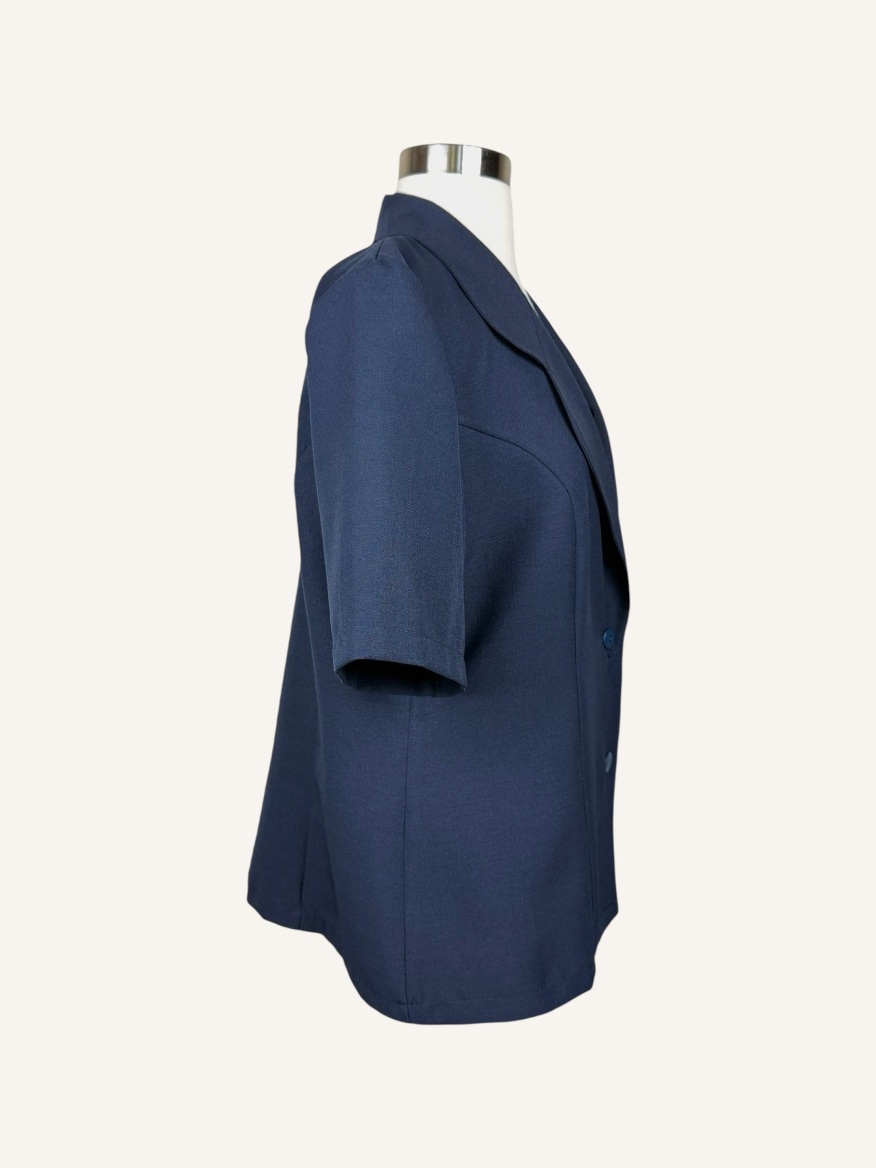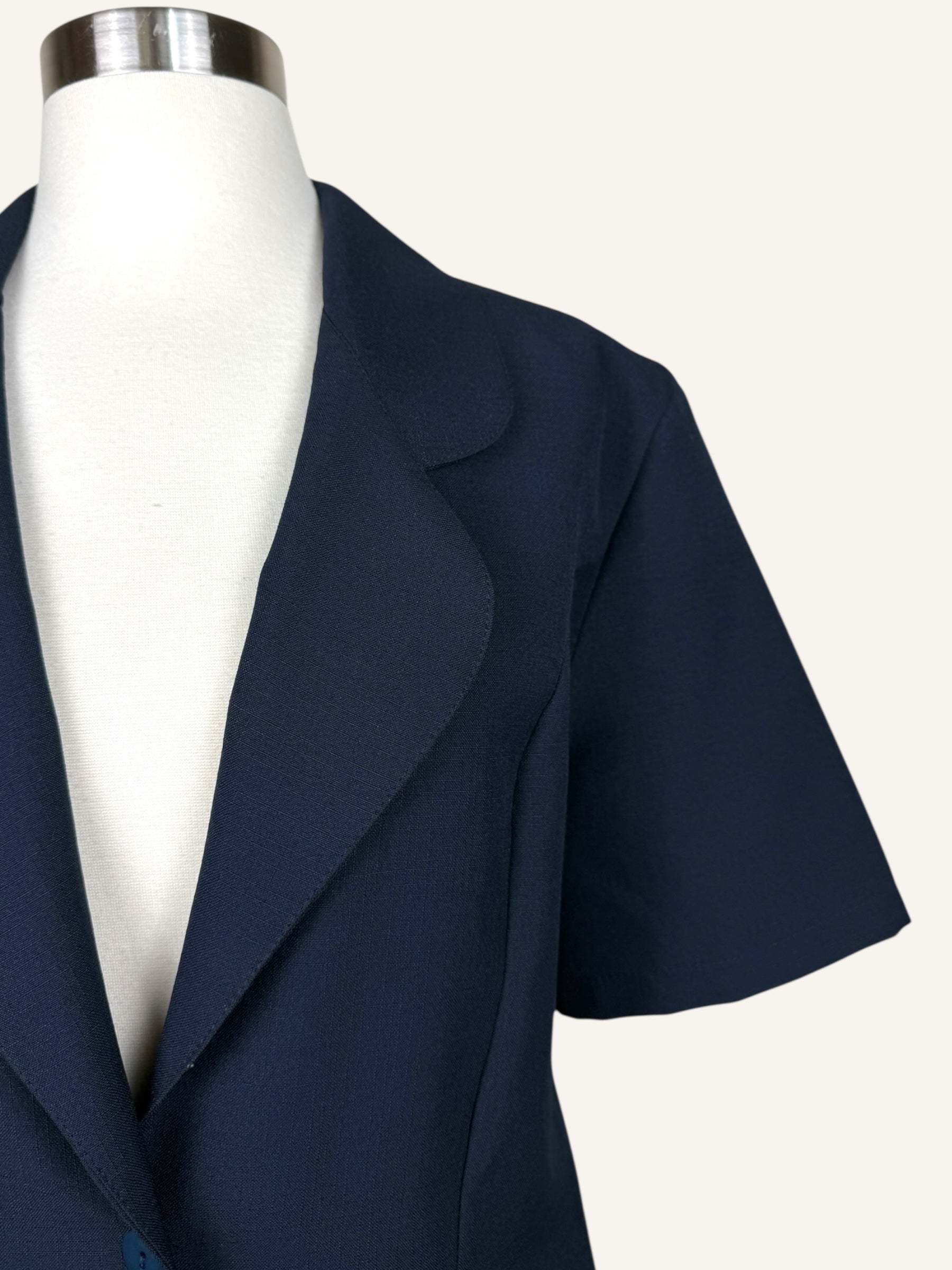 Vintage light tailored blazer from the 90's in a deep navy with short sleeves and a sculpted, nipped-in waist. Designed with sharp notched lapels, subtle shoulder structure, and two buttons at the front.