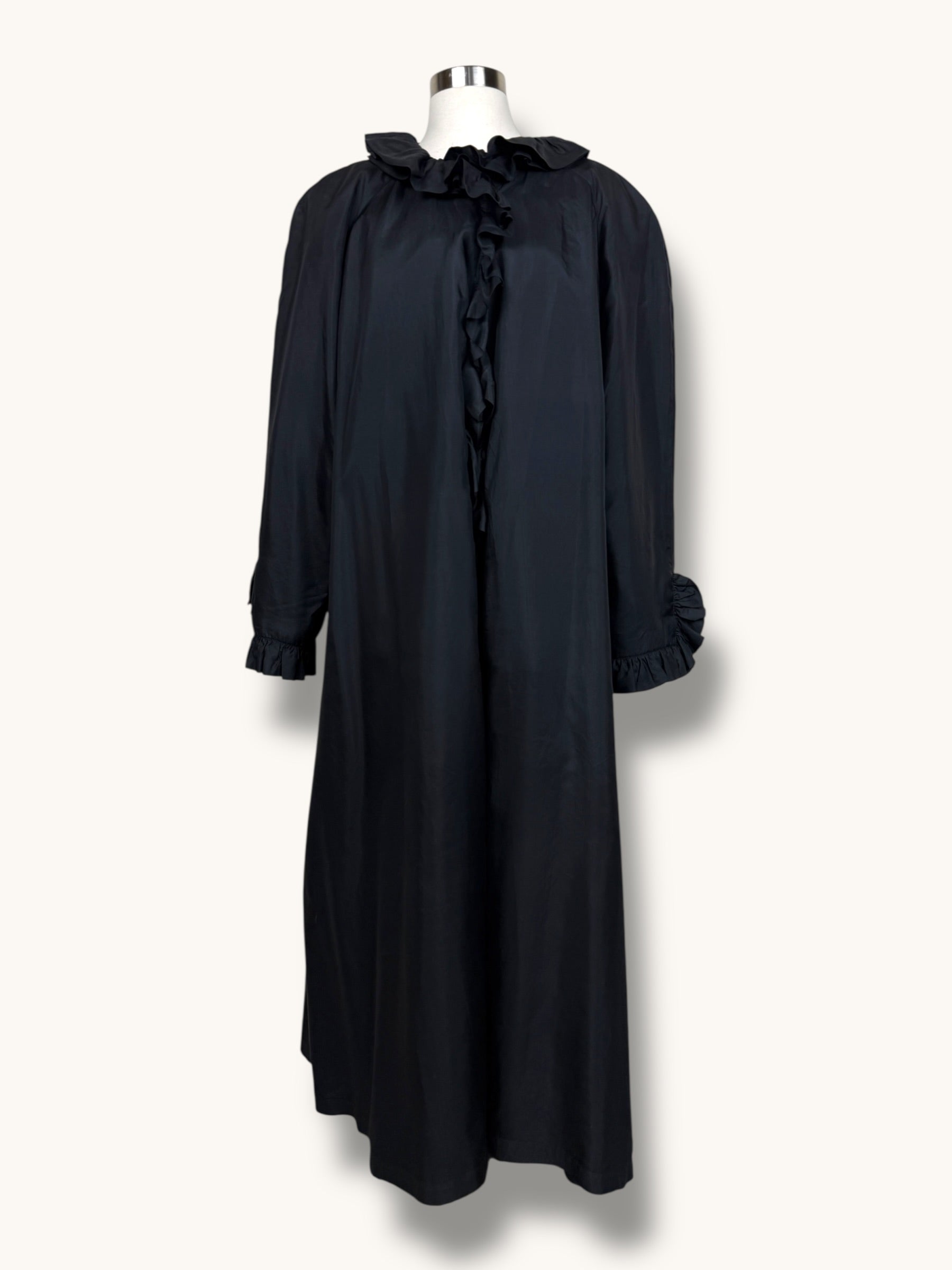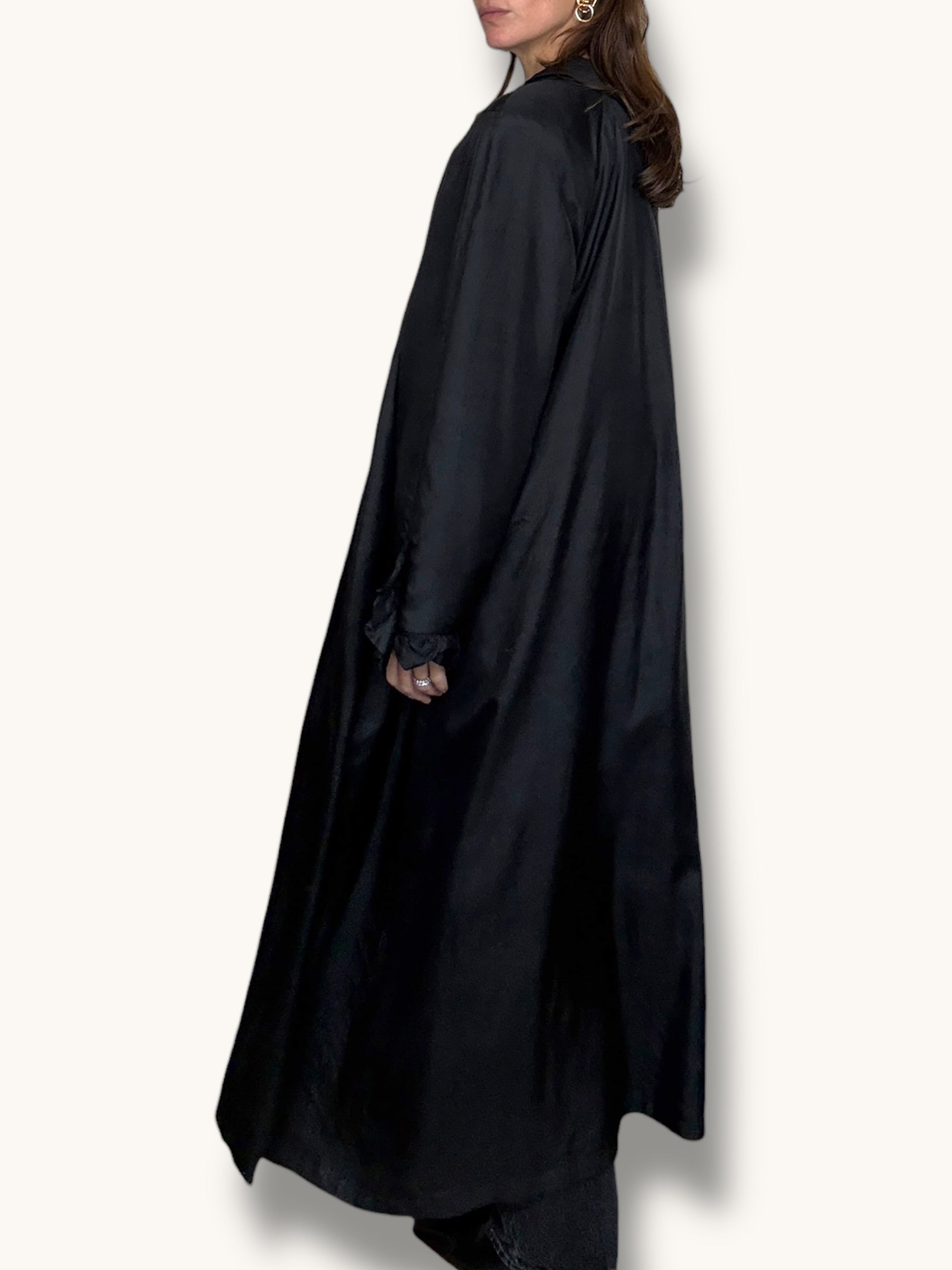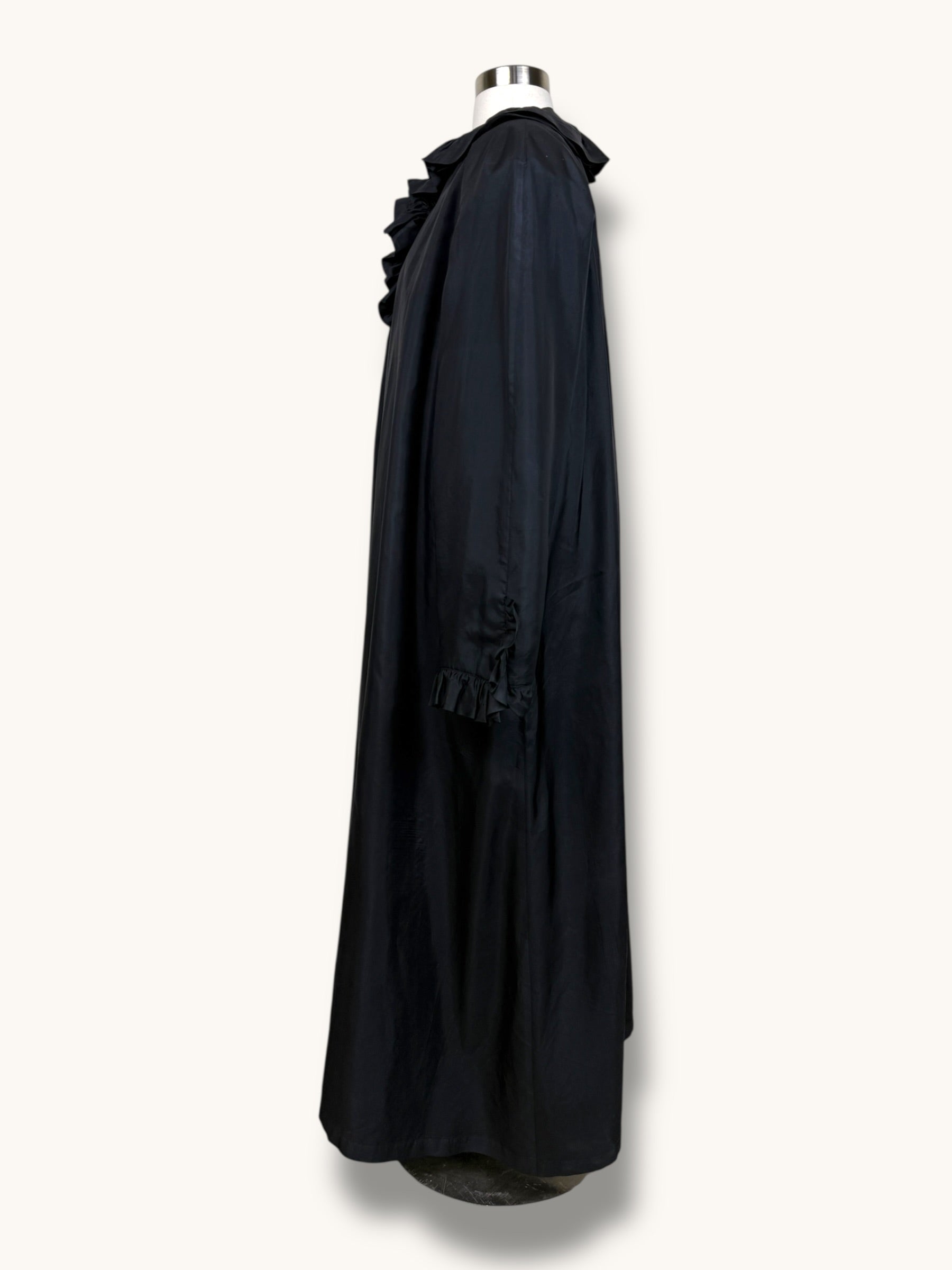 A dramatic vintage black maxi coat crafted in 100% Silk from Bergdorf Goodman and Jean Galle , lightweight fabric with a subtle soft sheen that moves beautifully with the body. Designed in a sweeping, voluminous silhouette, it features a romantic ruffled neckline that continues down the front placket, creating elegant movement and texture. The long raglan sleeves are finished with delicate ruffled cuffs, adding to its effortless, poetic feel. The cut is generous and airy, allowing it to be worn fully closed for a refined statement or slightly open and layered over denim for a modern, undone look. Timeless, understated, and quietly powerful — the kind of black dress that speaks without trying.