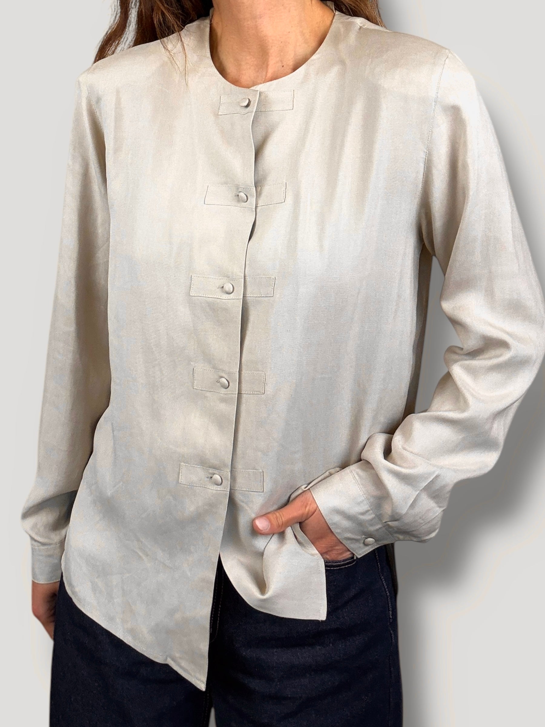 A refined vintage find in a soft taupe hue, this lightweight shirt features a minimalist silhouette with tonal fabric-covered buttons and a clean, collarless neckline. The fluid cut and subtle sheen add an understated elegance, making it perfect for layering or wearing on its own. A timeless piece that transitions effortlessly from day to night.