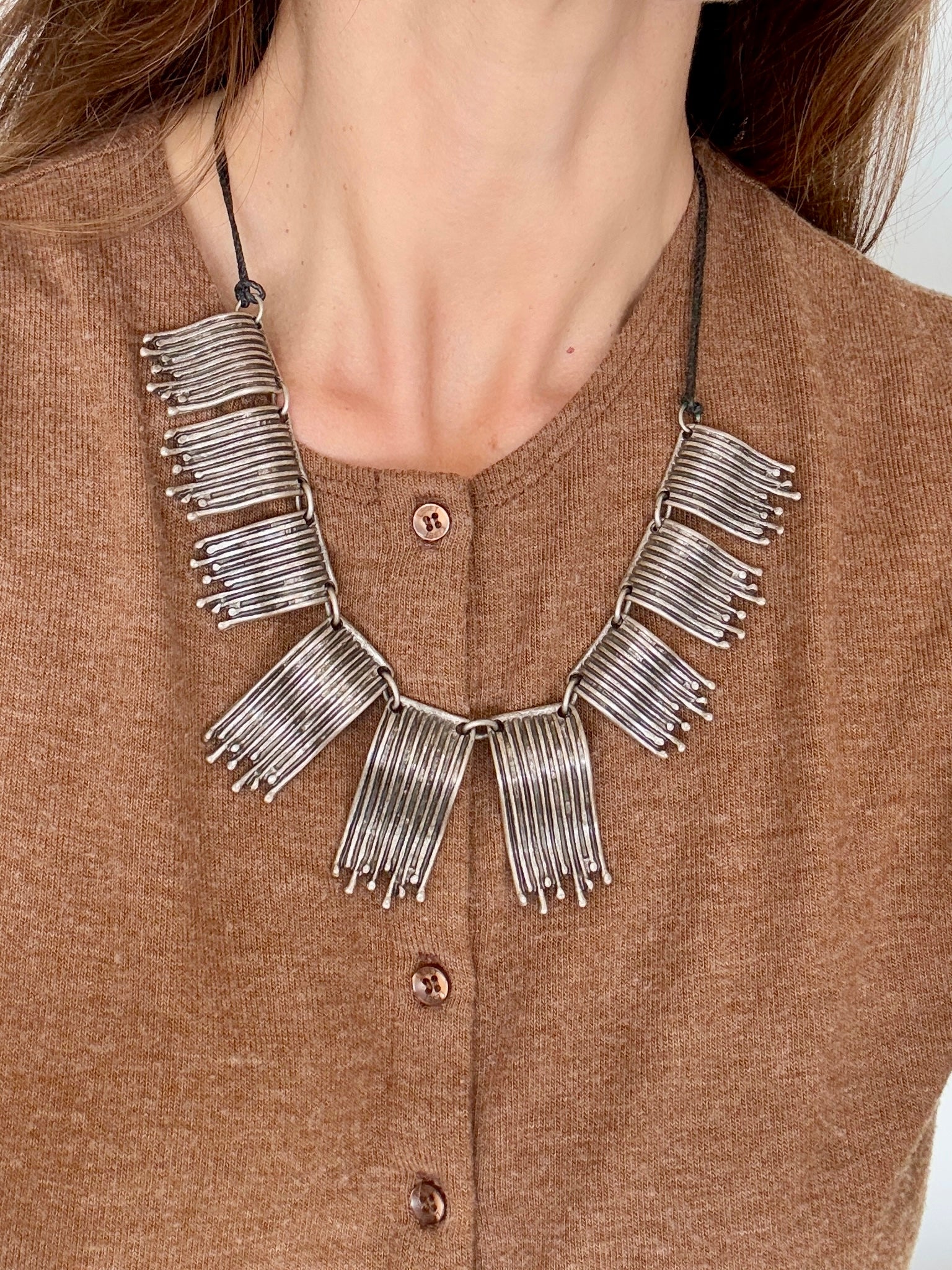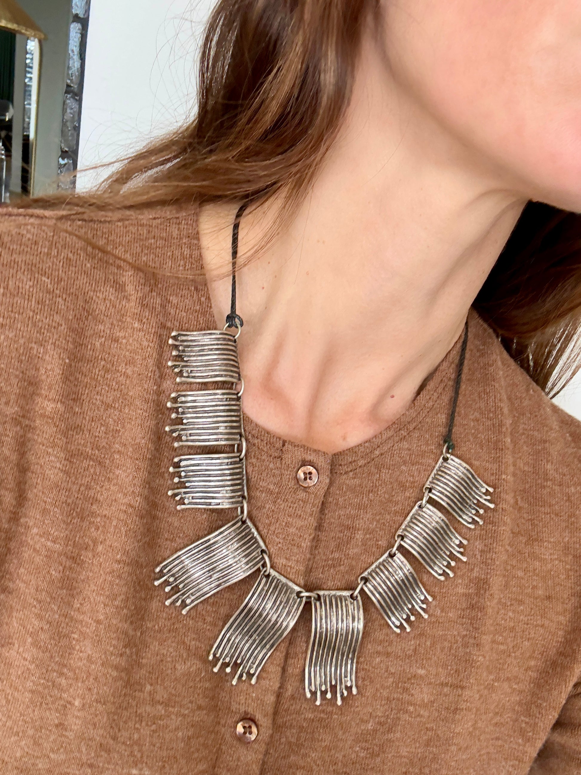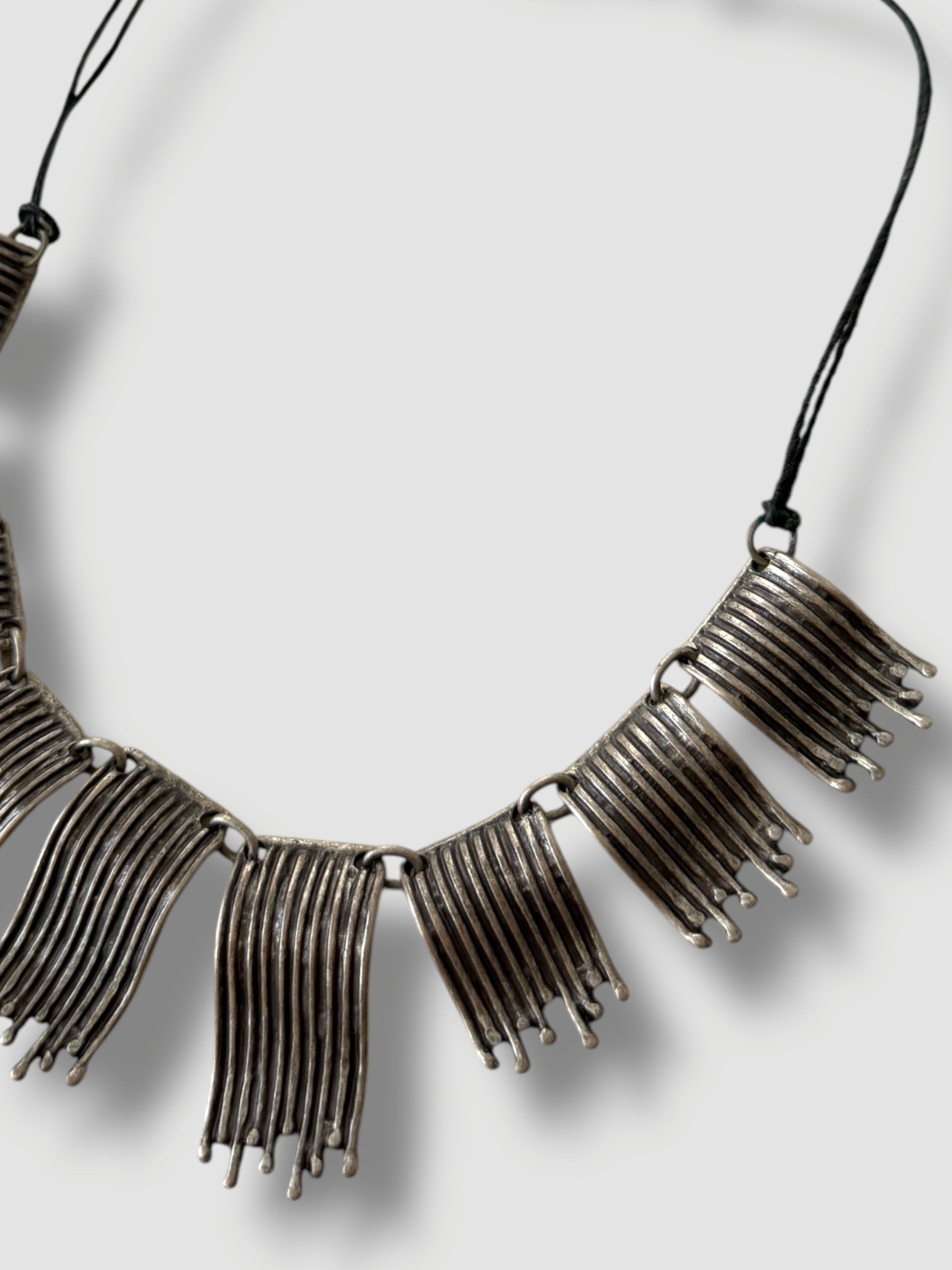 This vintage necklace is a striking statement piece with an edgy, bohemian-inspired aesthetic. Crafted from silver-tone metal, it features an array of elongated, curved fringe-like elements arranged in a cascading pattern, giving it a bold yet fluid movement. The fringe pieces are connected to a black cord, which adds a contrasting organic touch to the structured metal elements. The adjustable knotted closure, secured with a small metal loop, enhances its artisanal appeal, making it a unique blend of industrial and handcrafted design. Perfect for adding texture and depth to a minimalist outfit or complementing an eclectic, layered look.
