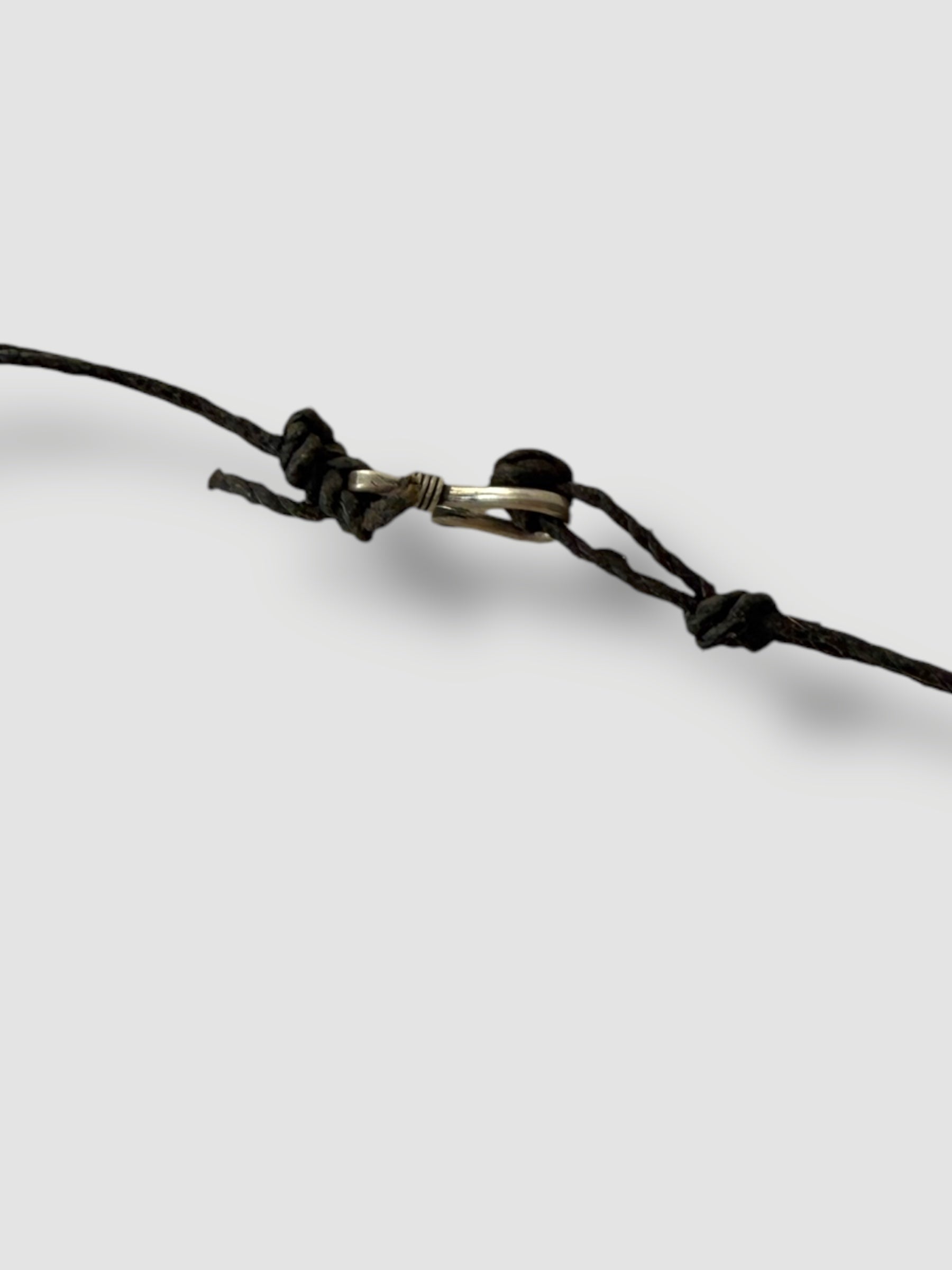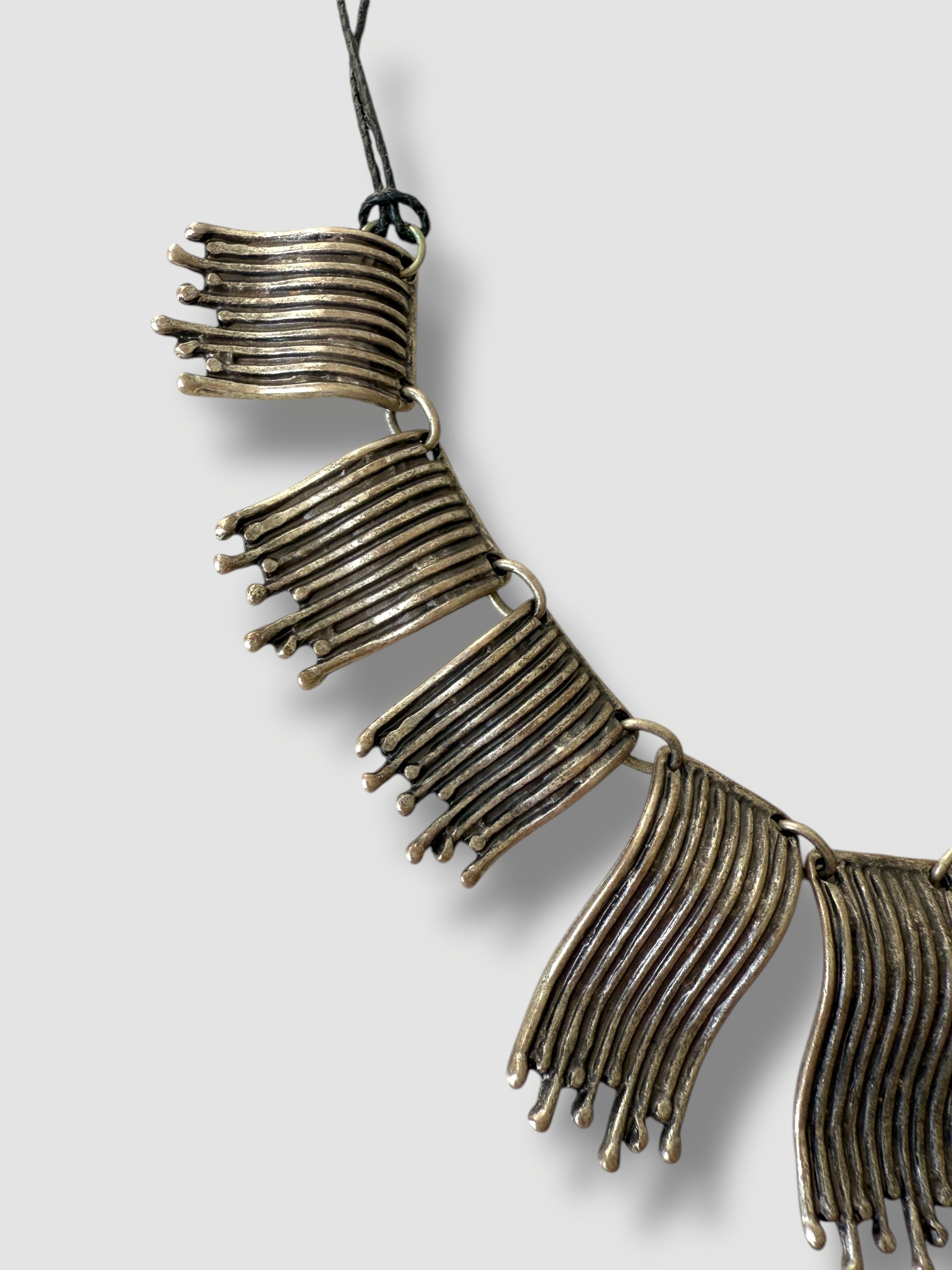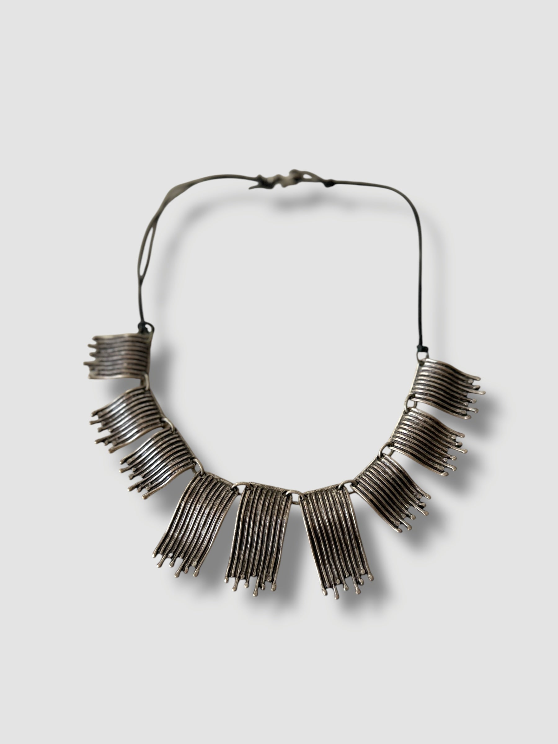 This vintage necklace is a striking statement piece with an edgy, bohemian-inspired aesthetic. Crafted from silver-tone metal, it features an array of elongated, curved fringe-like elements arranged in a cascading pattern, giving it a bold yet fluid movement. The fringe pieces are connected to a black cord, which adds a contrasting organic touch to the structured metal elements. The adjustable knotted closure, secured with a small metal loop, enhances its artisanal appeal, making it a unique blend of industrial and handcrafted design. Perfect for adding texture and depth to a minimalist outfit or complementing an eclectic, layered look.