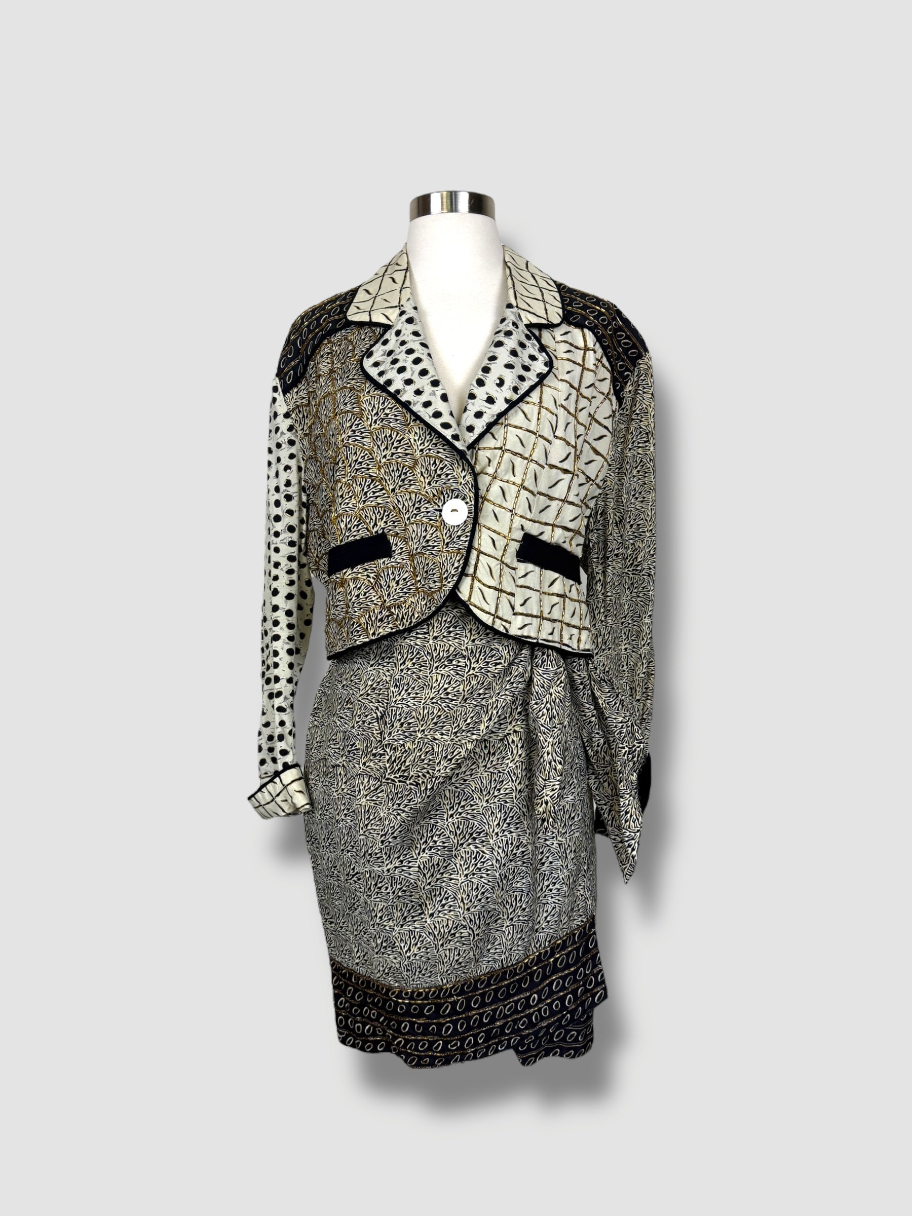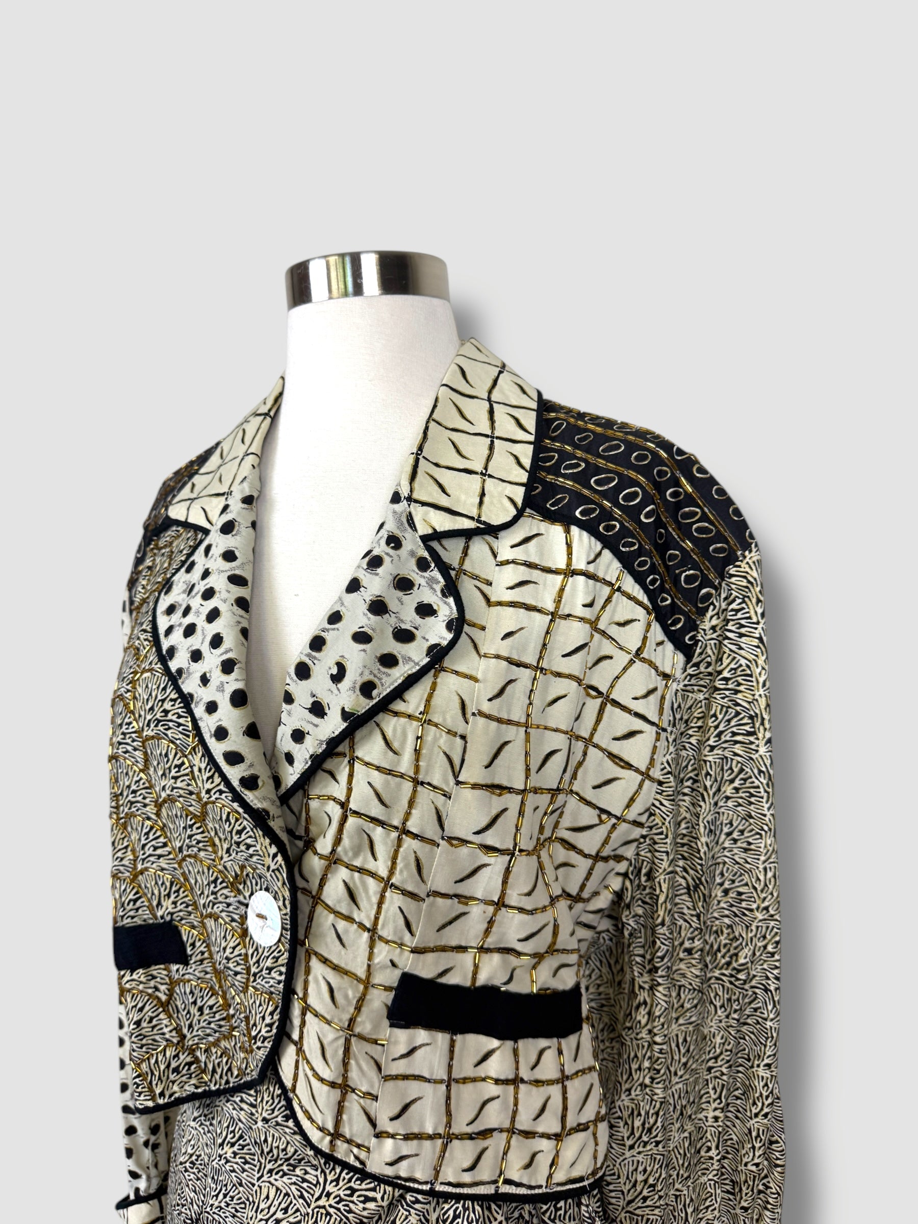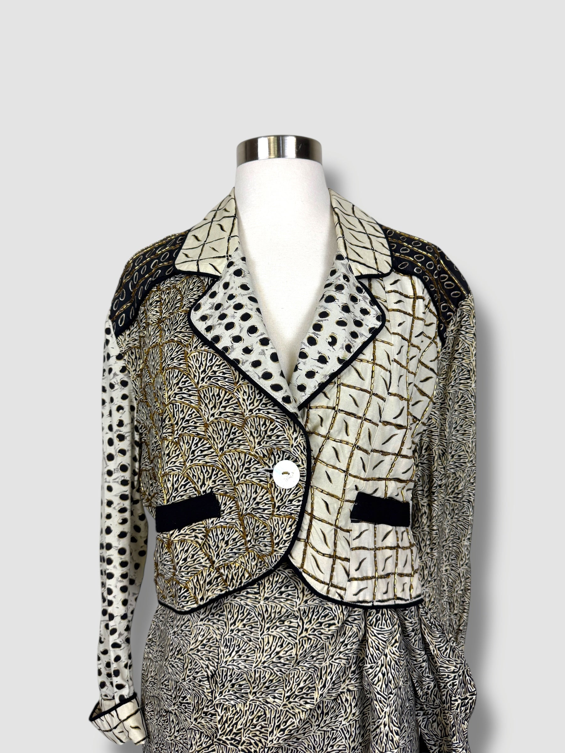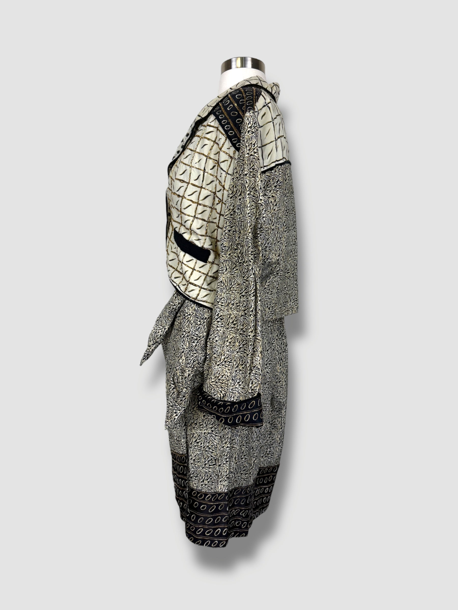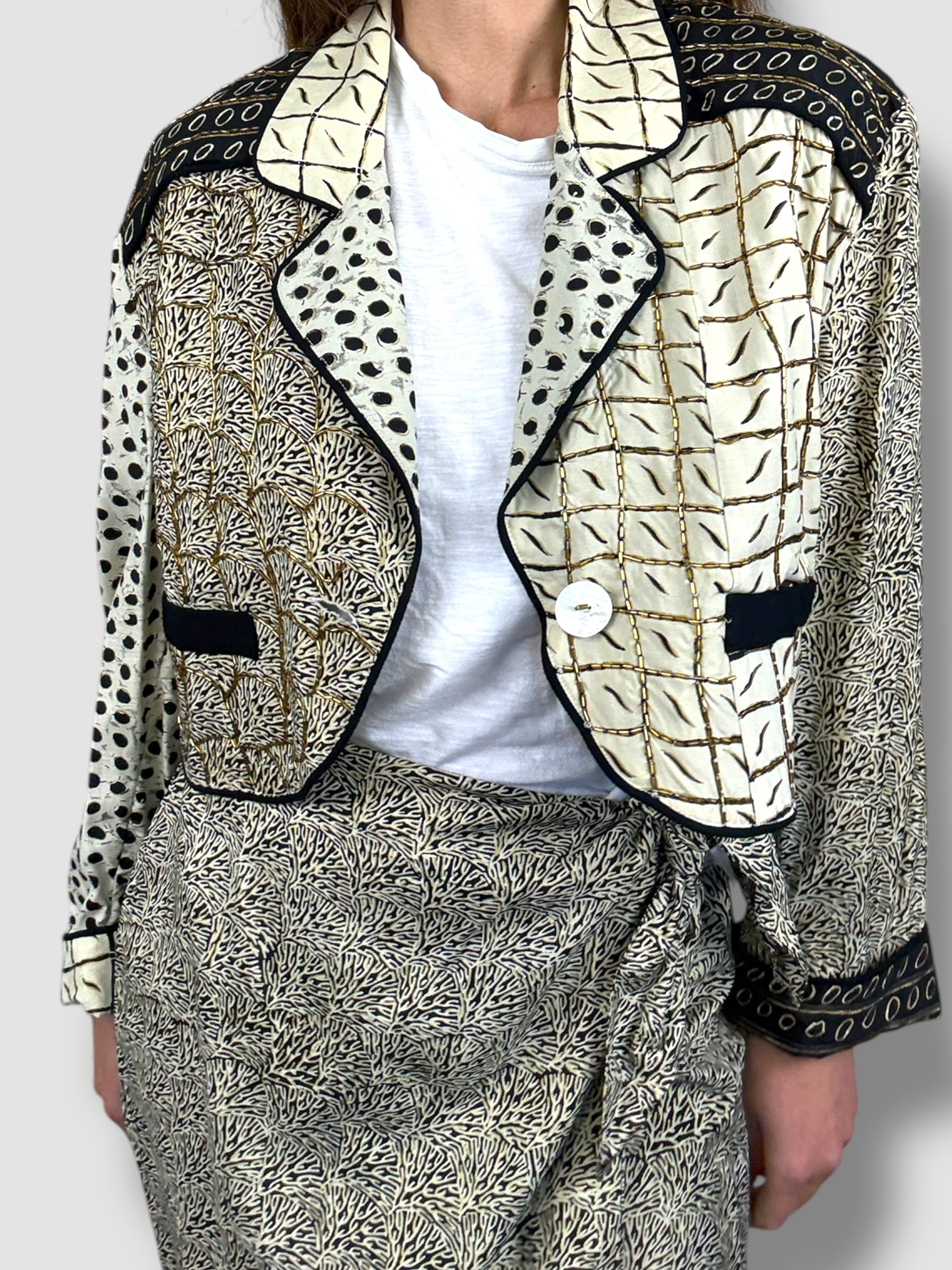 A true statement set, this vintage jacket and skirt ensemble is a work of art. Crafted from a silky base fabric with mixed patterns and rich embroidery, each piece is adorned with delicate gold beads and intricate stitching. The cropped jacket features oversized lapels, mother-of-pearl buttons, and bold black trim details, while the wrap-style skirt ties at the waist and mirrors the same elegant print mix. Unique, textural, and full of personality — this set turns heads whether worn together or styled separately.