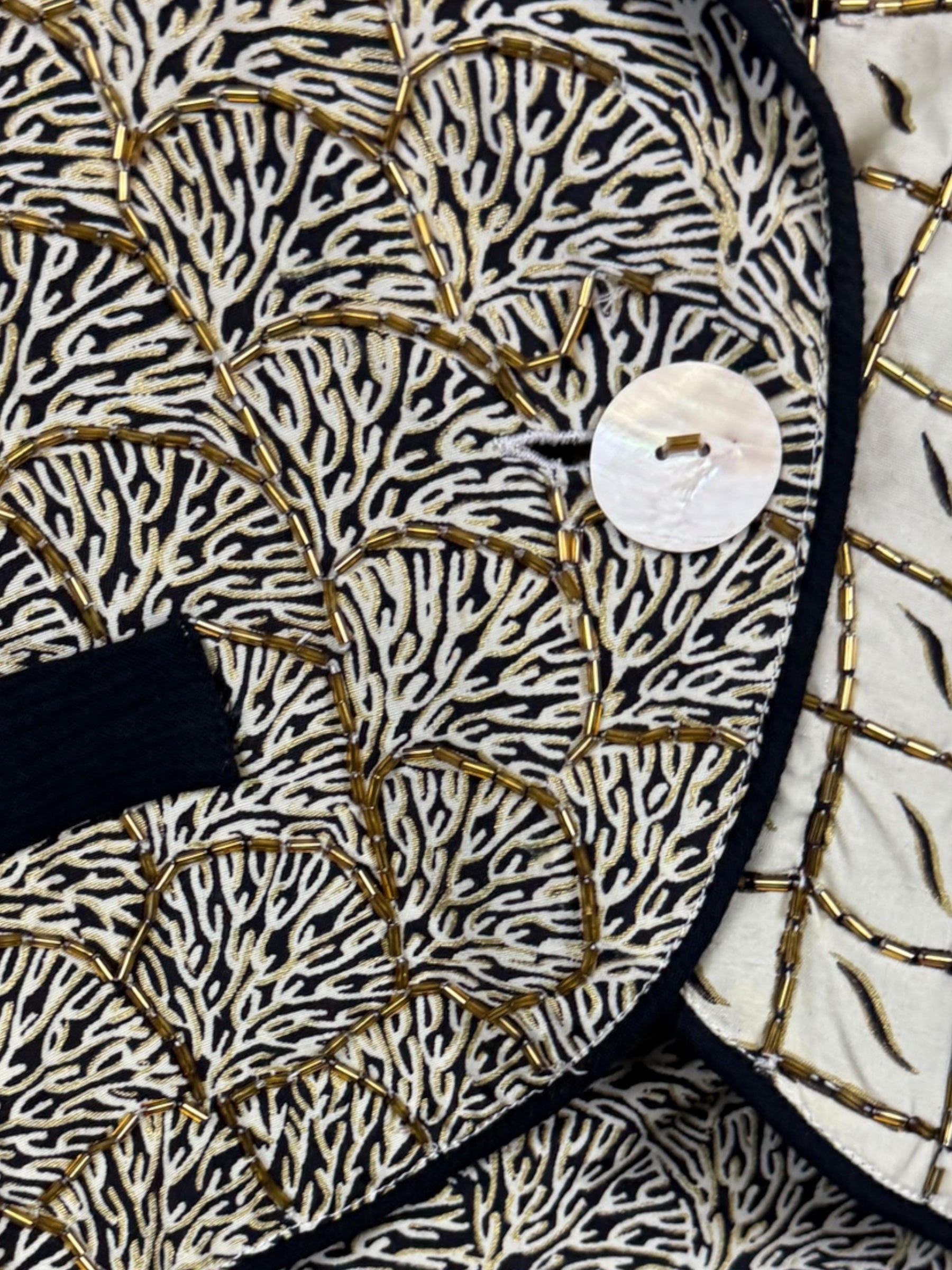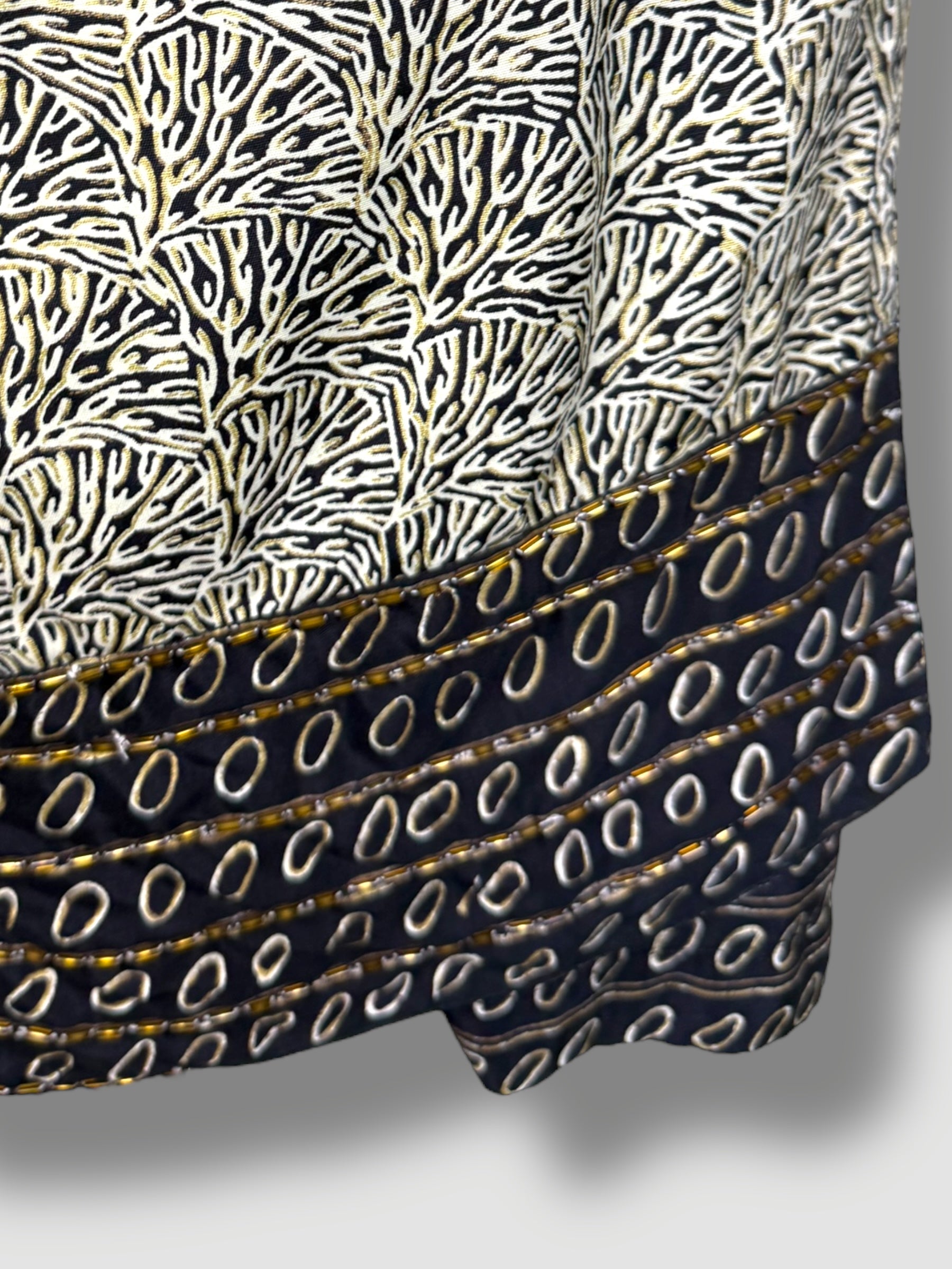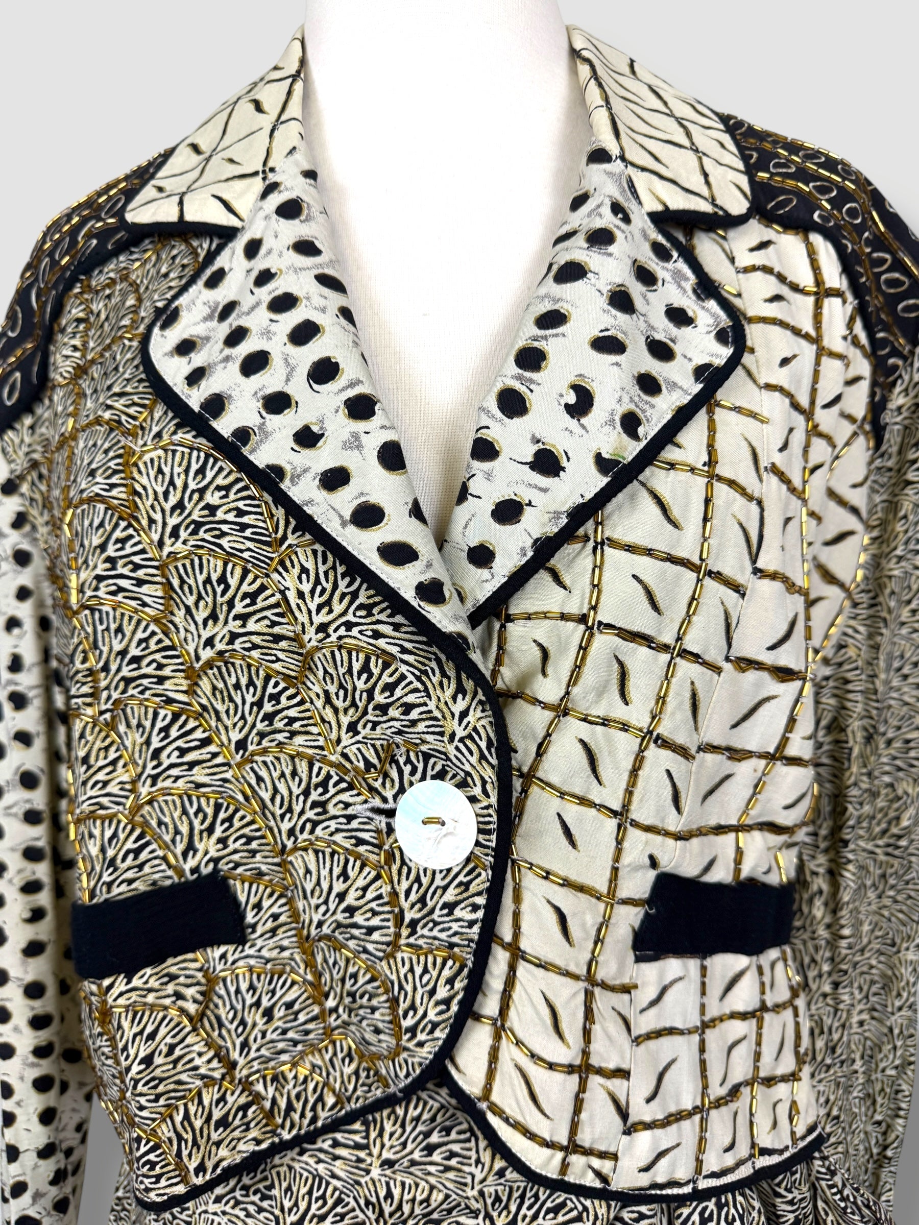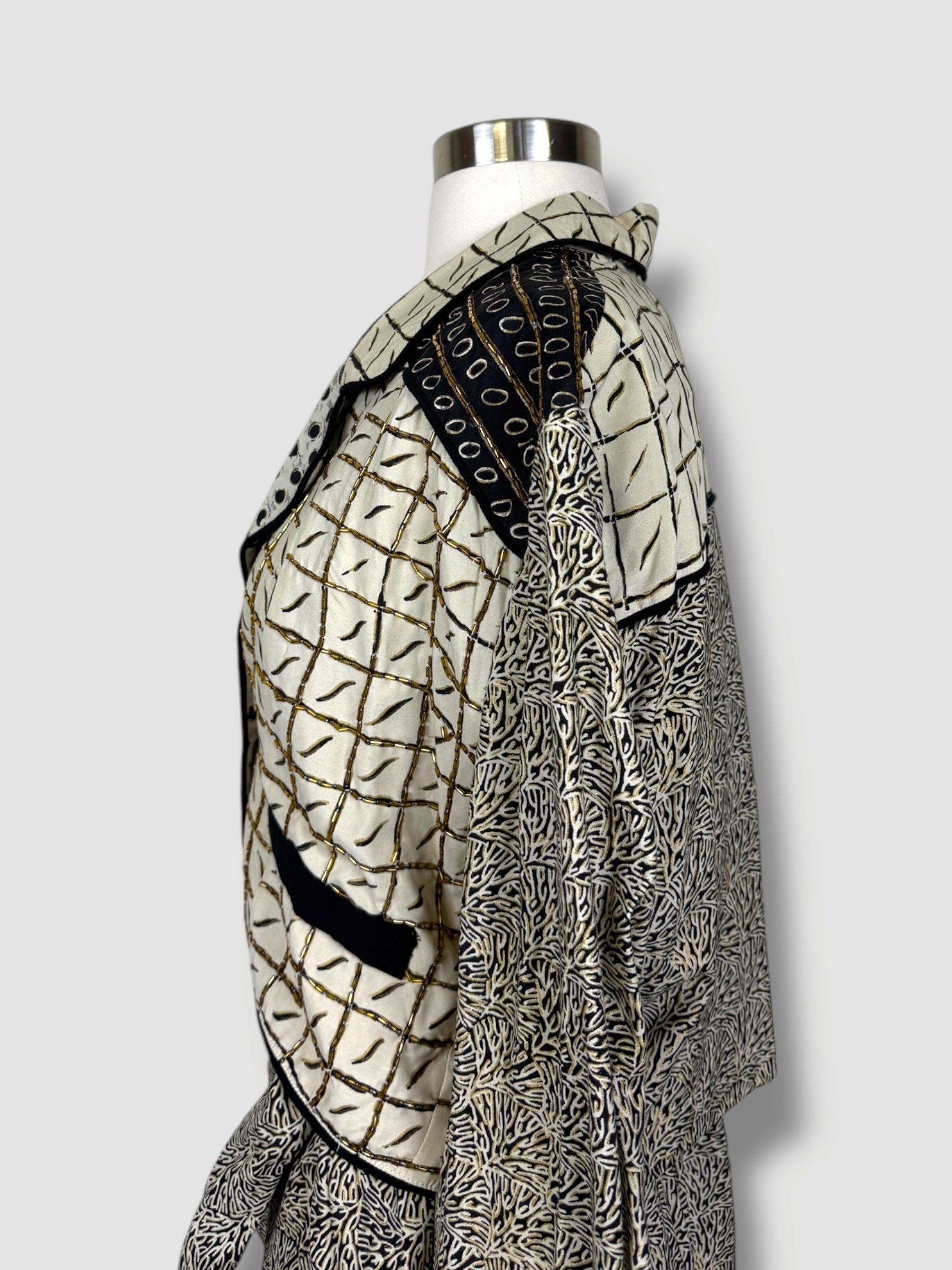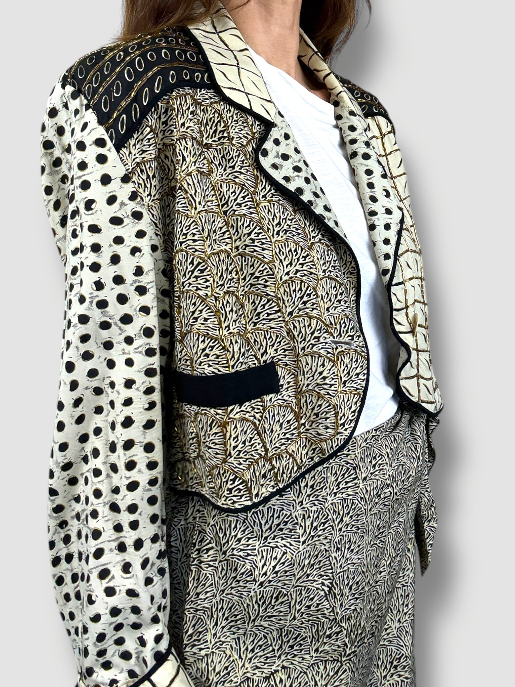 A true statement set, this vintage jacket and skirt ensemble is a work of art. Crafted from a silky base fabric with mixed patterns and rich embroidery, each piece is adorned with delicate gold beads and intricate stitching. The cropped jacket features oversized lapels, mother-of-pearl buttons, and bold black trim details, while the wrap-style skirt ties at the waist and mirrors the same elegant print mix. Unique, textural, and full of personality — this set turns heads whether worn together or styled separately.