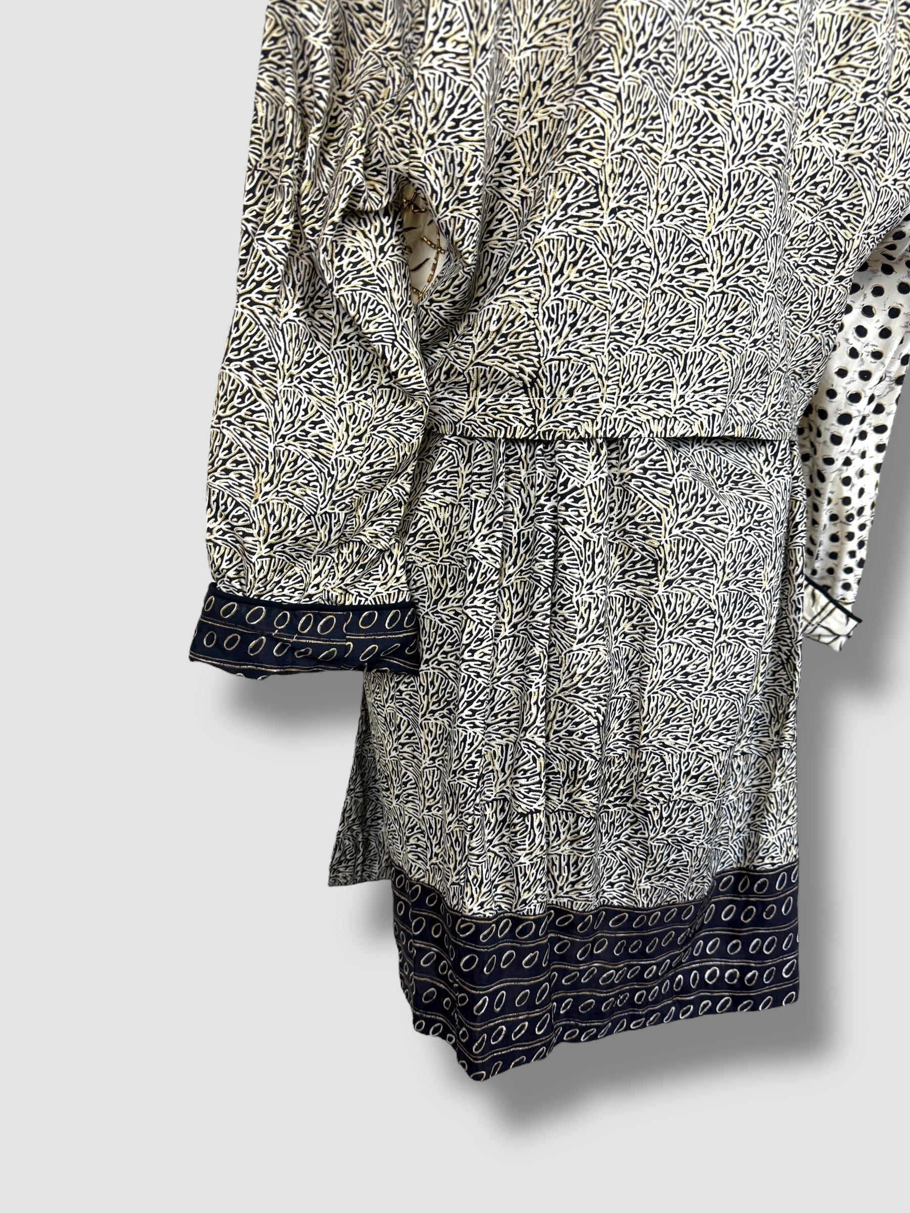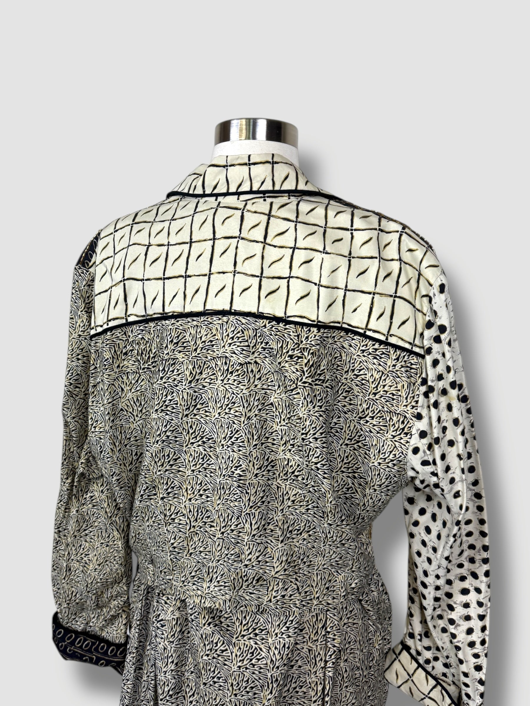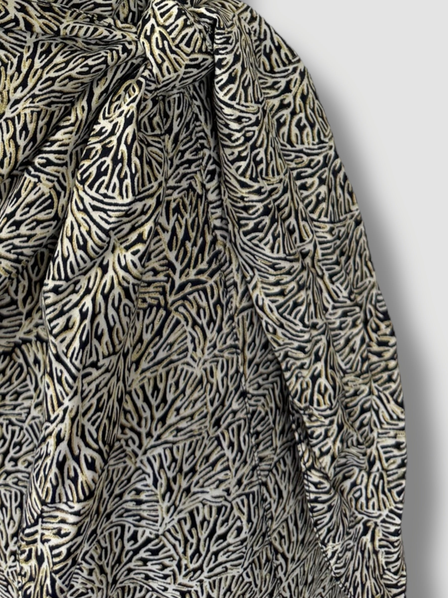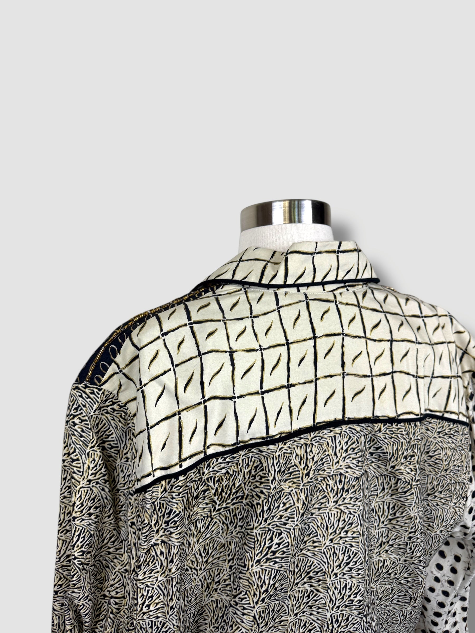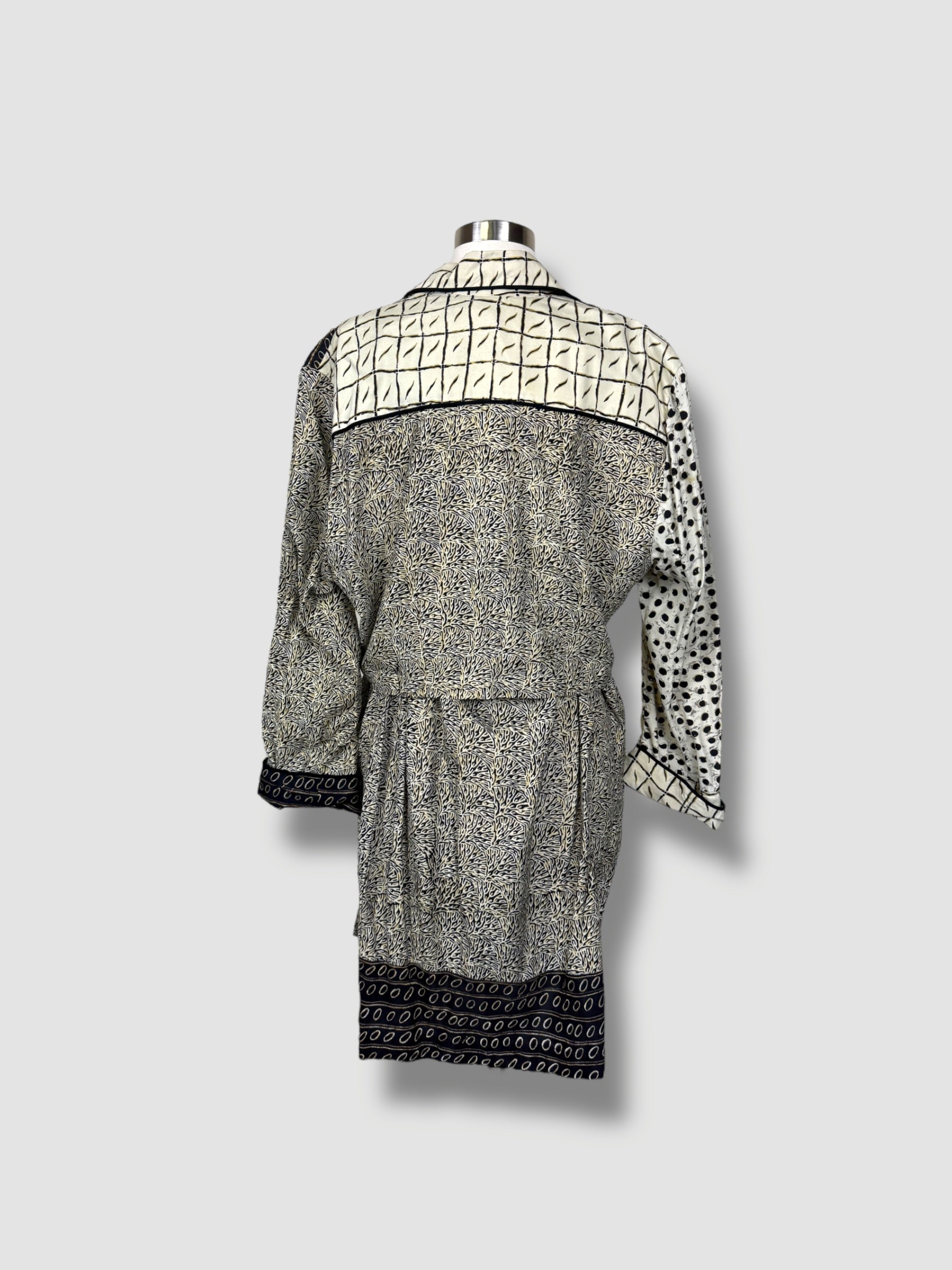 A true statement set, this vintage jacket and skirt ensemble is a work of art. Crafted from a silky base fabric with mixed patterns and rich embroidery, each piece is adorned with delicate gold beads and intricate stitching. The cropped jacket features oversized lapels, mother-of-pearl buttons, and bold black trim details, while the wrap-style skirt ties at the waist and mirrors the same elegant print mix. Unique, textural, and full of personality — this set turns heads whether worn together or styled separately.