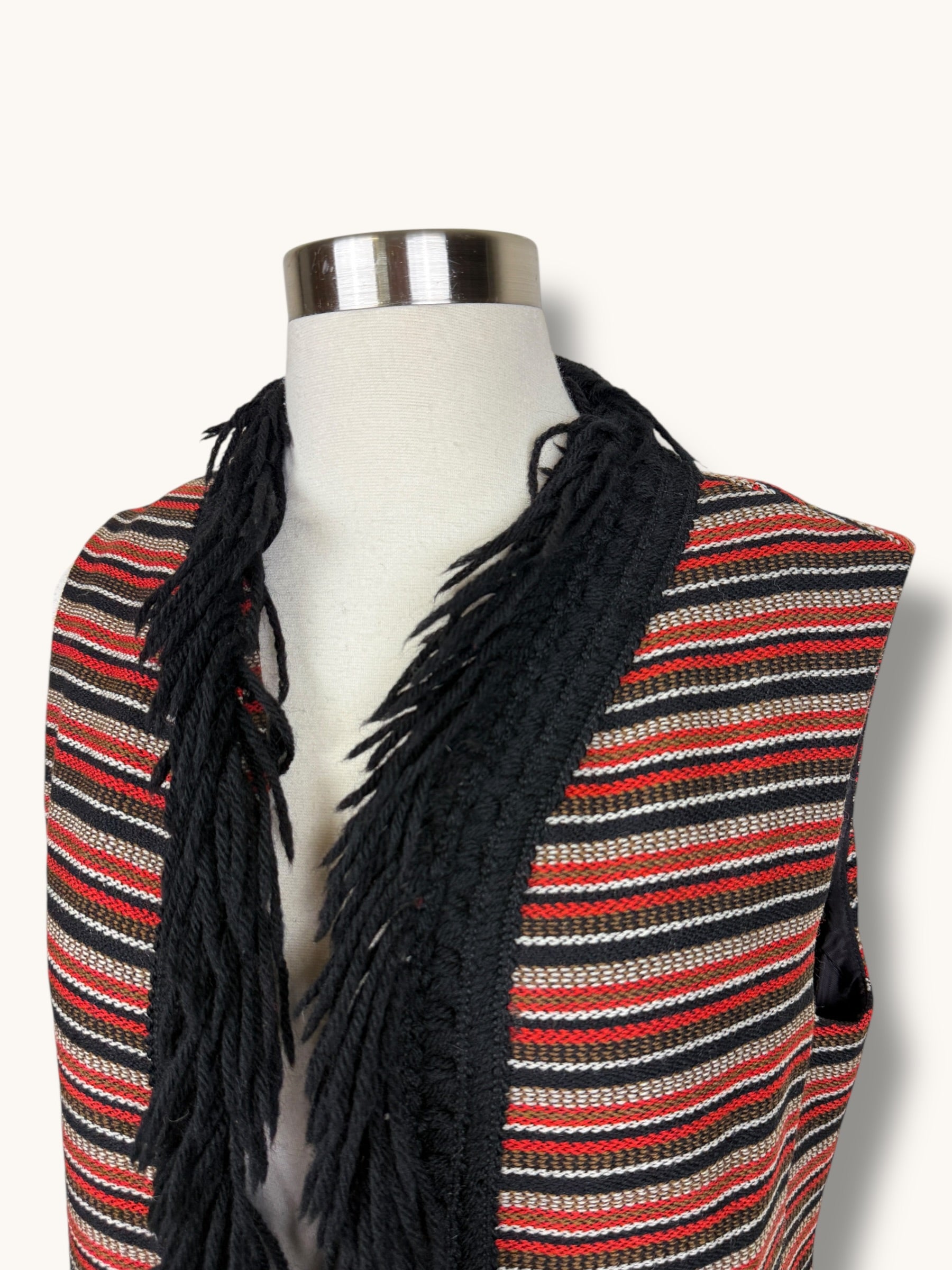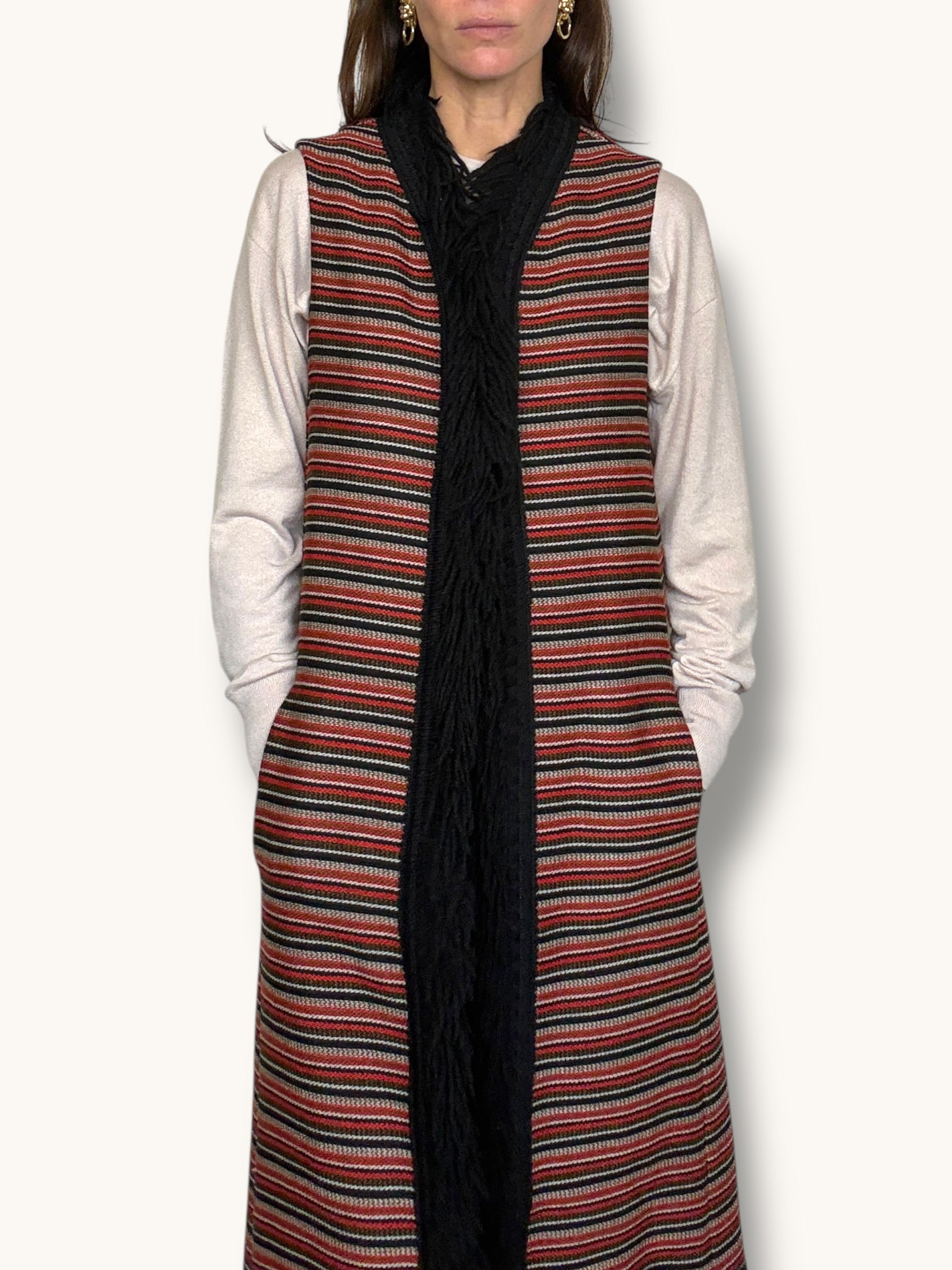 A bold vintage Jane Austin sleeveless duster crafted in a richly textured knit with horizontal stripes in black, rust, red, cream, and taupe. Designed in a long, open-front silhouette, it features dramatic black fringe trimming along the neckline and front placket, with additional fringe detailing at the hem for movement and edge. A discreet single hook closure at the neckline allows it to be worn open or softly secured. The straight, elongated cut creates a flattering vertical line, while the artisanal knit pattern gives it a warm, bohemian feel. Layer it over a simple tee and denim or style it over a sleek monochrome look — this statement piece instantly adds texture, depth, and vintage character to any outfit.