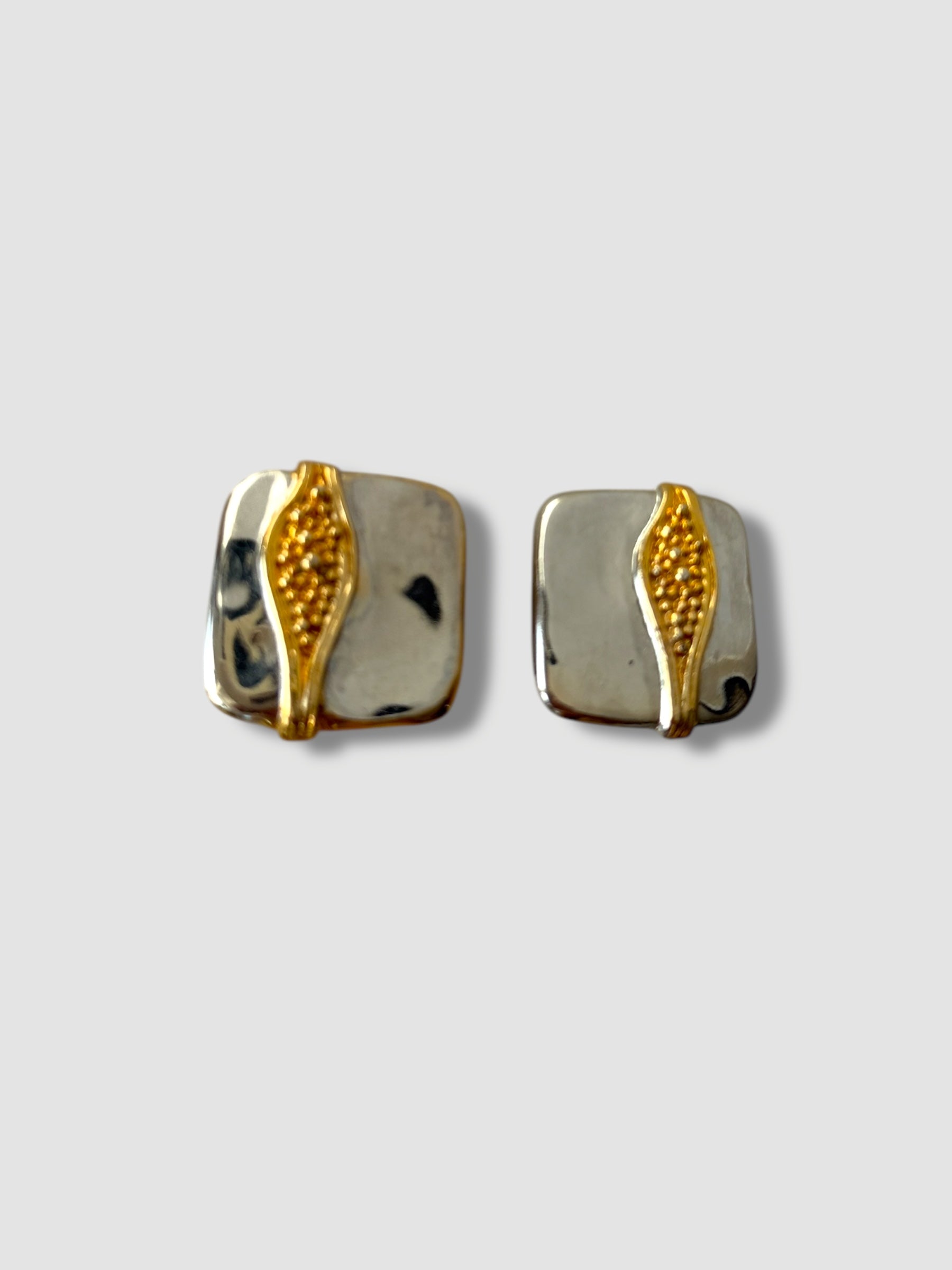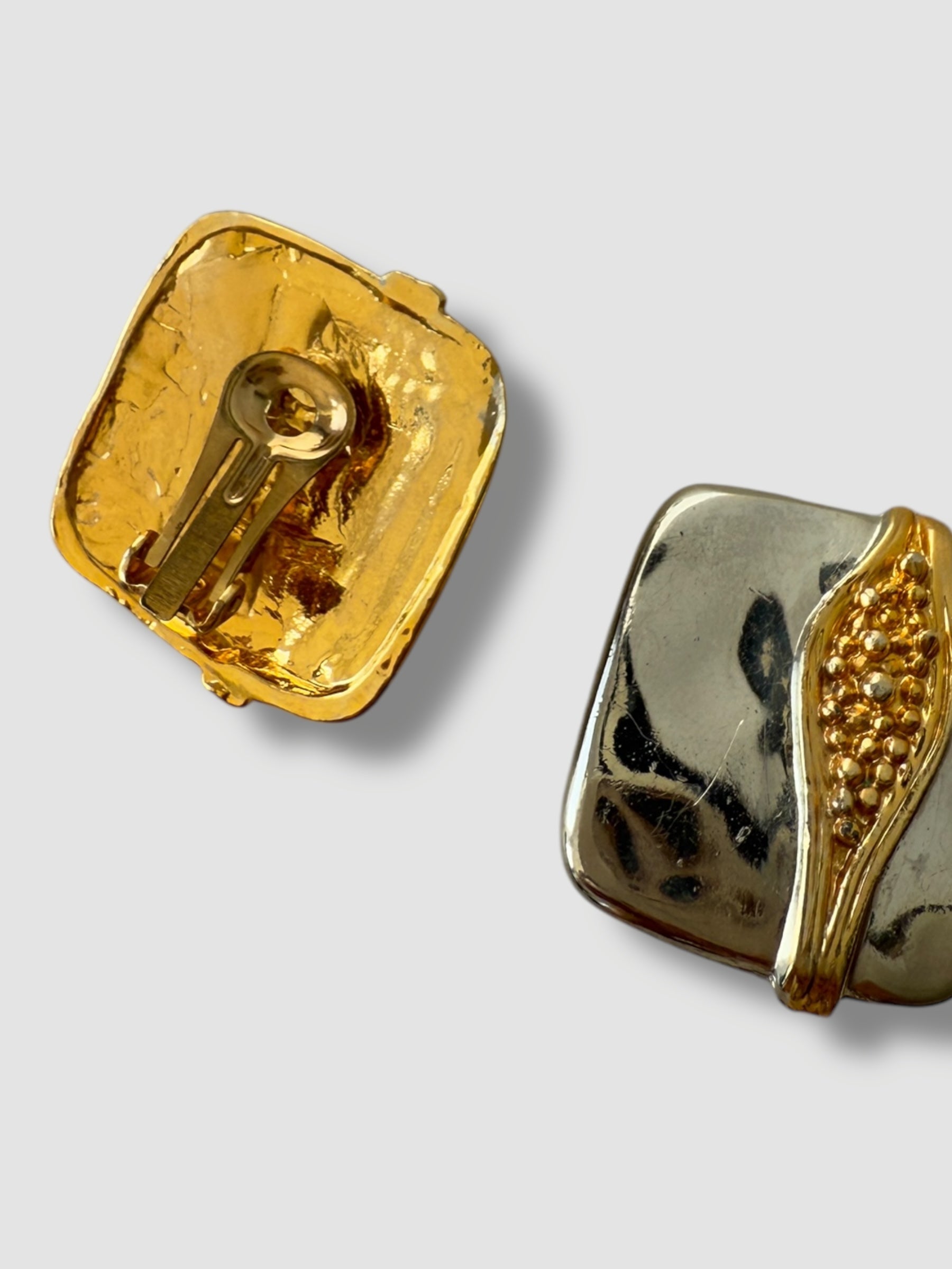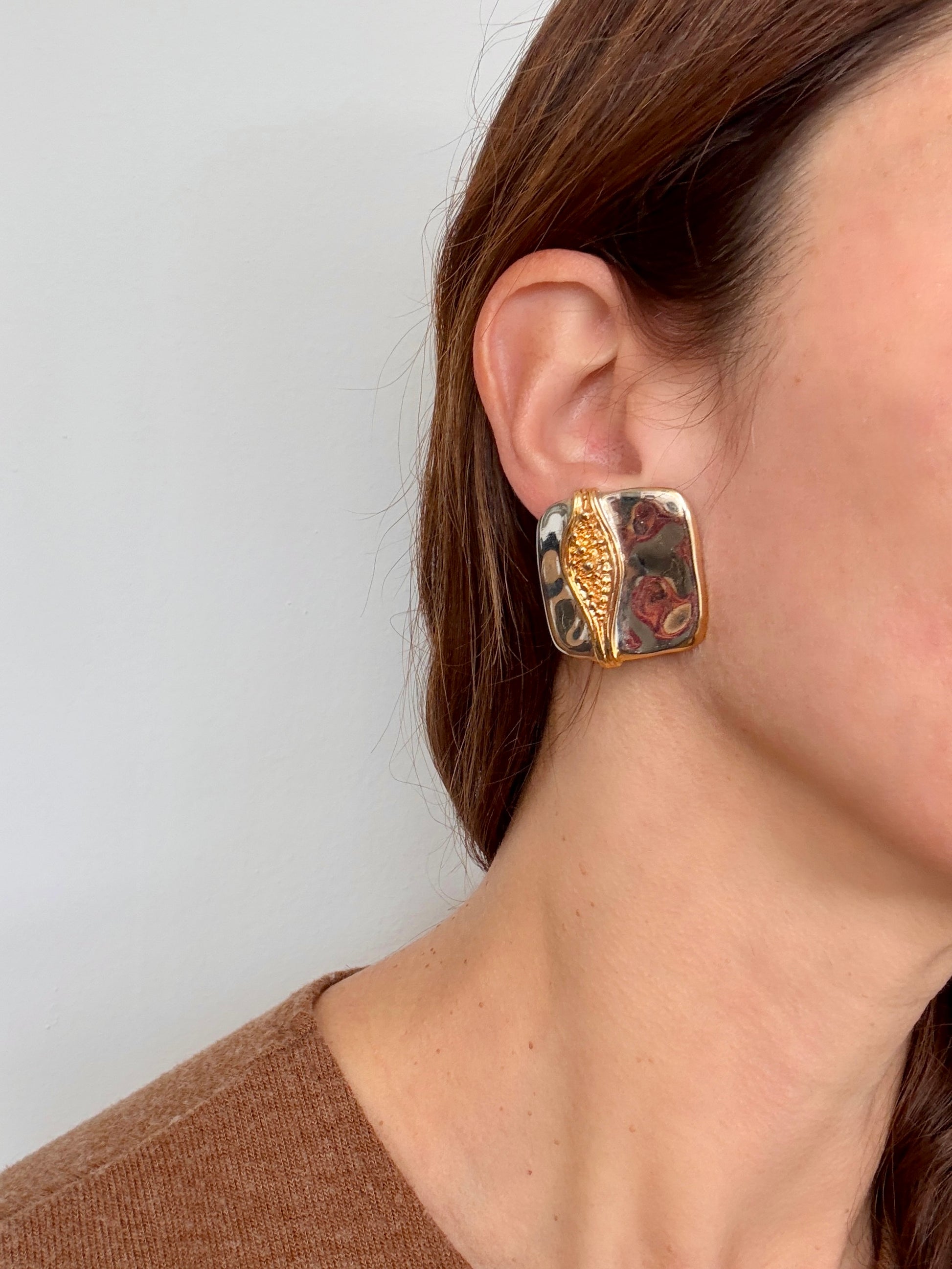 These vintage clip-on earrings showcase a striking mixed-metal aesthetic with a bold, sculptural design. The square-shaped base features a high-shine silver-tone finish, contrasted by a raised gold-tone wavy accent running down the center. This textured gold embellishment adds dimension and a touch of organic elegance to the otherwise sleek and structured silhouette. The clip-on closure ensures a secure and comfortable fit, making these earrings a statement accessory that embodies both modernist and retro influences—perfect for adding a sophisticated edge to any outfit.