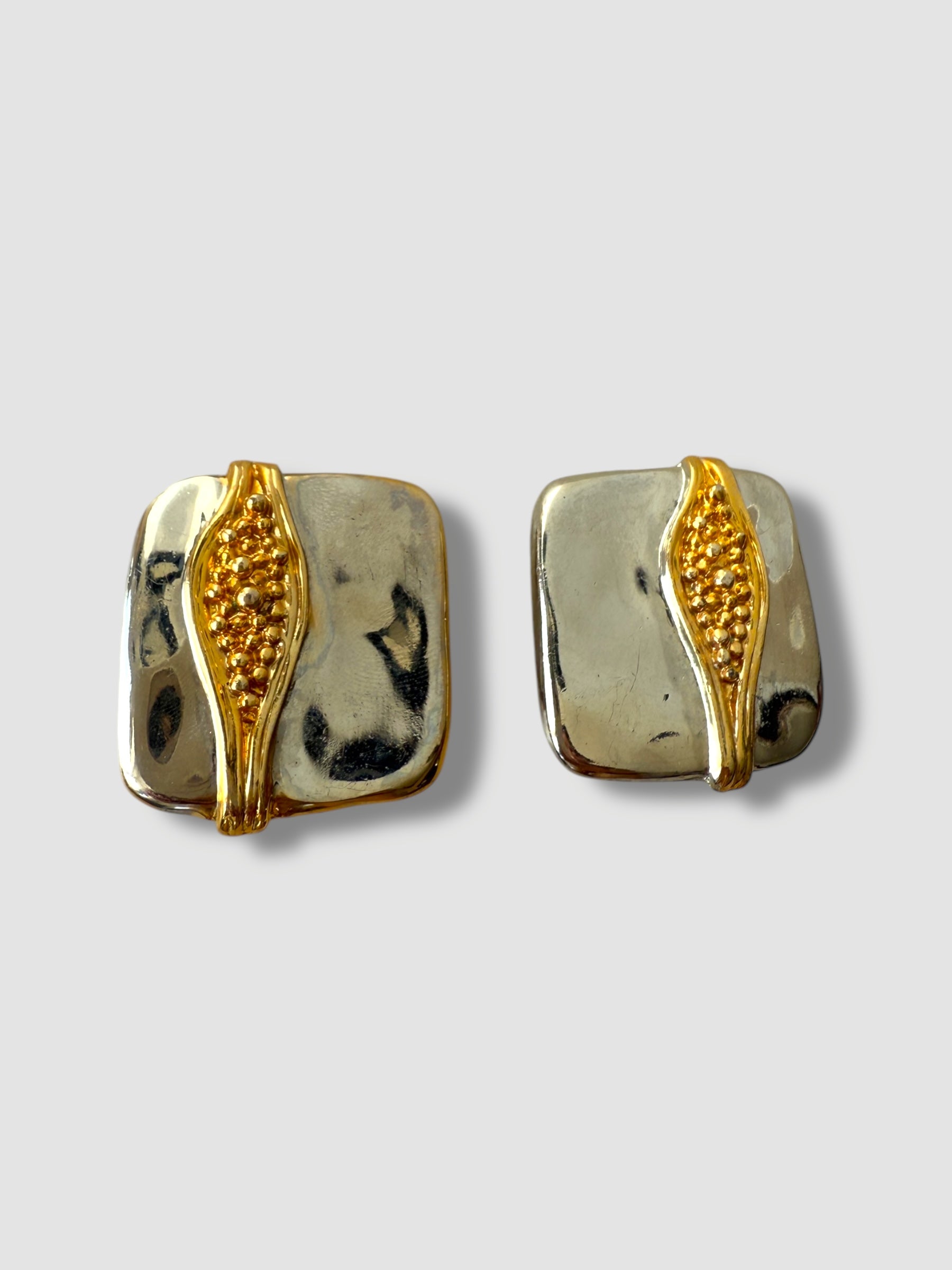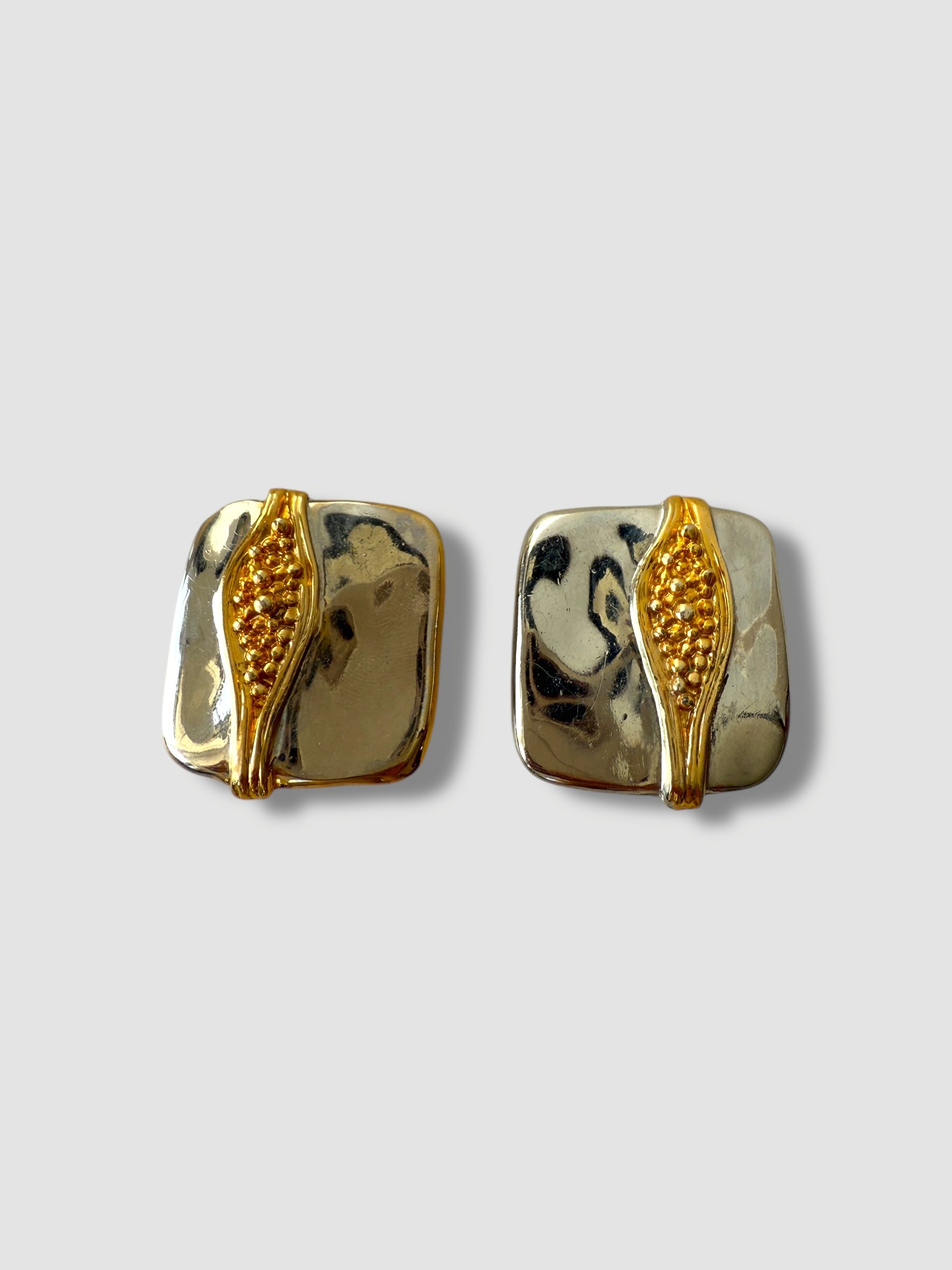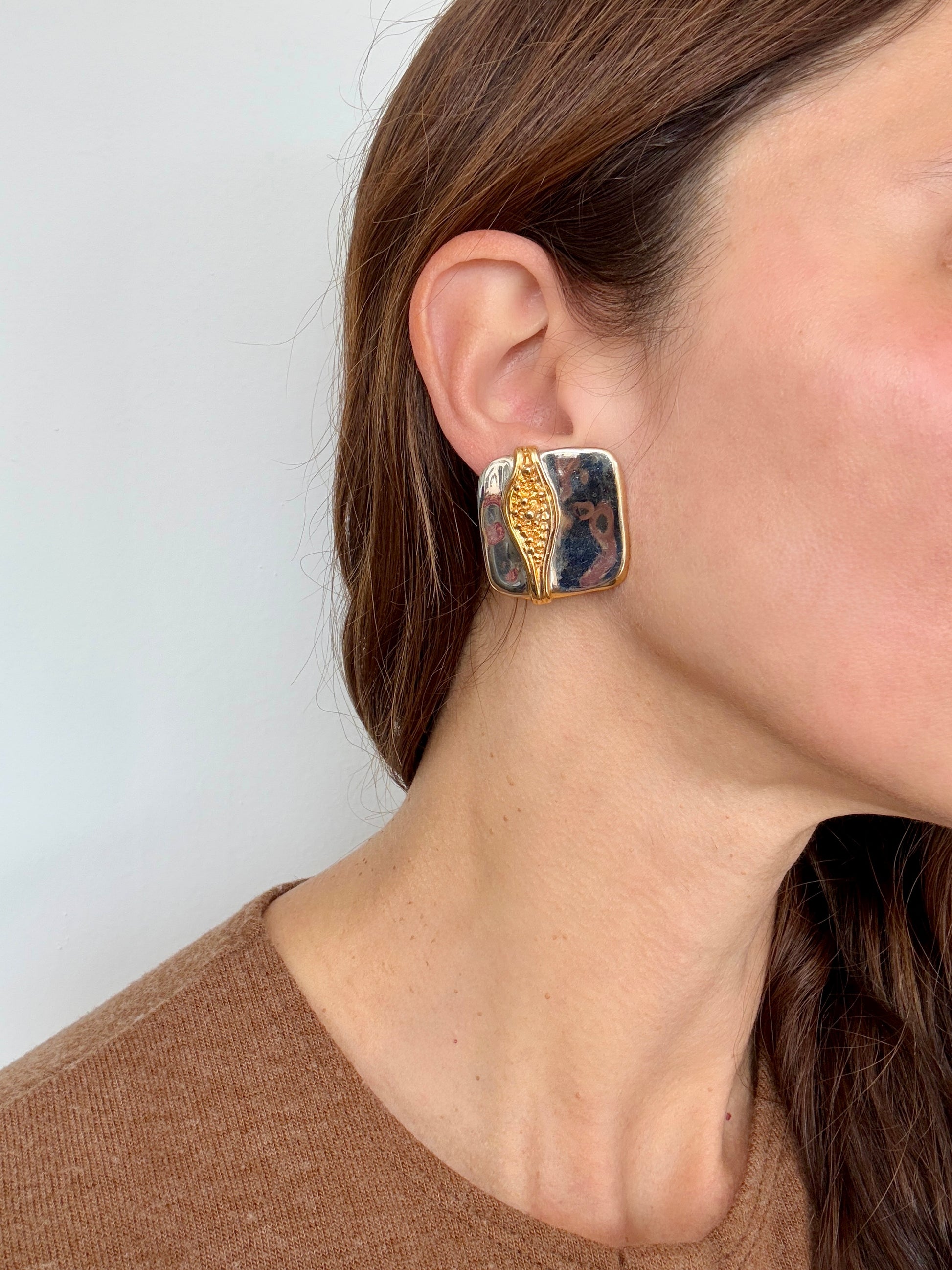 These vintage clip-on earrings showcase a striking mixed-metal aesthetic with a bold, sculptural design. The square-shaped base features a high-shine silver-tone finish, contrasted by a raised gold-tone wavy accent running down the center. This textured gold embellishment adds dimension and a touch of organic elegance to the otherwise sleek and structured silhouette. The clip-on closure ensures a secure and comfortable fit, making these earrings a statement accessory that embodies both modernist and retro influences—perfect for adding a sophisticated edge to any outfit.