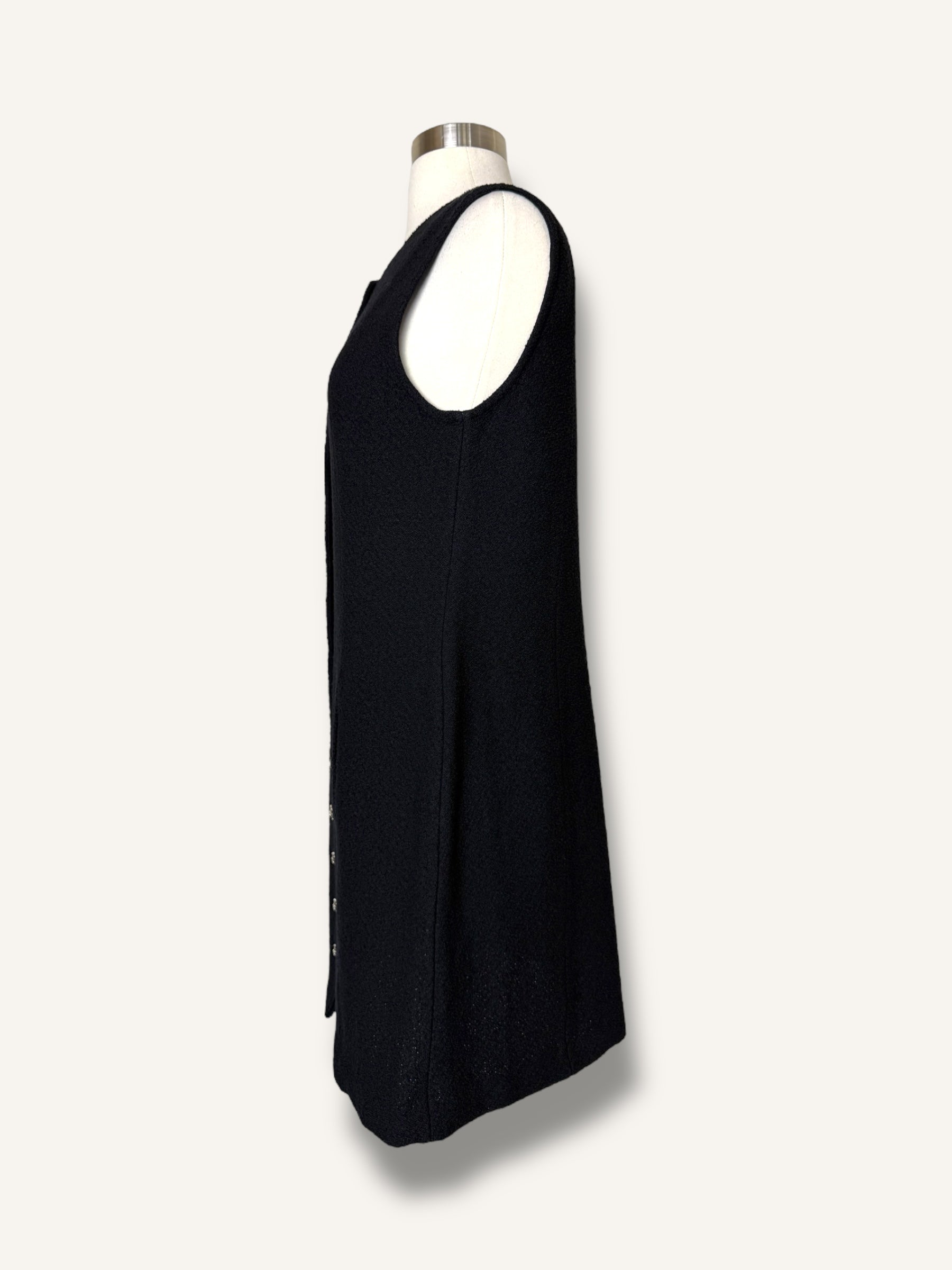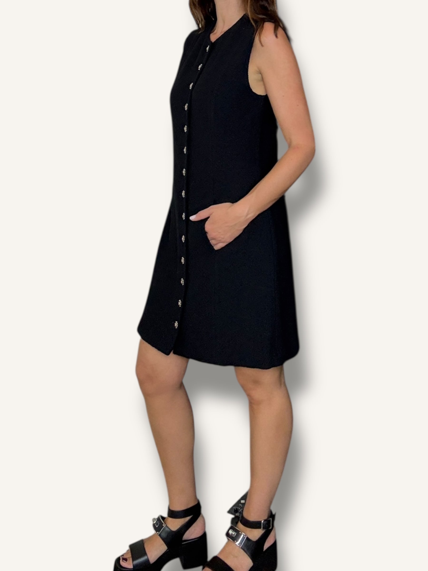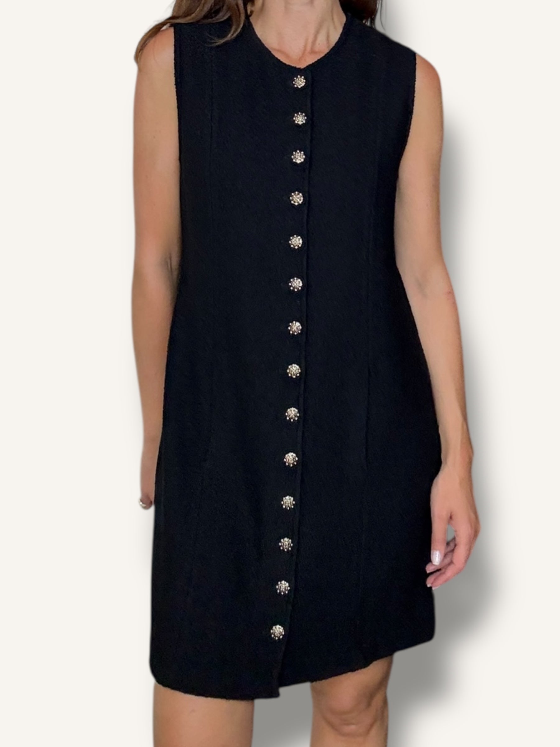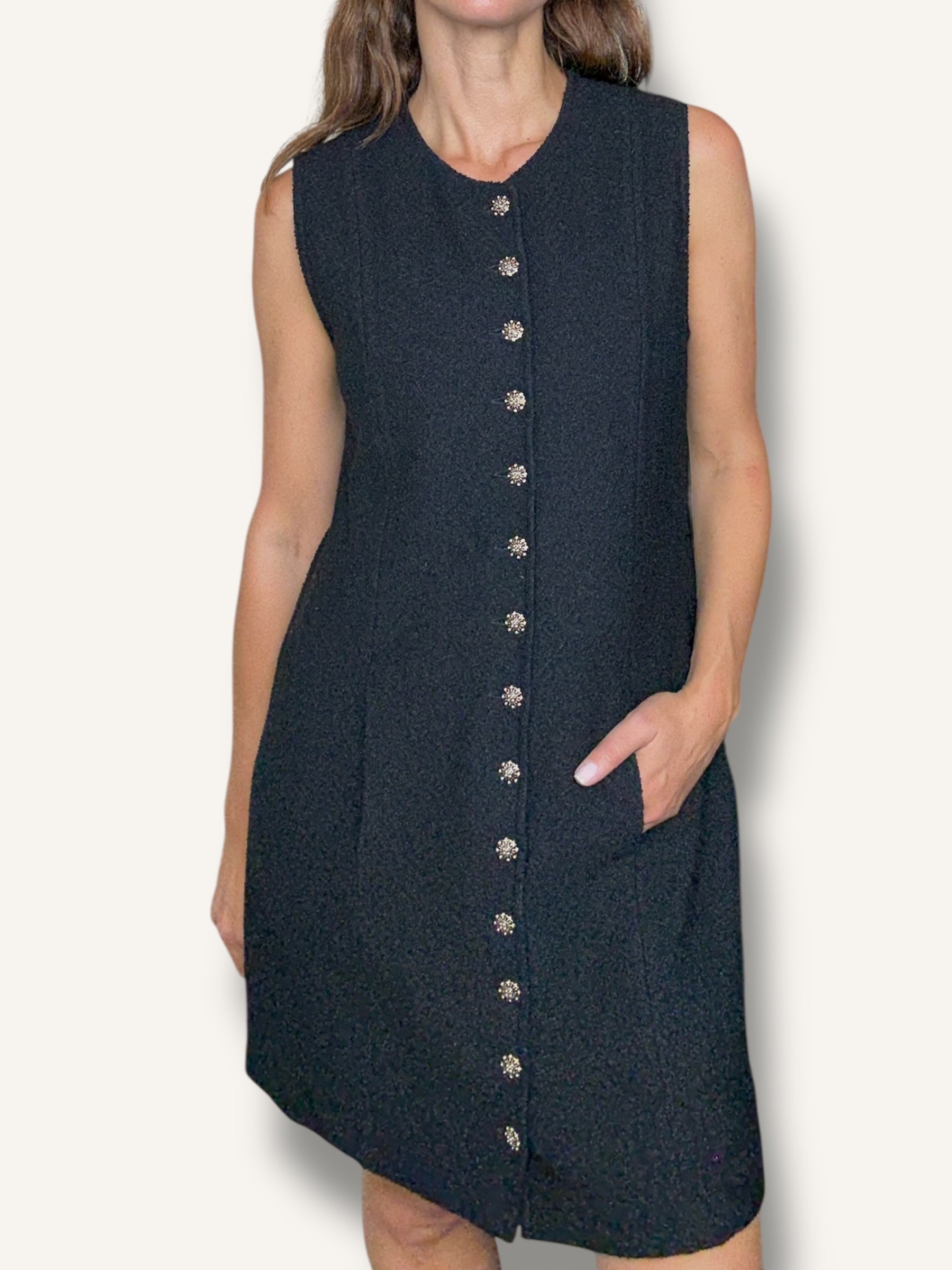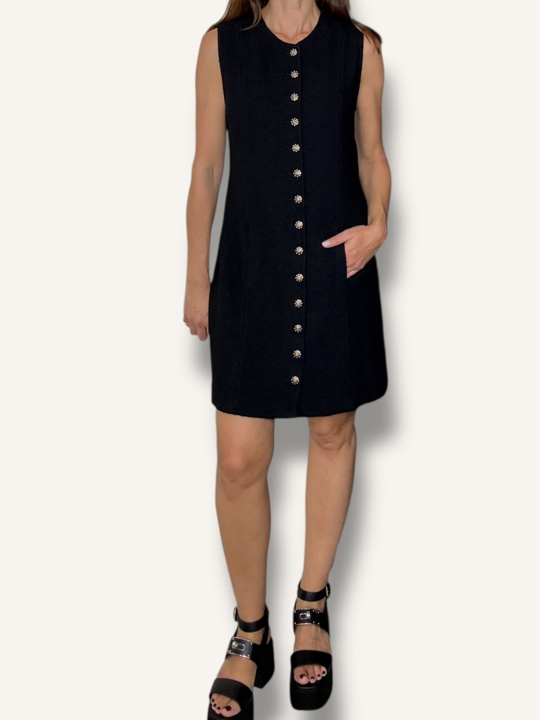 Vintage St. John sleeveless knit dress in classic black. Features a structured A-line silhouette, round neckline, statement gold-tone buttons down the front and hidden pockets on both sides. Timeless, elegant, and effortlessly chic.