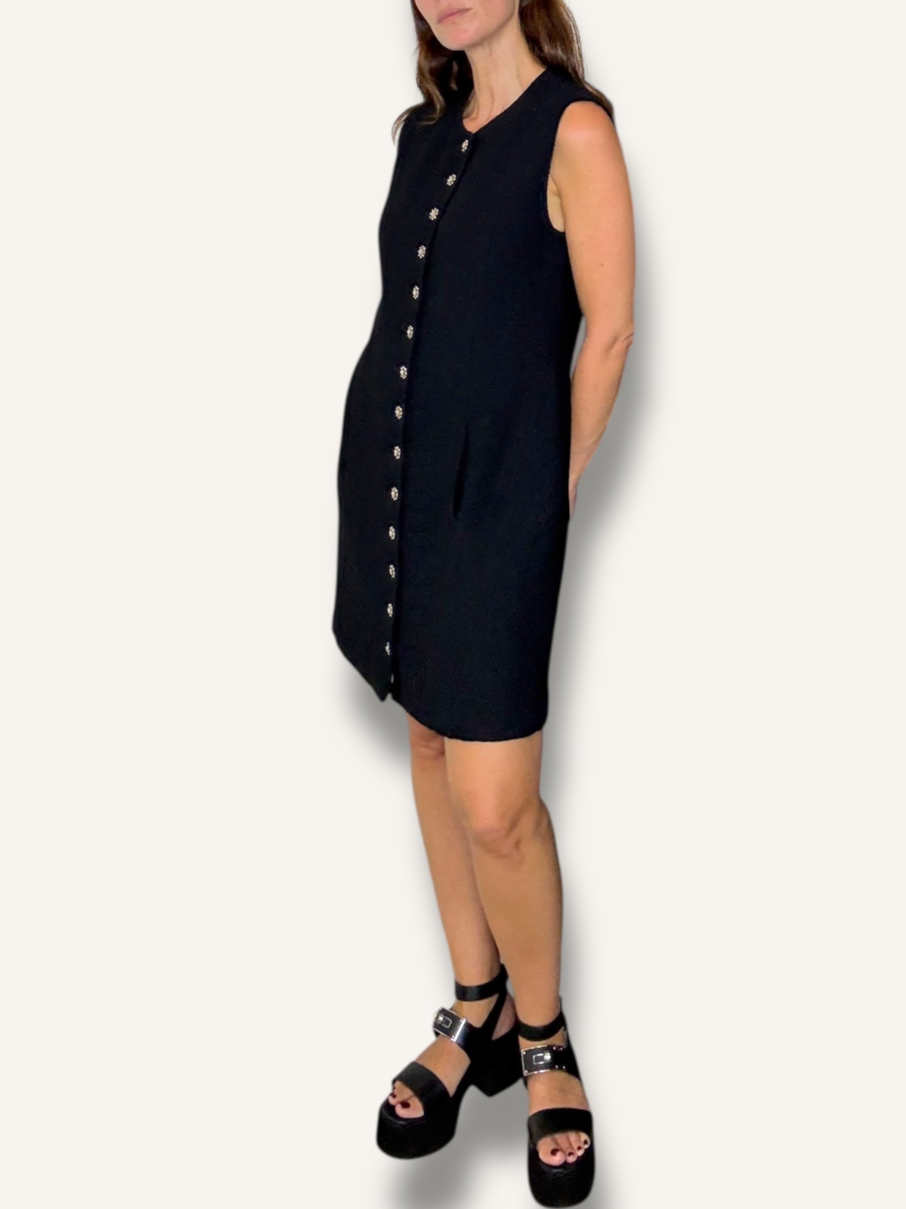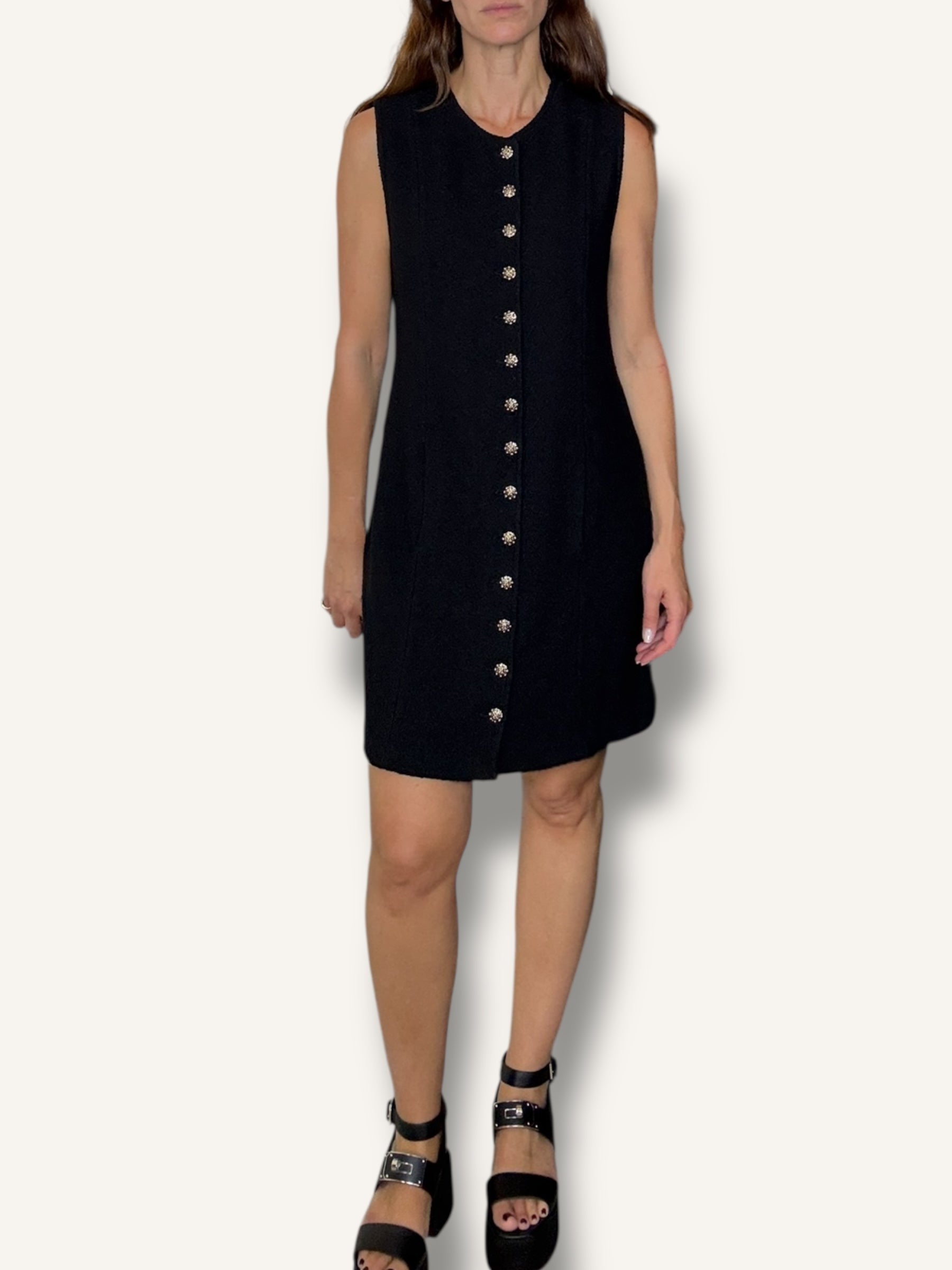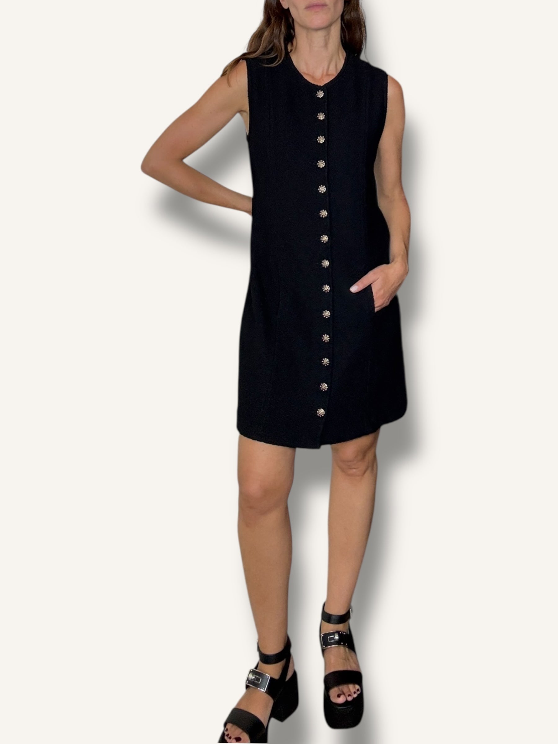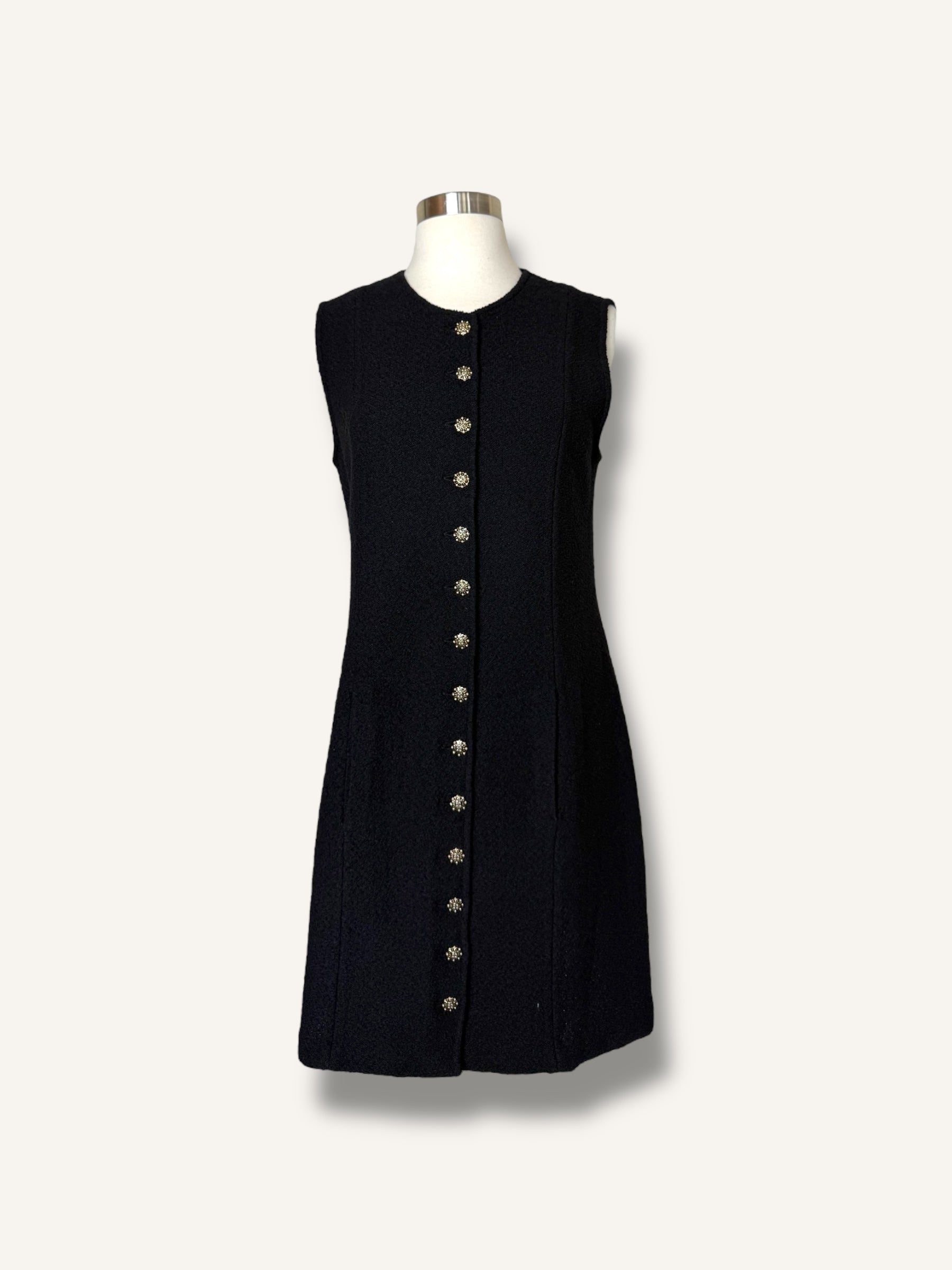Vintage St. John sleeveless knit dress in classic black. Features a structured A-line silhouette, round neckline, statement gold-tone buttons down the front and hidden pockets on both sides. Timeless, elegant, and effortlessly chic.