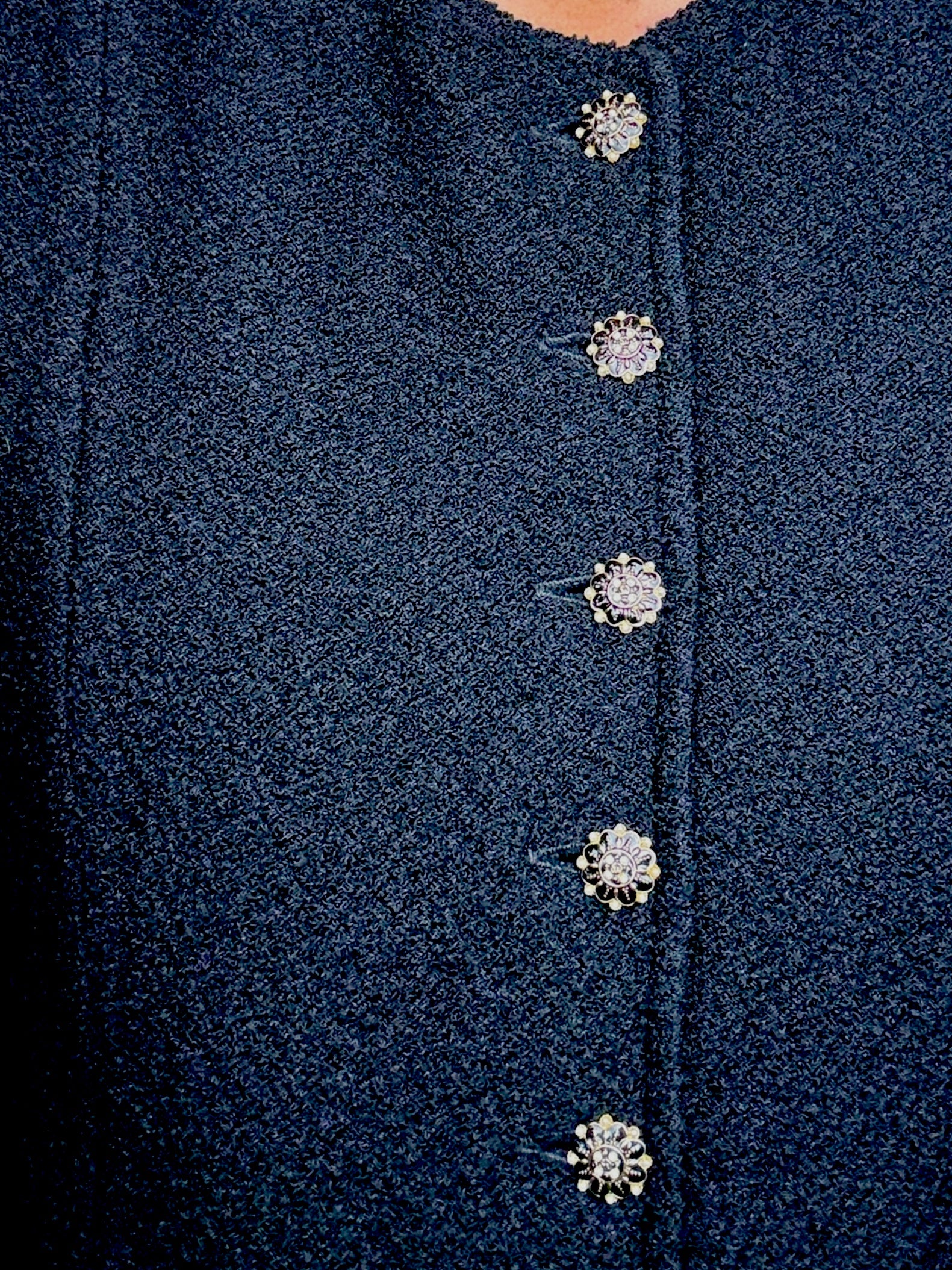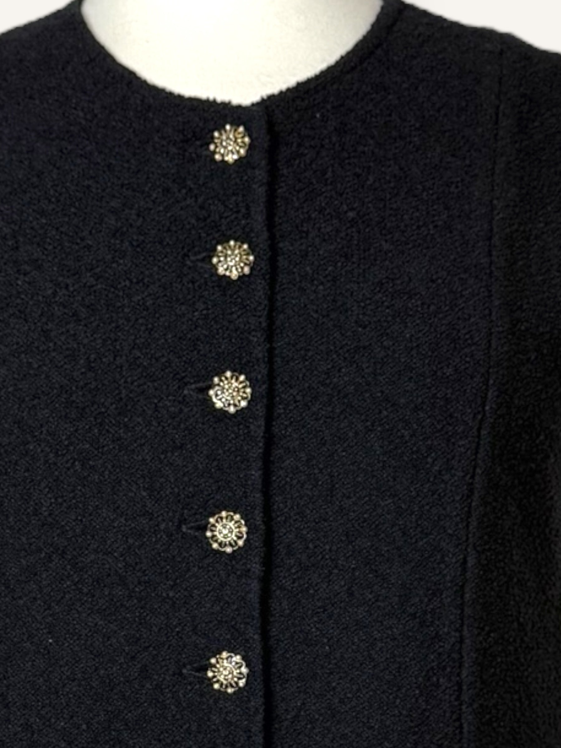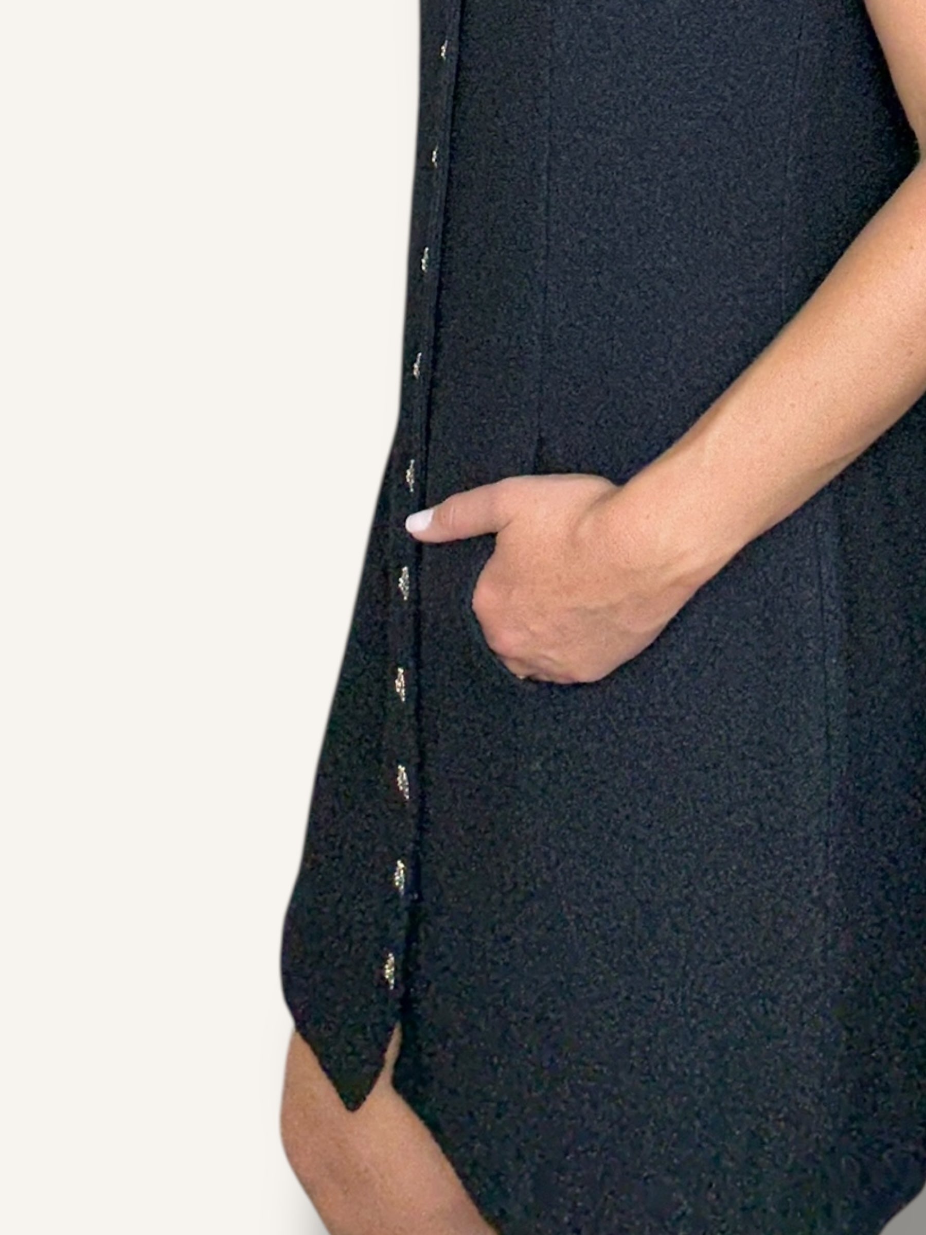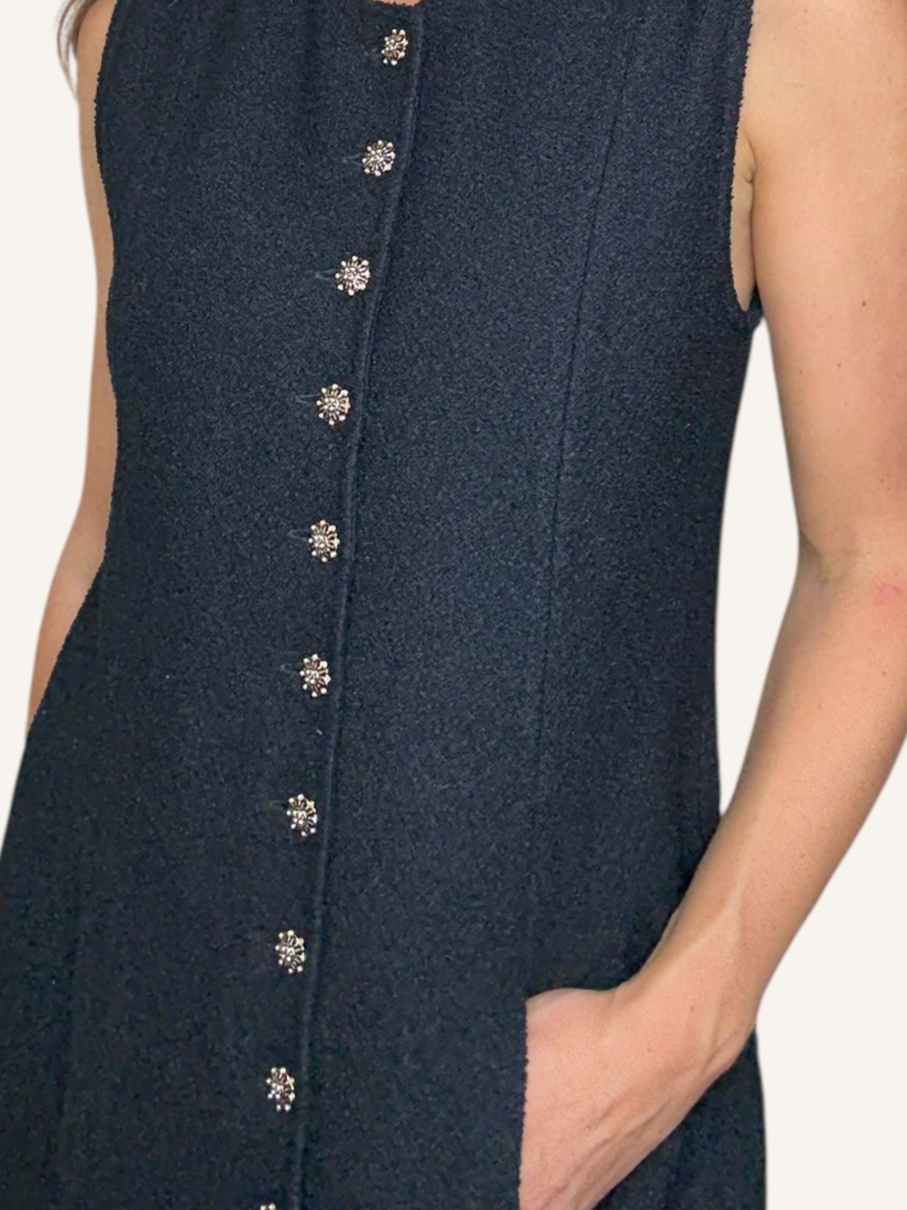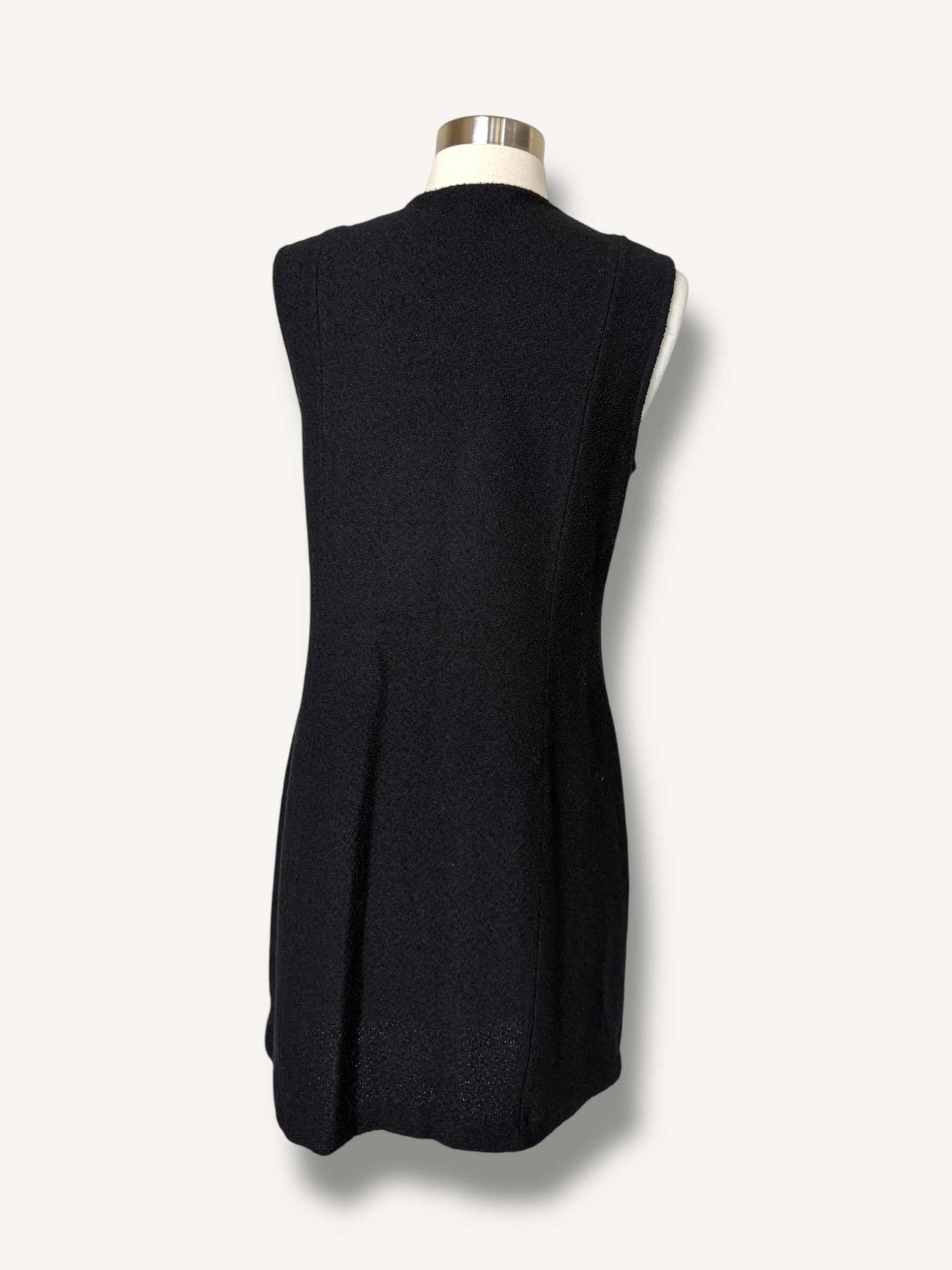 Vintage St. John sleeveless knit dress in classic black. Features a structured A-line silhouette, round neckline, statement gold-tone buttons down the front and hidden pockets on both sides. Timeless, elegant, and effortlessly chic.