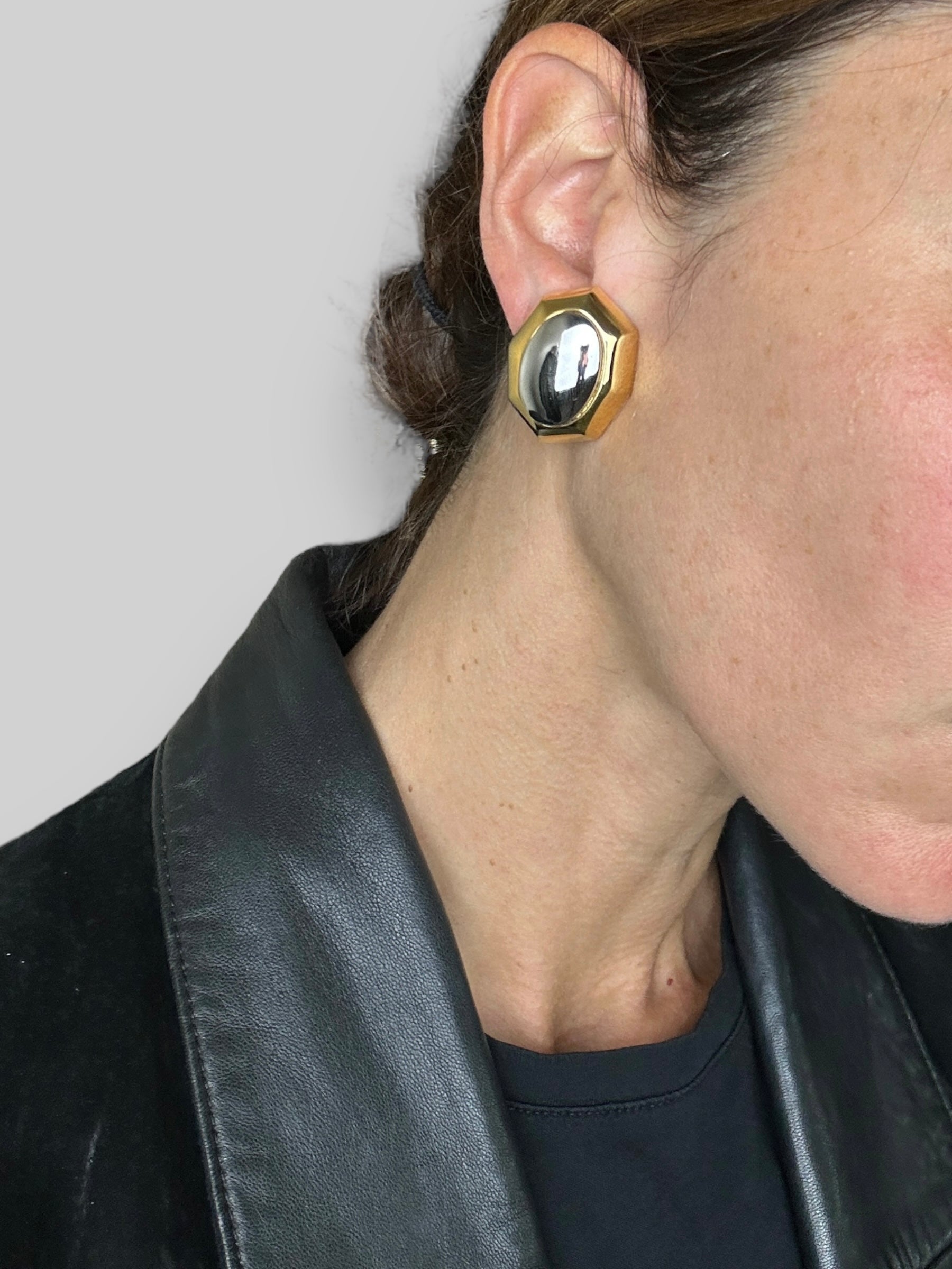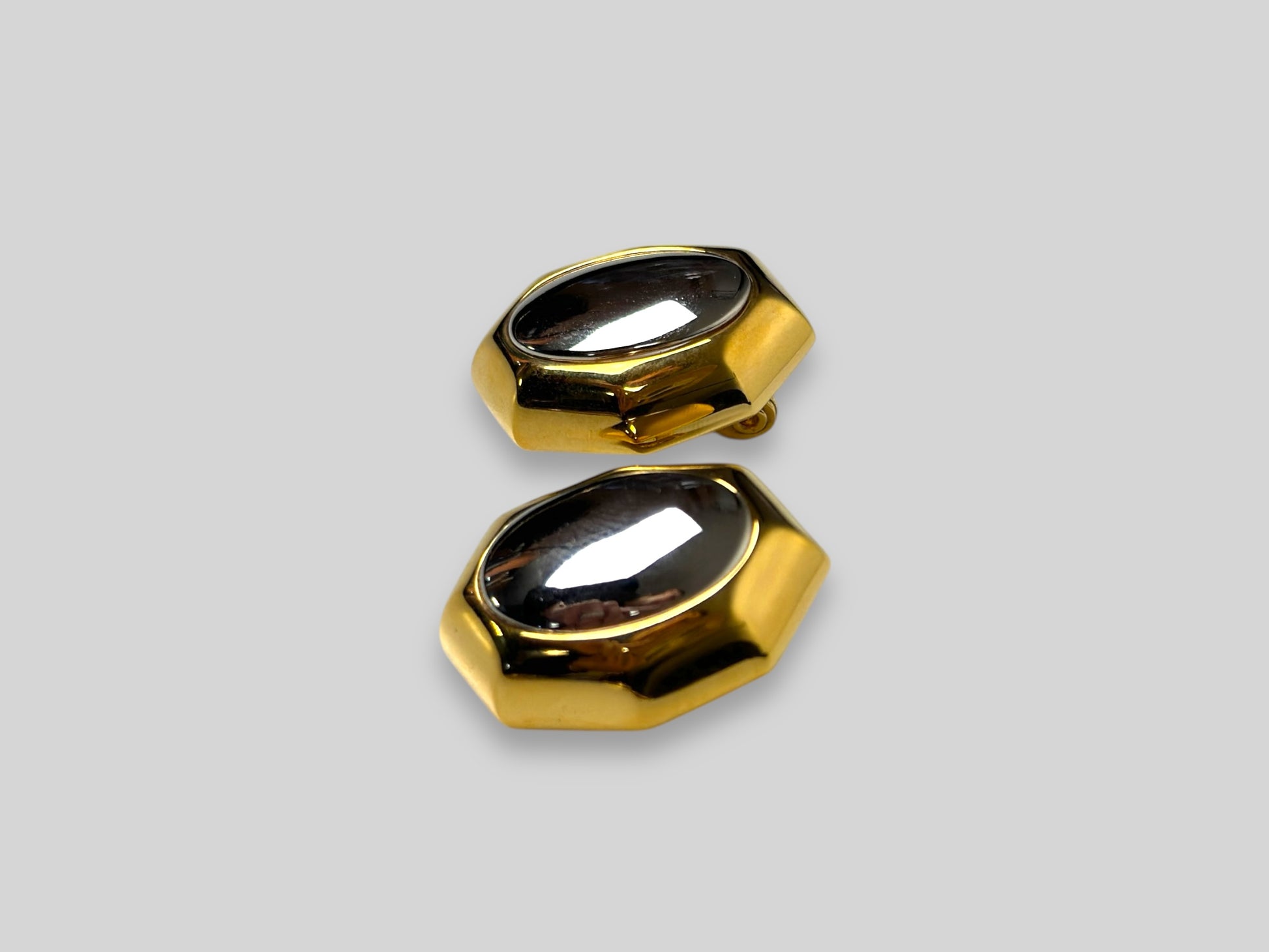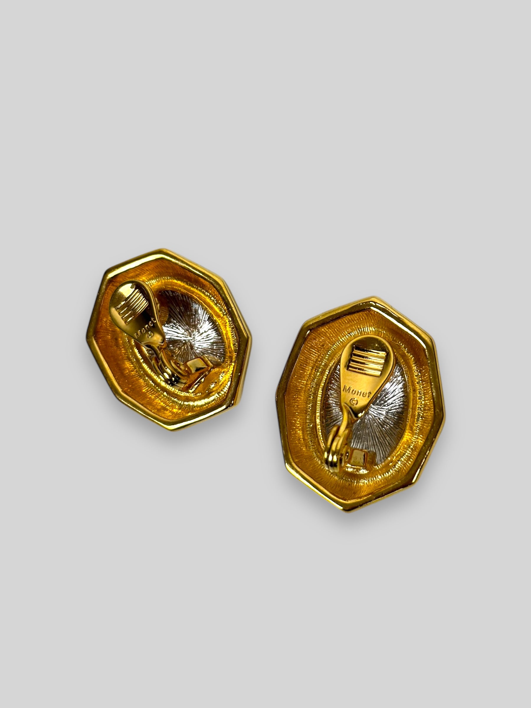 Vintage rare signed MONET clip on earrings from the early 1990's. The earrings have a shiny gold and silver coloured base. The earrings are plated with 22k gold and rhodium (which has a mirror effect) to give it MONET’s long lasting quality and reputable name. The earrings measures approximately 1.25 inch long by approximately 1 inch wide. |