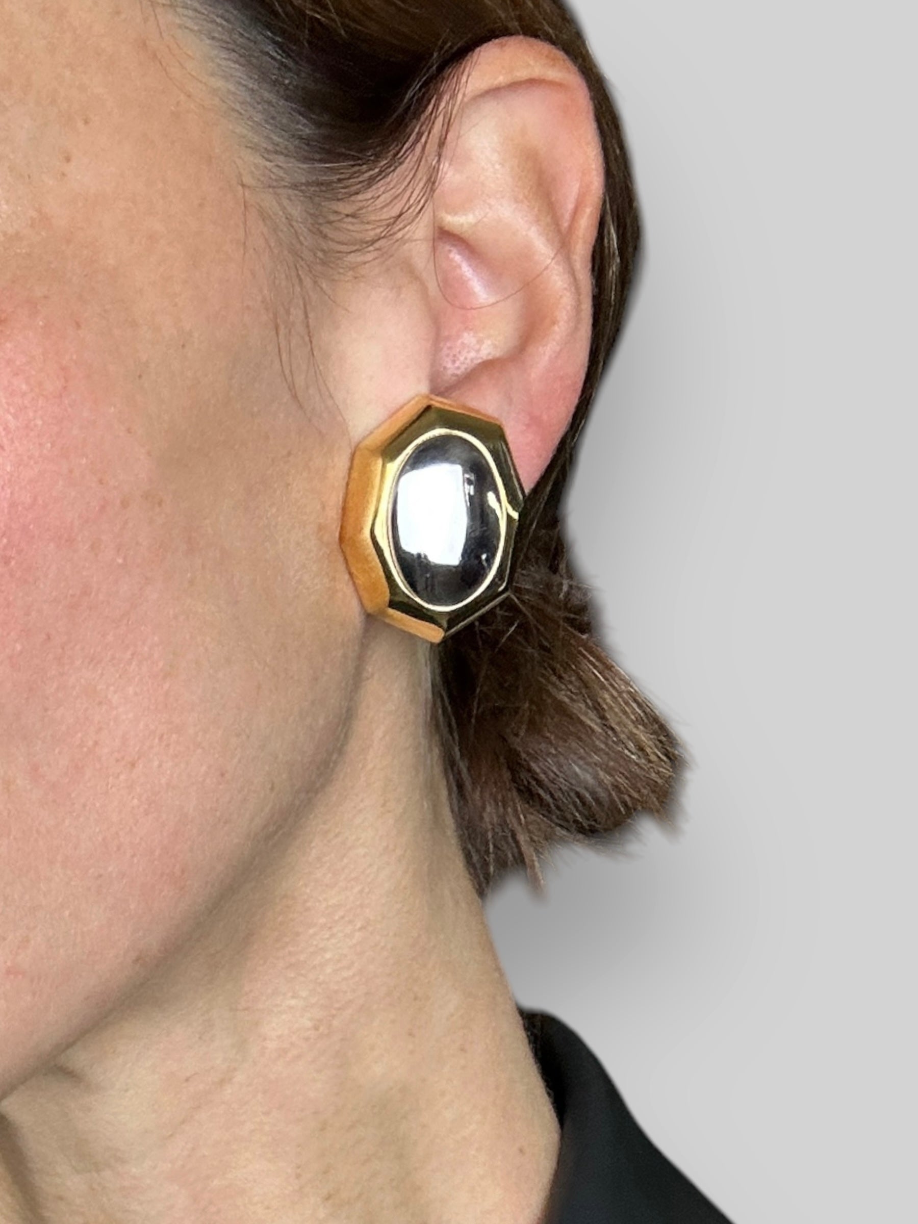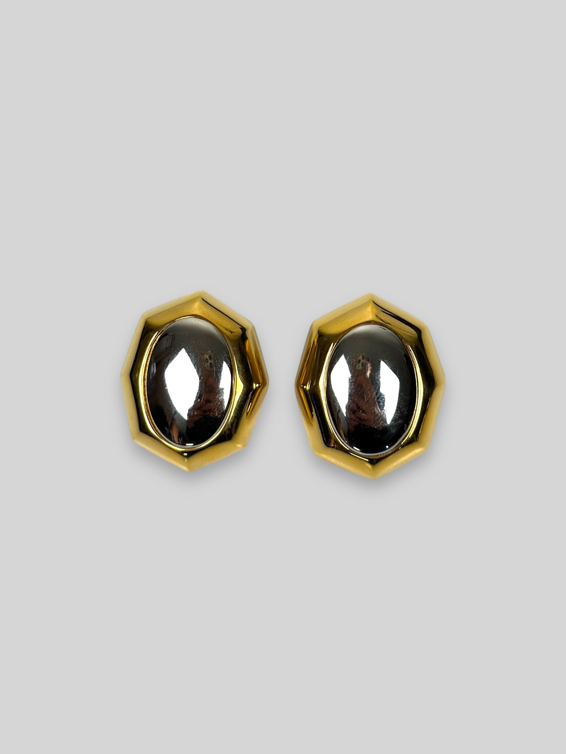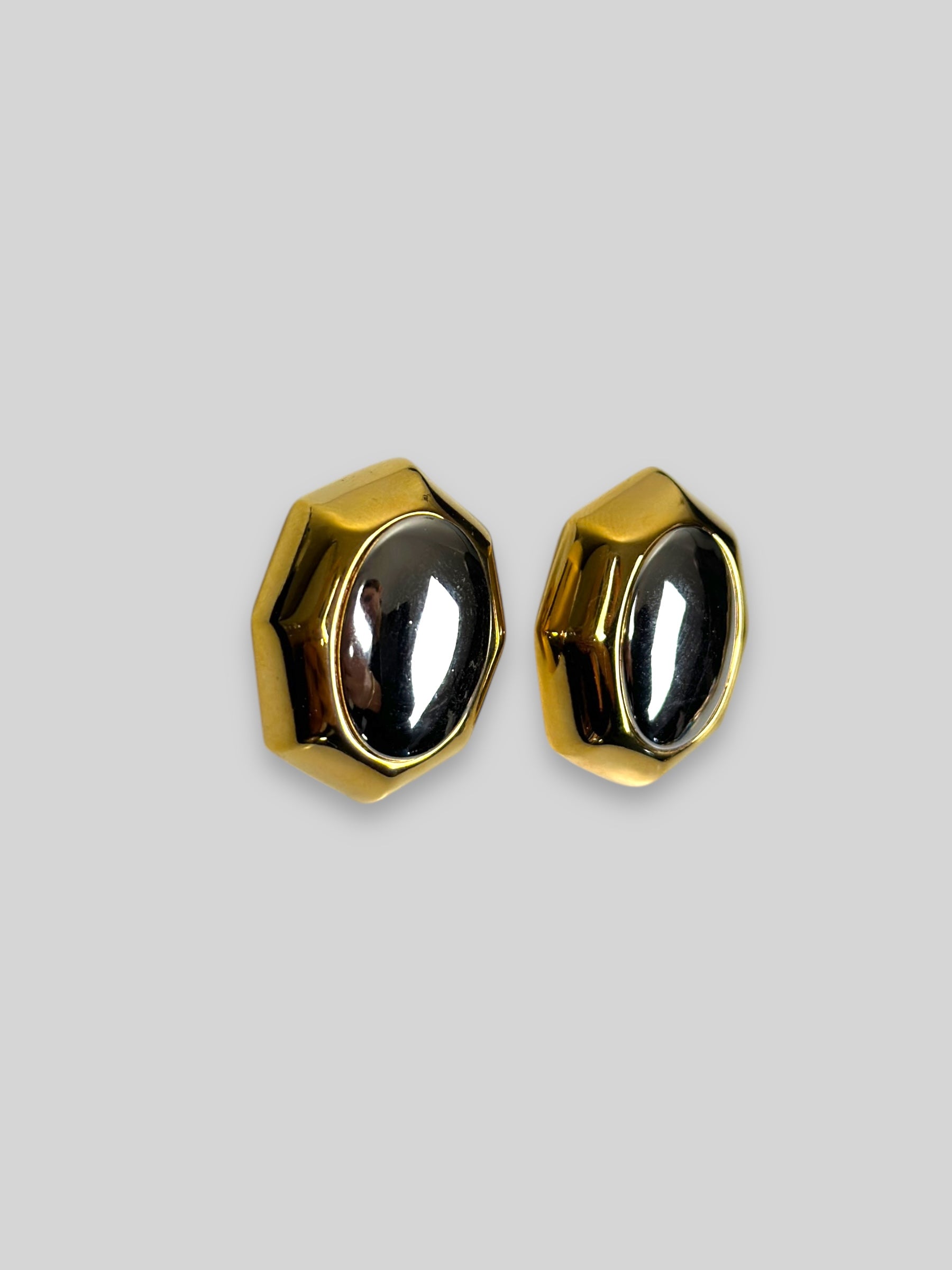 Vintage rare signed MONET clip on earrings from the early 1990's. The earrings have a shiny gold and silver coloured base. The earrings are plated with 22k gold and rhodium (which has a mirror effect) to give it MONET’s long lasting quality and reputable name. The earrings measures approximately 1.25 inch long by approximately 1 inch wide. |