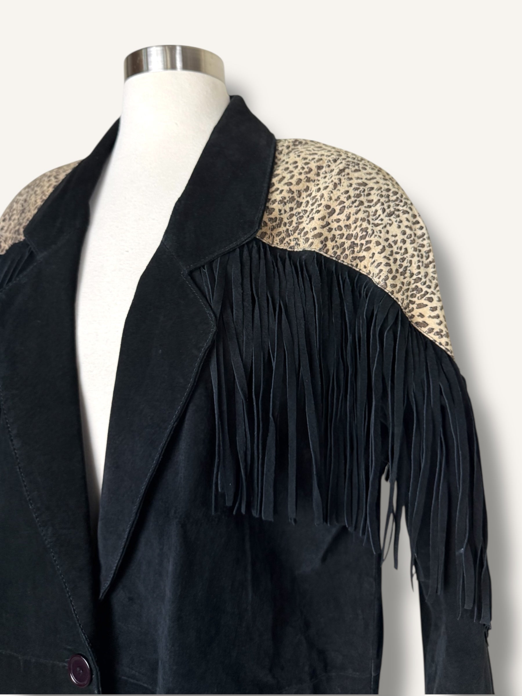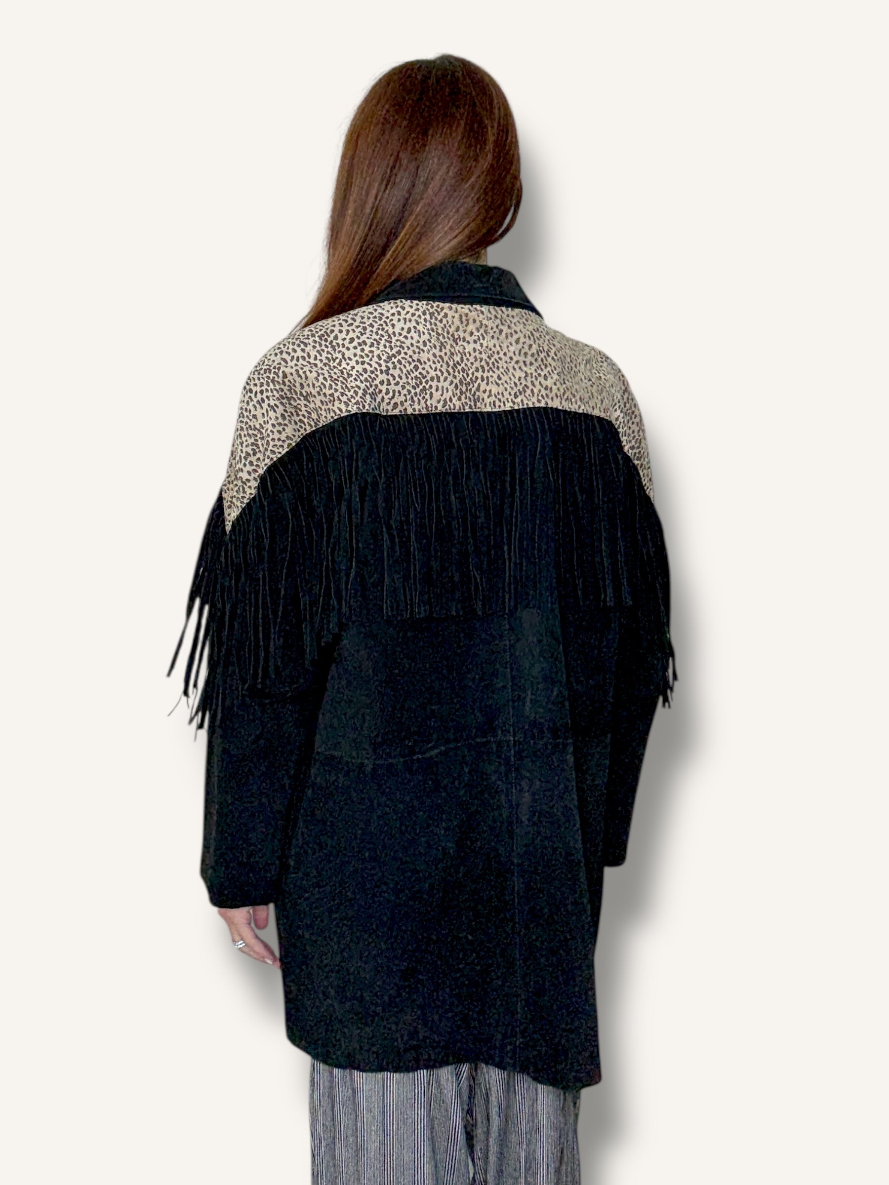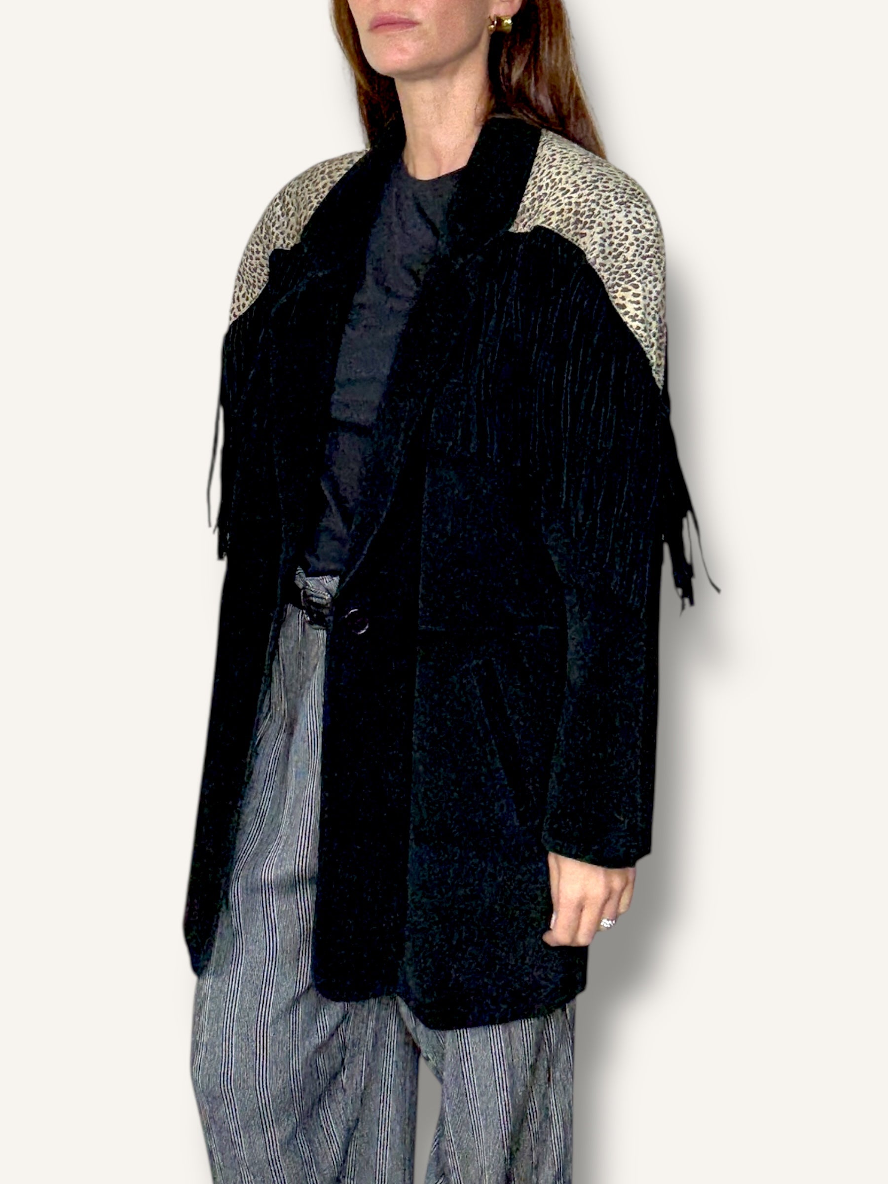 Vintage Suede Fringe Jacket, Western with a twist. Crafted from soft black suede with leopard-print panels and dramatic fringe detailing across the shoulders and back. Oversized fit with a single-button closure, the kind of jacket that turns every entrance into a moment.
