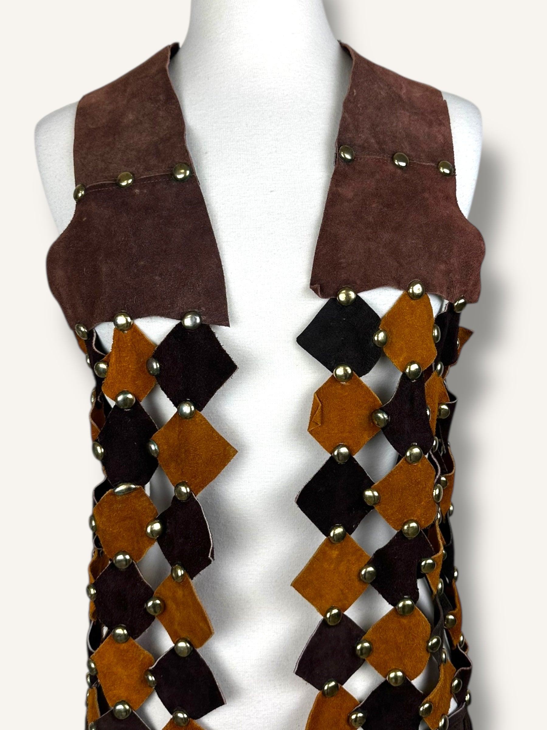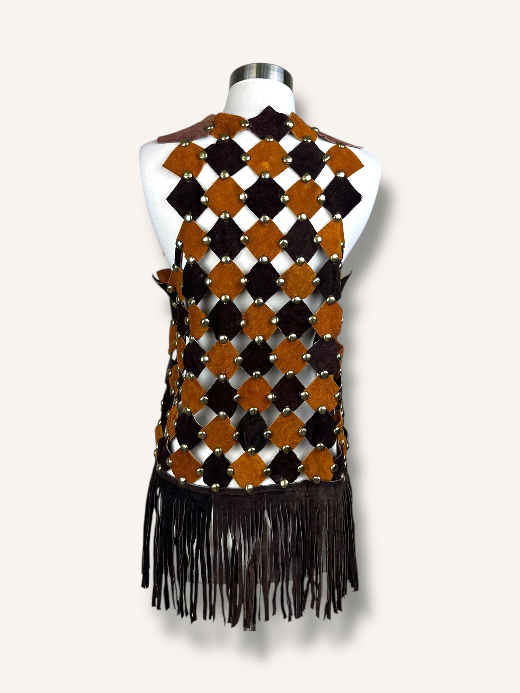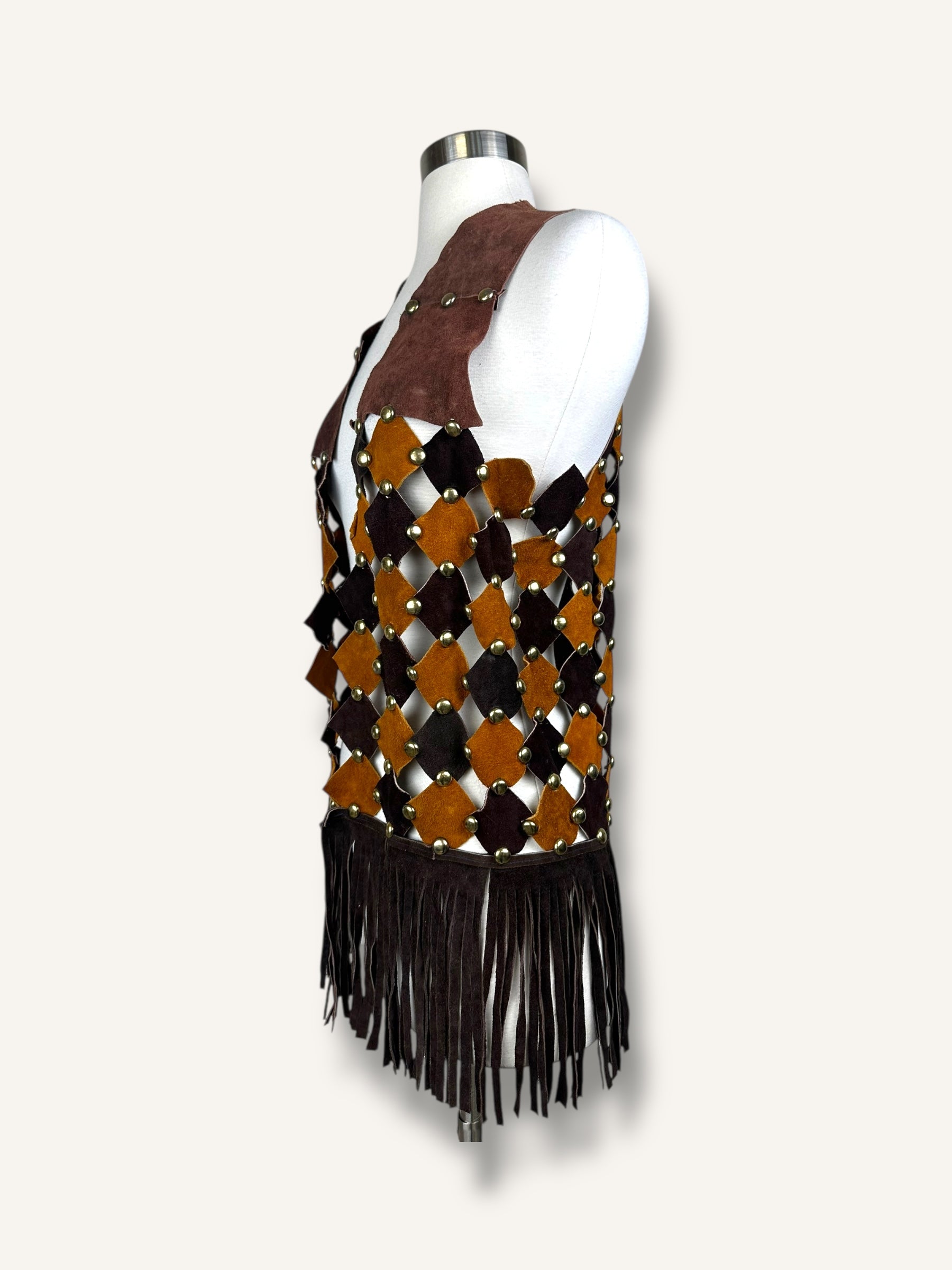 Vintage suede vest, crafted from an intricate patchwork of rich earthy tones and brass-tone studs. A true 70s gem, this open-front piece features soft suede diamonds laced together for a barely-there effect that’s both daring and undeniably cool. Finished with dramatic fringe along the hem, it’s made for dancing under desert skies or layering over basics for an effortlessly bold look.