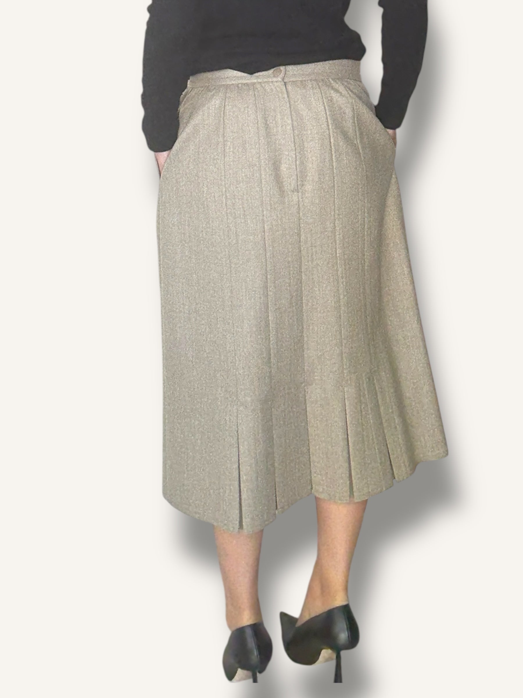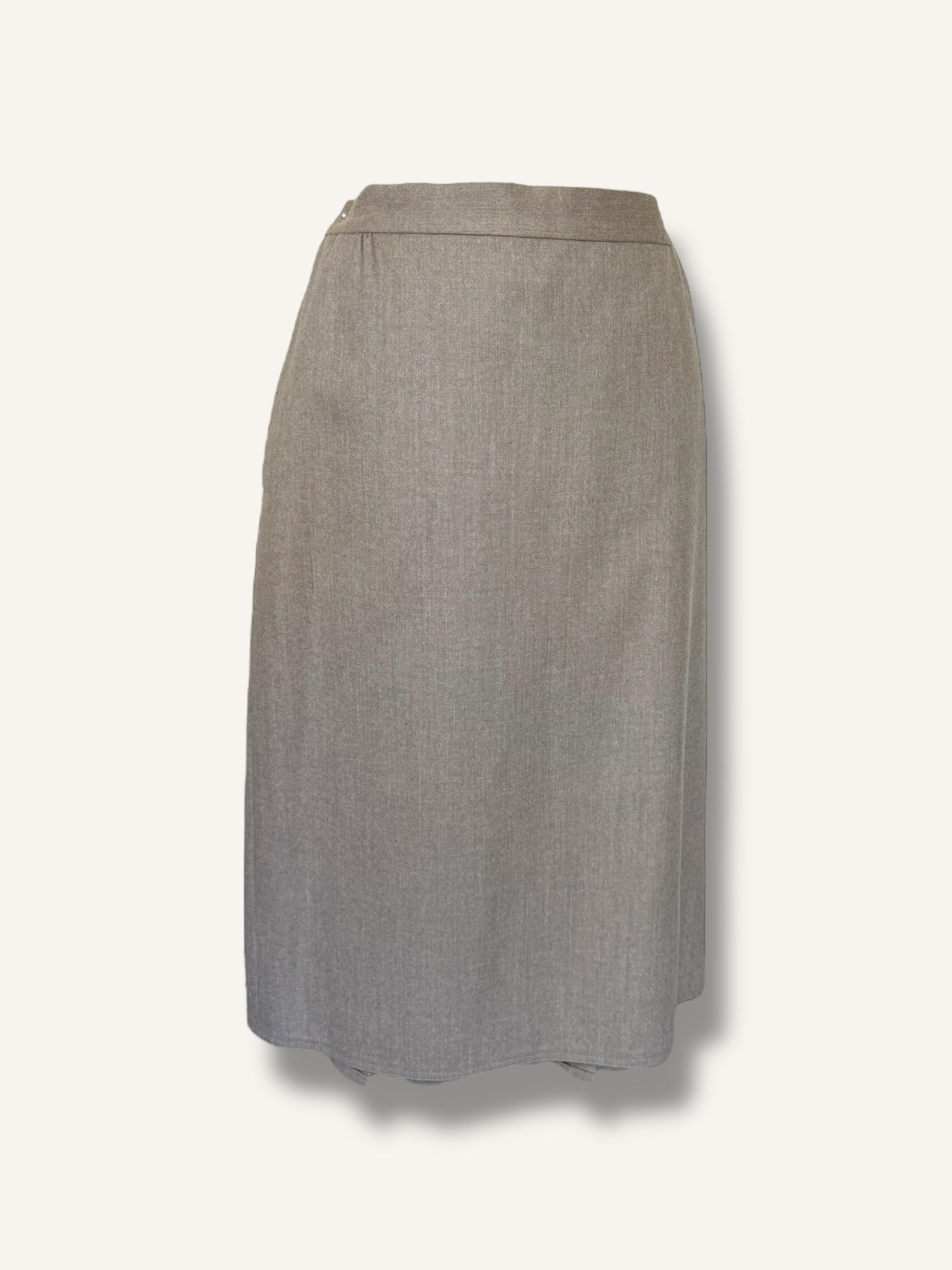 Classic taupe pencil skirt in 100% wool by Hervé Bénard. Designed with a high waist, front pleats, and a back slits for ease of movement. Tailored with a clean waistband and button closure, side pockets, offering a refined and timeless silhouette.