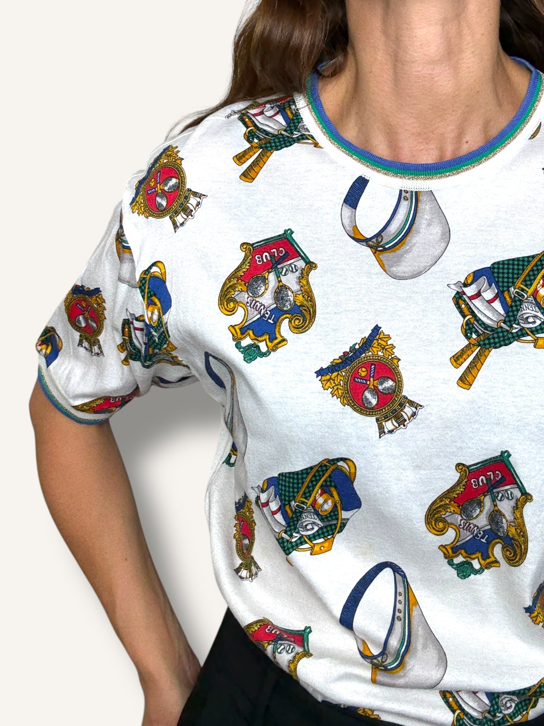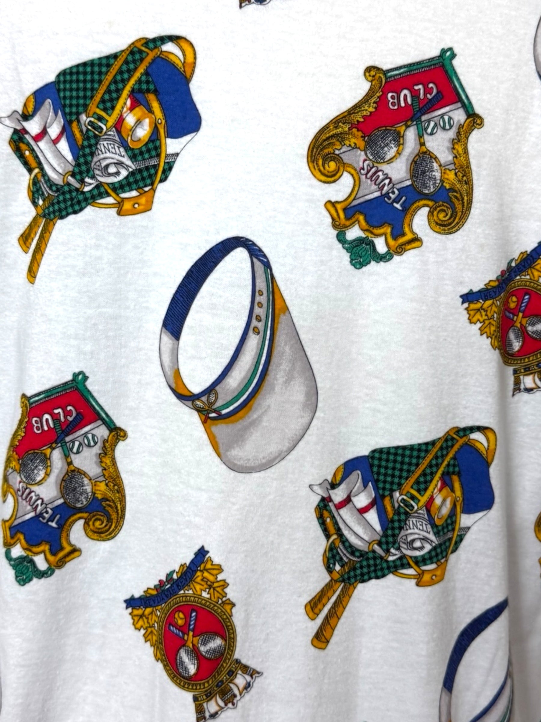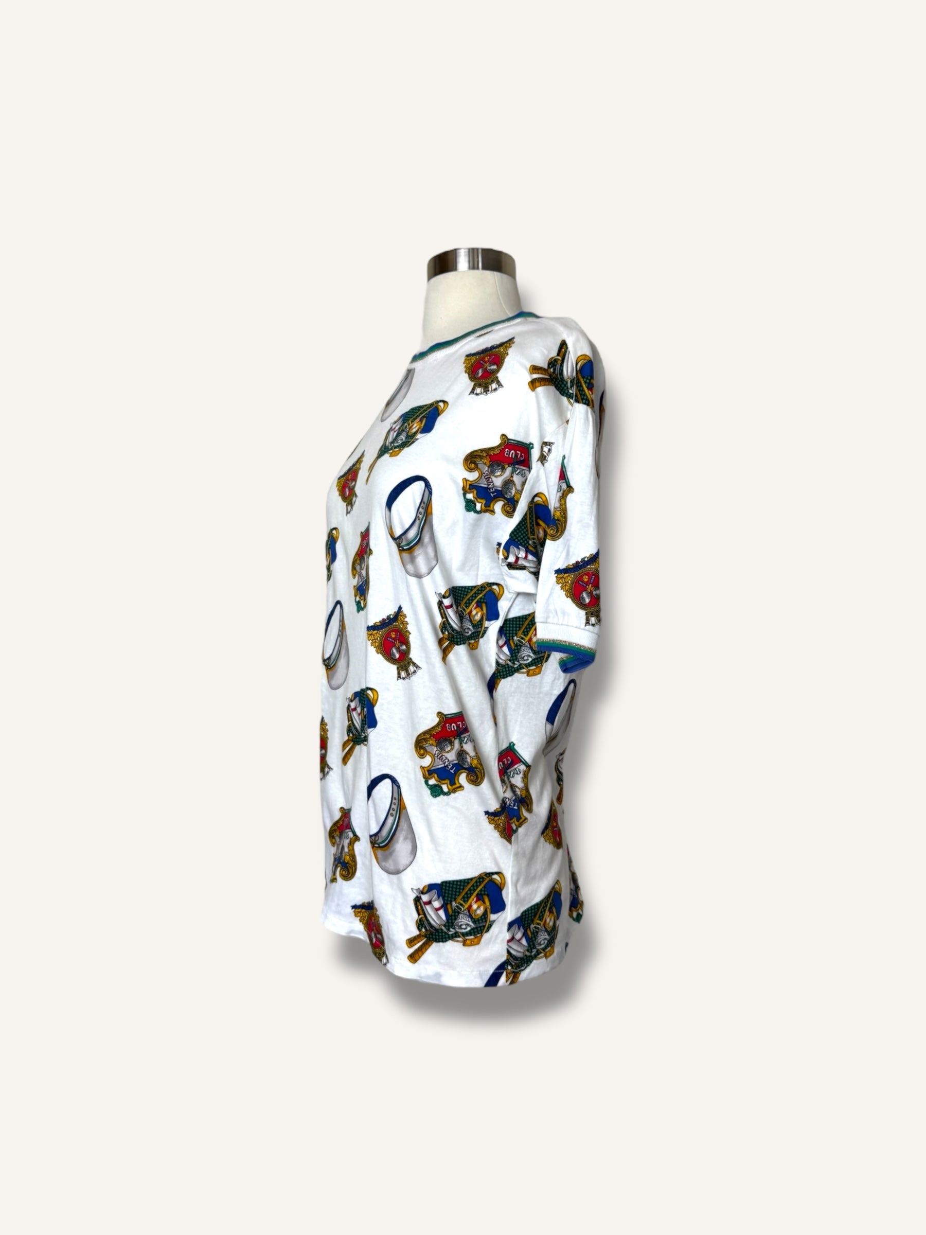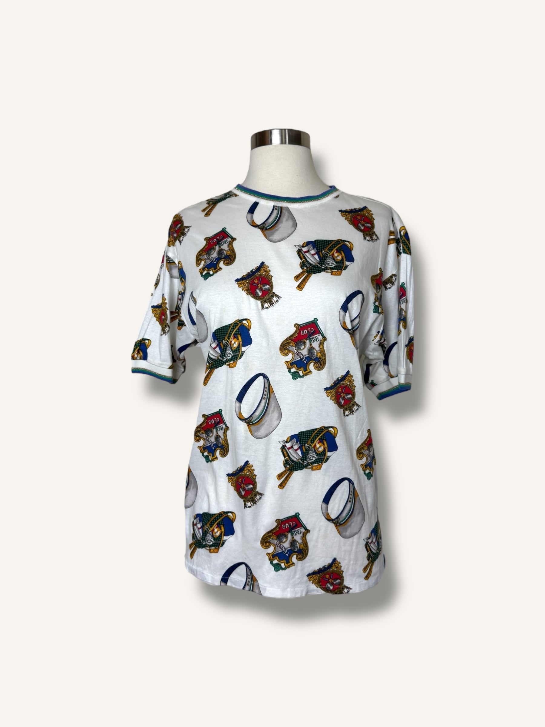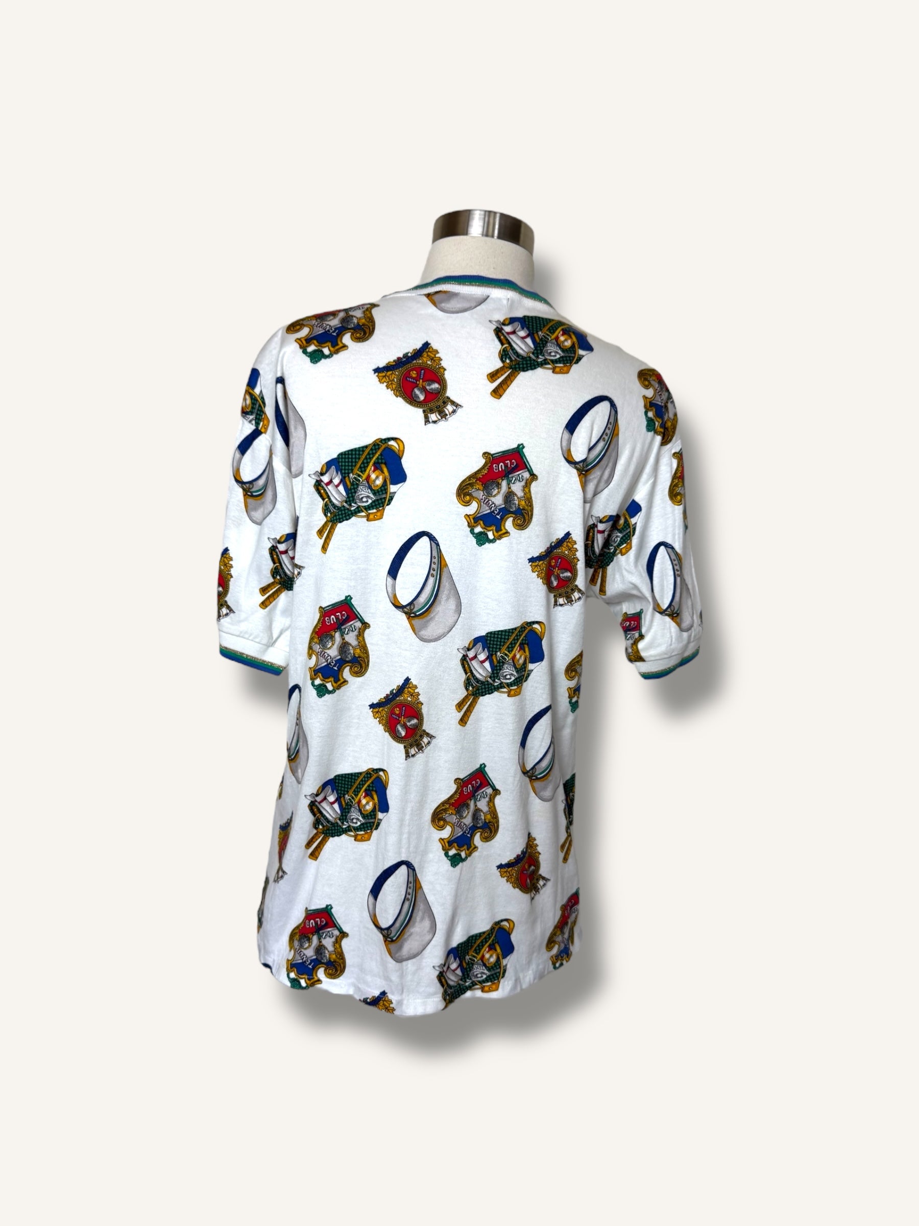 Vintage short-sleeve T-shirt featuring an allover tennis club print with rackets, caps, and crest motifs in vibrant primary tones. Finished with striped ribbed trim at the collar and sleeves for a sporty retro touch.