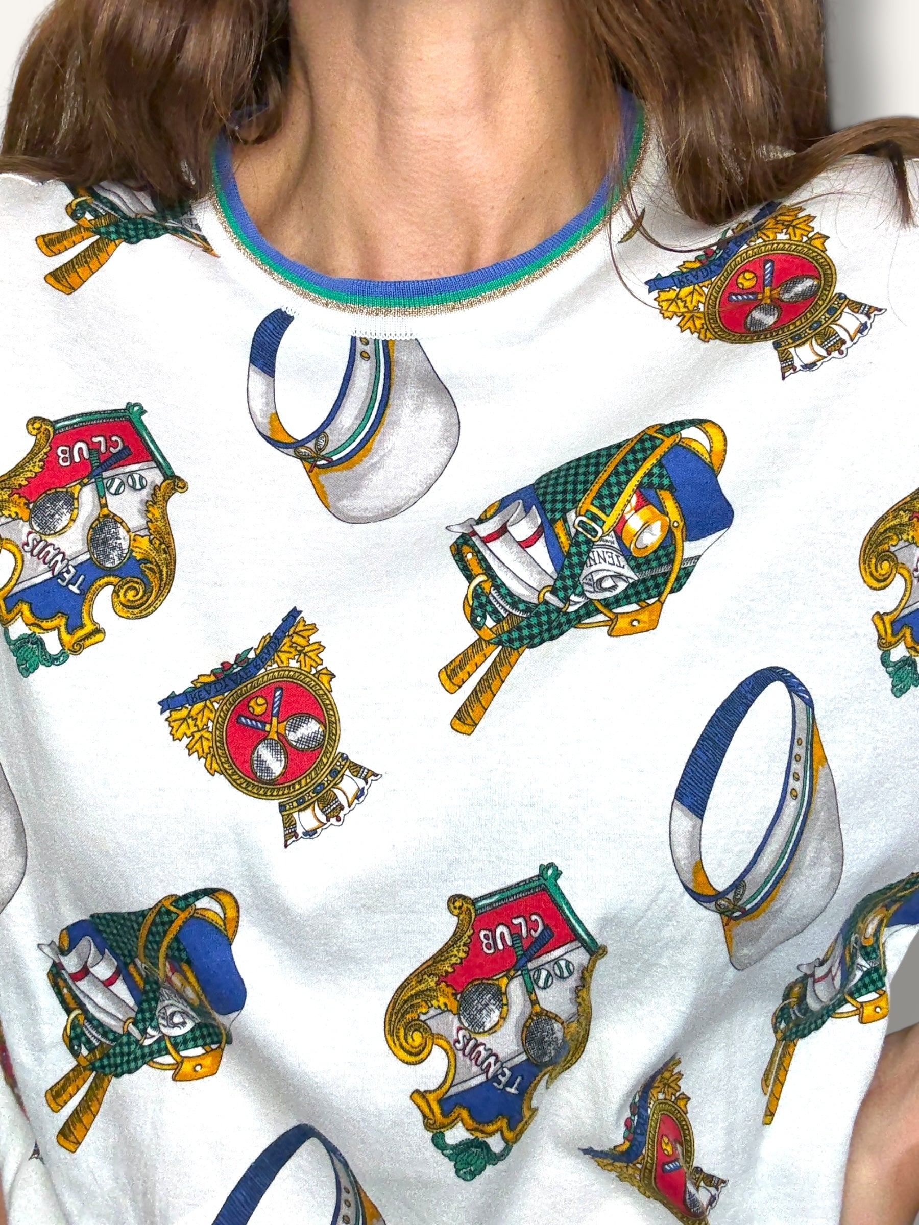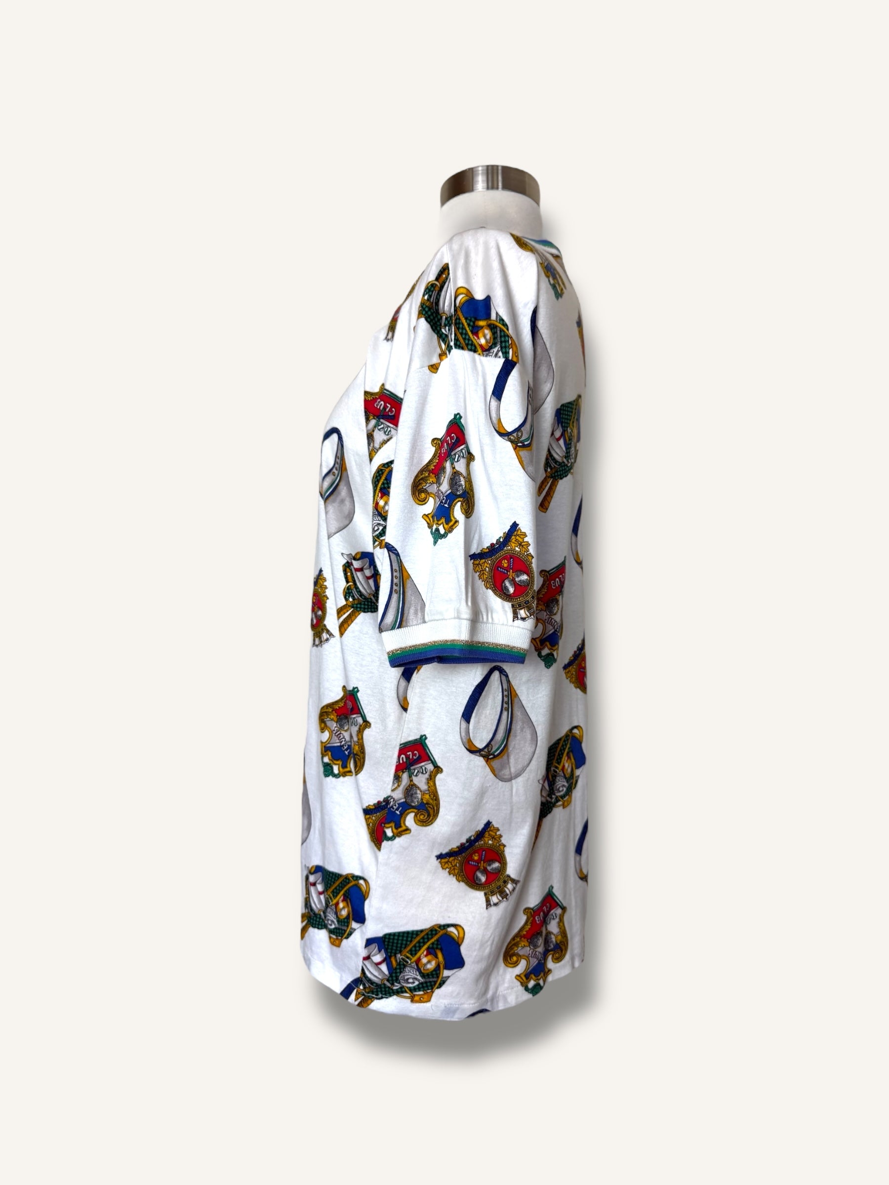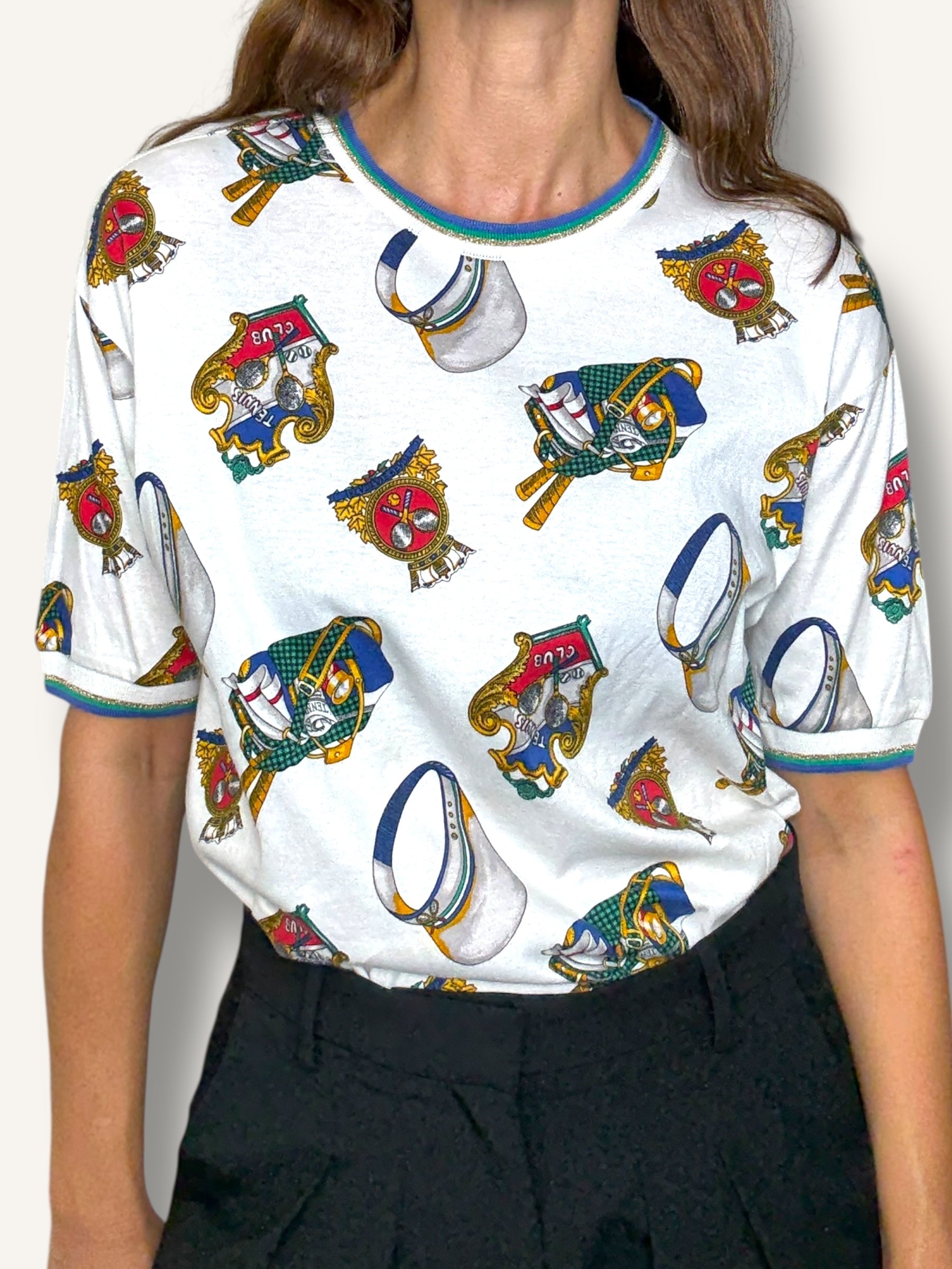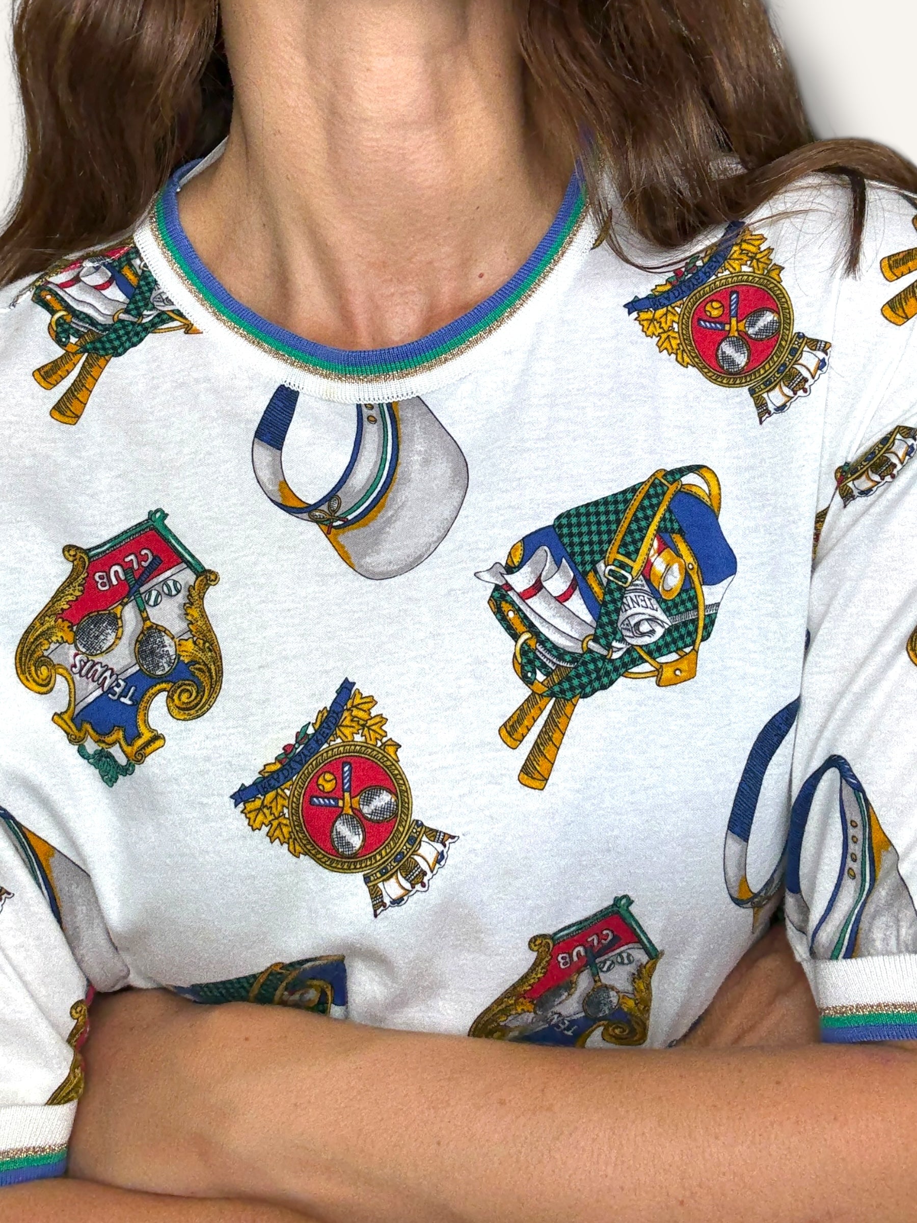 Vintage short-sleeve T-shirt featuring an allover tennis club print with rackets, caps, and crest motifs in vibrant primary tones. Finished with striped ribbed trim at the collar and sleeves for a sporty retro touch.