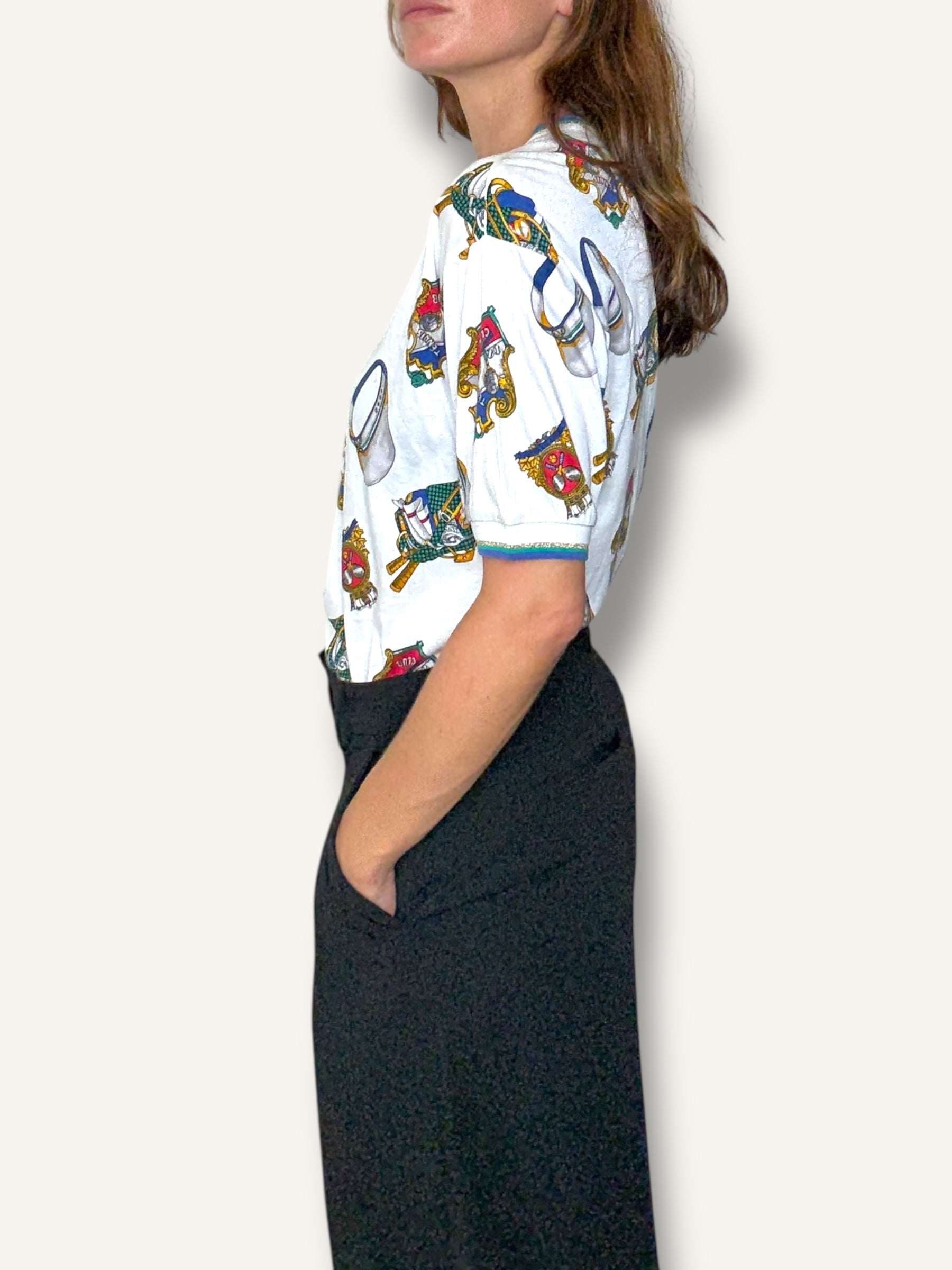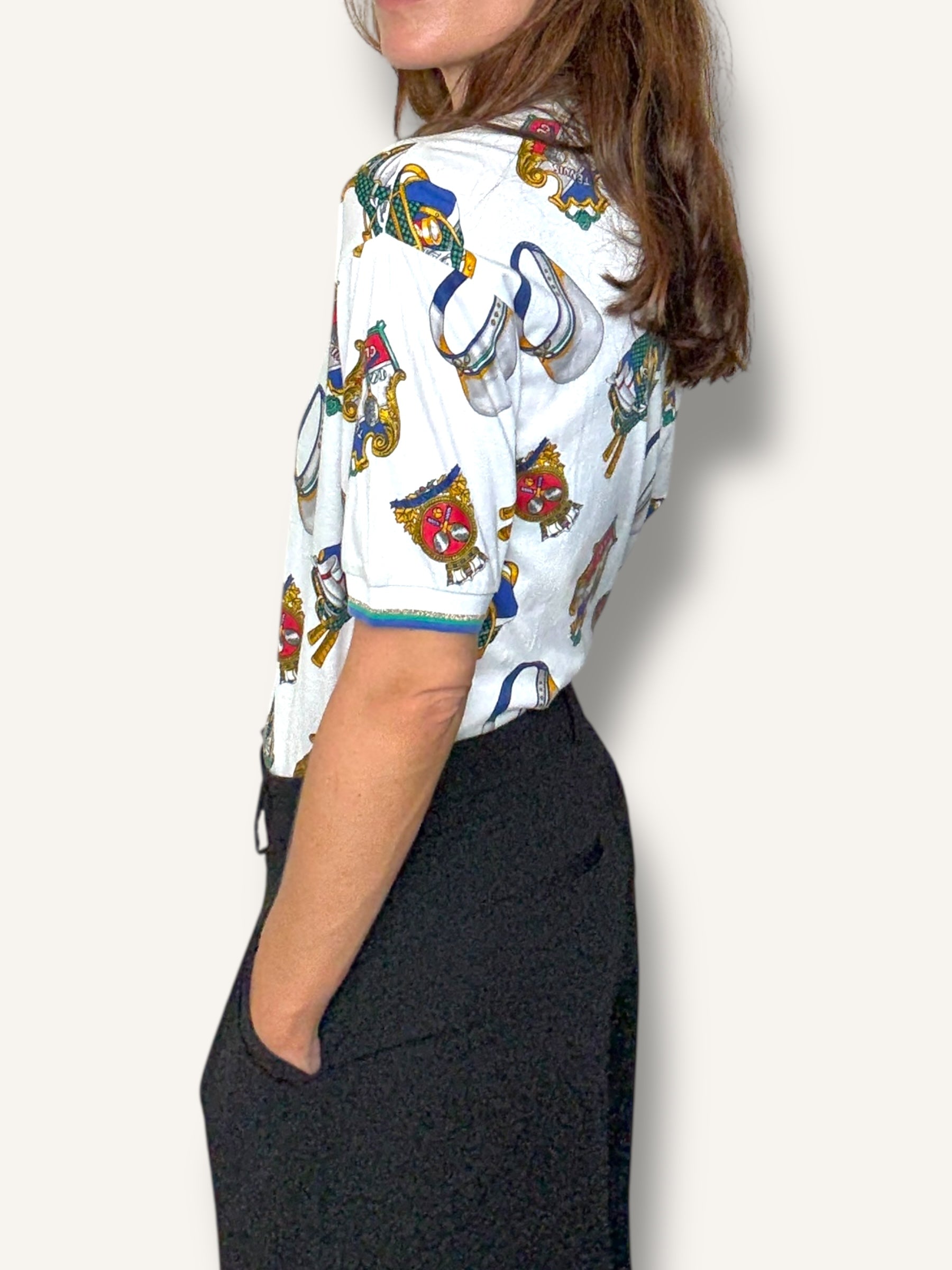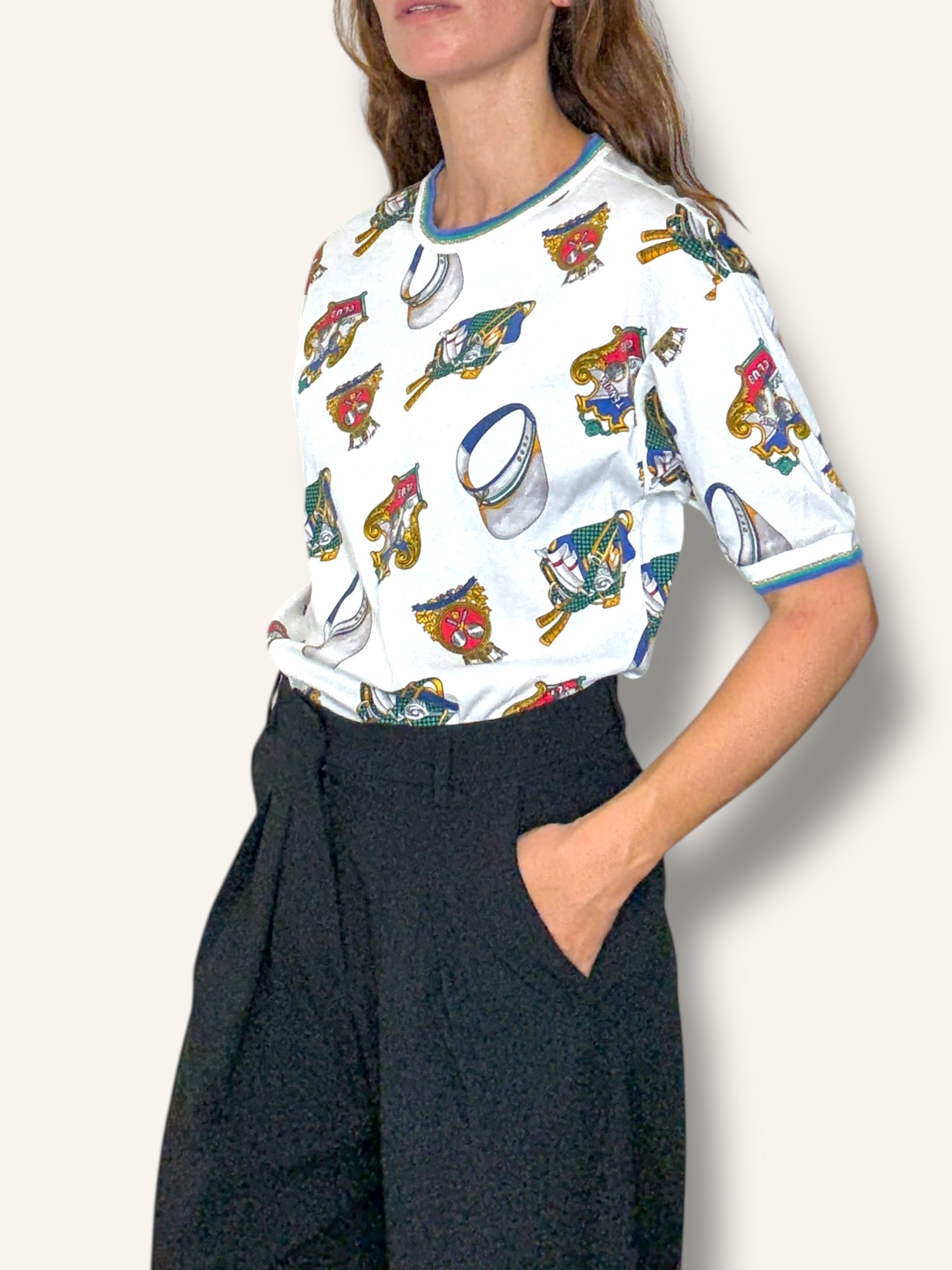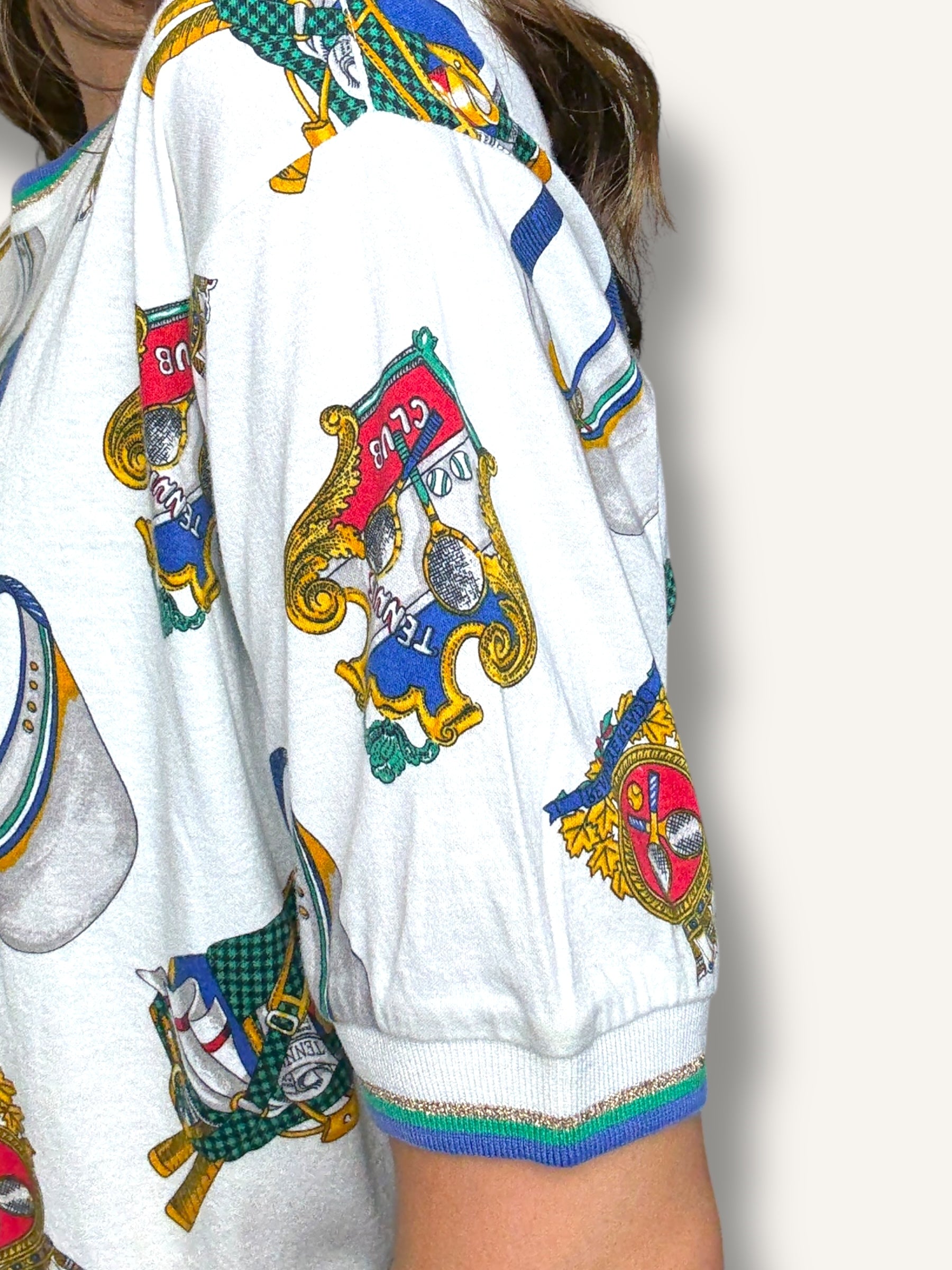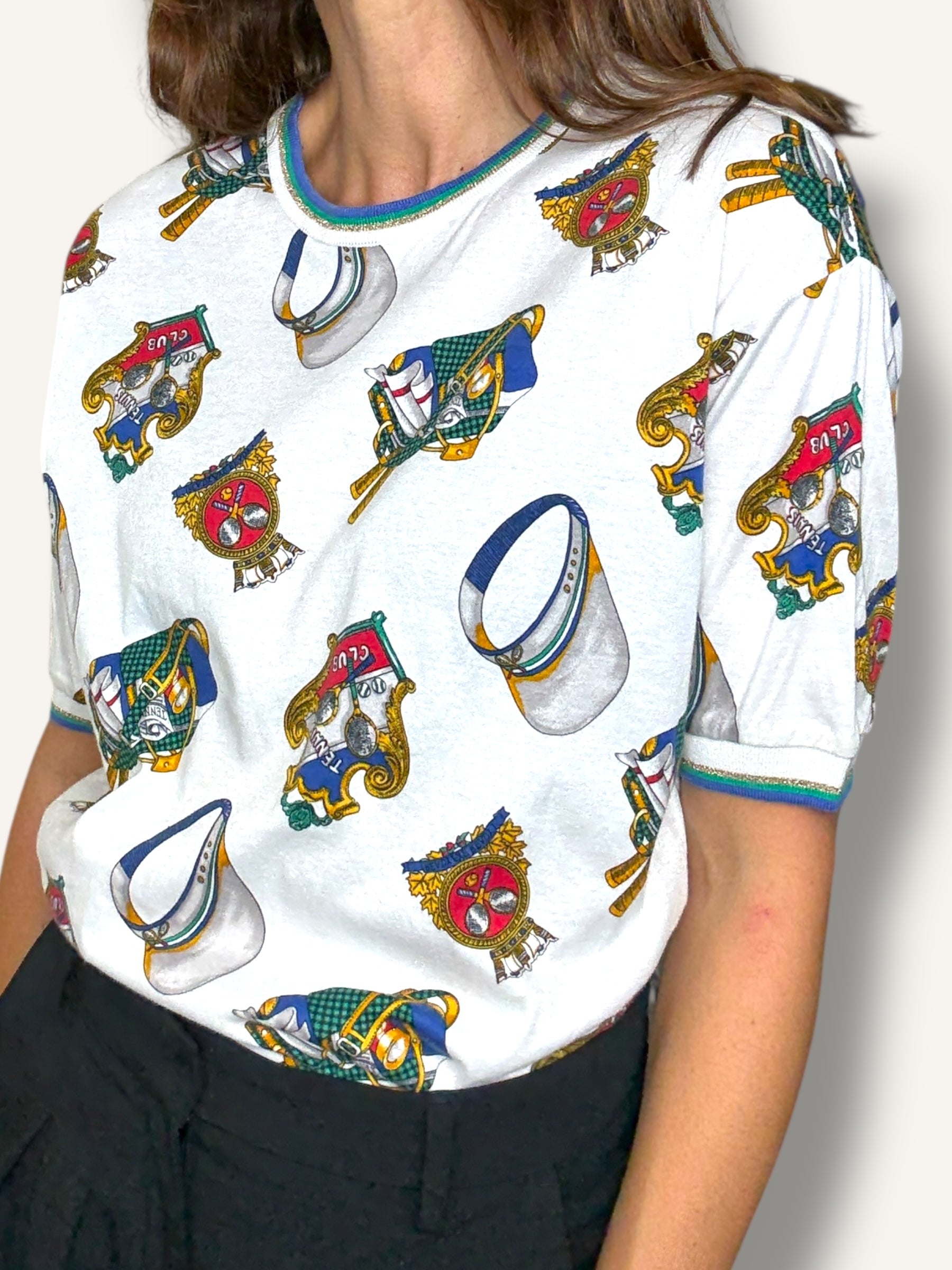 Vintage short-sleeve T-shirt featuring an allover tennis club print with rackets, caps, and crest motifs in vibrant primary tones. Finished with striped ribbed trim at the collar and sleeves for a sporty retro touch.