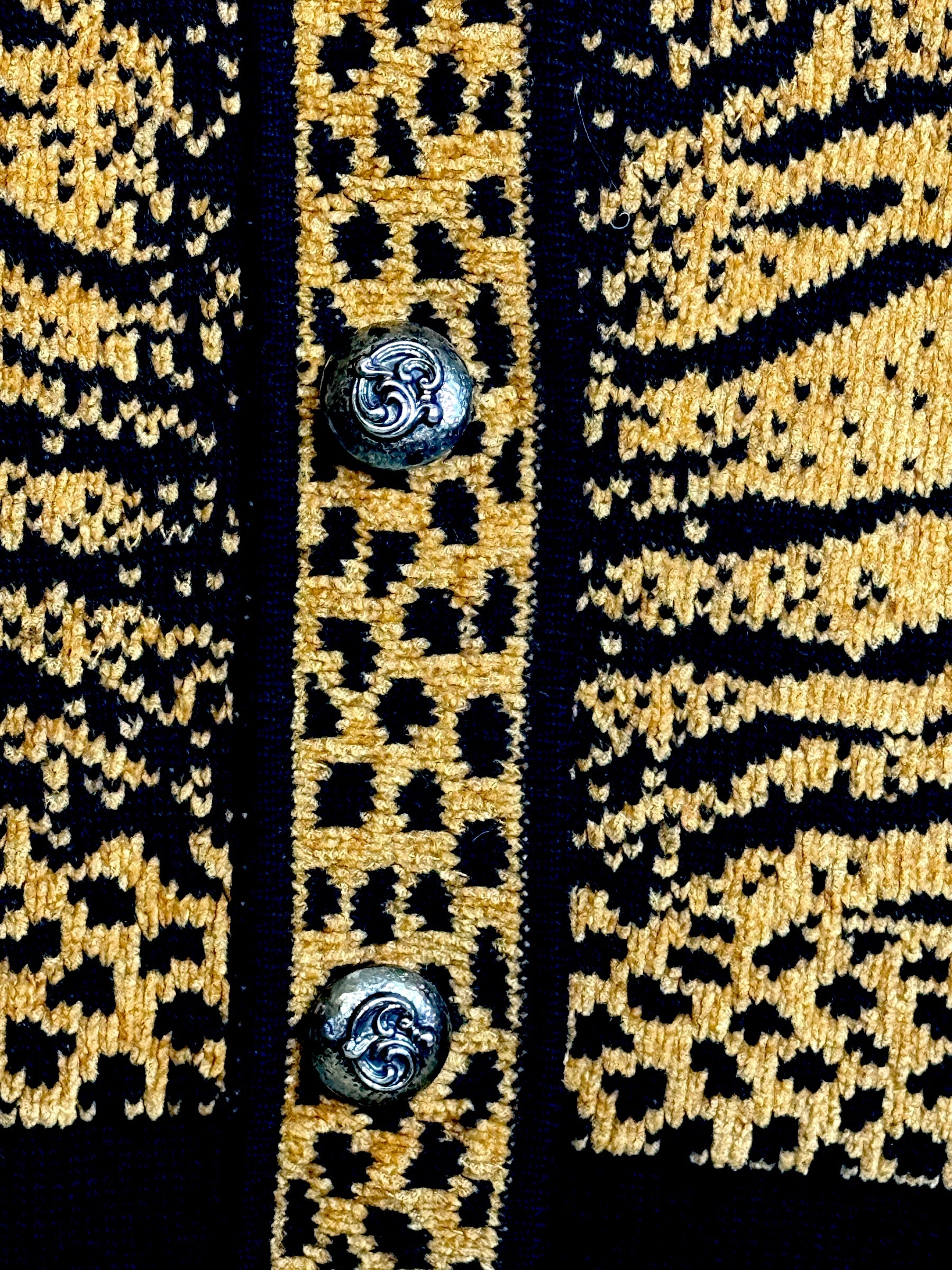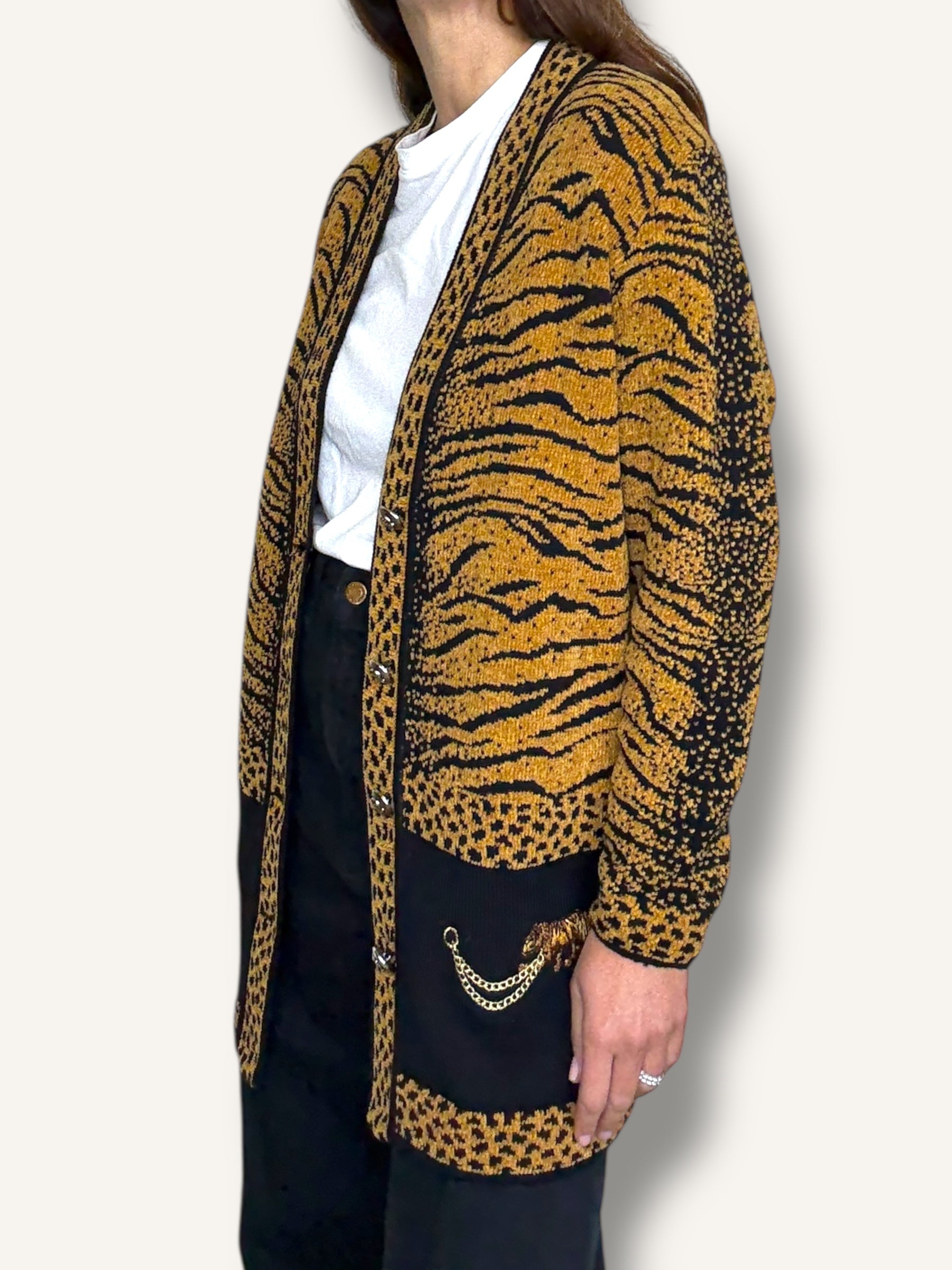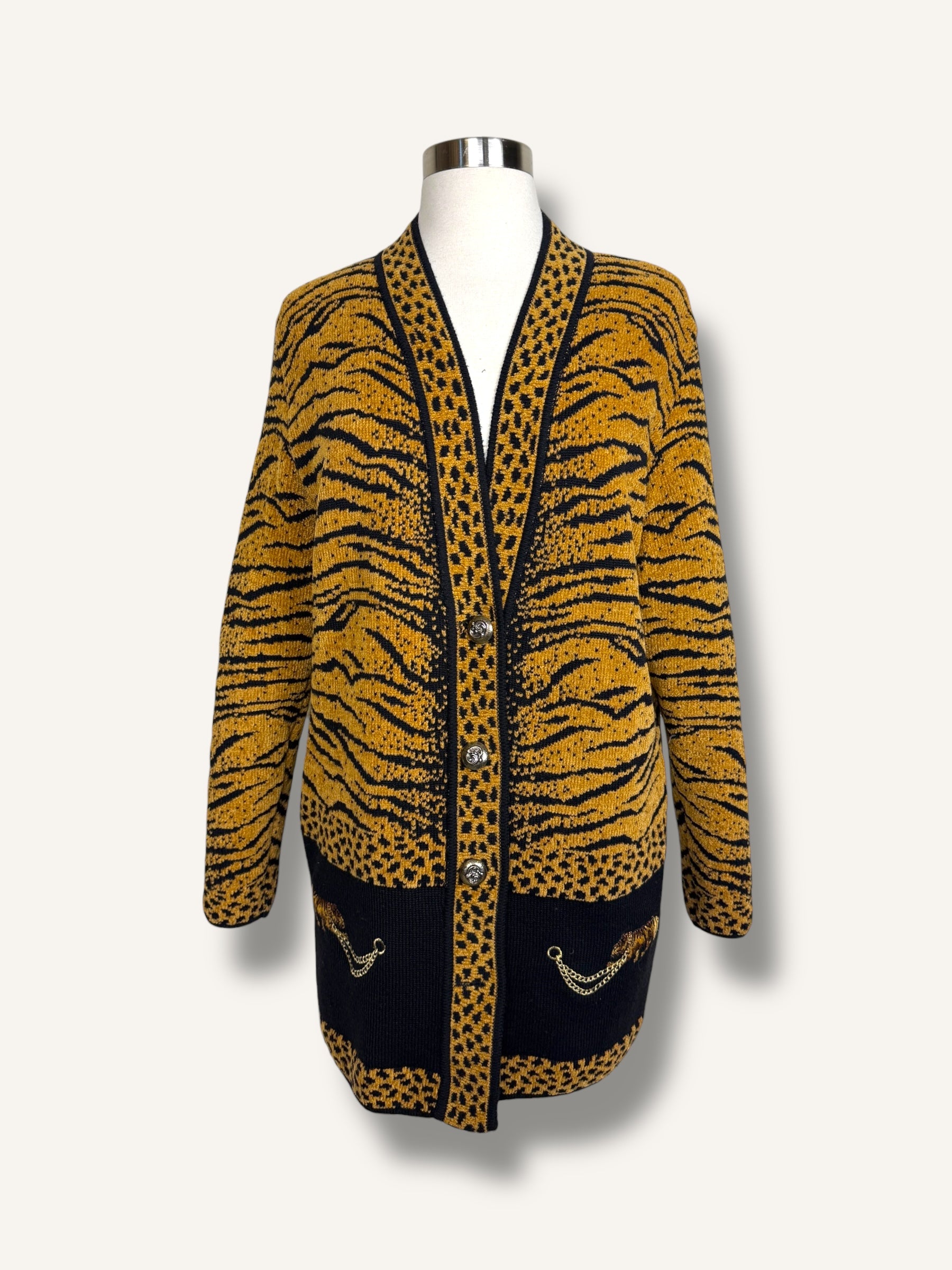 A true statement knit with maximum attitude: this vintage longline cardigan features a bold gold-and-black animal jacquard that mixes tiger striping with leopard spots, finished with a contrasting black band at the hips. Designed with a deep V neckline and leopard-trimmed placket, it fastens with ornate silver-tone buttons and is accented with tiger and chains motif at the pocket area Wear it buttoned as a top, layered over a slip dress, or thrown on with denim and boots—instant outfit.