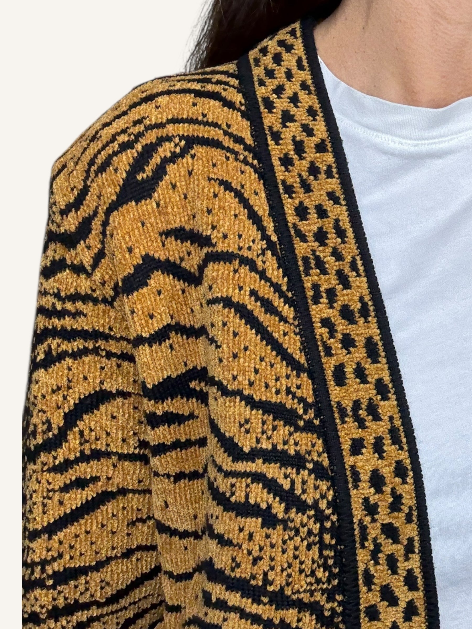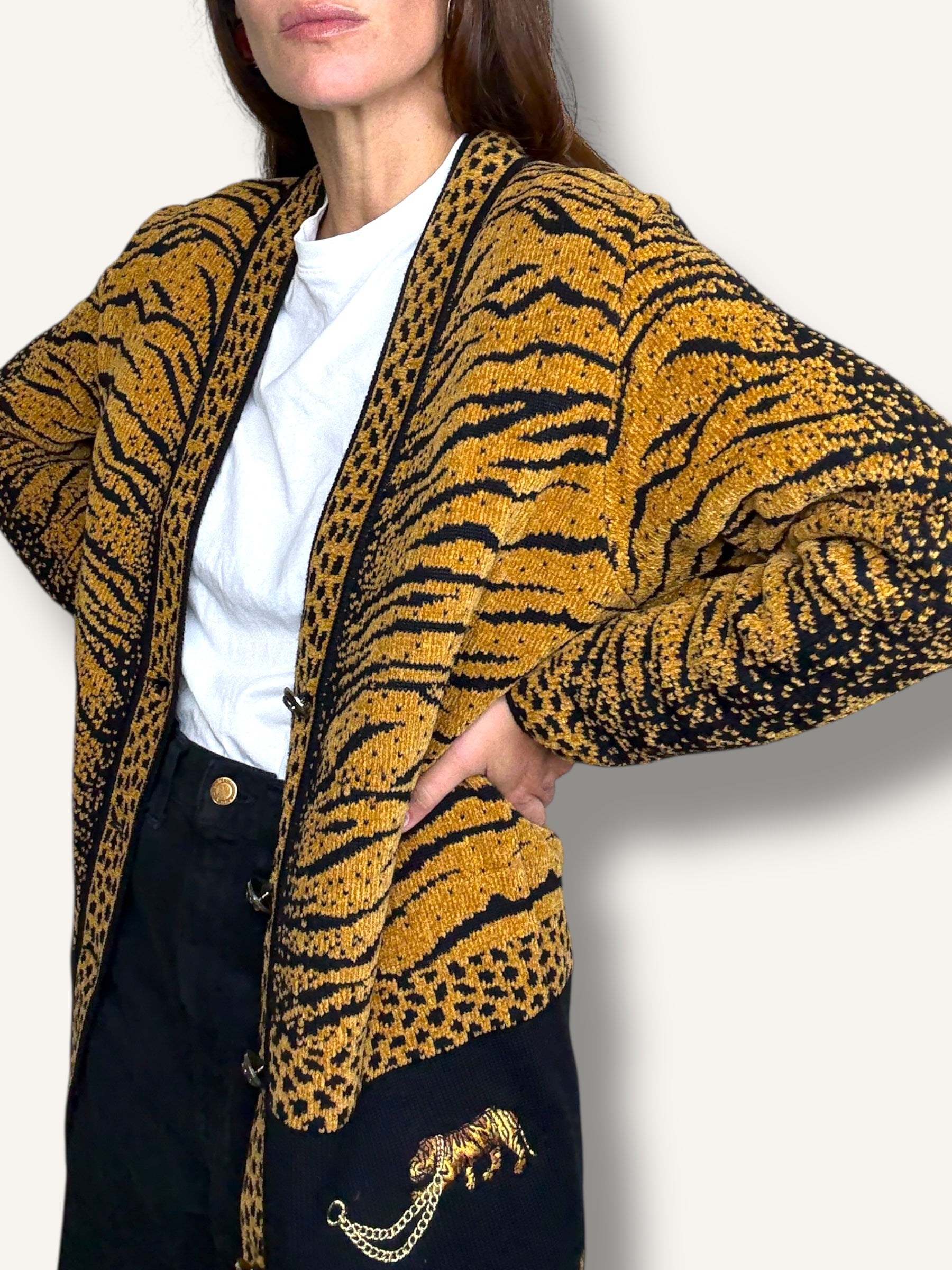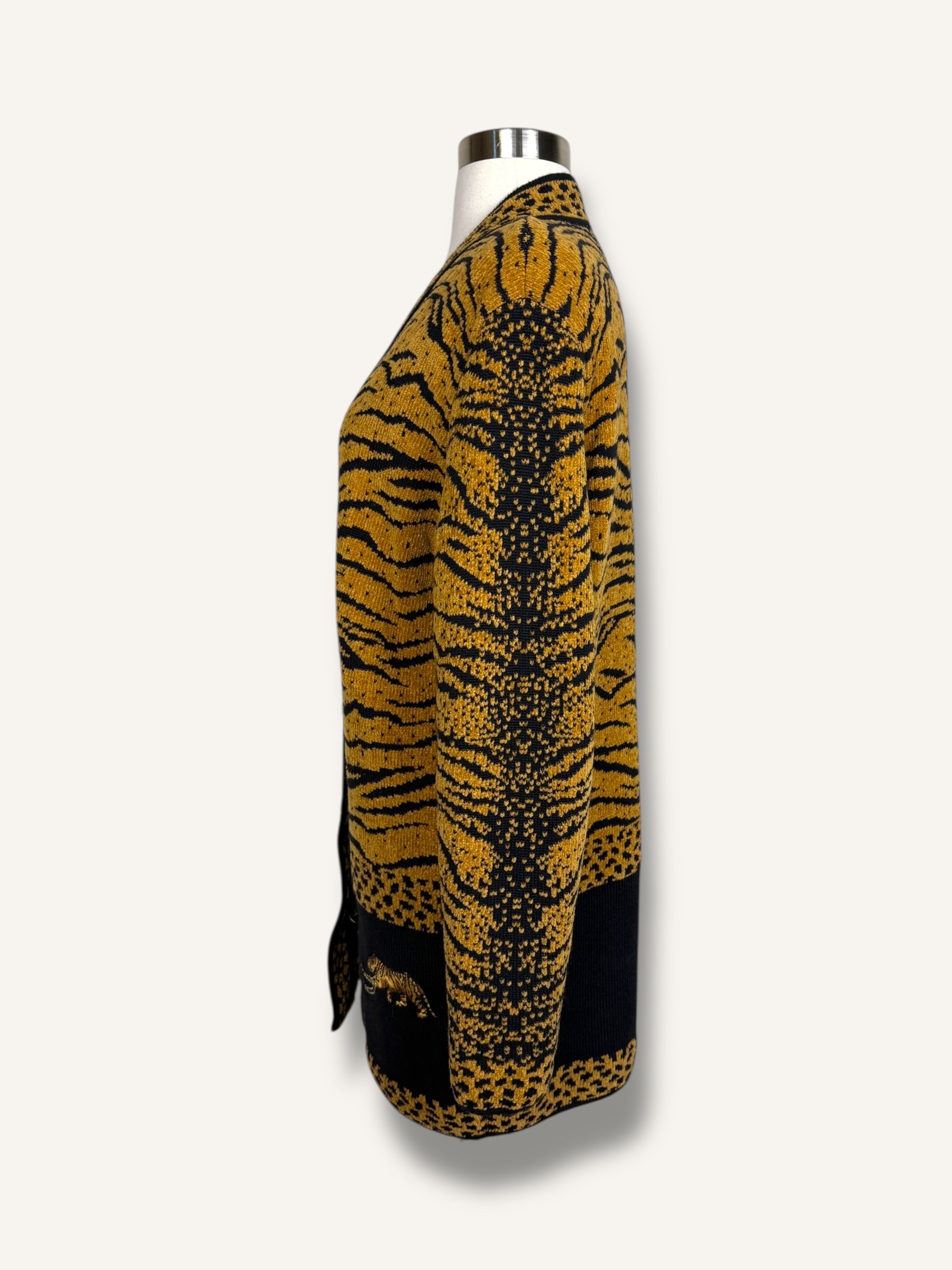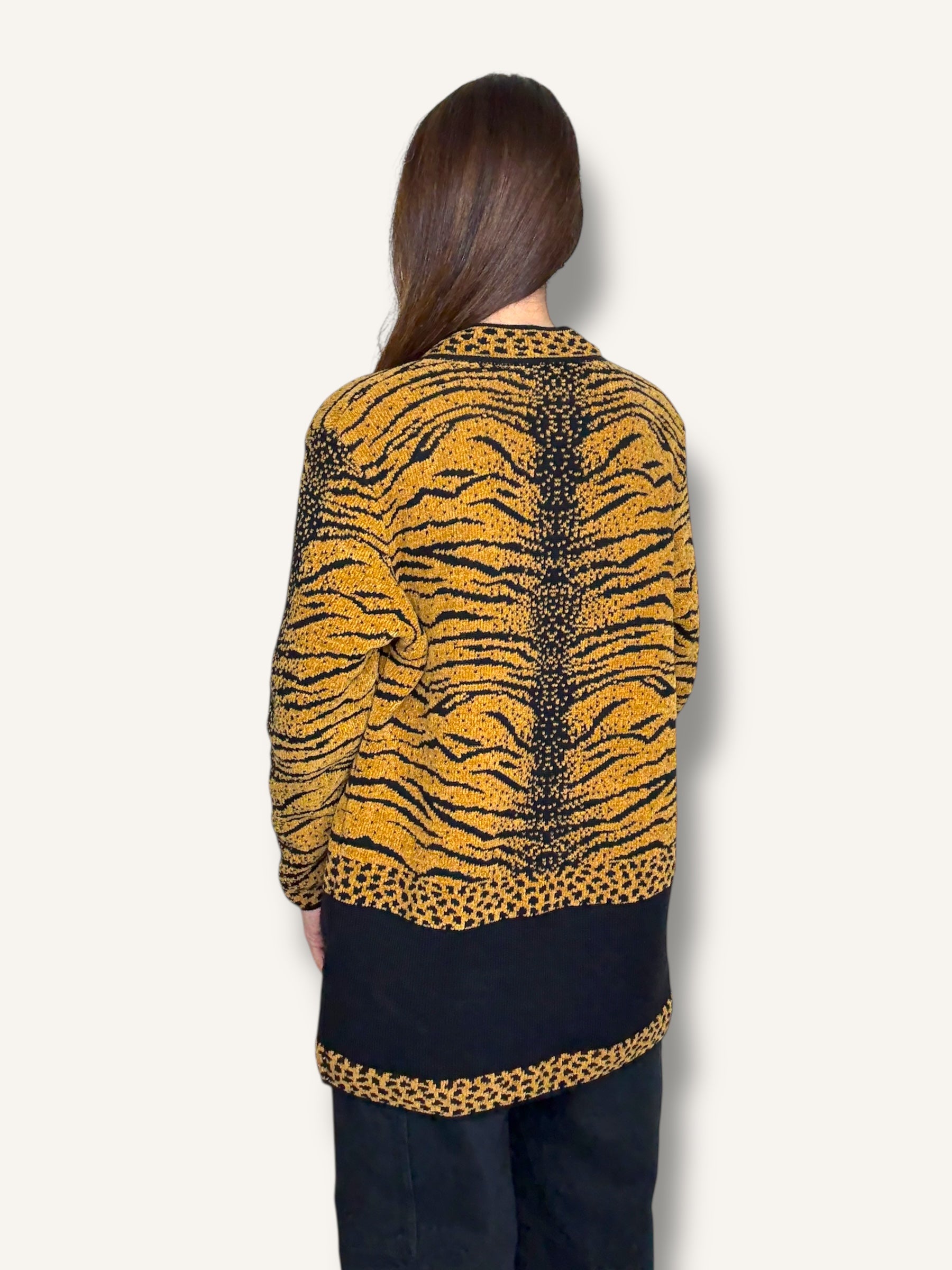 A true statement knit with maximum attitude: this vintage longline cardigan features a bold gold-and-black animal jacquard that mixes tiger striping with leopard spots, finished with a contrasting black band at the hips. Designed with a deep V neckline and leopard-trimmed placket, it fastens with ornate silver-tone buttons and is accented with tiger and chains motif at the pocket area Wear it buttoned as a top, layered over a slip dress, or thrown on with denim and boots—instant outfit.