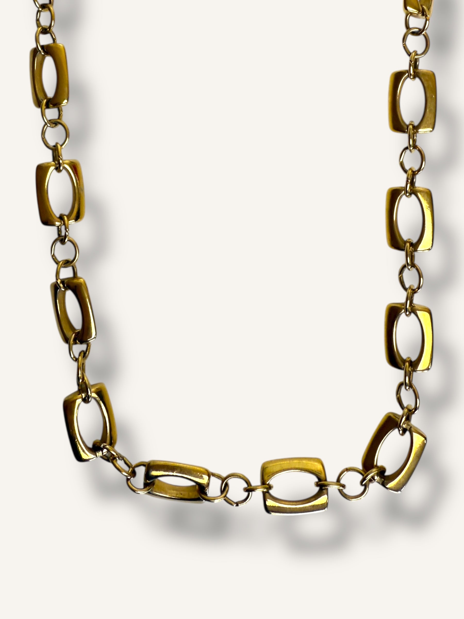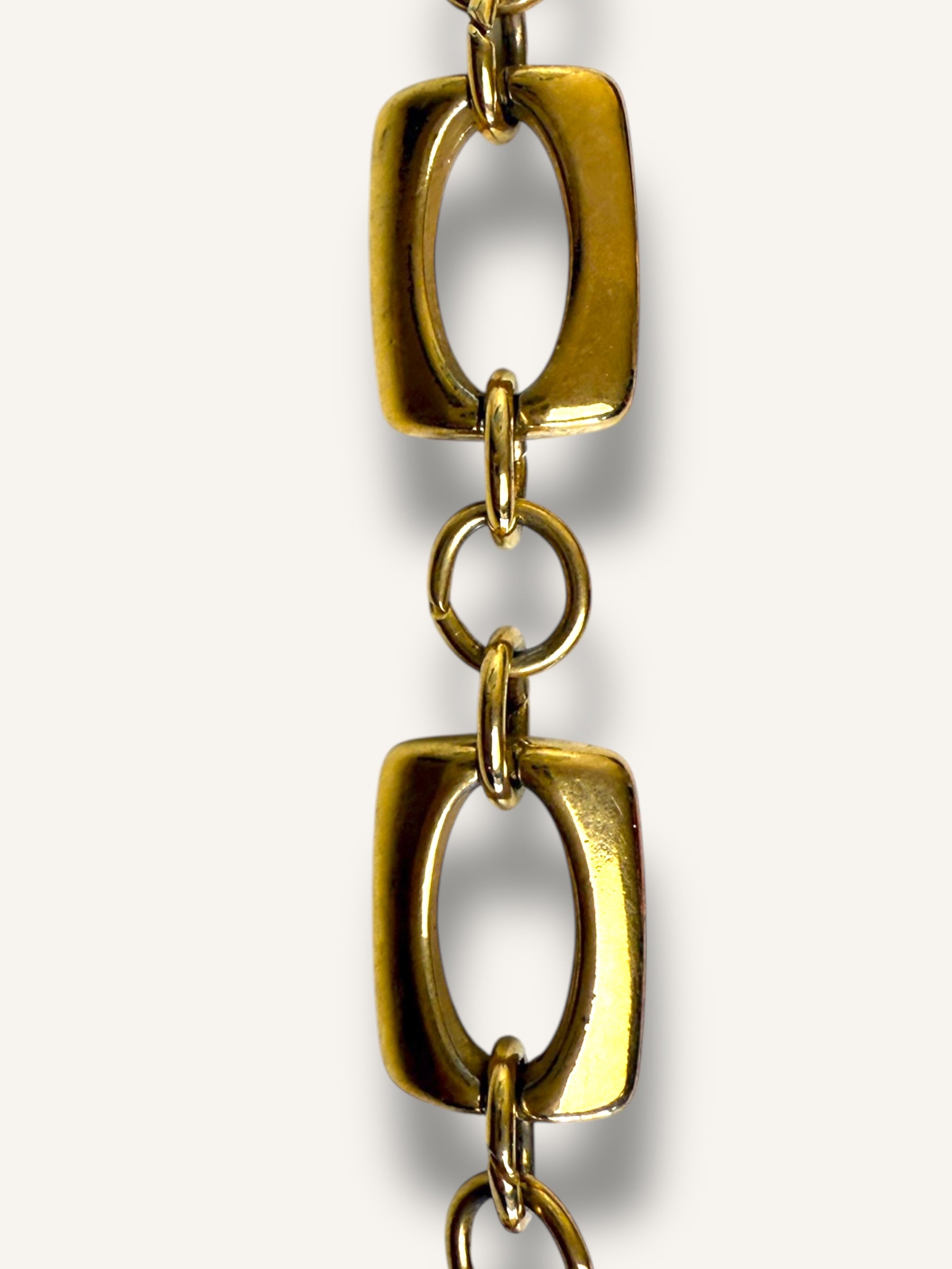 Vintage Trifari Necklace. Long heavy gold-tone chain with open rectangular links, designed with Trifari’s signature bold elegance. A versatile statement piece that layers beautifully or stands out on its own.