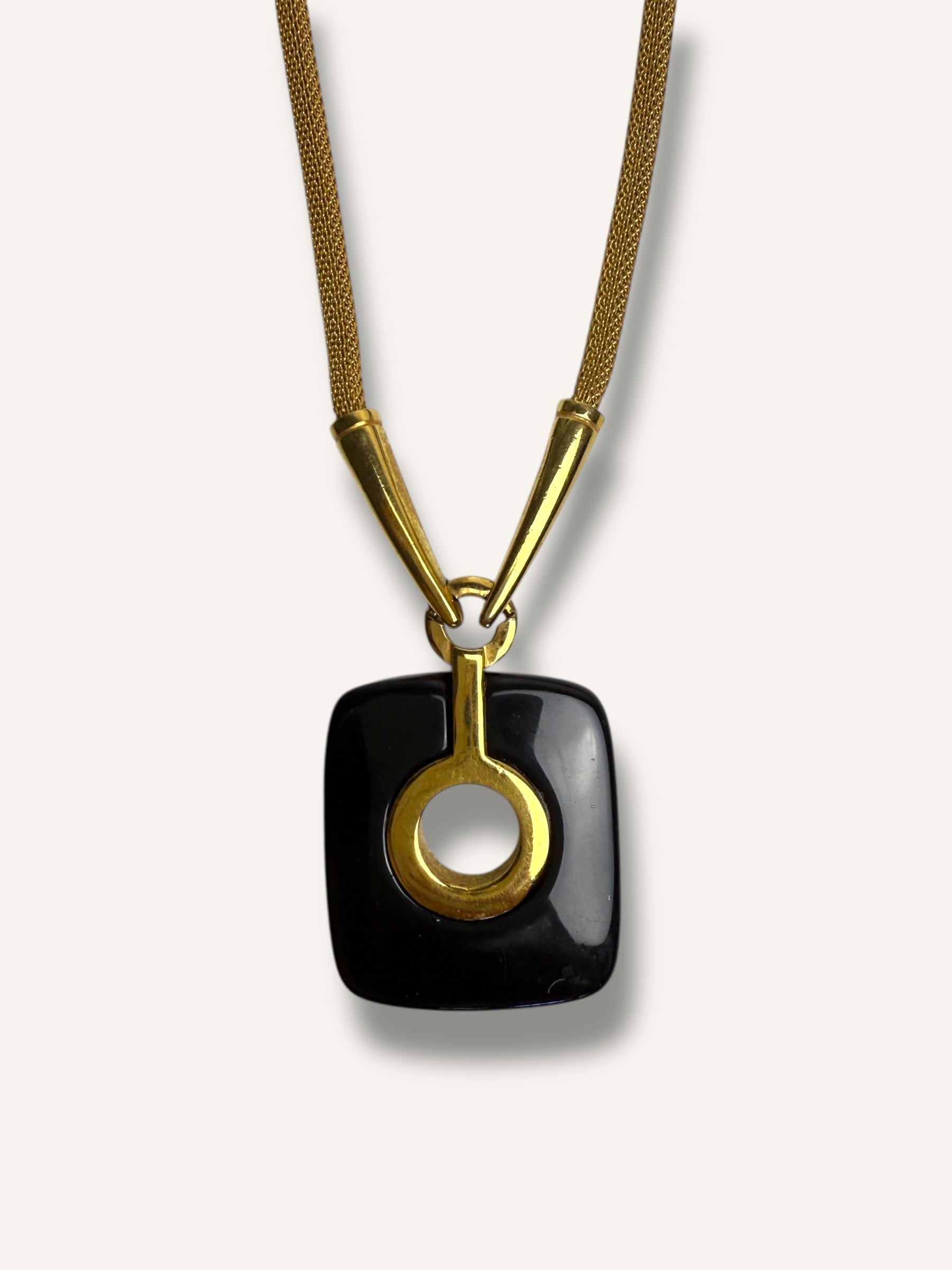 Vintage Trifari Necklace. Striking vintage Trifari necklace featuring a bold modernist design with a geometric black enamel pendant framed in glossy gold-tone metal. The sculptural centerpiece hangs from a textured mesh chain with elegant tapered connectors, creating a statement silhouette that balances sophistication and edge. A timeless collectible from Trifari’s iconic era, this piece adds instant polish and architectural flair to any look.
