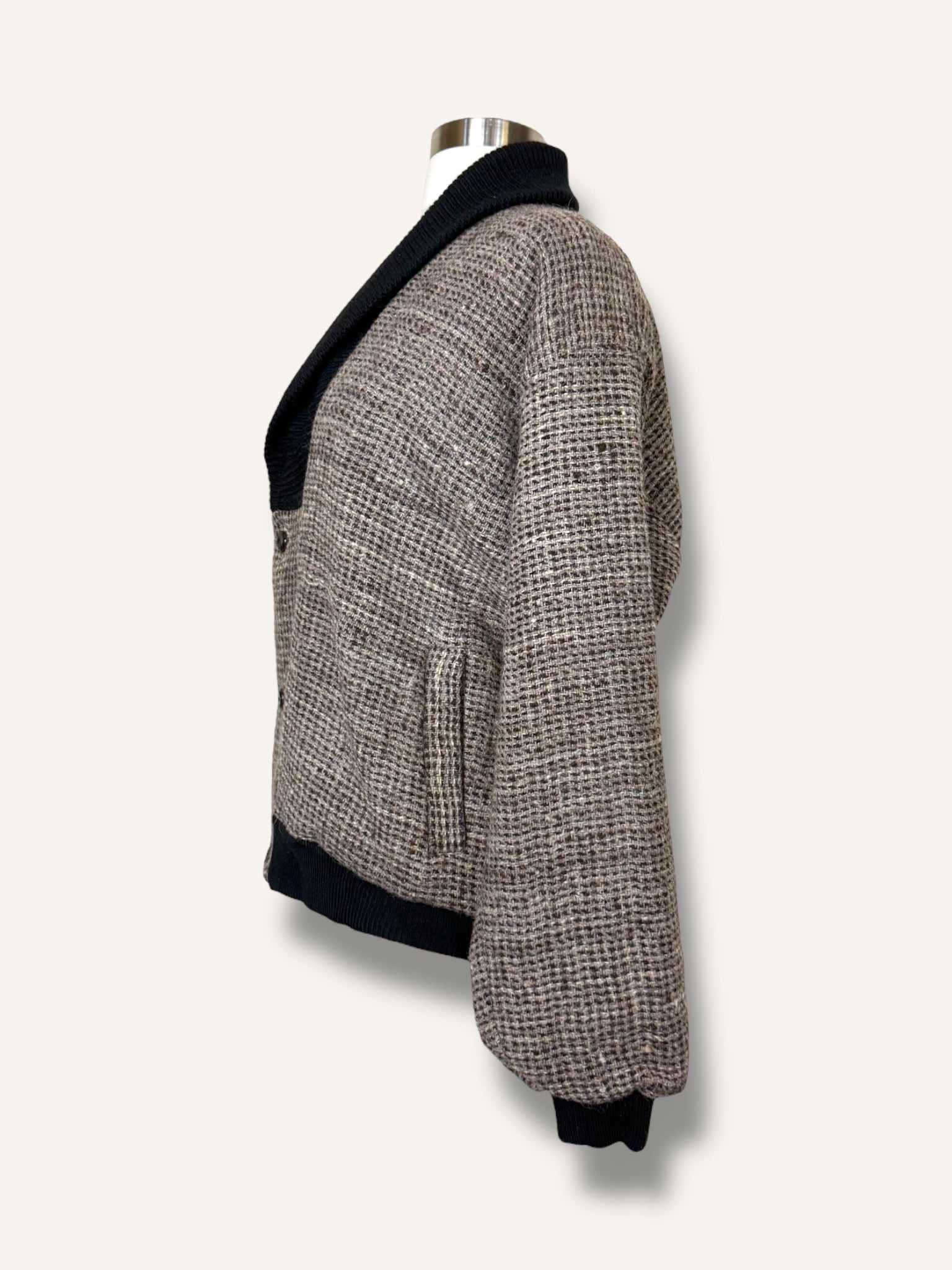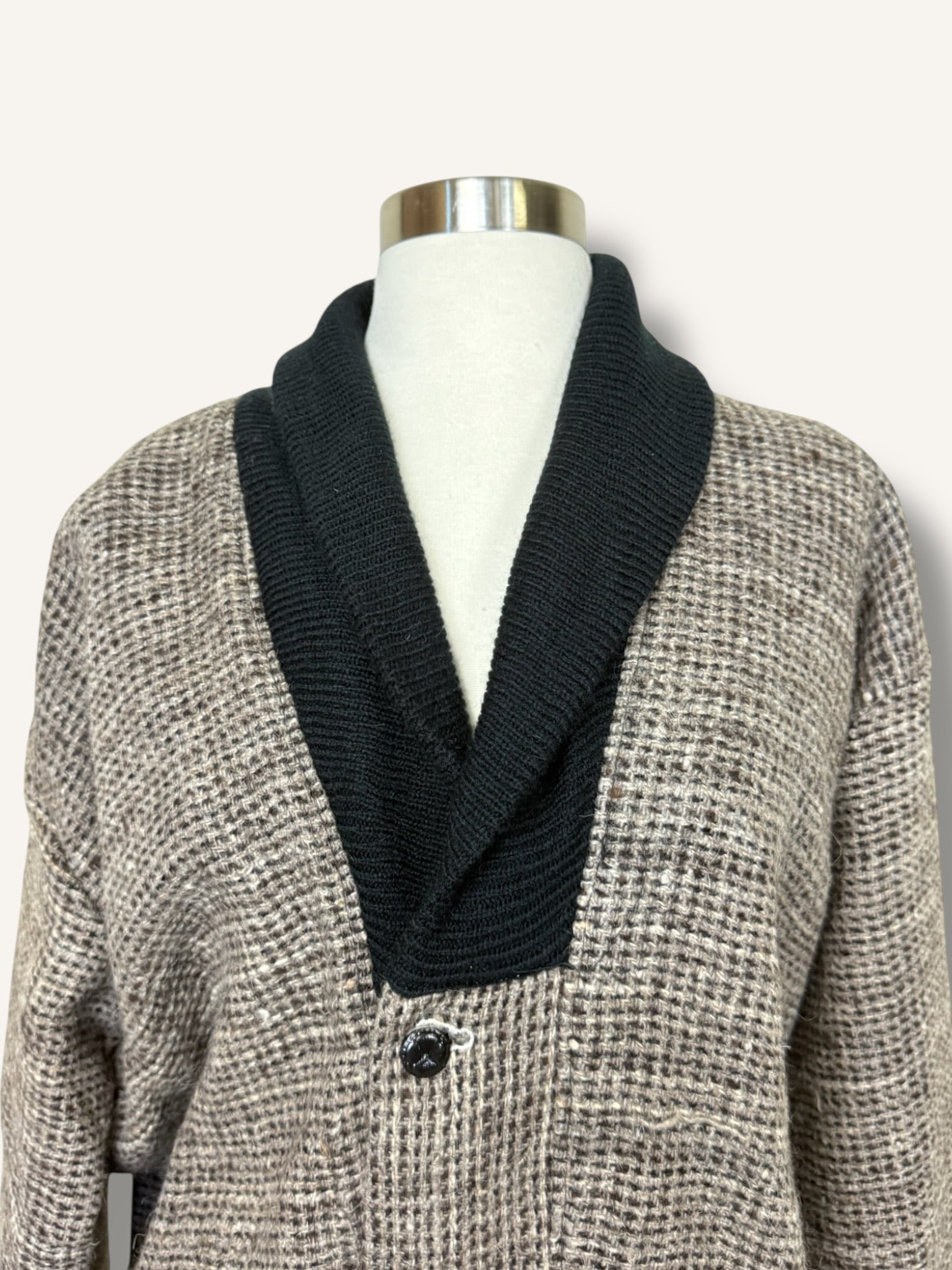 Vintage Tweed Shawl Collar Jacket. A cozy yet refined vintage jacket crafted in a soft grey-and-black tweed. The deep ribbed shawl collar and cuffs in contrasting black knit add a touch of structure to its relaxed silhouette. Featuring front buttons and side pockets, this piece perfectly balances tailored charm with easy comfort, ideal layered over denim or wool trousers for timeless, understated elegance.