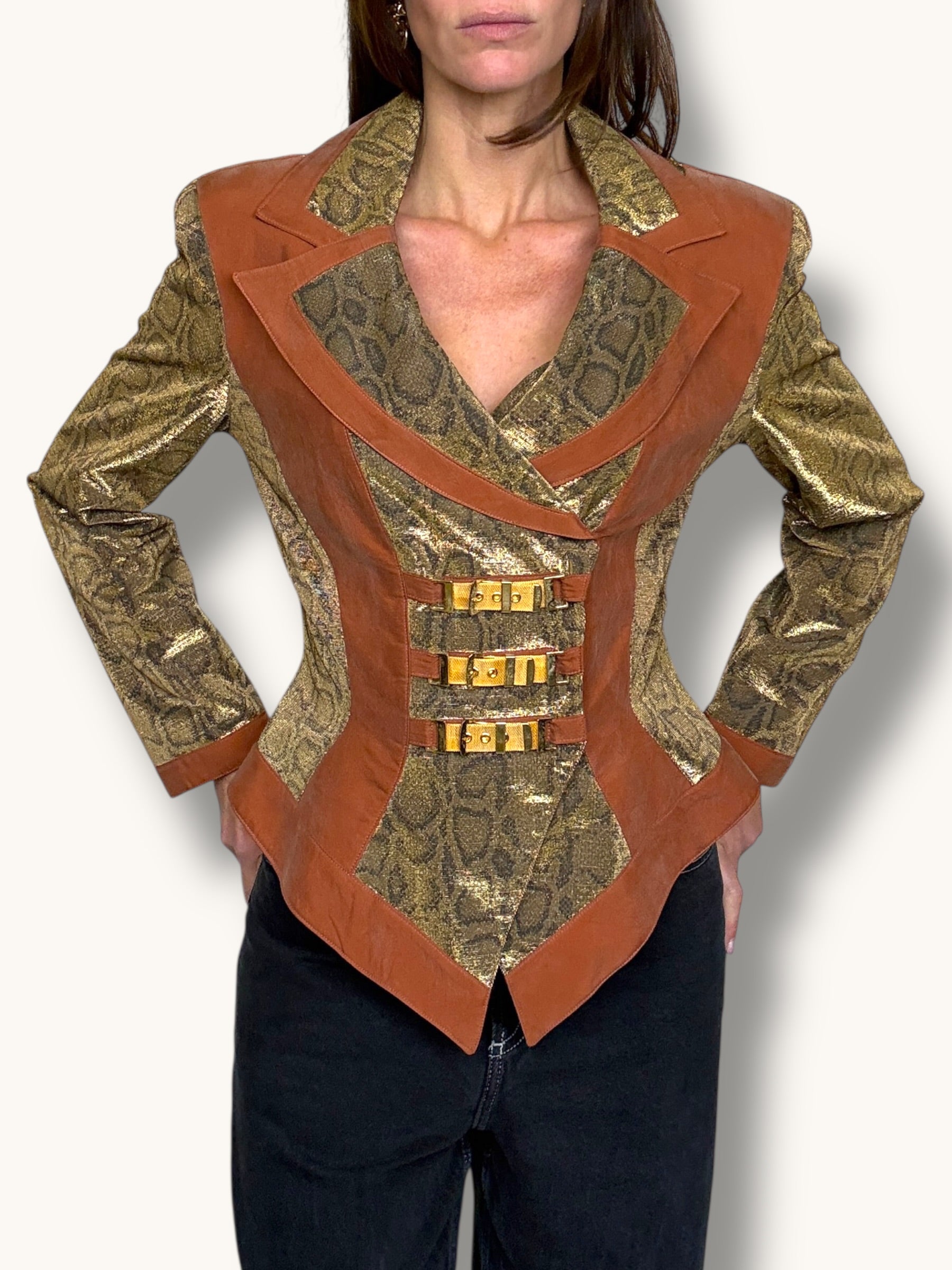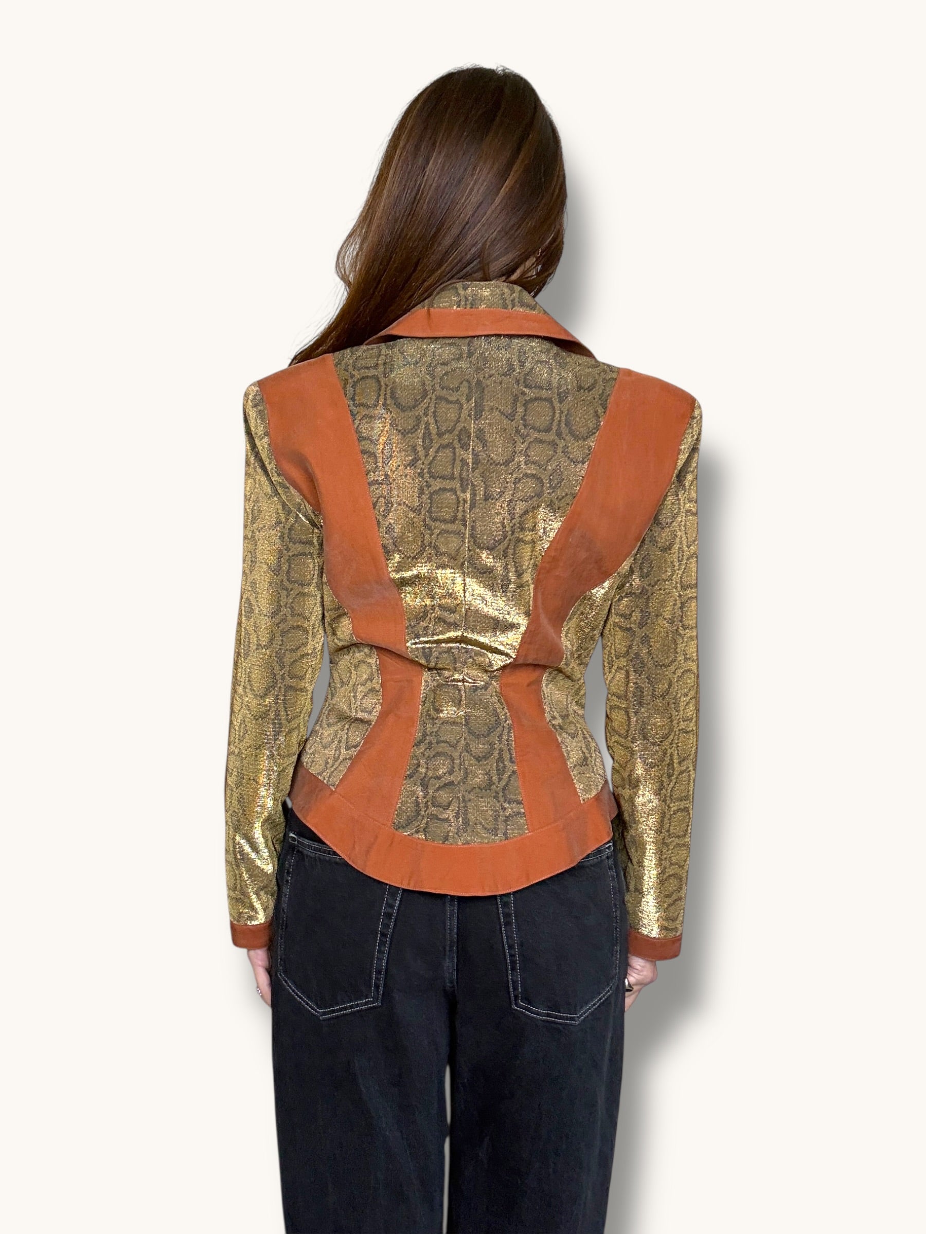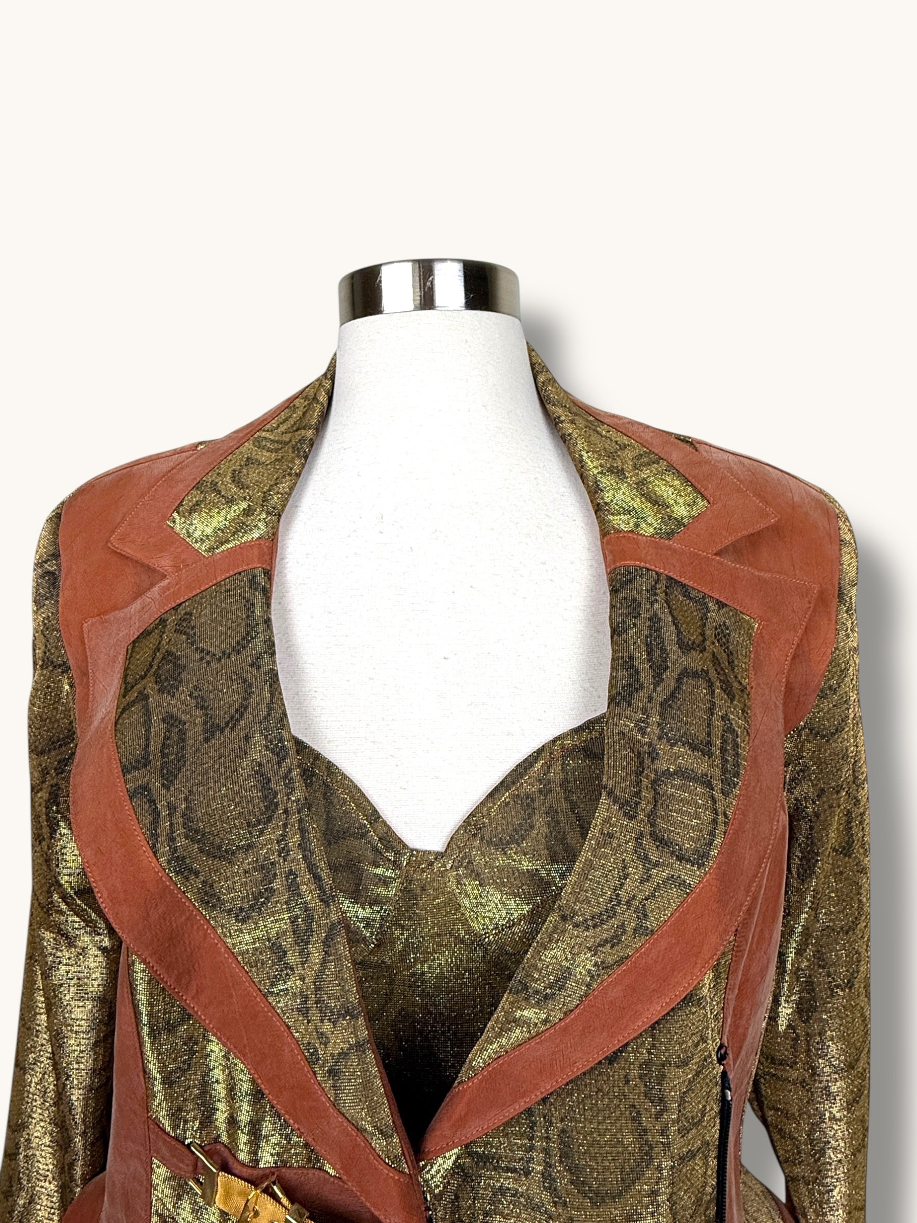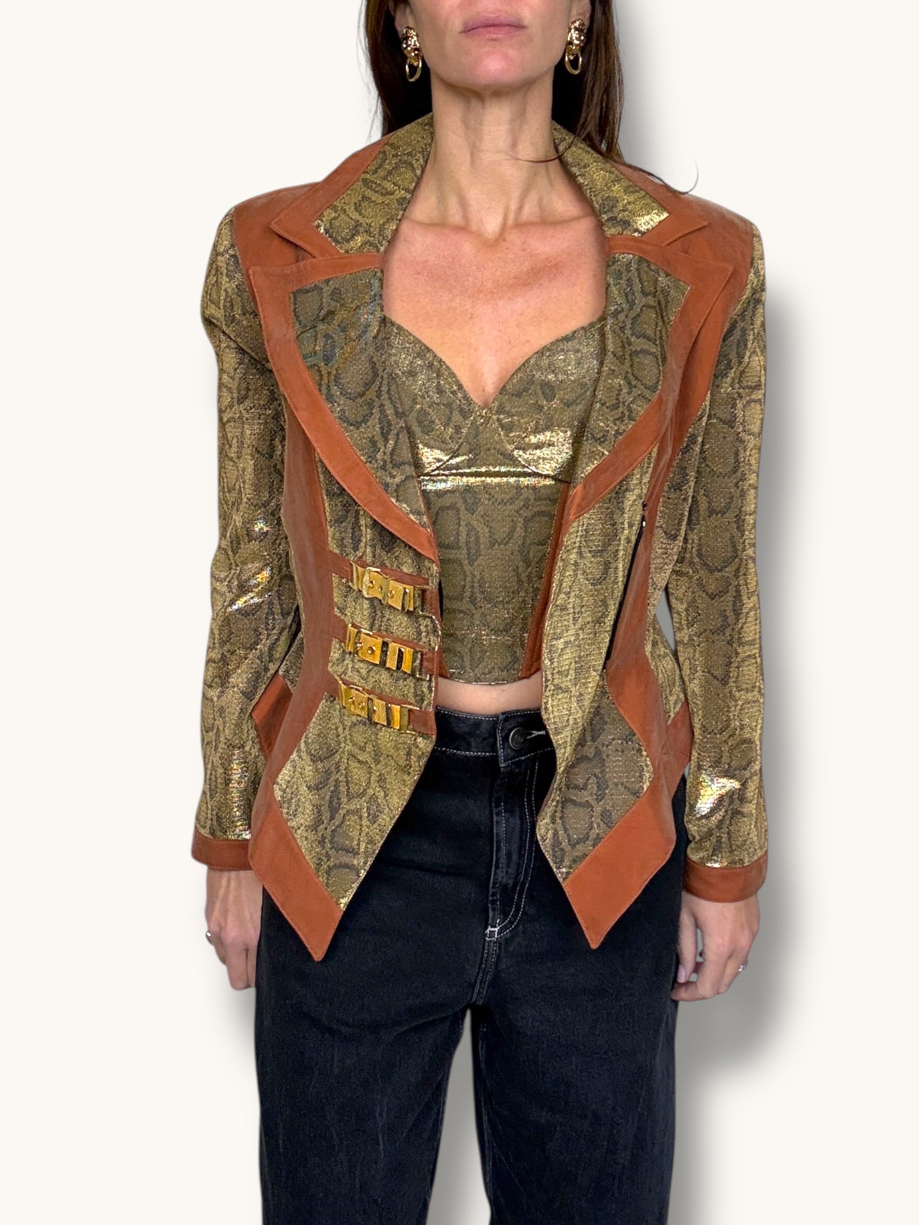 Vintage two-piece set featuring a sculpted metallic bustier and coordinating structured blazer. Gold snake-patterned fabric contrasted with warm caramel suede panels for a bold, architectural silhouette. The blazer features sharp lapels, sculpted seaming, gold buckle hardware detailing, and a front zipper closure. The matching bustier enhances the tailored fit and creates a powerful, statement look when worn together — or styled separately for maximum versatility.