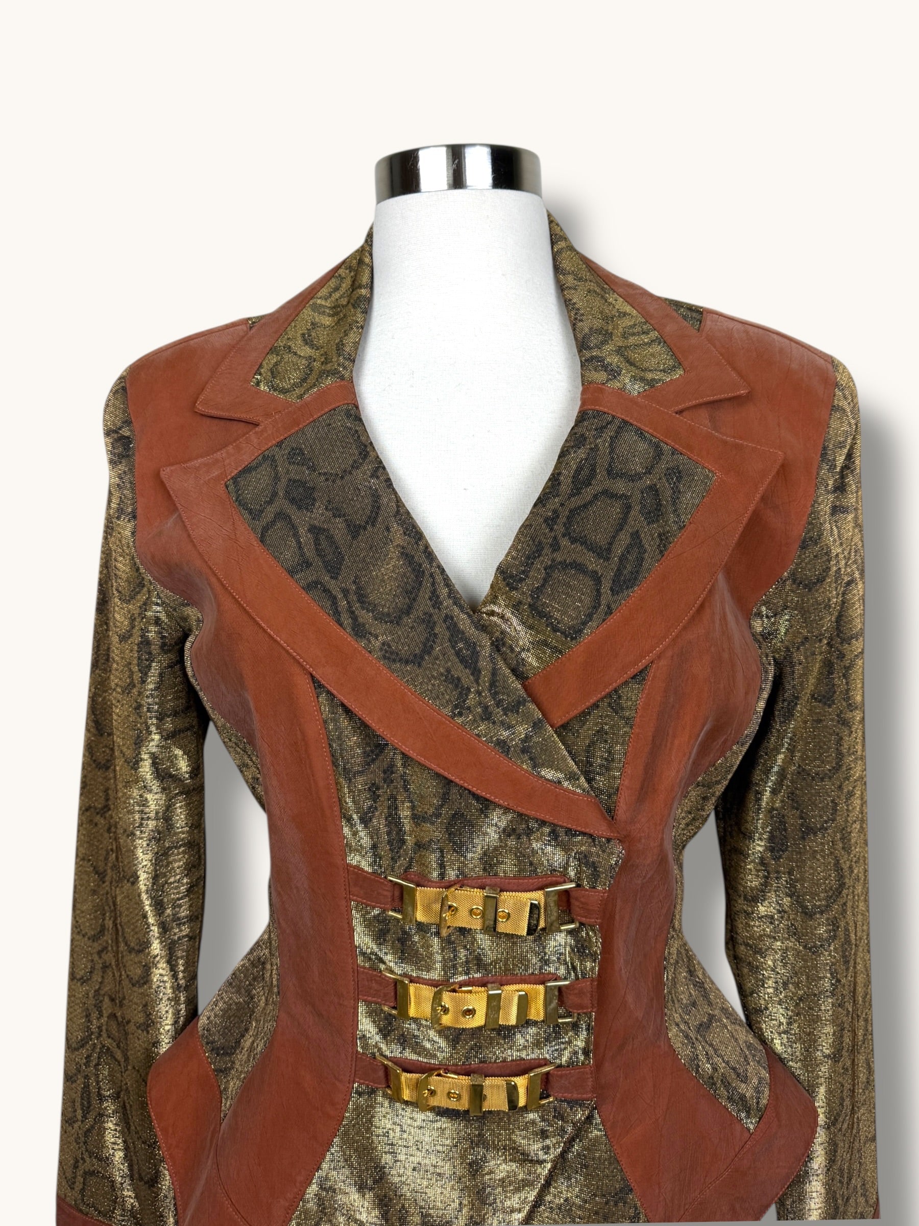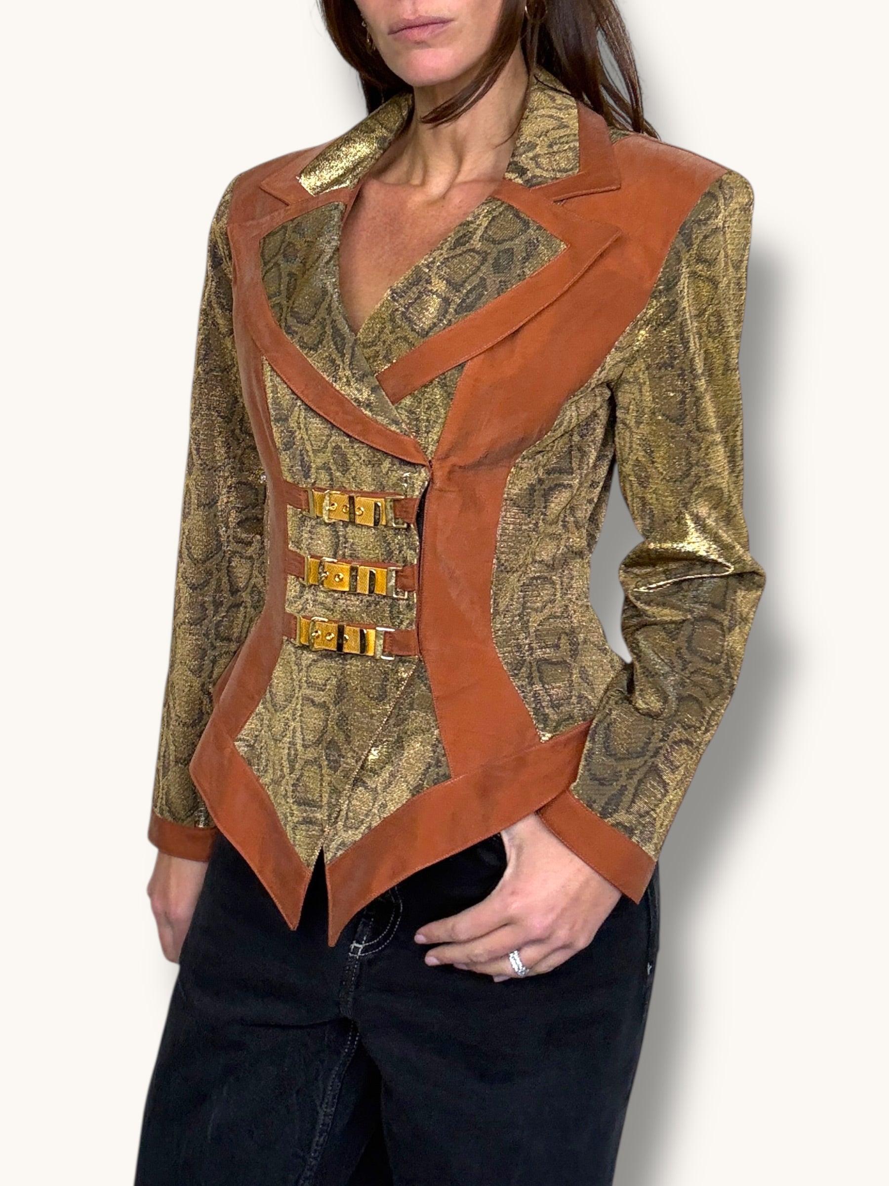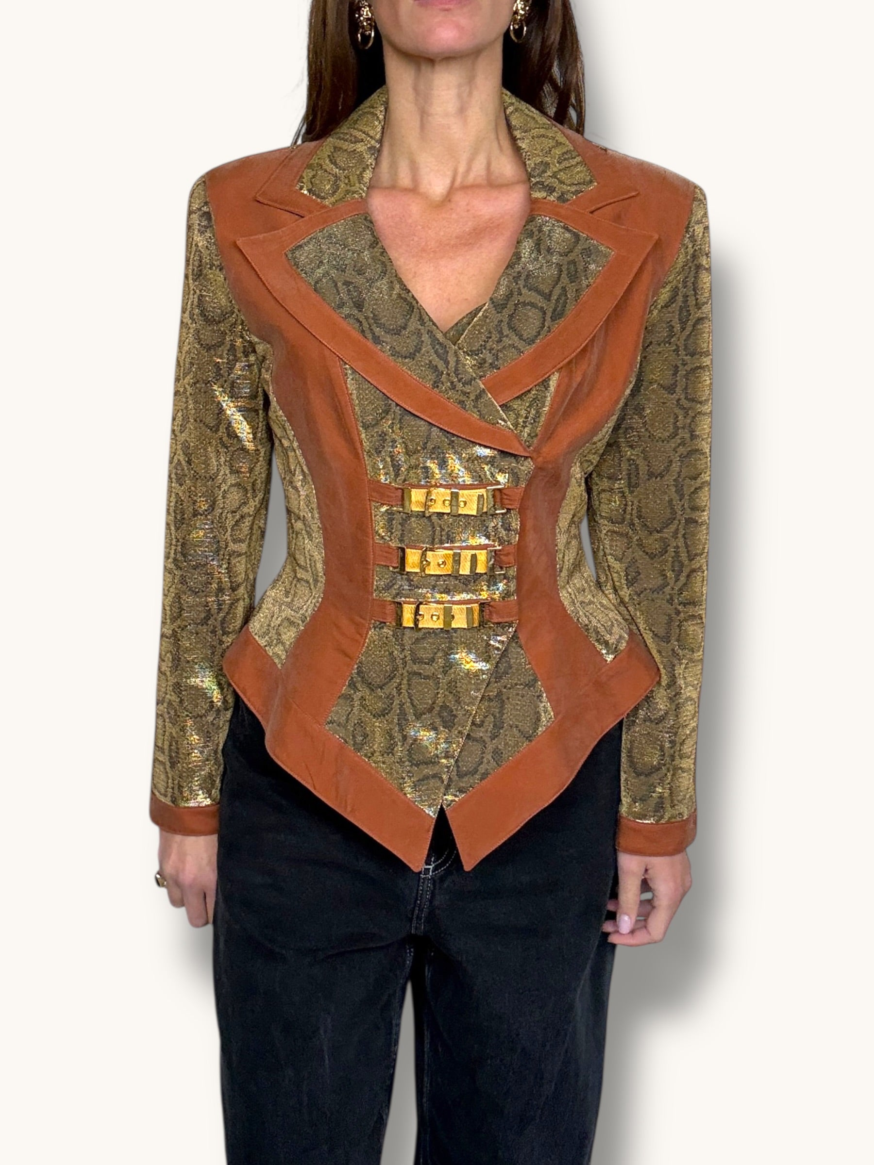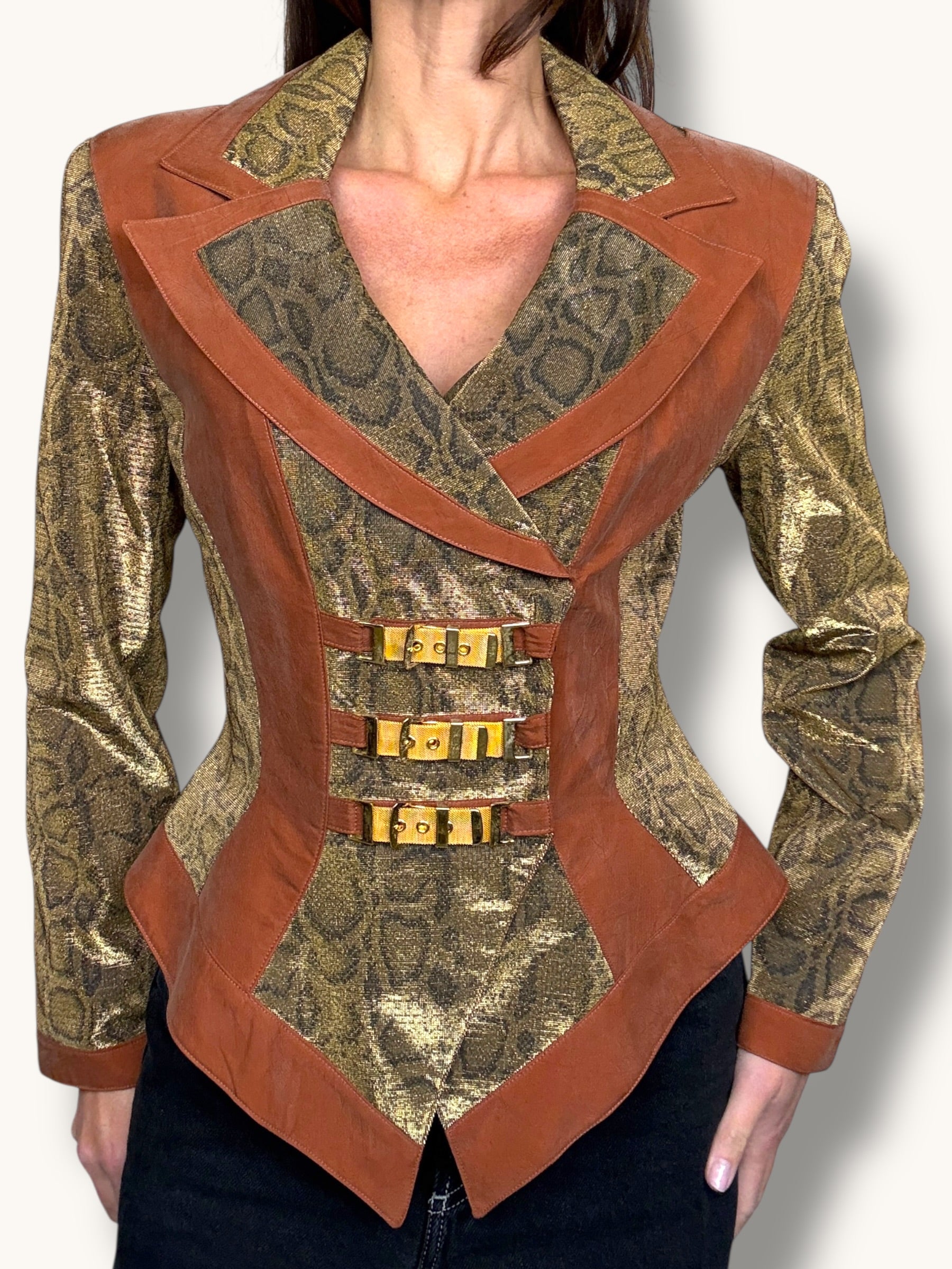 Vintage two-piece set featuring a sculpted metallic bustier and coordinating structured blazer. Gold snake-patterned fabric contrasted with warm caramel suede panels for a bold, architectural silhouette. The blazer features sharp lapels, sculpted seaming, gold buckle hardware detailing, and a front zipper closure. The matching bustier enhances the tailored fit and creates a powerful, statement look when worn together — or styled separately for maximum versatility.