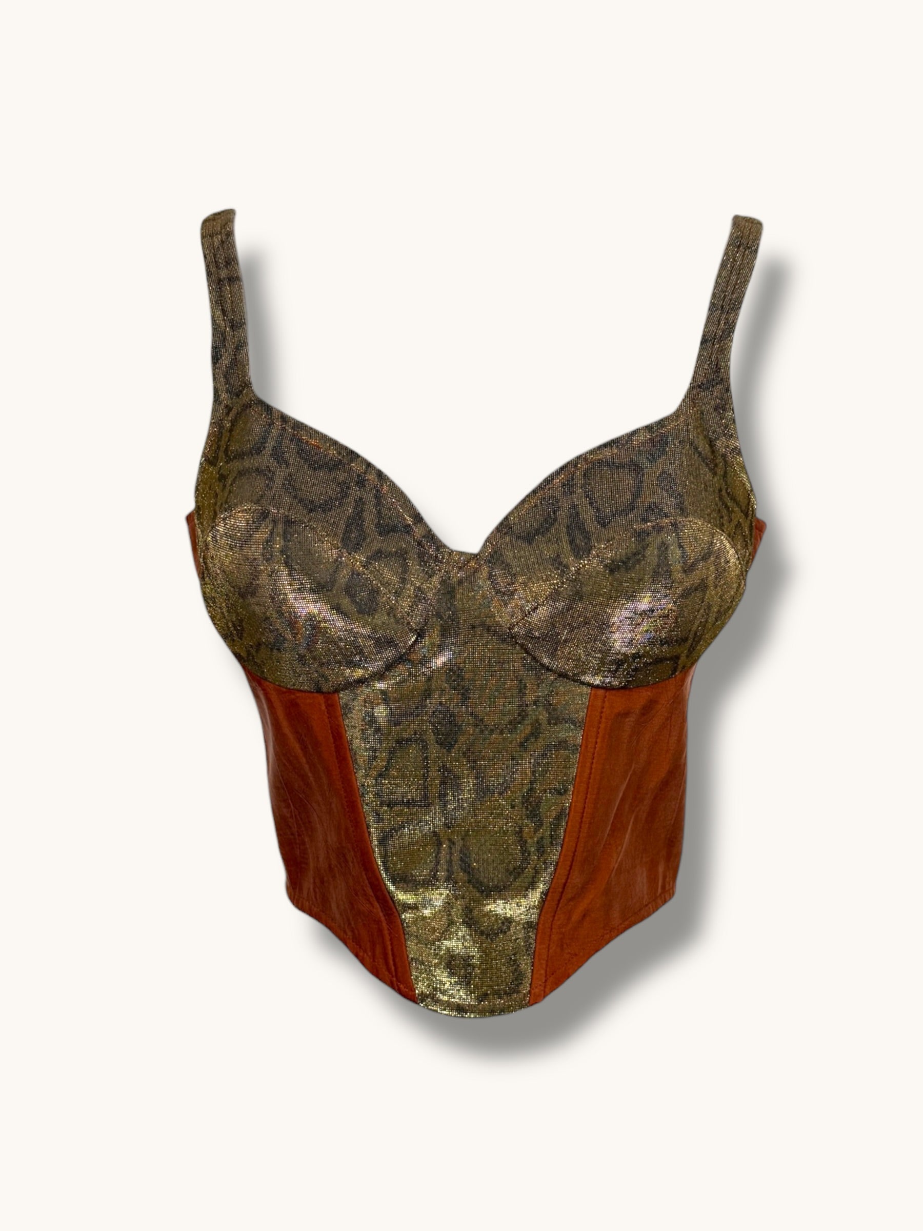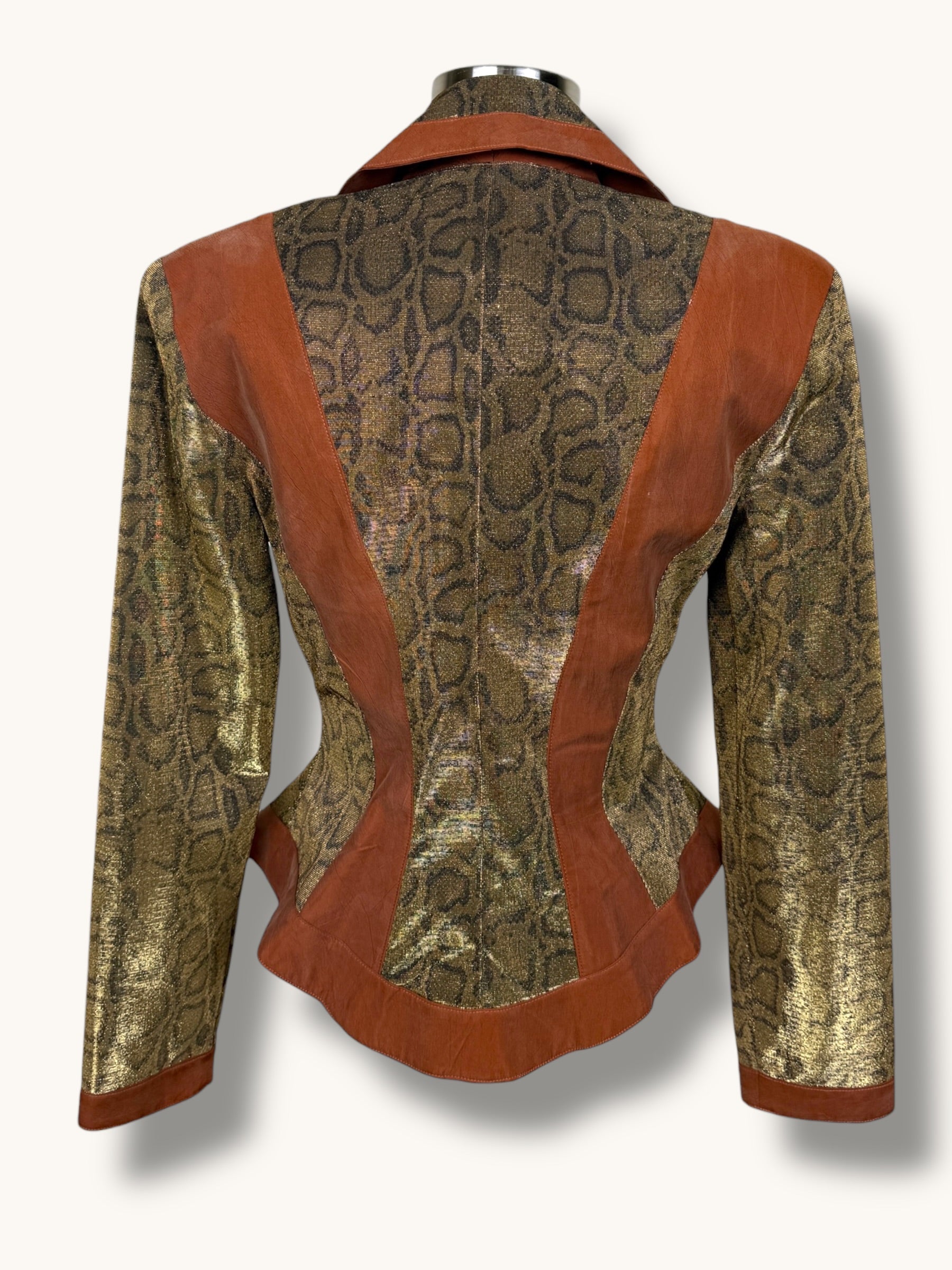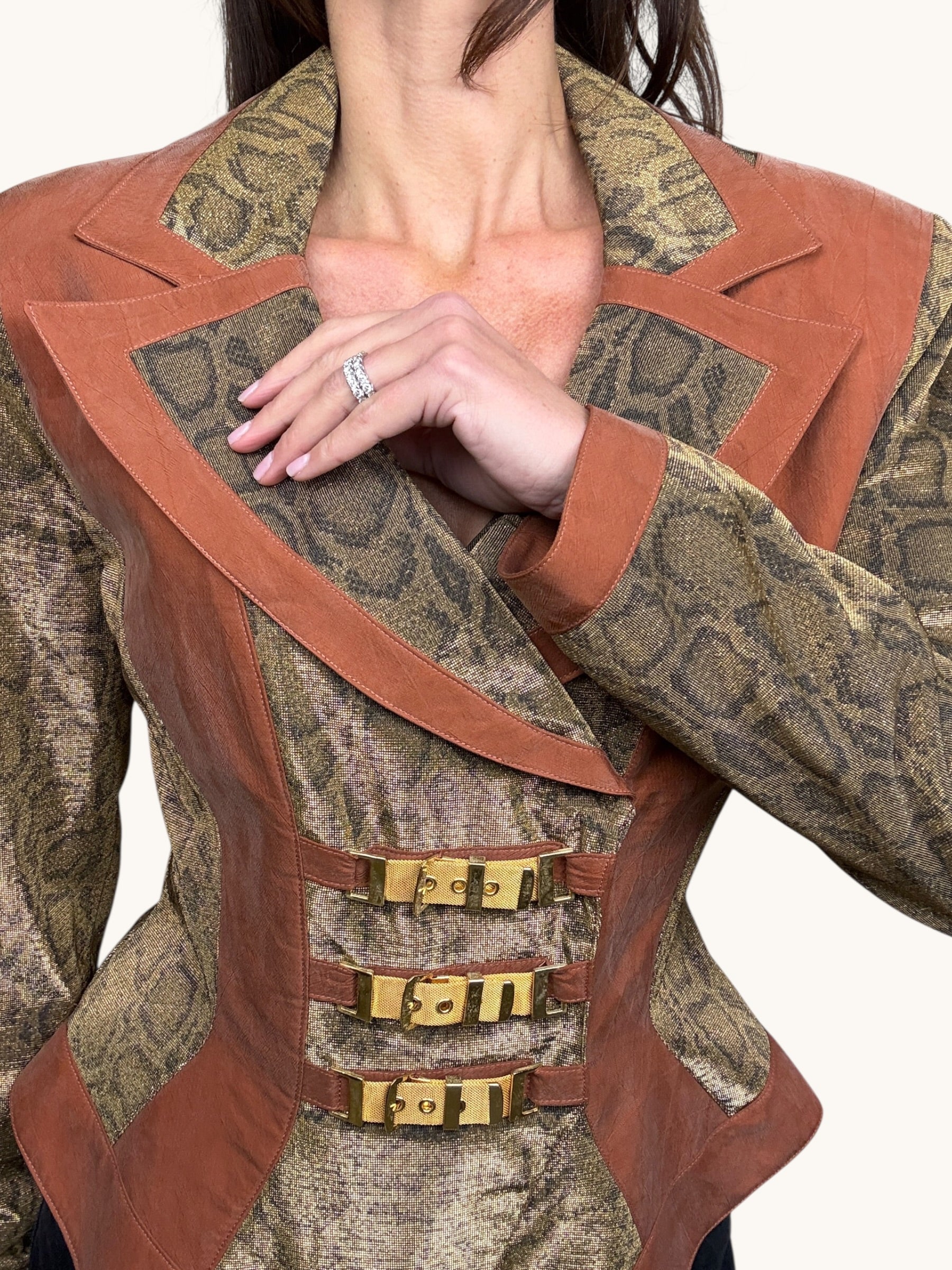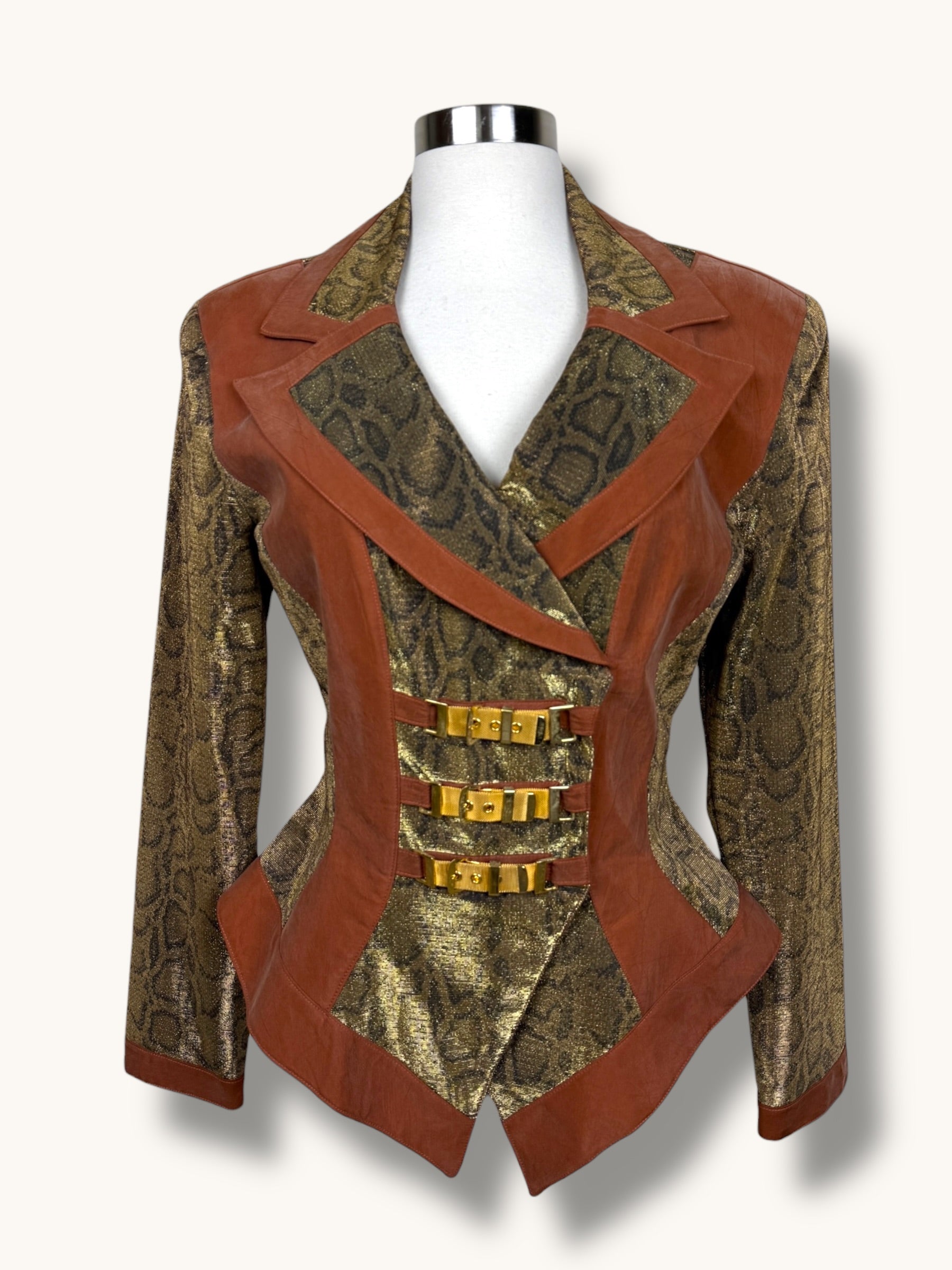 Vintage two-piece set featuring a sculpted metallic bustier and coordinating structured blazer. Gold snake-patterned fabric contrasted with warm caramel suede panels for a bold, architectural silhouette. The blazer features sharp lapels, sculpted seaming, gold buckle hardware detailing, and a front zipper closure. The matching bustier enhances the tailored fit and creates a powerful, statement look when worn together — or styled separately for maximum versatility.