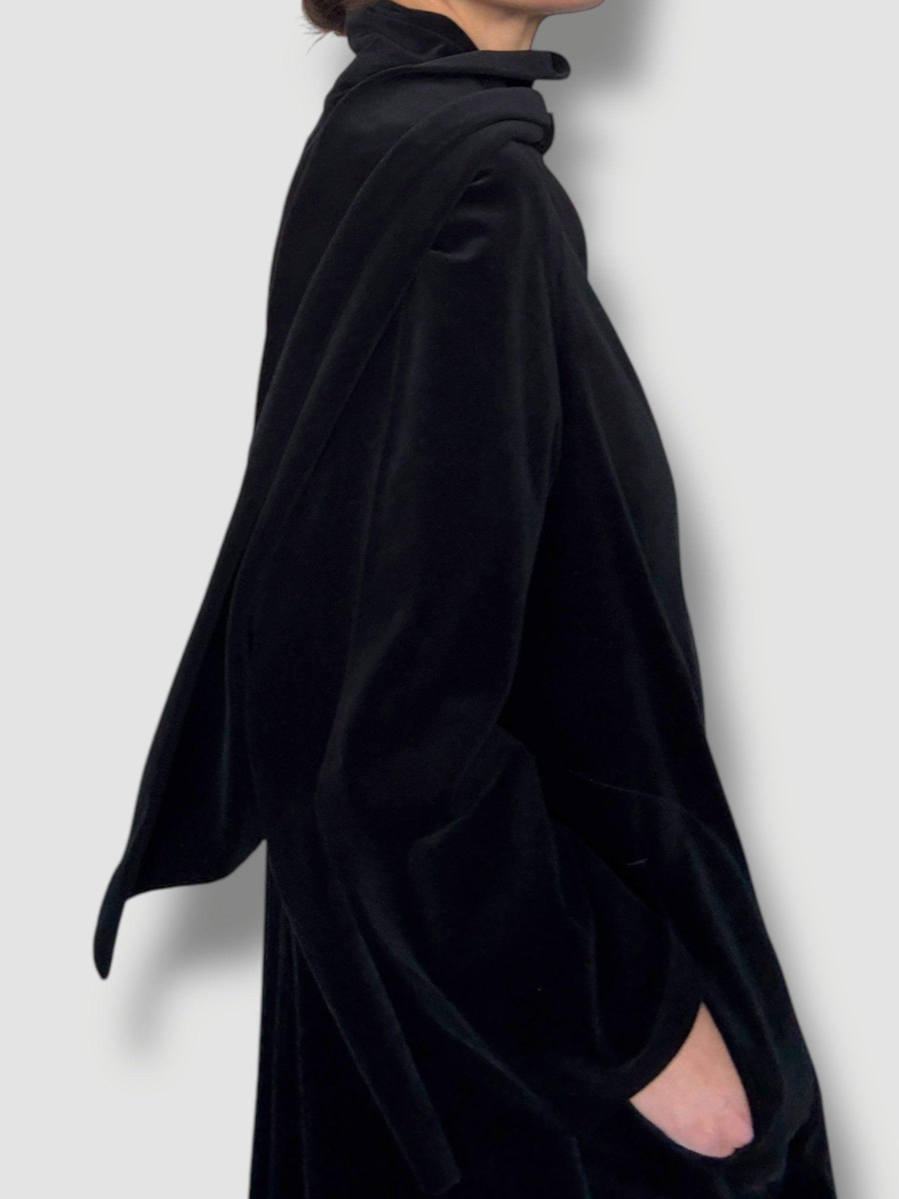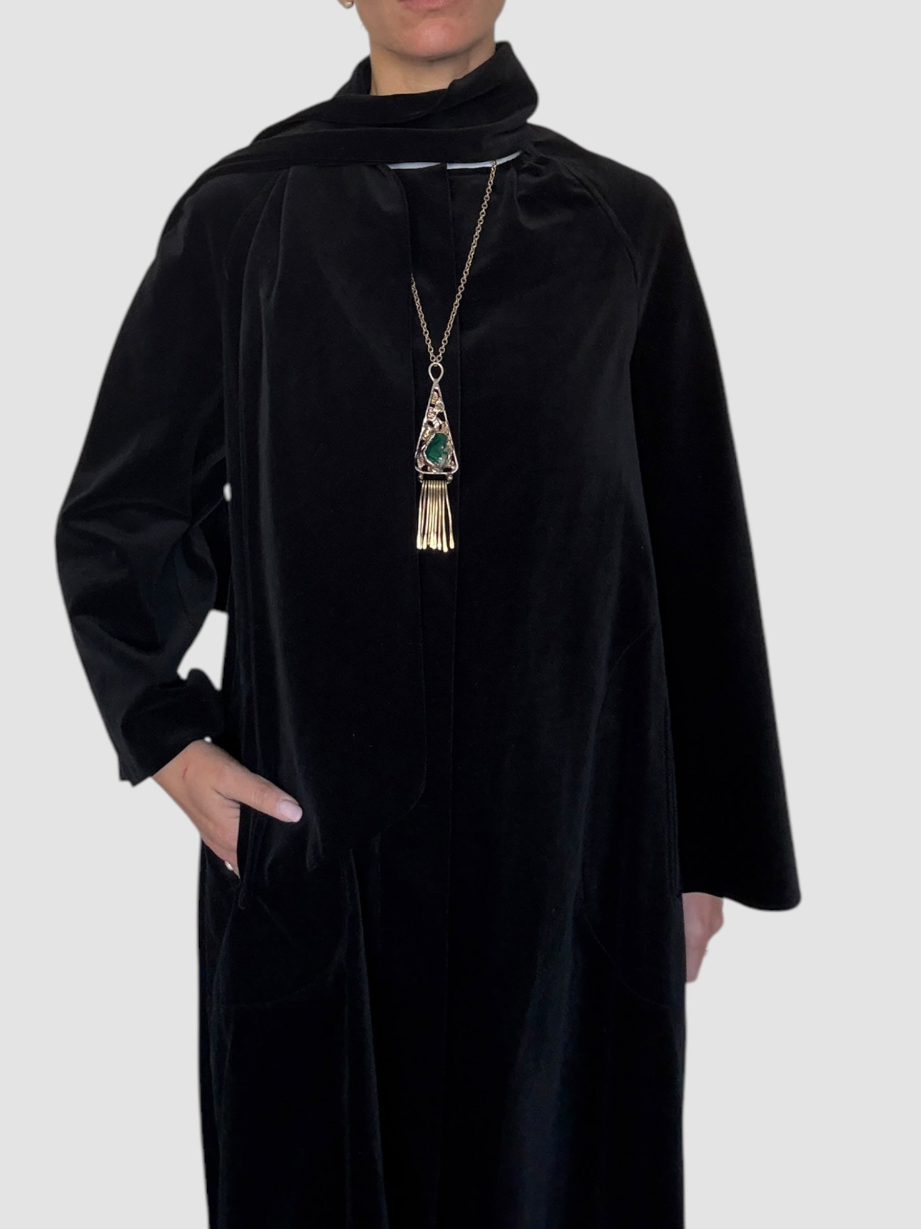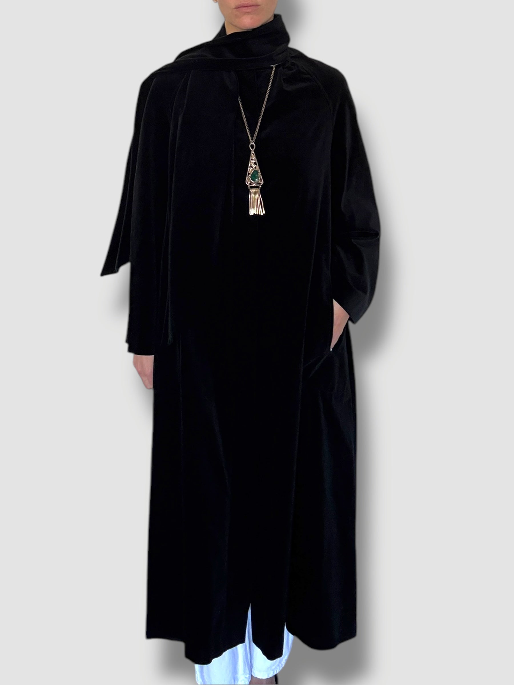 This vintage velvet coat is the epitome of understated drama, featuring a luxurious black velvet body with a built-in matching scarf that adds effortless elegance and warmth. The silhouette is long and fluid with a slight A-line shape, fully buttoned down the front for versatile styling. Soft yet structured, it has a graceful drape and discreet side pockets for a refined finish. Whether worn open over jeans or fully buttoned for a sleek statement, this piece is a timeless classic with quiet sophistication.