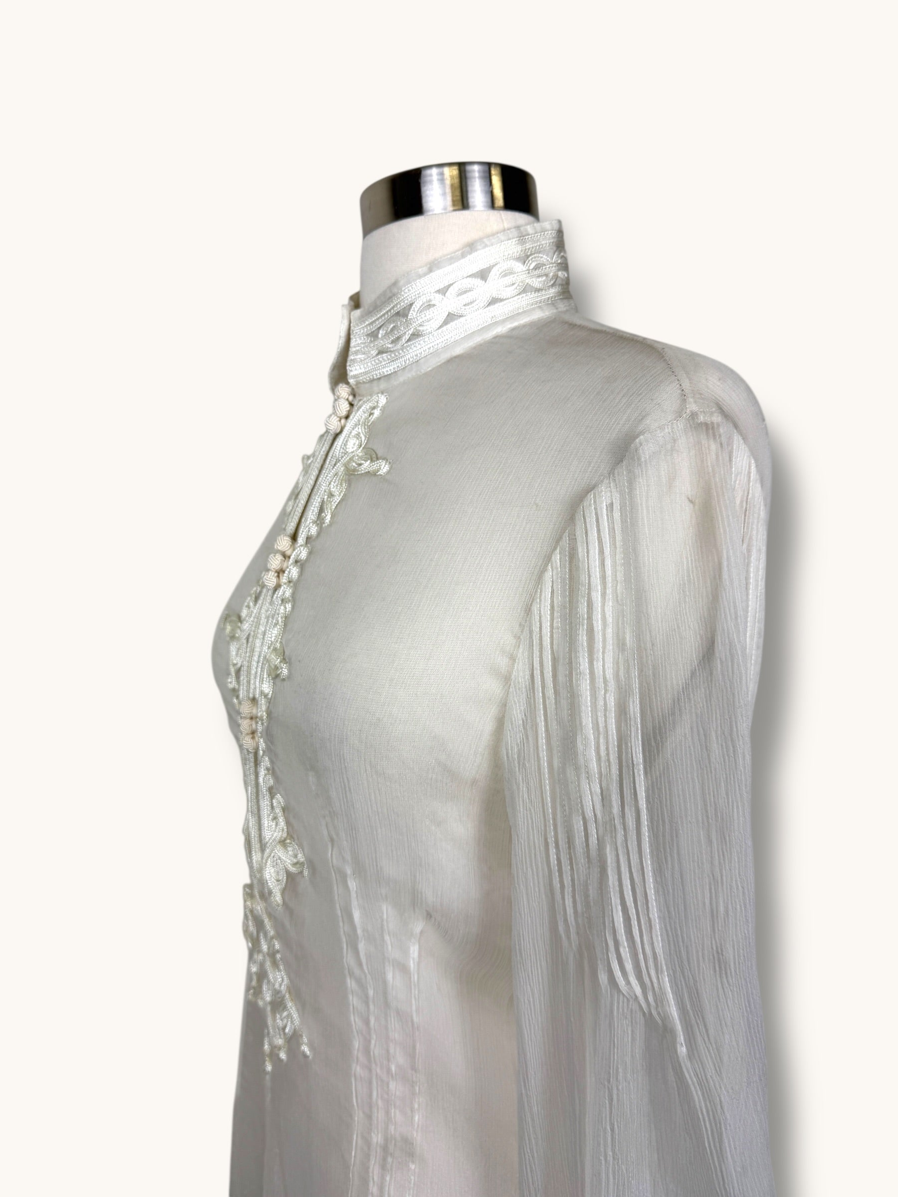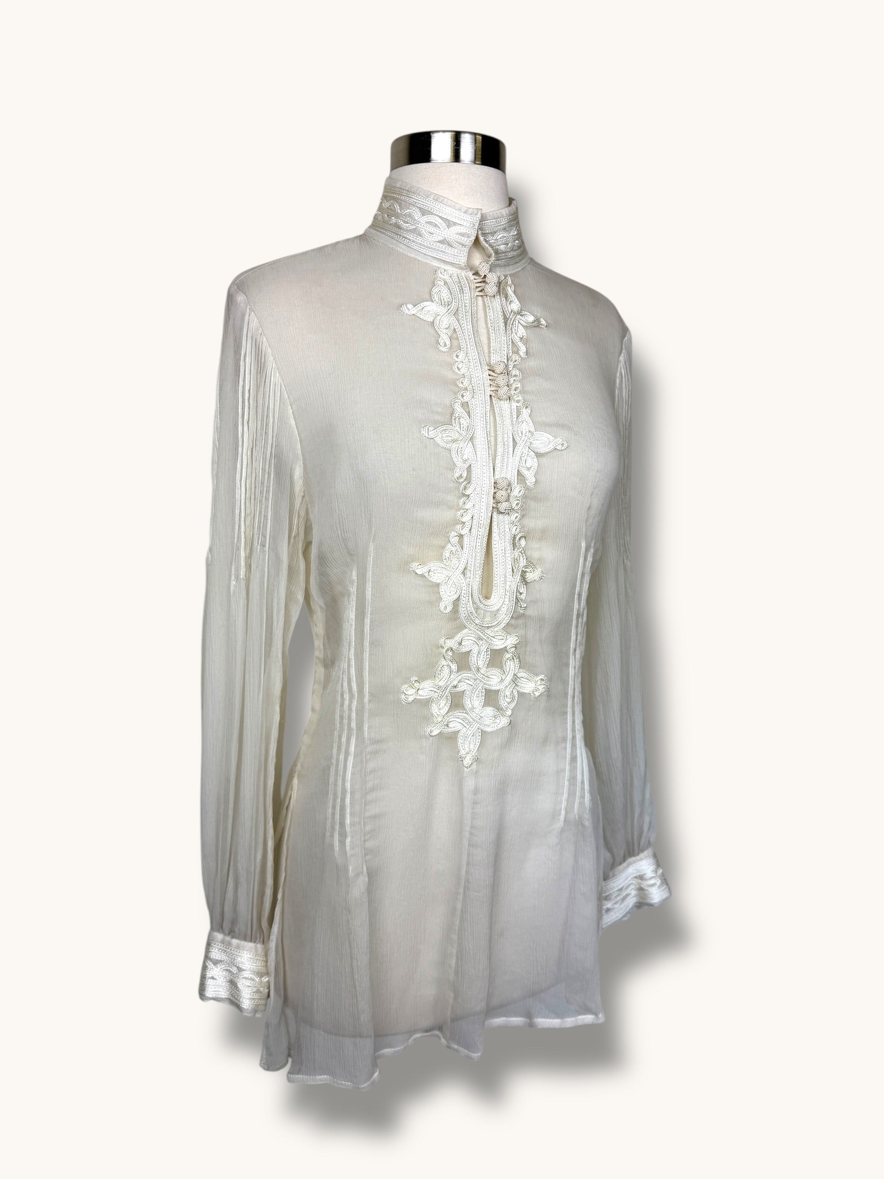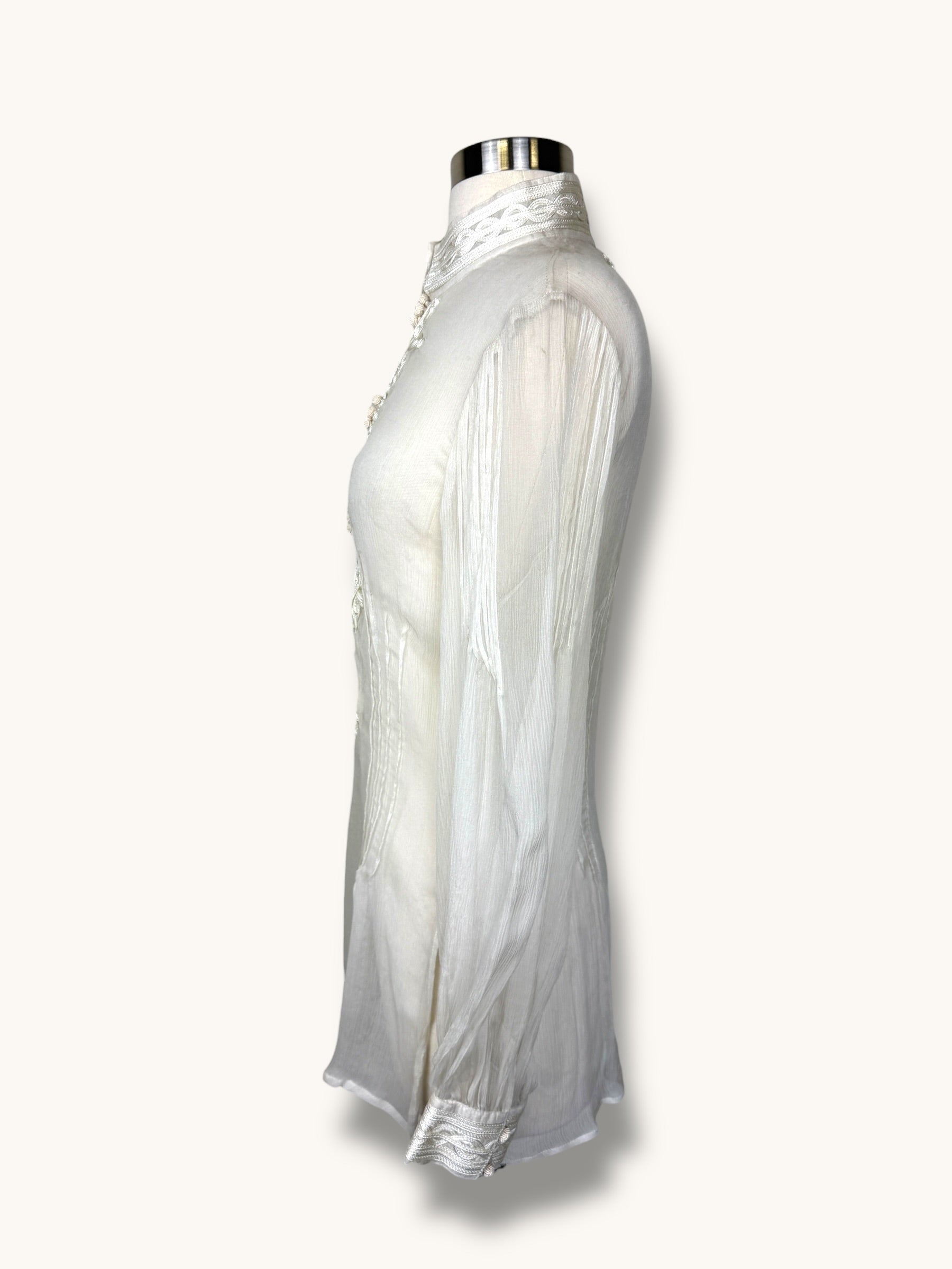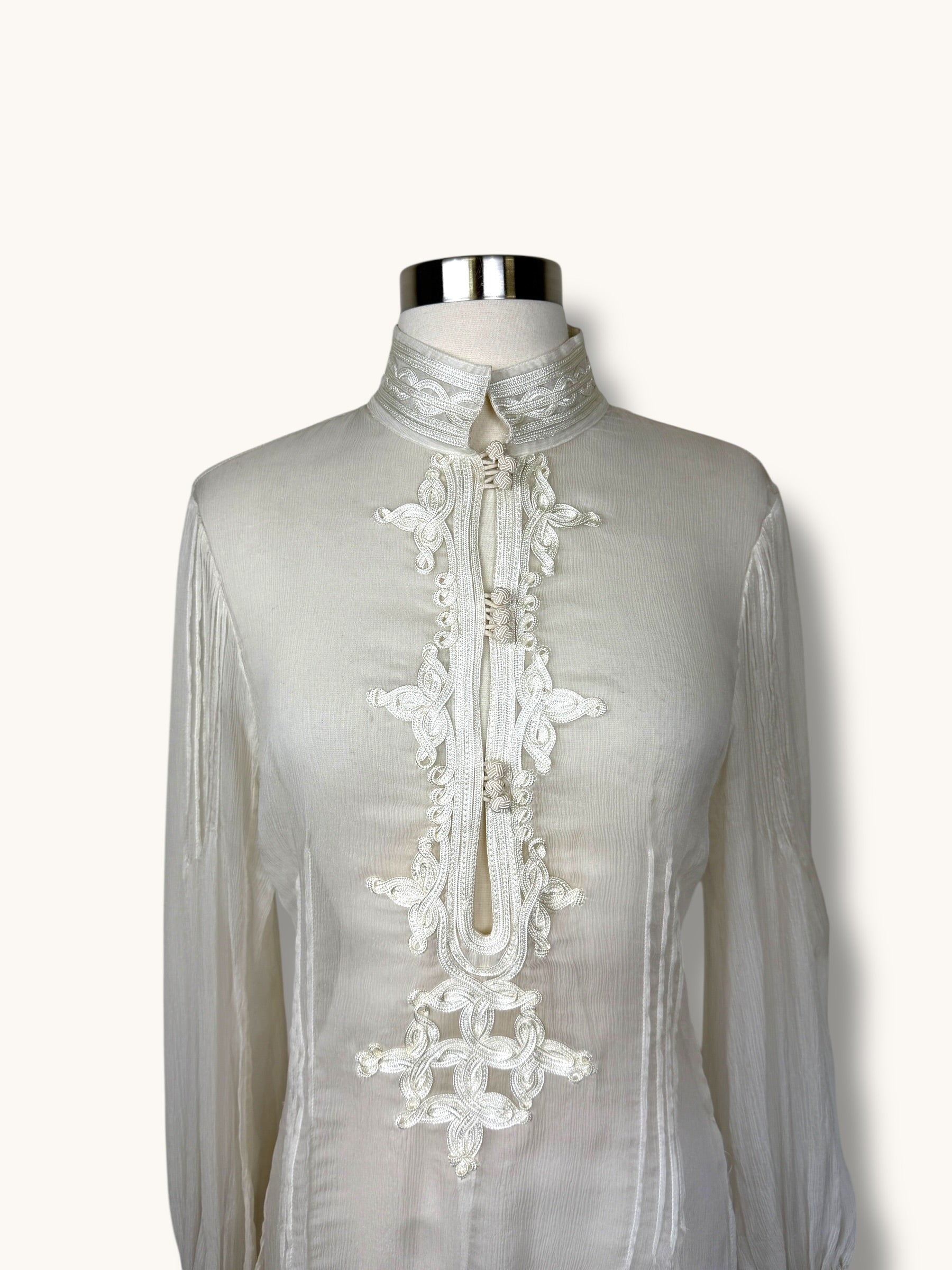 A stunning vintage sheer silk shirt in a soft ivory tone, featuring exquisite embroidered detailing throughout. The delicate translucent fabric is adorned with intricate vertical stitching and an ornate appliqué panel along the front placket, creating an elegant elongated silhouette. Designed with a refined mandarin collar, billowy sheer sleeves, and beautifully embroidered cuffs, this piece balances romantic femininity with a subtle architectural structure. The airy, fluid drape and side slits make it perfect layered over a bralette, camisole, or worn under a tailored blazer for a modern contrast. A rare, ethereal vintage piece that feels both timeless and striking.