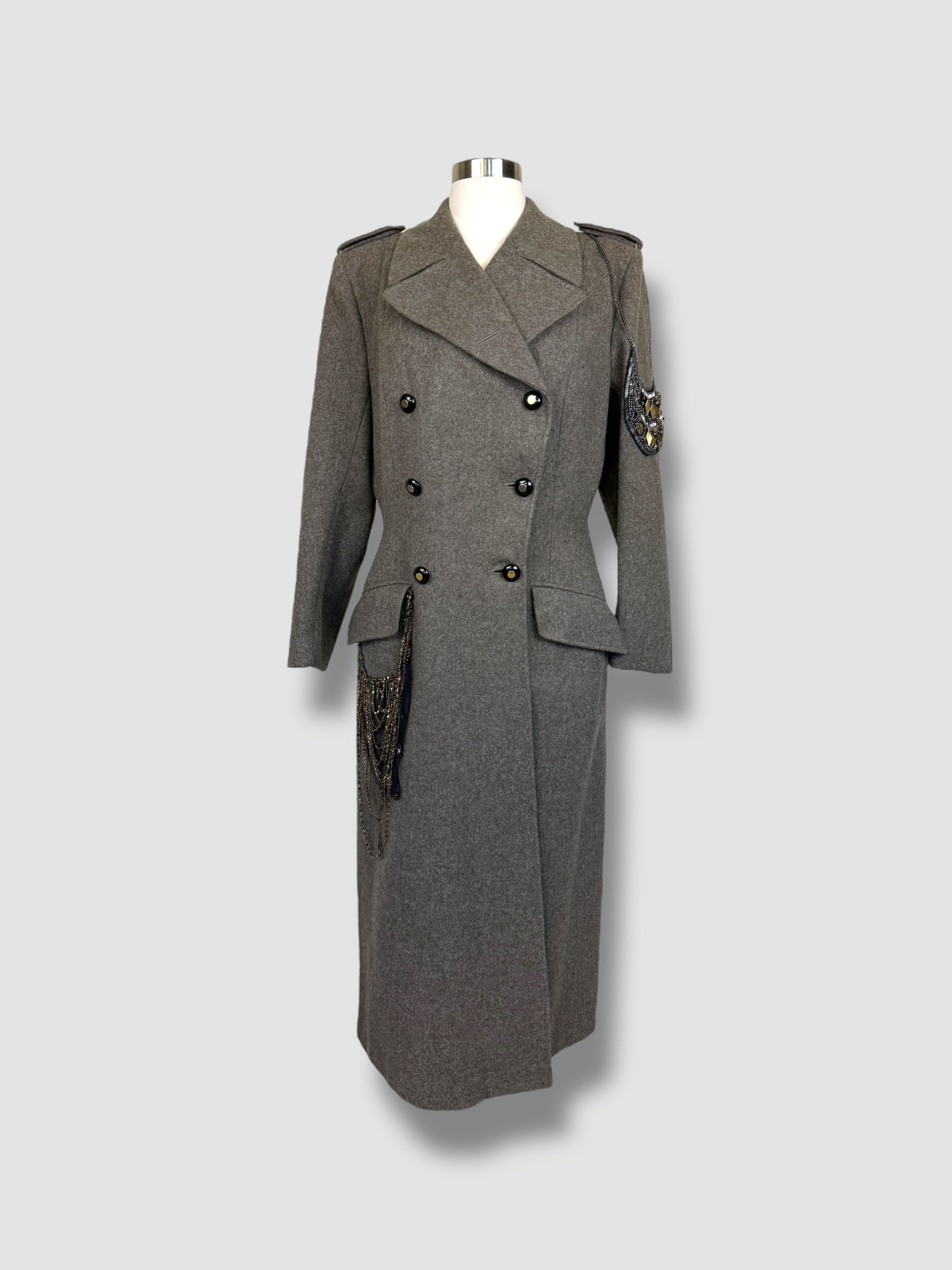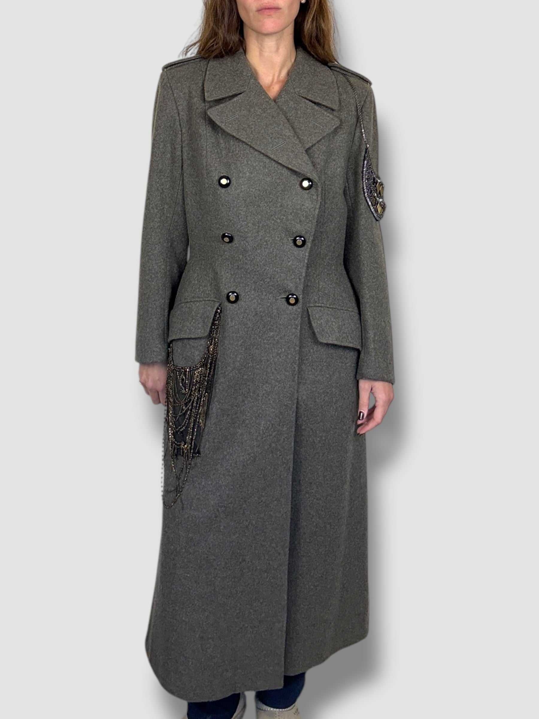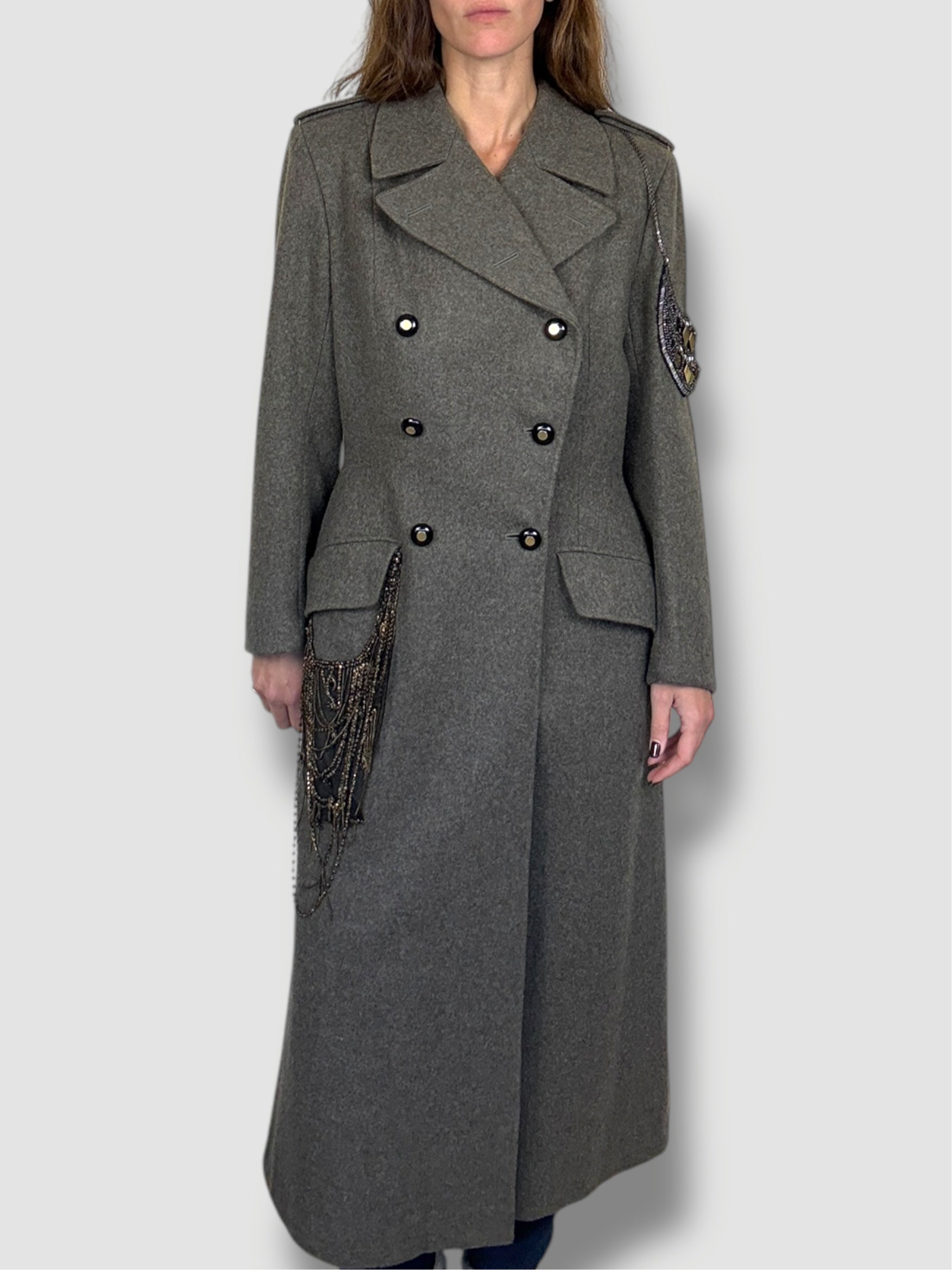 A rare vintage army coat reimagined into a true statement piece by Jen Wonders. Crafted from heavy wool, this long double-breasted coat carries all the strength of its military origins while being elevated with couture-inspired details. Adorned with vintage black-and-gold buttons, it features Jen’s signature embellishments: a dramatic hand-embroidered panel on the shoulder, layered with metallic beads and intricate thread work, and a striking pocket tulle draped with cascading vintage chains that add edge and movement. Both functional and ornamental, this coat embodies the spirit of wearable art, where utility meets opulence. A one-of-a-kind collector’s piece that transforms military heritage into modern-day statement dressing.