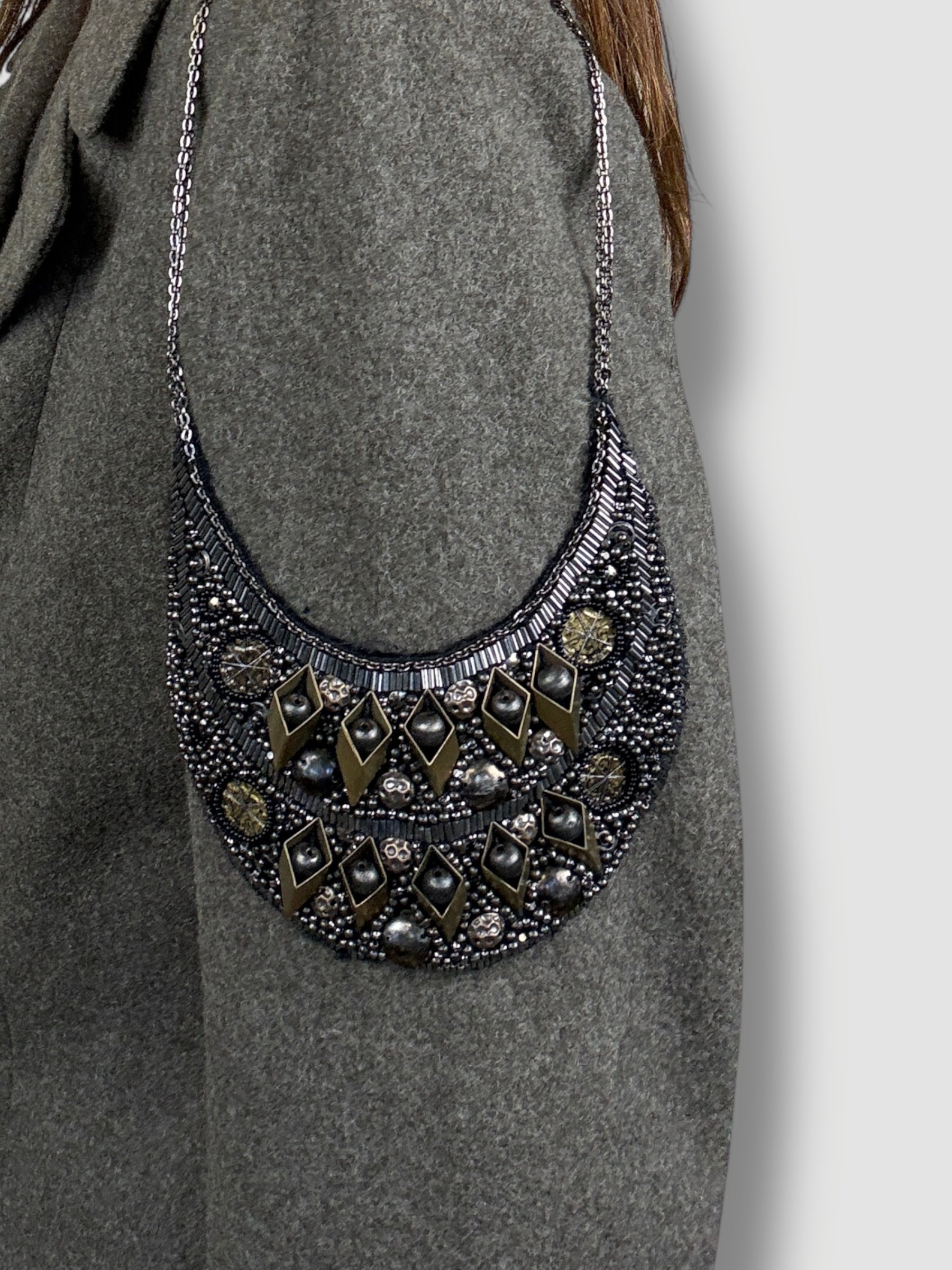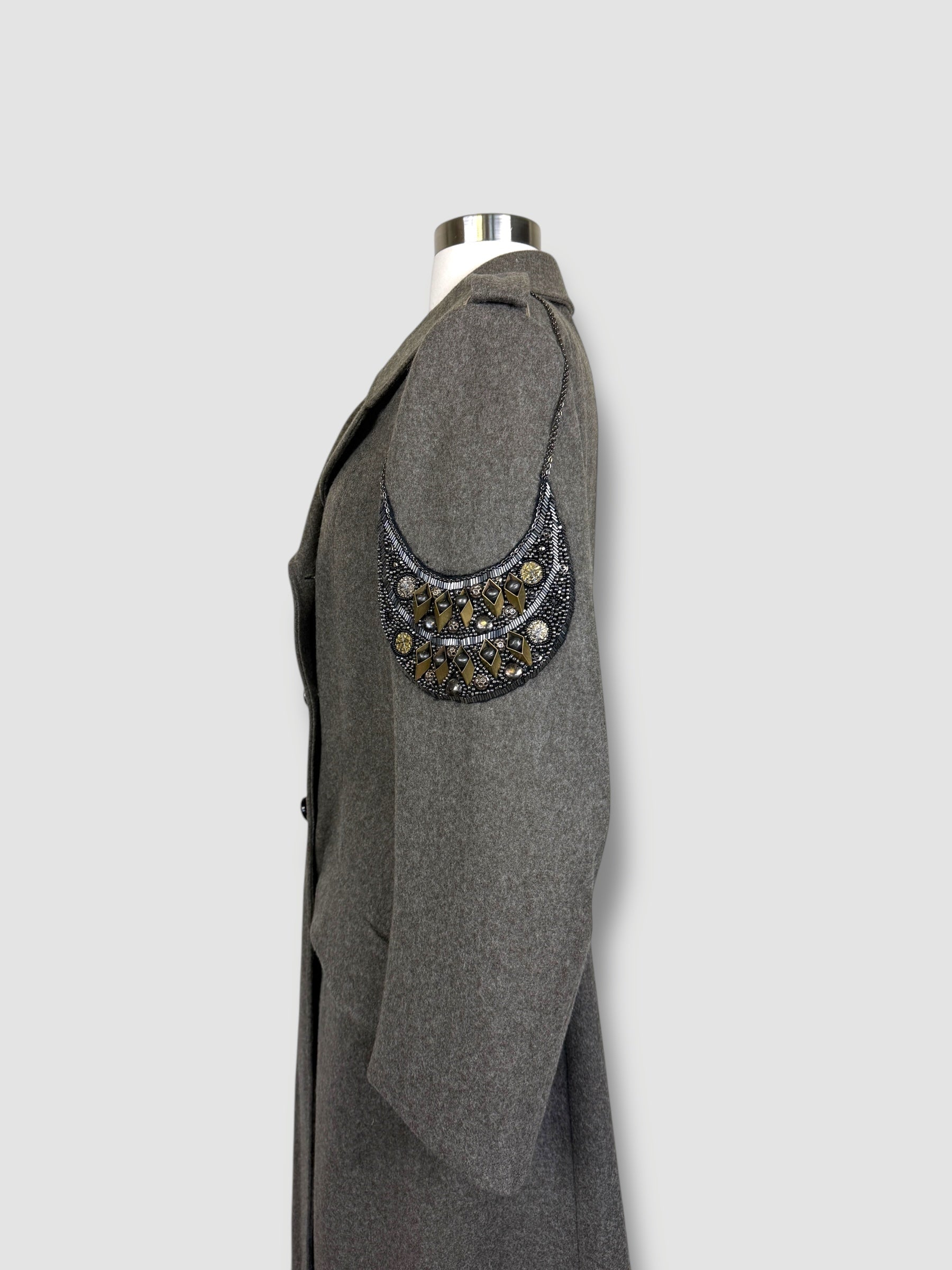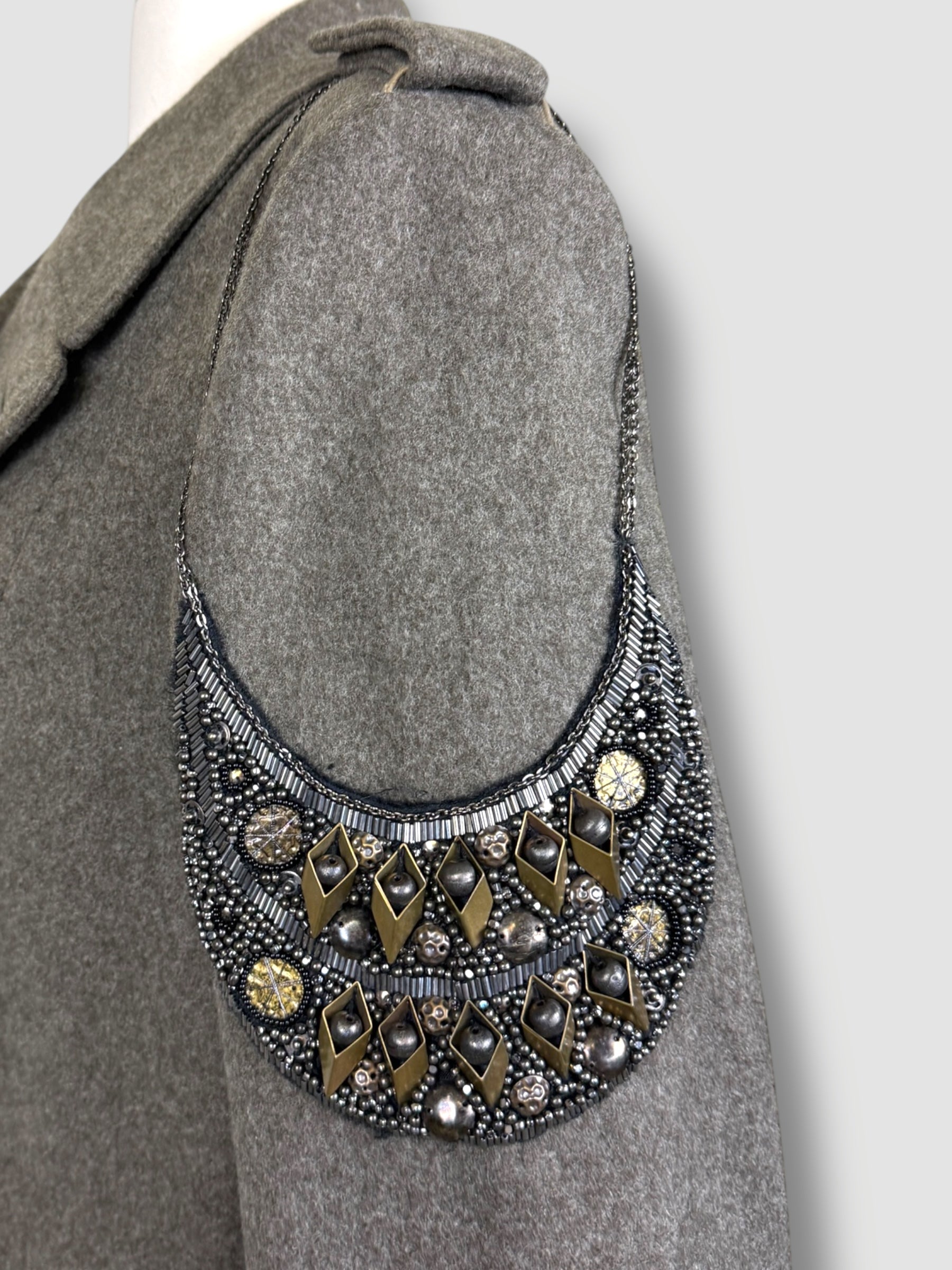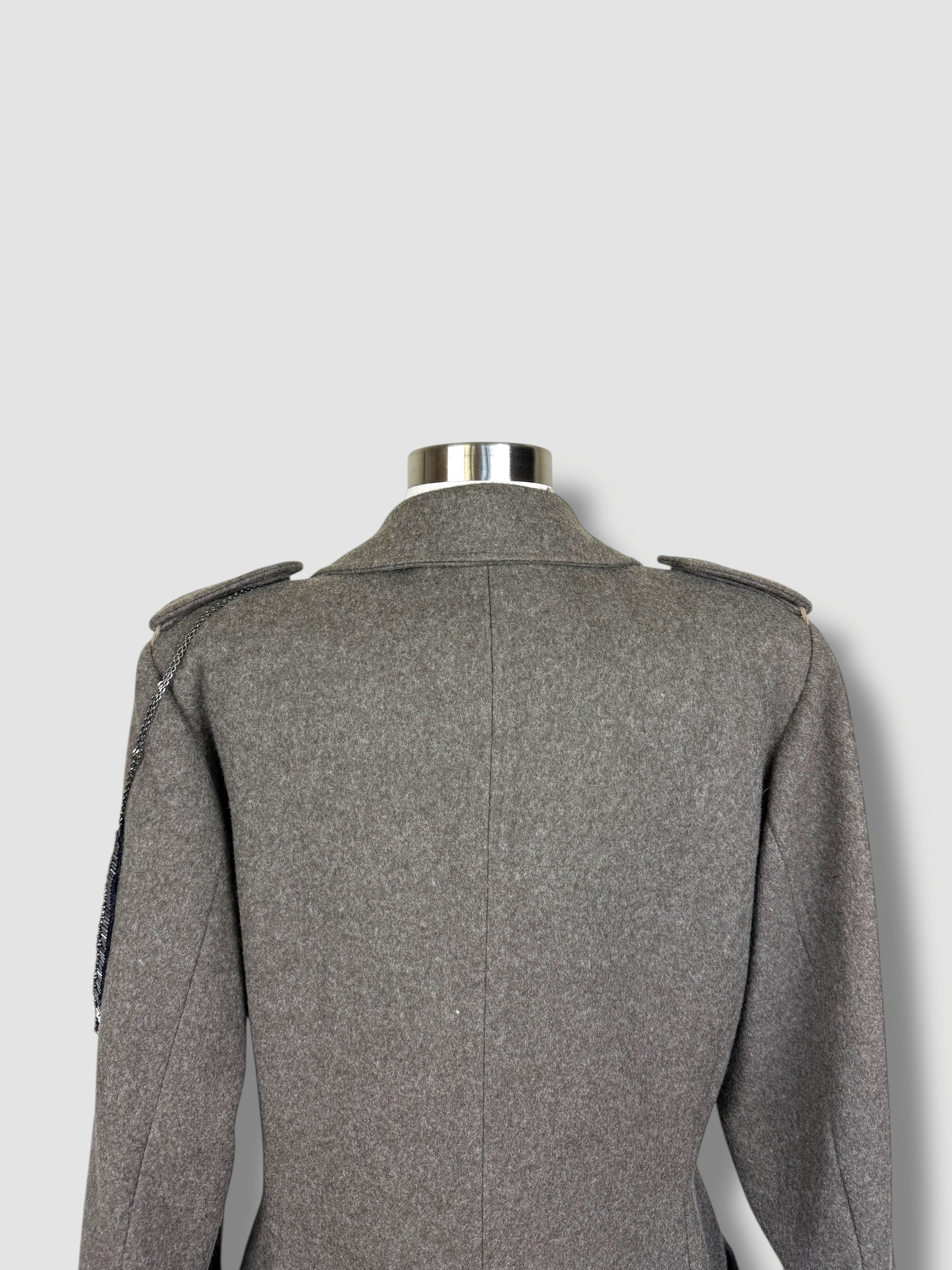 A rare vintage army coat reimagined into a true statement piece by Jen Wonders. Crafted from heavy wool, this long double-breasted coat carries all the strength of its military origins while being elevated with couture-inspired details. Adorned with vintage black-and-gold buttons, it features Jen’s signature embellishments: a dramatic hand-embroidered panel on the shoulder, layered with metallic beads and intricate thread work, and a striking pocket tulle draped with cascading vintage chains that add edge and movement. Both functional and ornamental, this coat embodies the spirit of wearable art, where utility meets opulence. A one-of-a-kind collector’s piece that transforms military heritage into modern-day statement dressing.