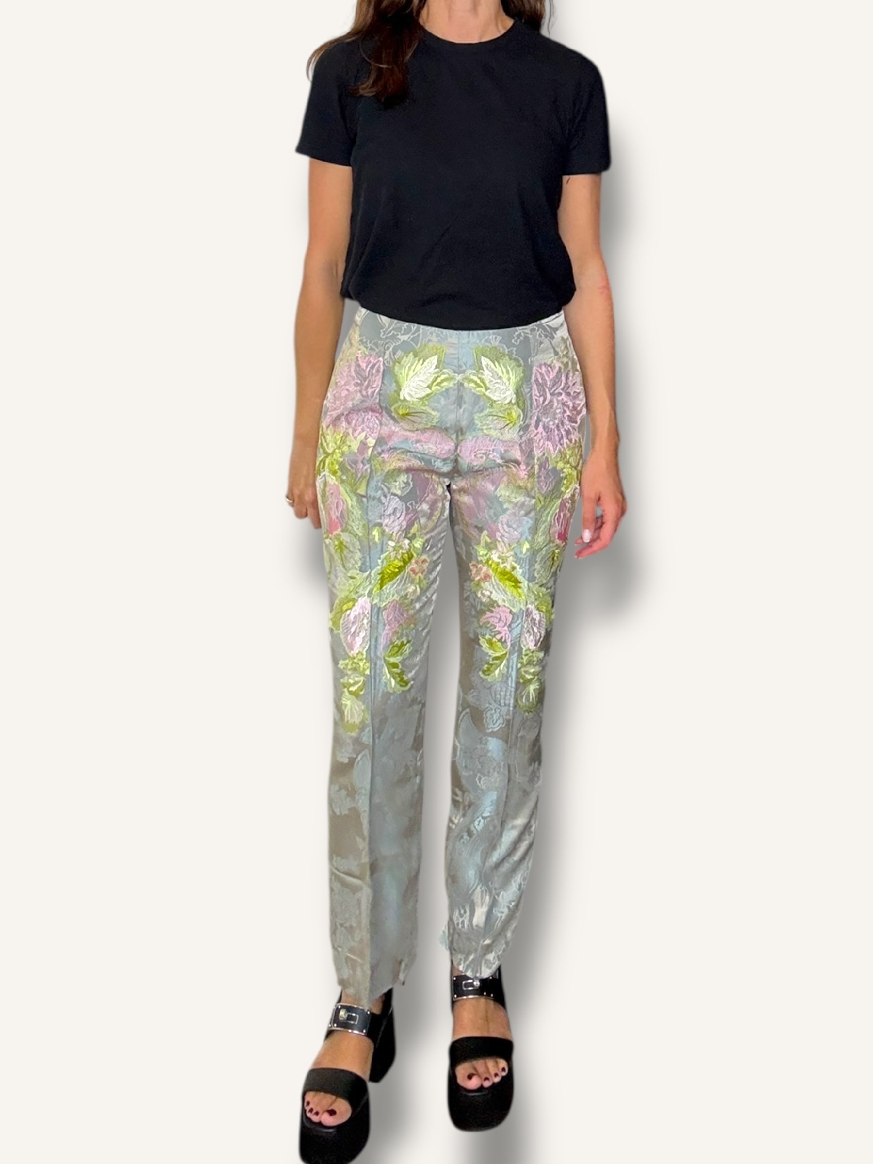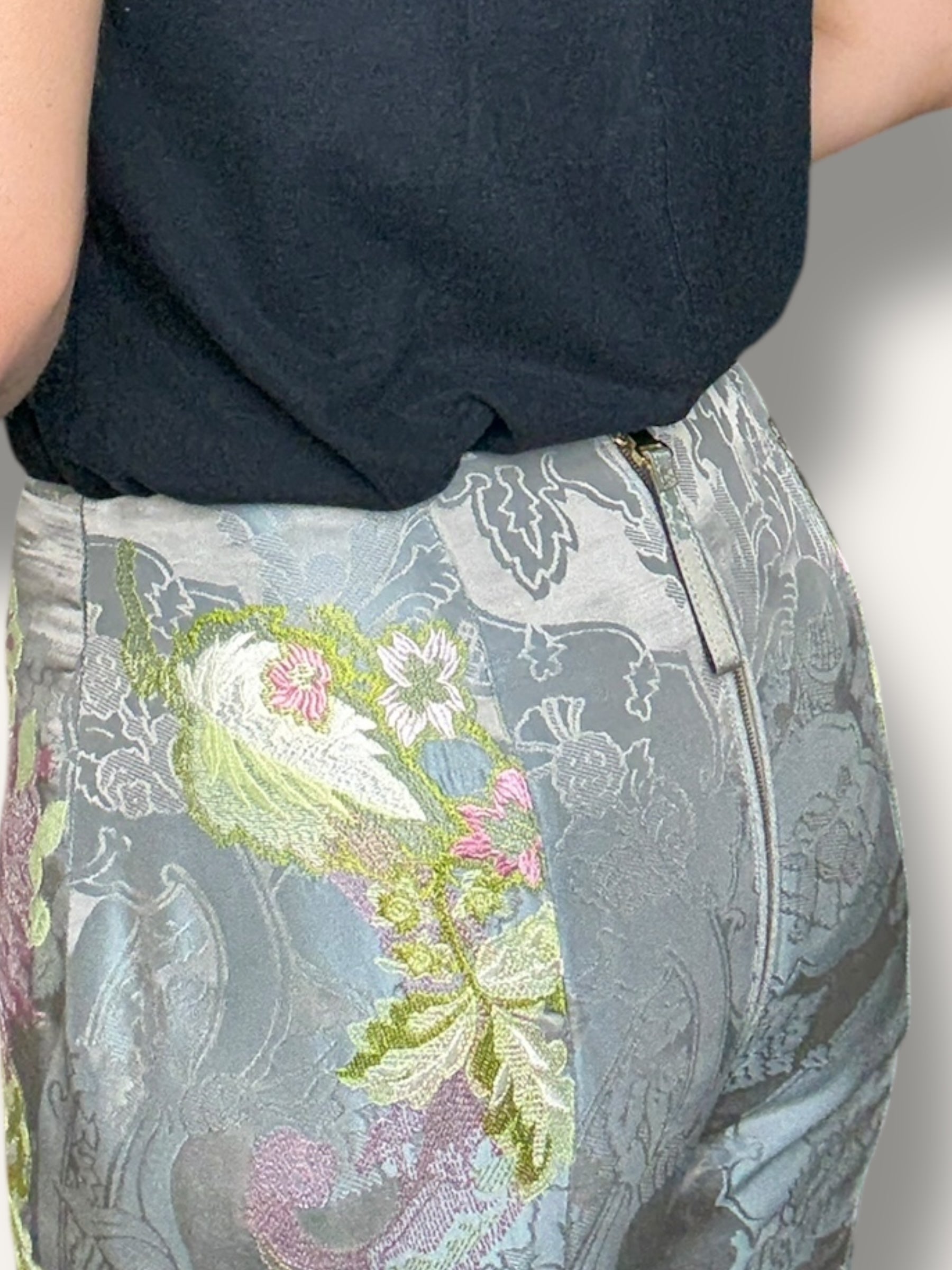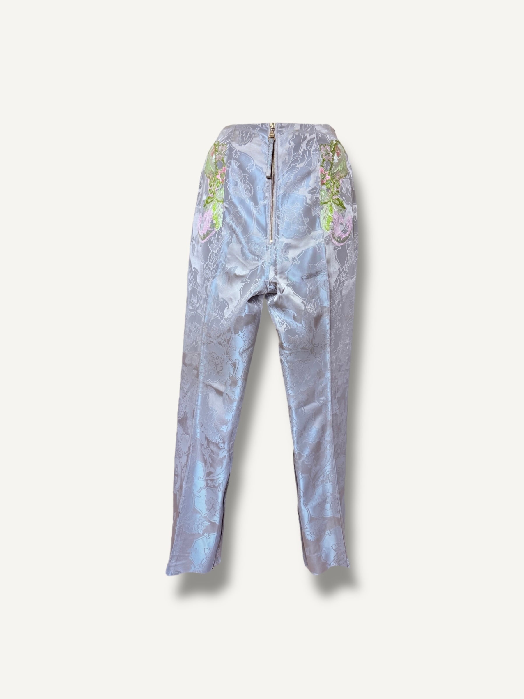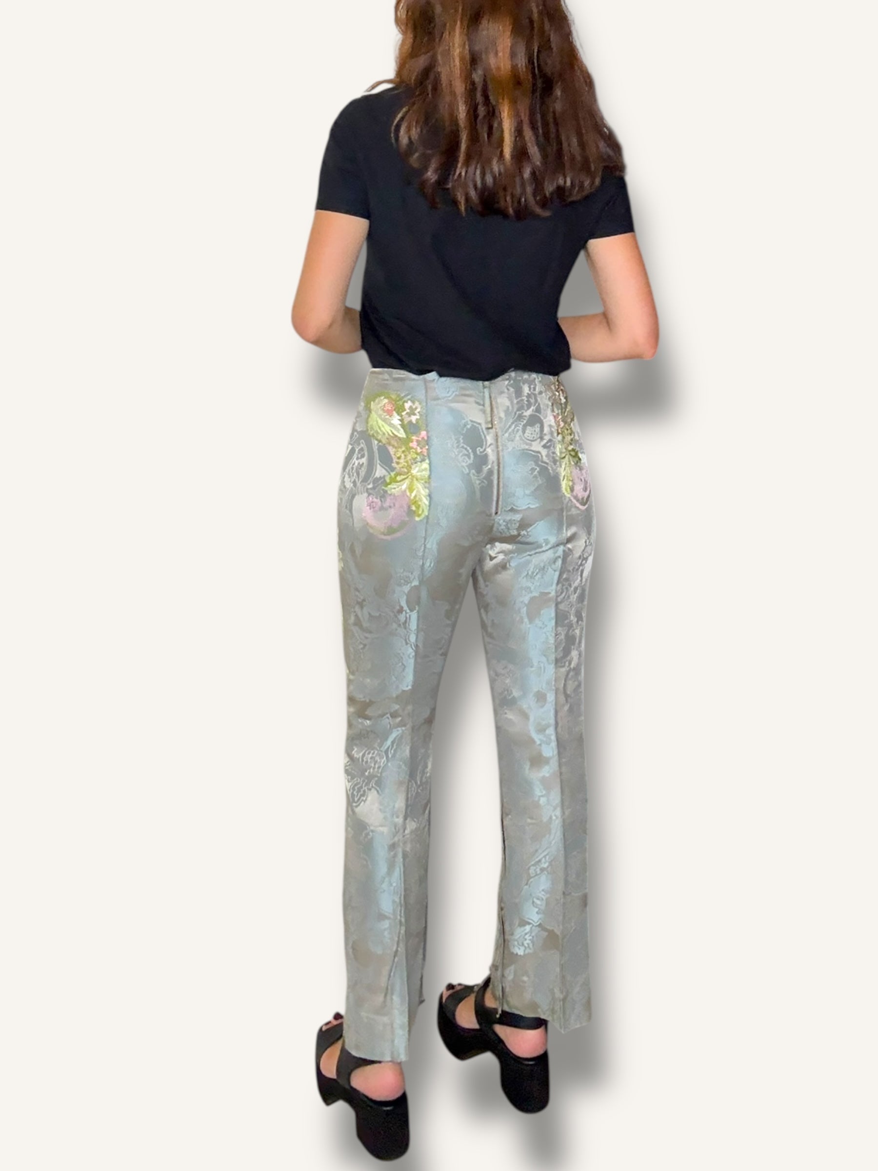 Stunning vintage Gianfranco Ferre pants in grey blue brocade with intricate floral embroidery. Features a high-waisted fit, back zipper closure, and additional zippers at the ankles for a sleek, tailored finish. Bold, elegant, and beautifully structured.
