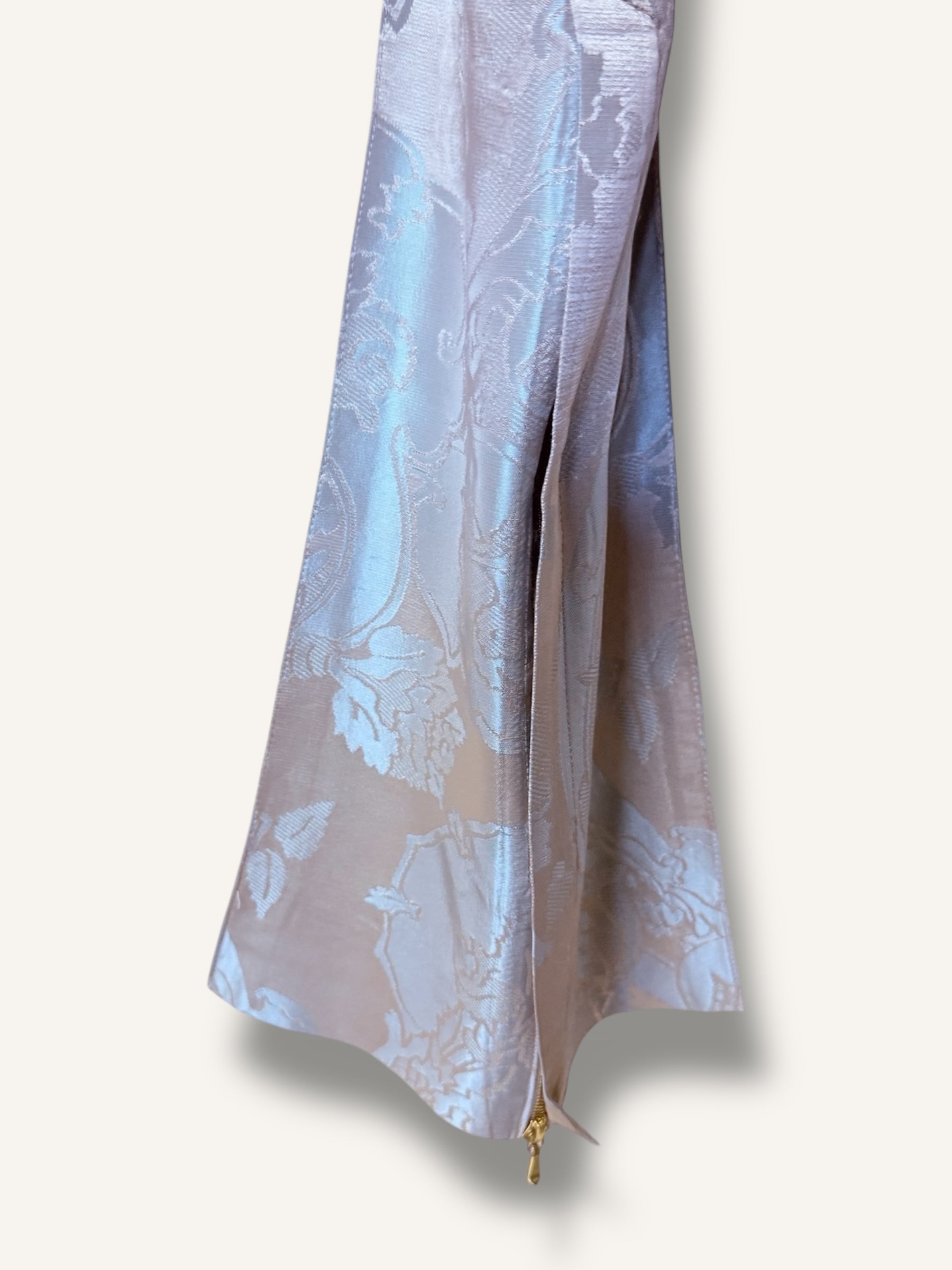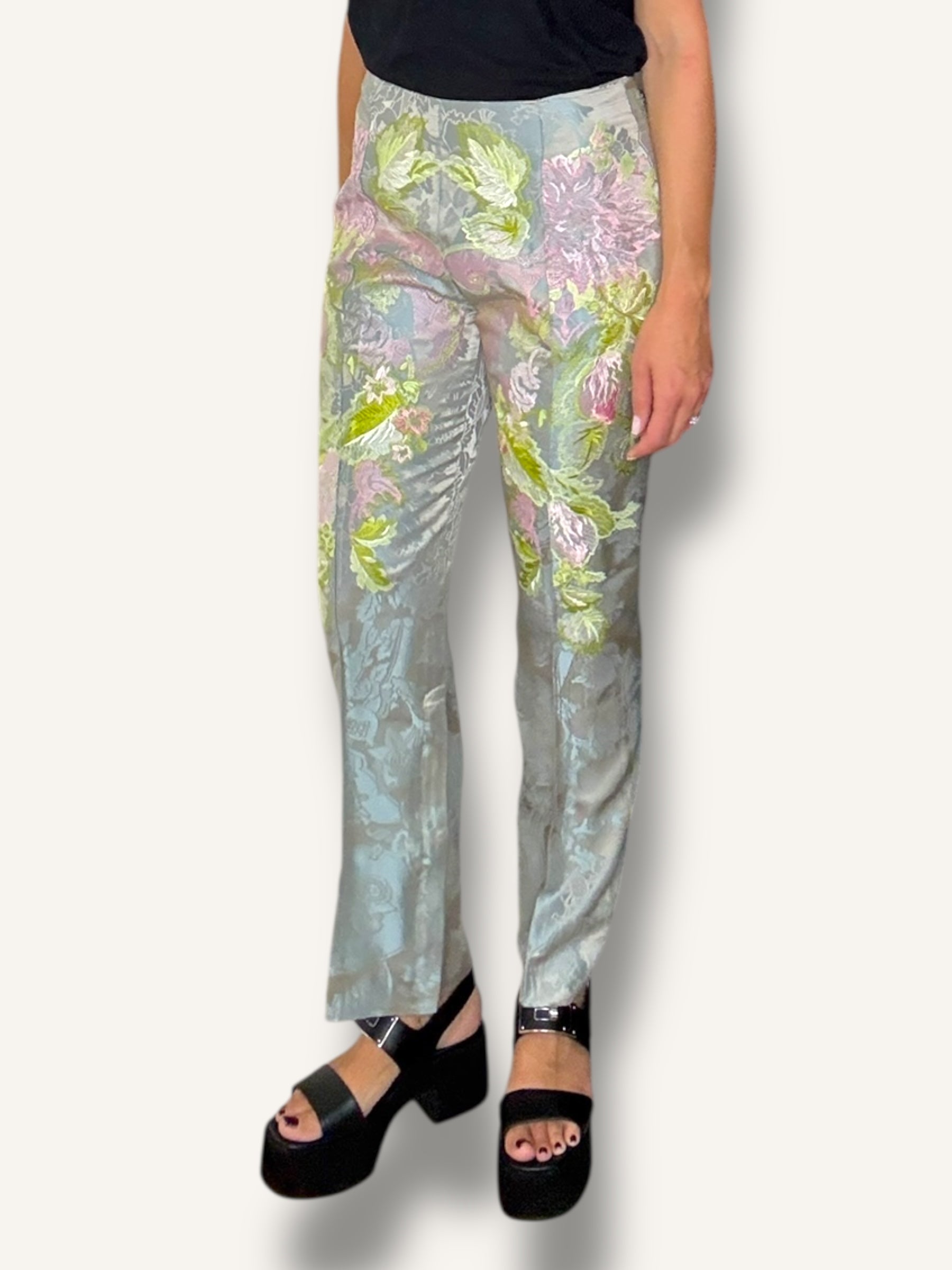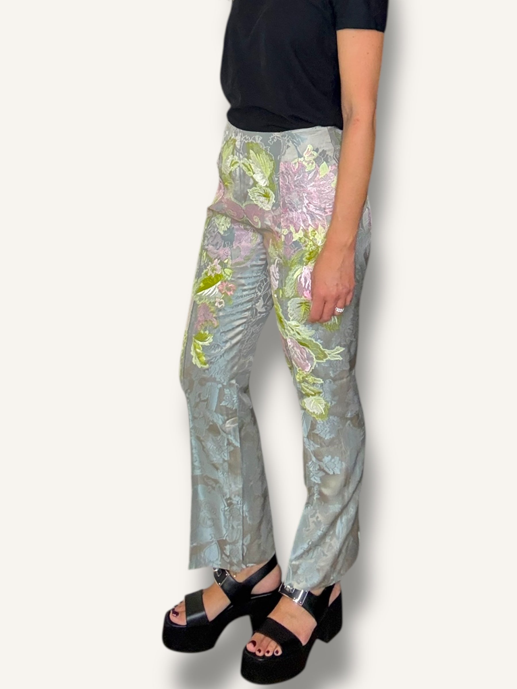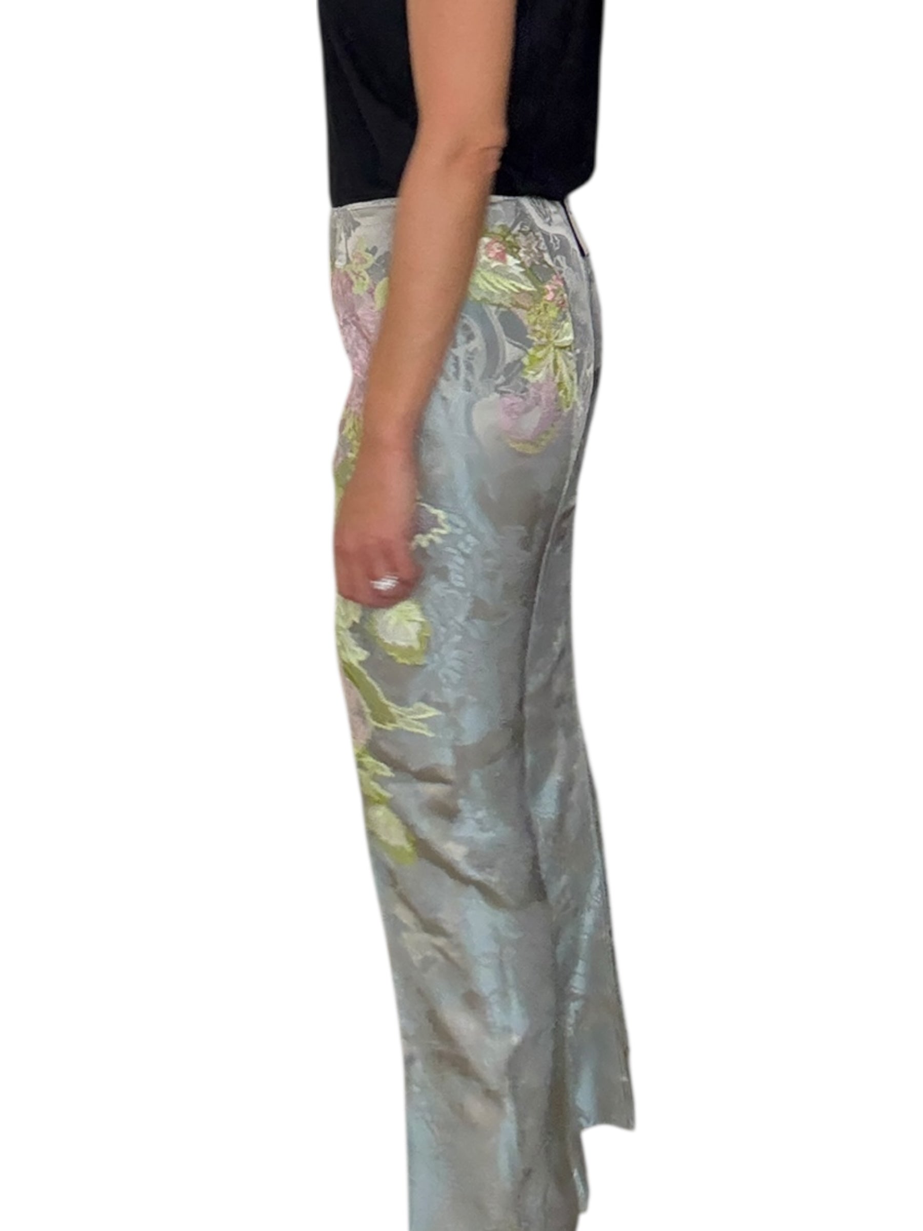 Stunning vintage Gianfranco Ferre pants in grey blue brocade with intricate floral embroidery. Features a high-waisted fit, back zipper closure, and additional zippers at the ankles for a sleek, tailored finish. Bold, elegant, and beautifully structured.