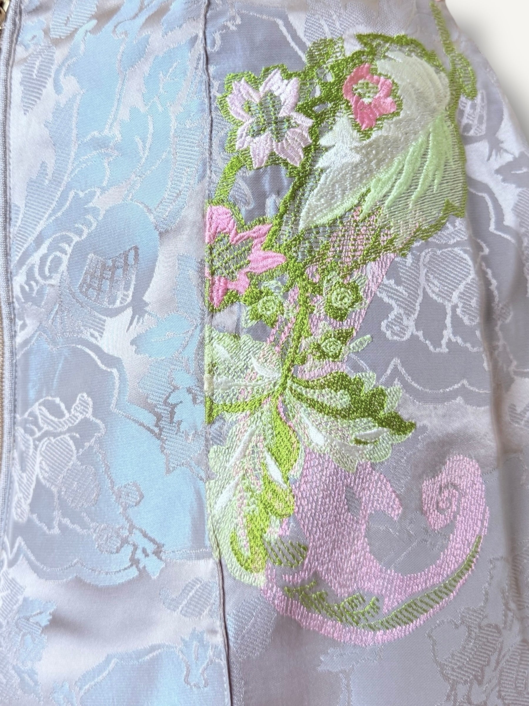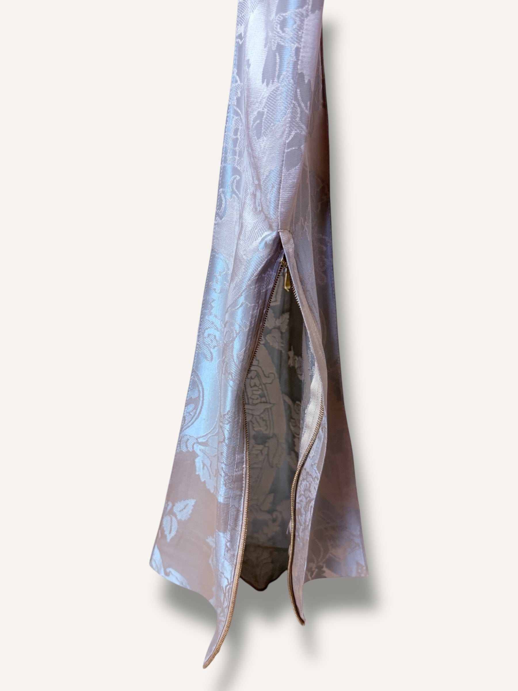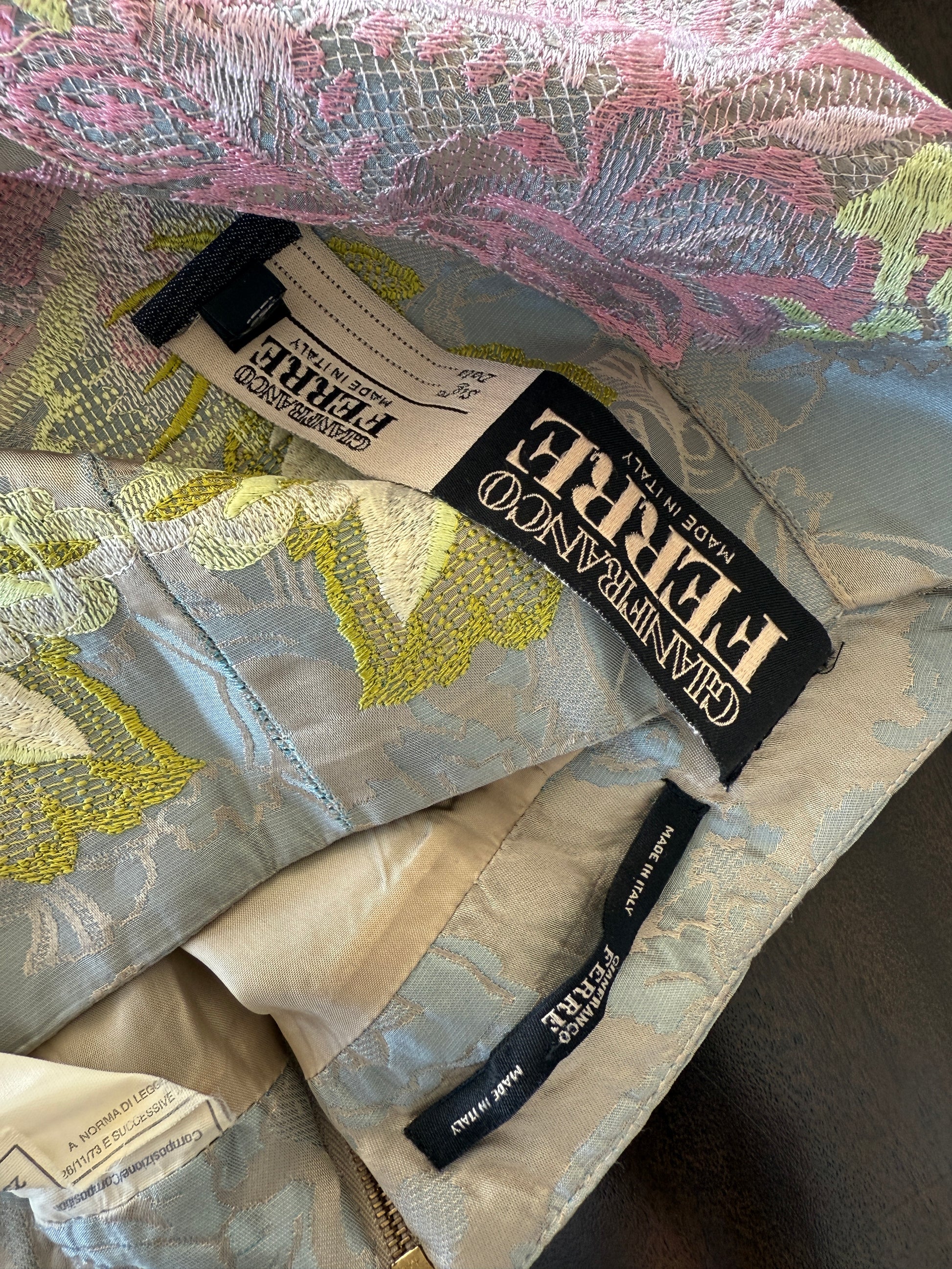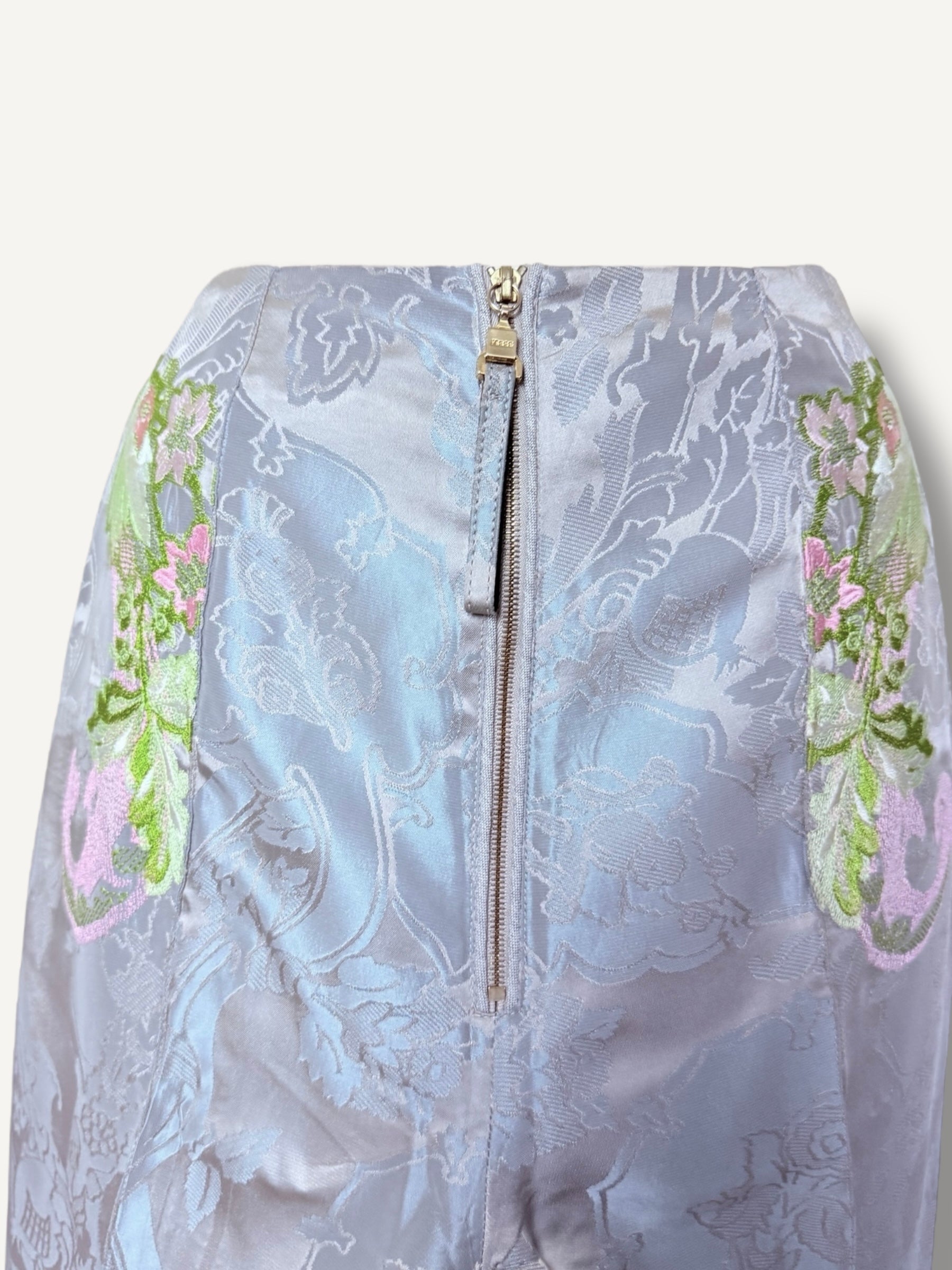 Stunning vintage Gianfranco Ferre pants in grey blue brocade with intricate floral embroidery. Features a high-waisted fit, back zipper closure, and additional zippers at the ankles for a sleek, tailored finish. Bold, elegant, and beautifully structured.