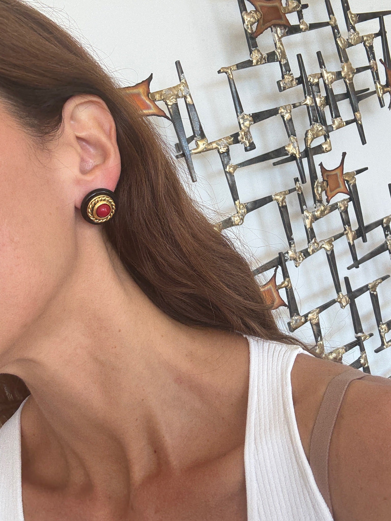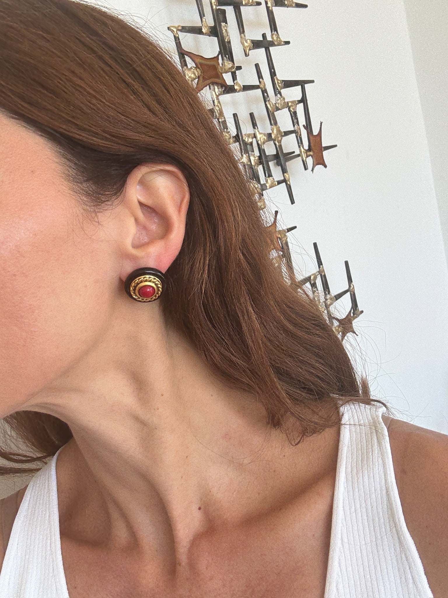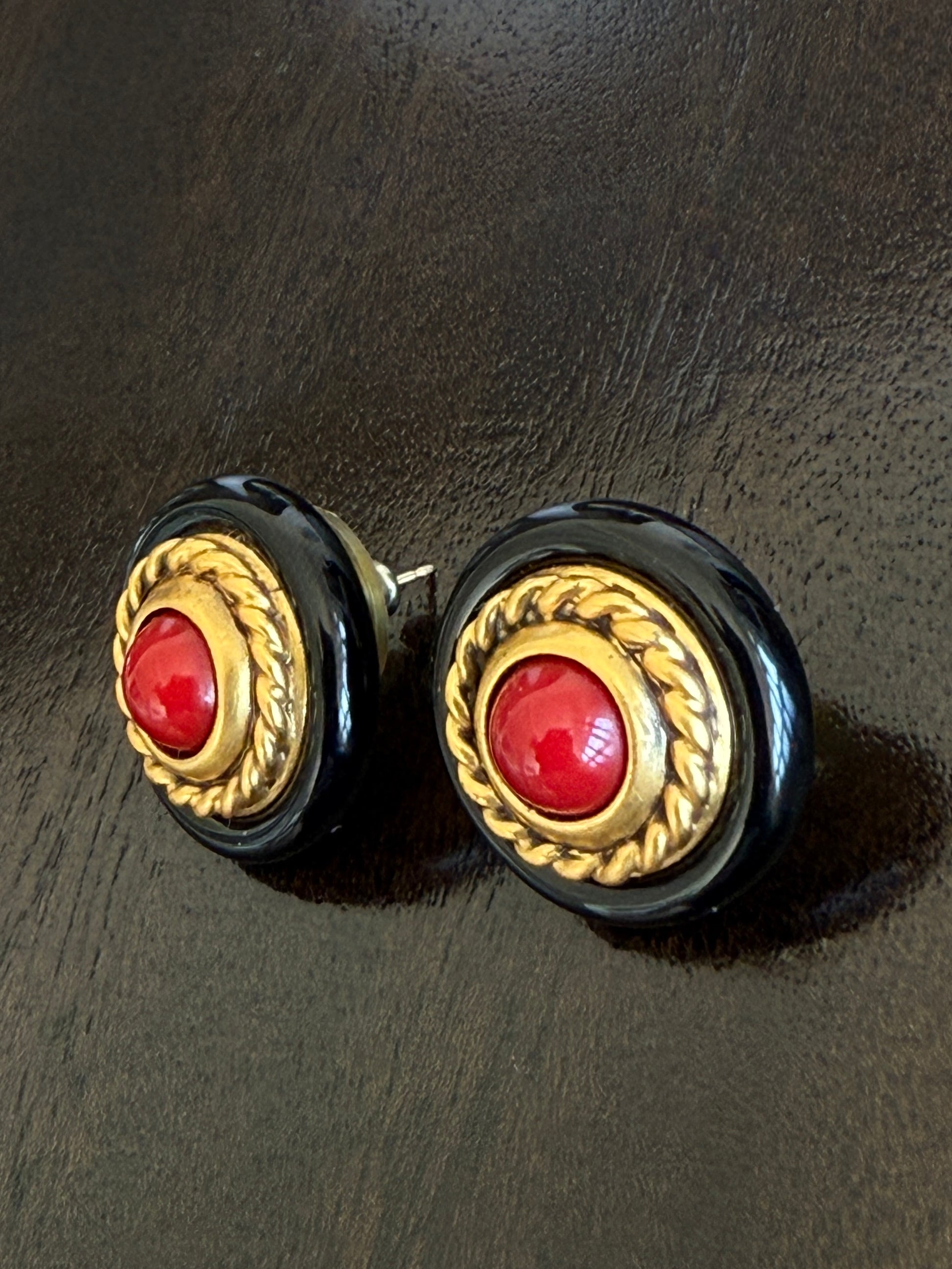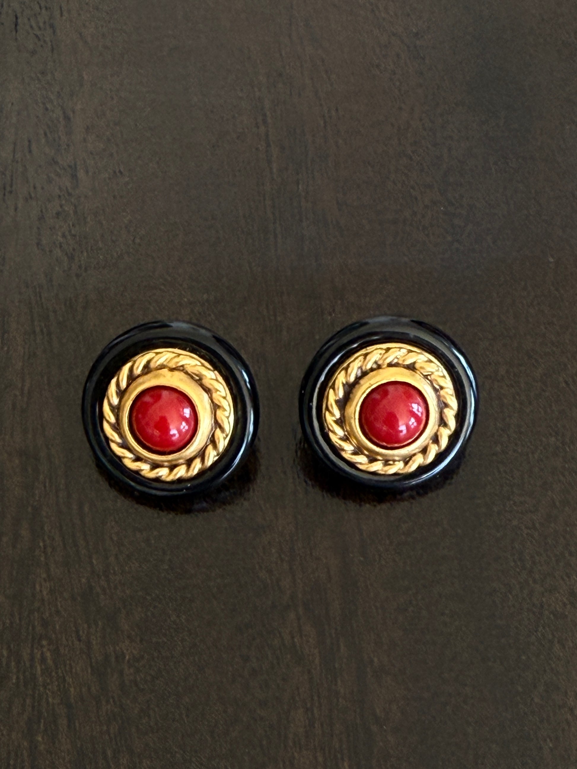 Vintage Yves Saint Laurent signed statement pierced earrings featuring a bold round design with glossy black enamel, a textured gold-tone rope border, and a striking red cabochon center. These clip-on earrings embody Yves Saint Laurent’s iconic 1980s aesthetic, glamorous, sculptural, and timeless. A rare collectible piece for vintage lovers and Saint Laurent devotees alike.