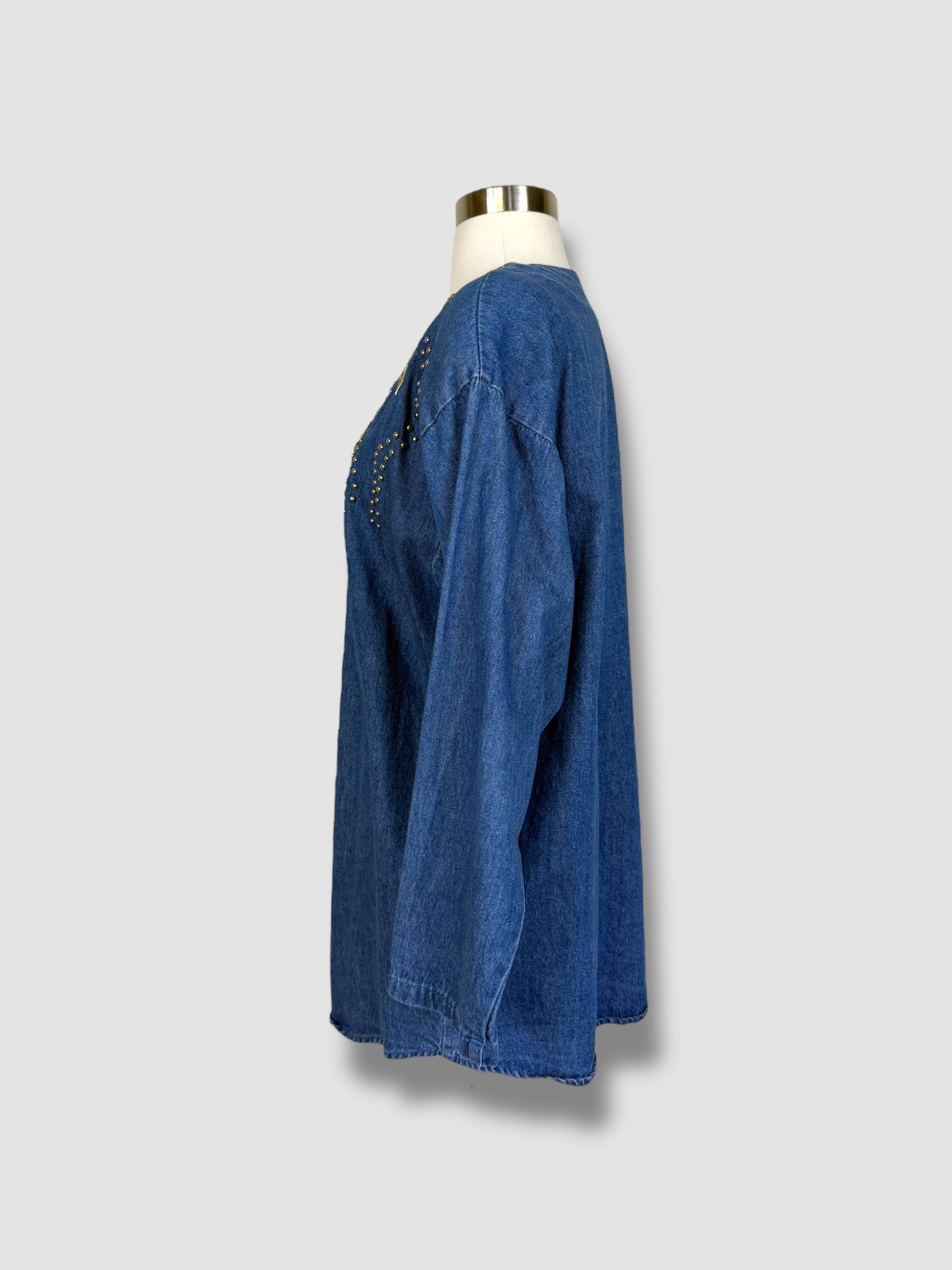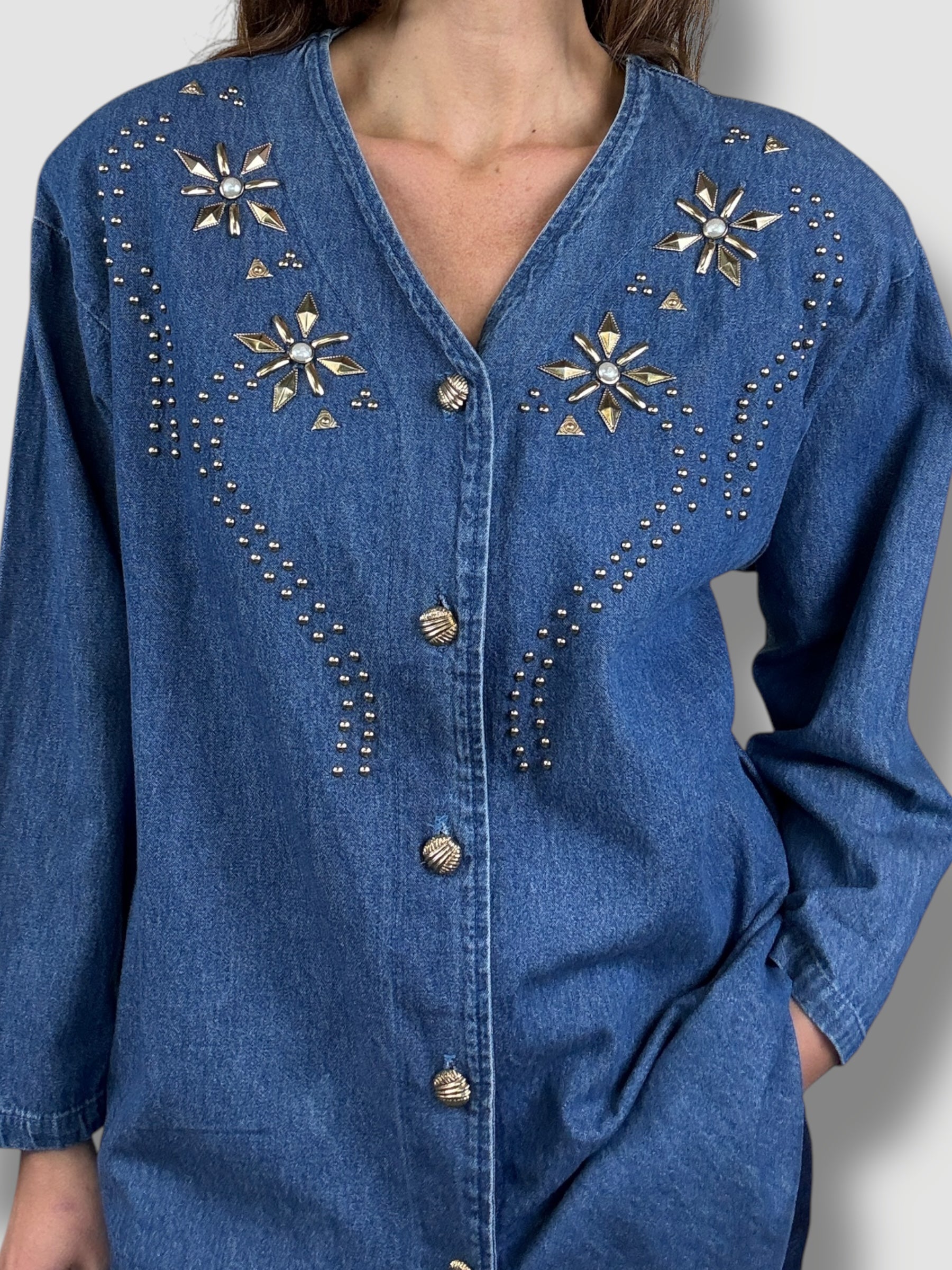 This vintage denim shirt brings a touch of Western charm with its embellished floral motif made from metallic studs and mirrored appliqués. Designed with a flattering V-neckline, relaxed fit, and unique shell-like buttons, it pairs just as well with jeans as it does layered over a dress. A soft, medium-wash denim makes it both eye-catching and easy to wear — the perfect blend of playful and classic.