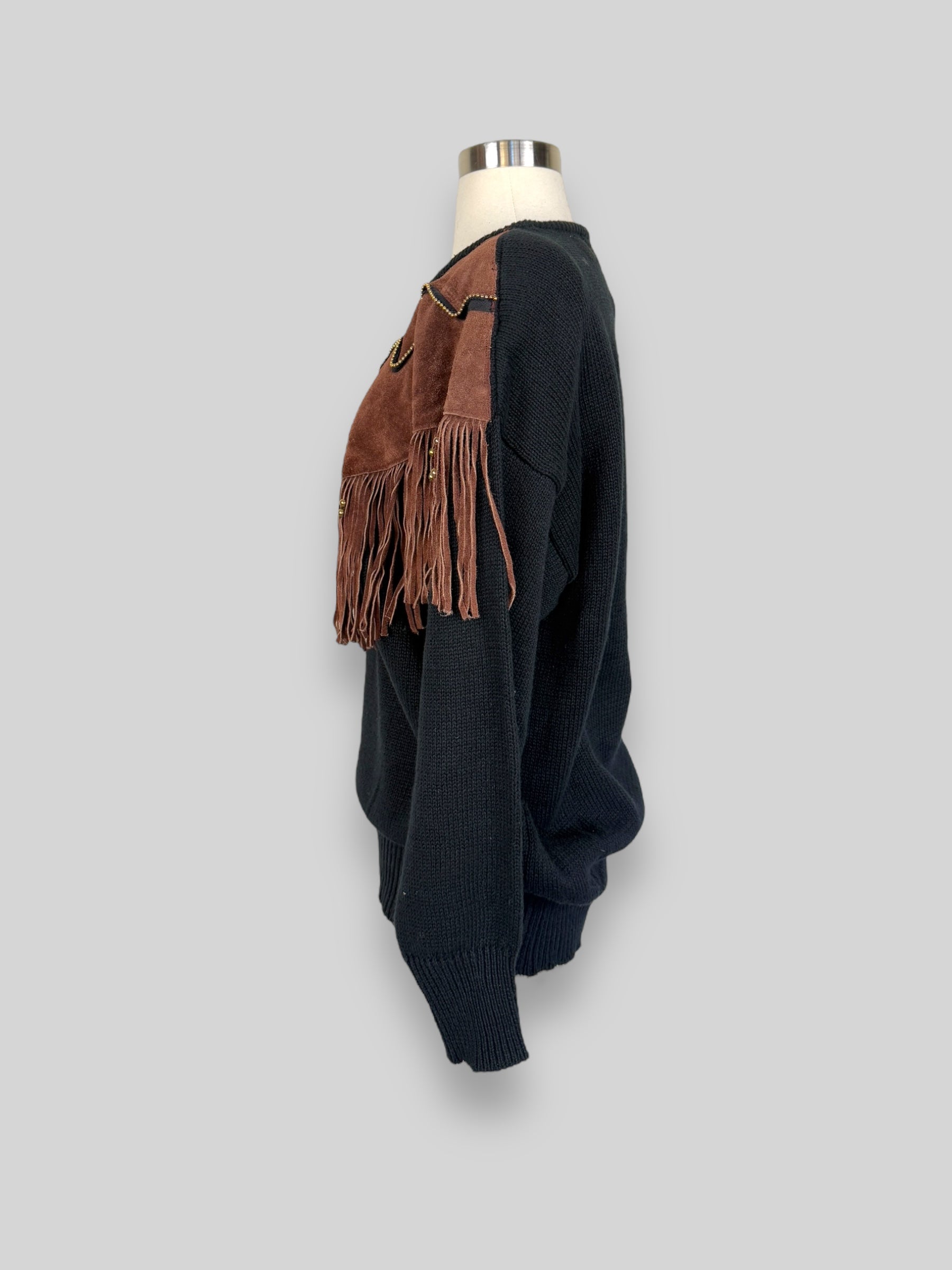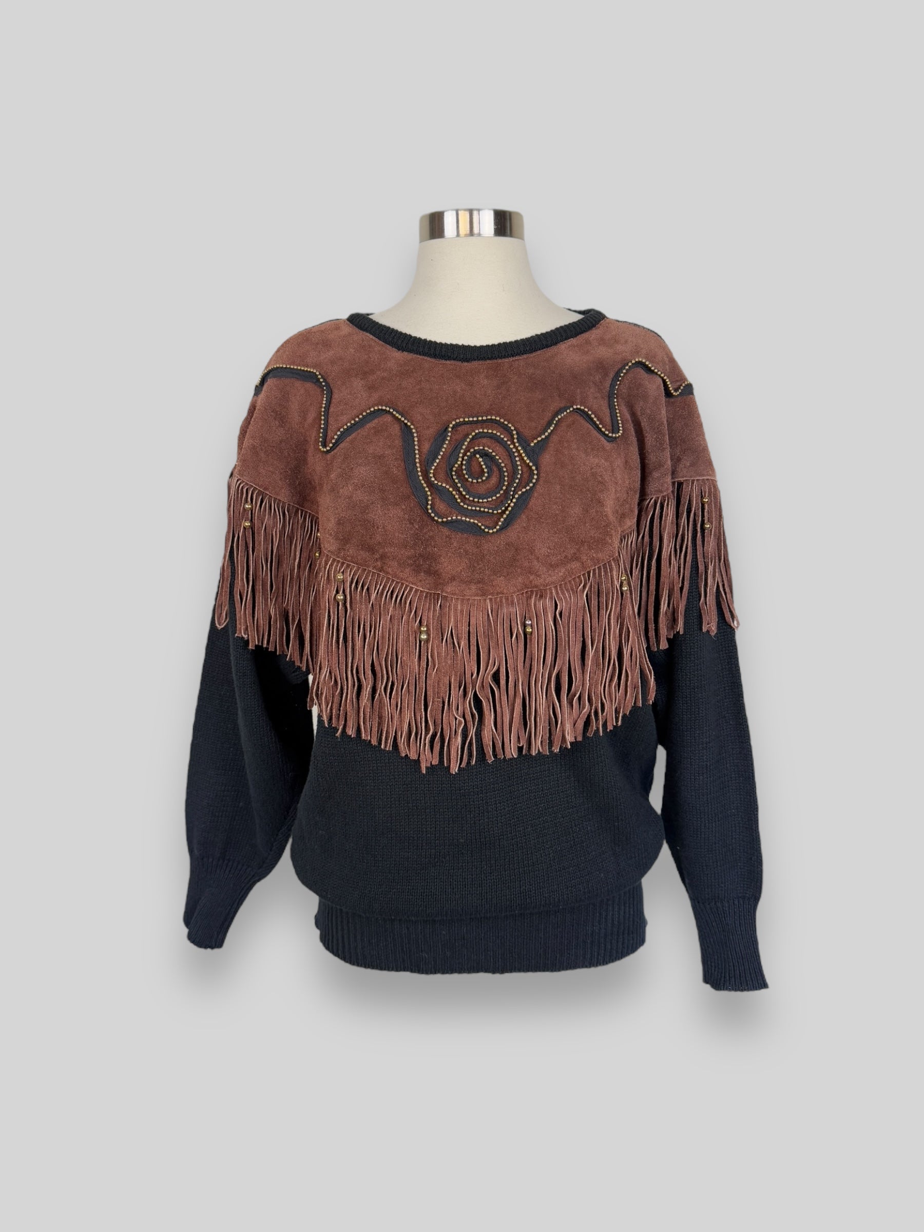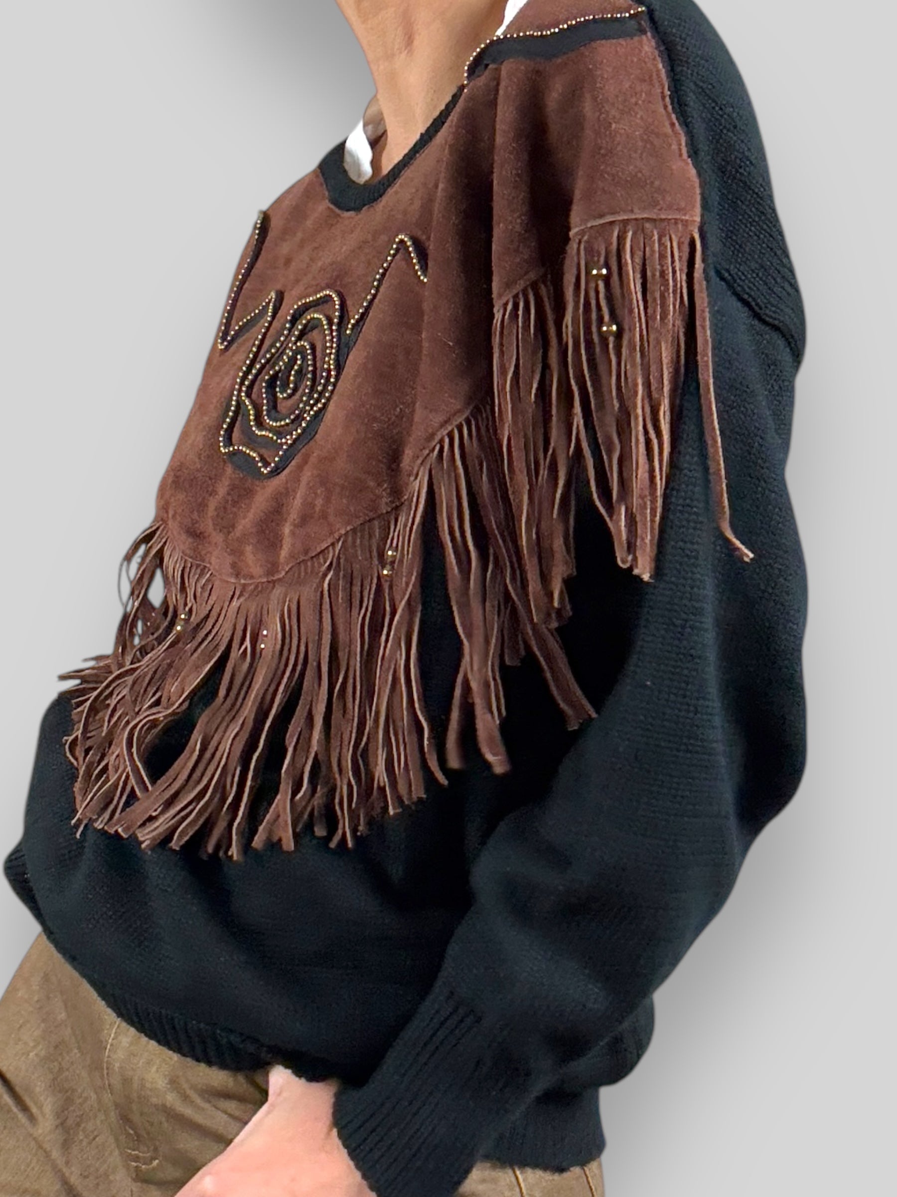 Vintage 90s black knit sweater with a bold Western-inspired design, featuring a brown suede yoke adorned with fringe detailing and a central embroidered rose motif outlined in gold-toned beads. The relaxed fit and ribbed cuffs add to its cozy appeal, while the unique embellishments make it a standout piece perfect for adding a touch of retro flair to any casual outfit.