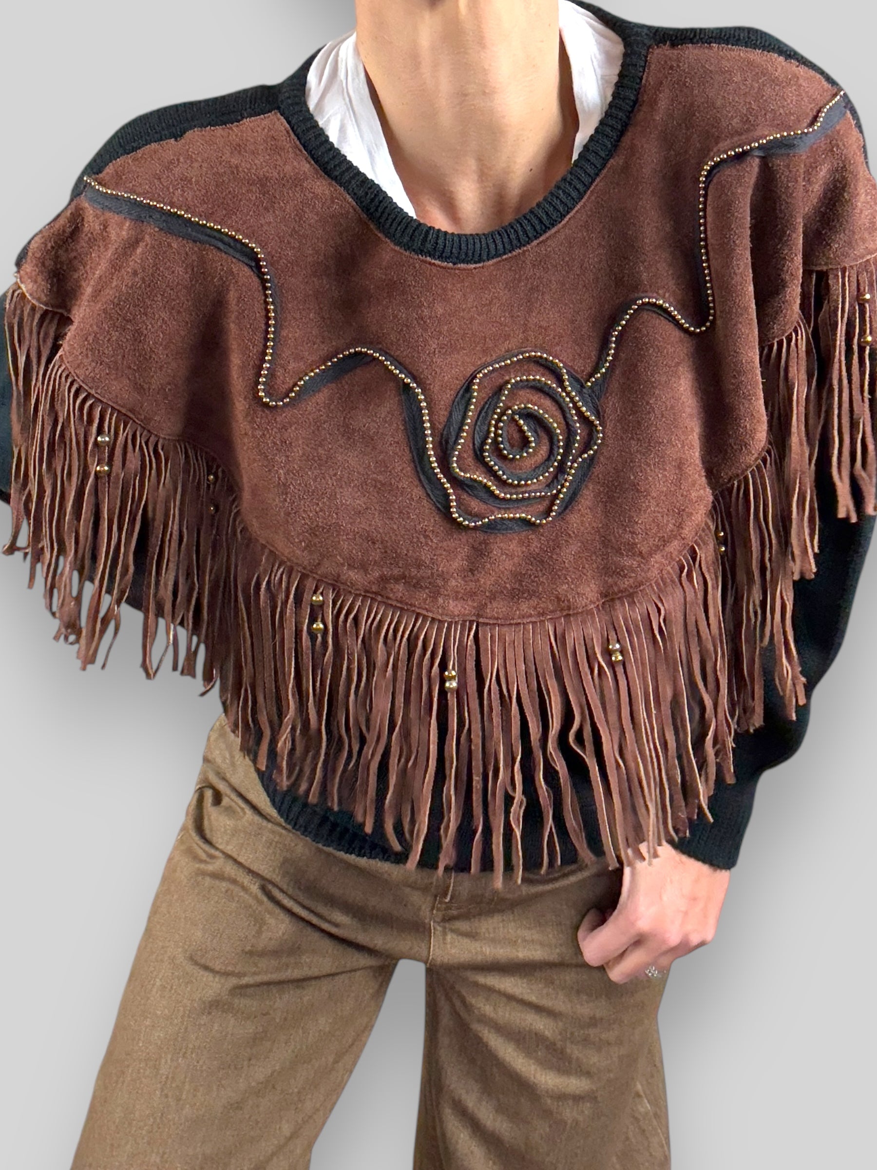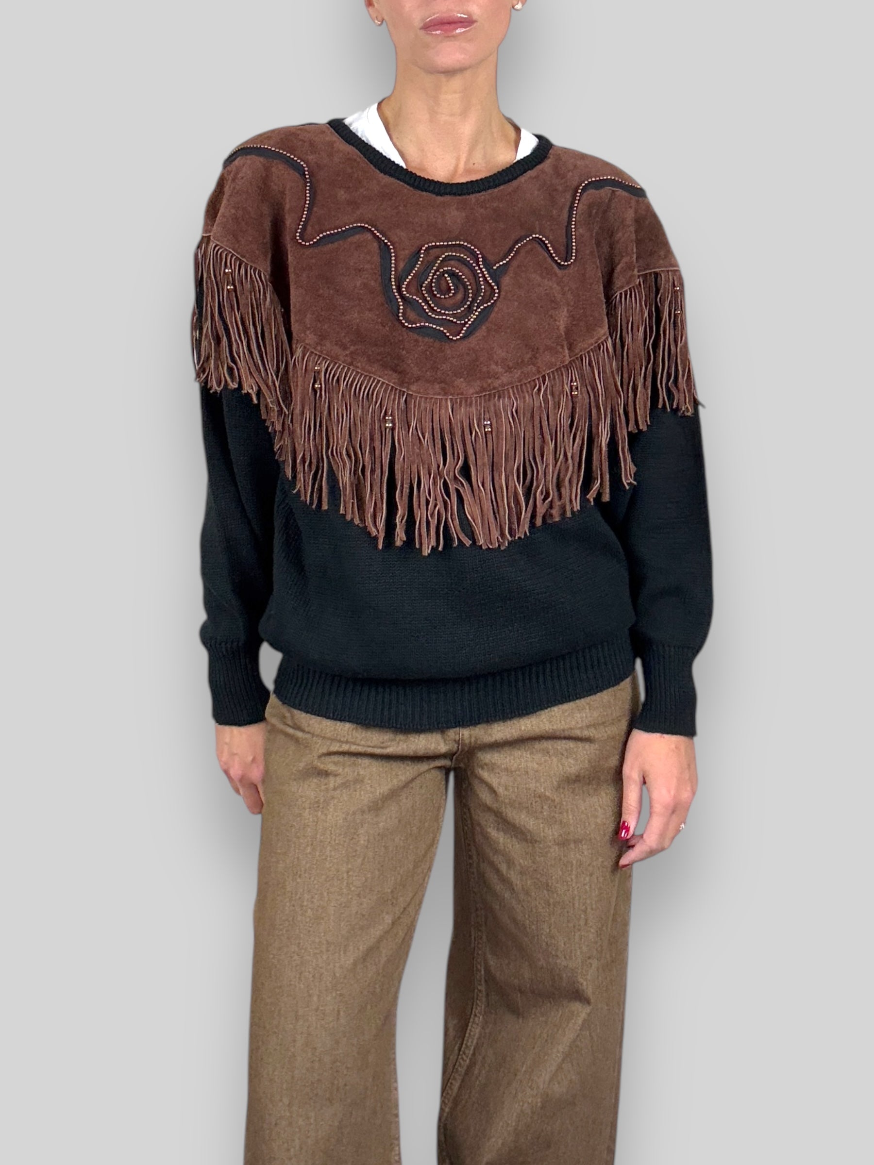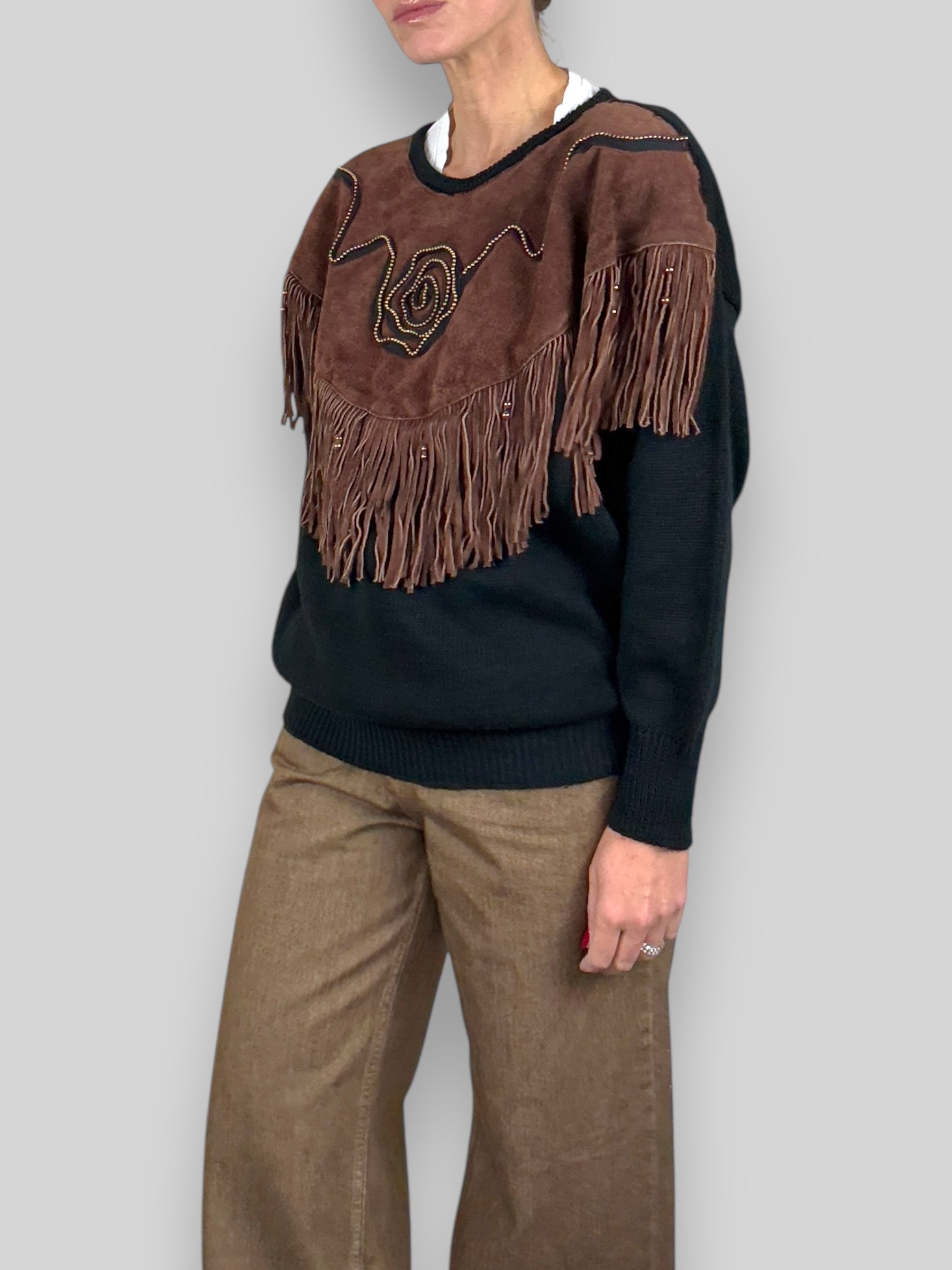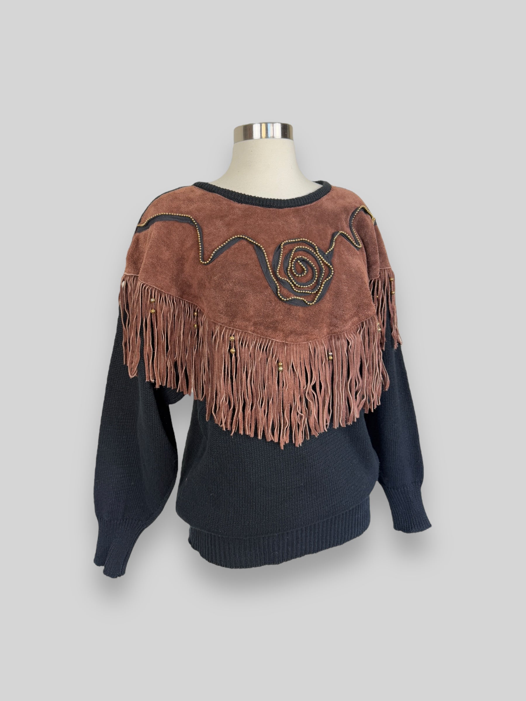 Vintage 90s black knit sweater with a bold Western-inspired design, featuring a brown suede yoke adorned with fringe detailing and a central embroidered rose motif outlined in gold-toned beads. The relaxed fit and ribbed cuffs add to its cozy appeal, while the unique embellishments make it a standout piece perfect for adding a touch of retro flair to any casual outfit.