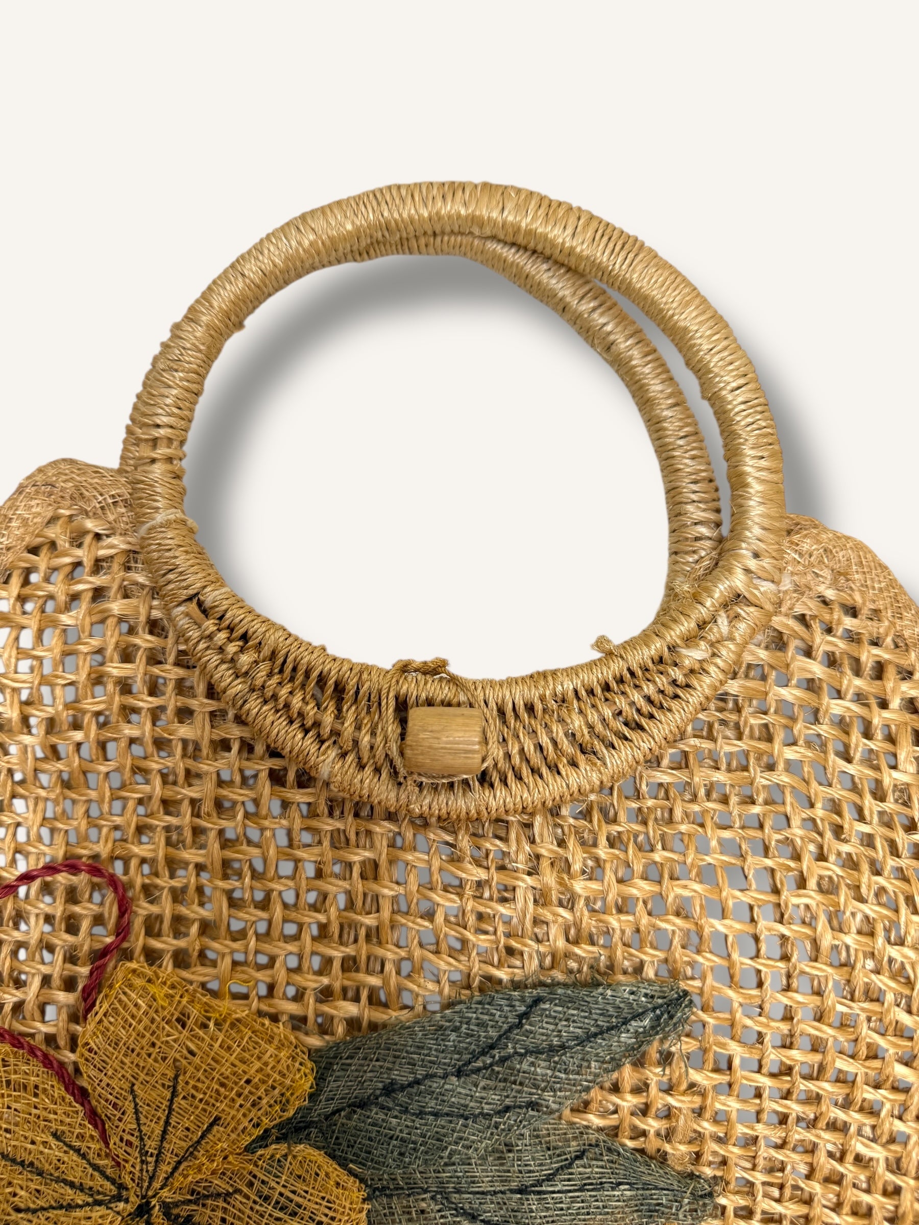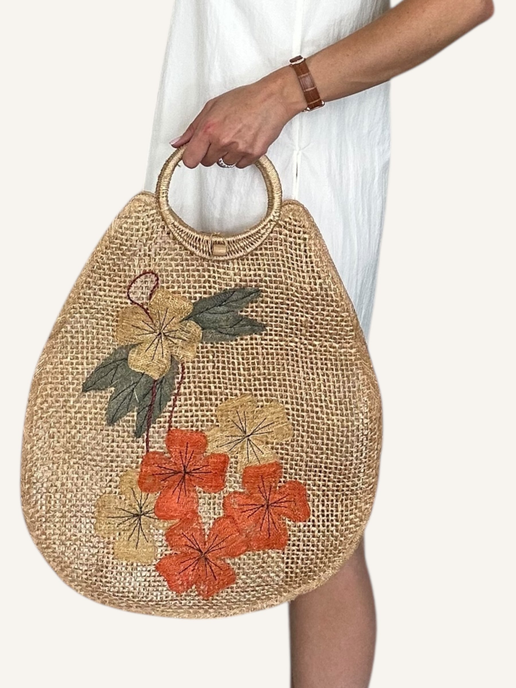 This oversized vintage woven straw bag is a warm-weather statement piece with floral embroidery in bold orange and yellow tones. Featuring sturdy circular handles and a unique curved silhouette, it’s perfect for beach days, summer markets, or everyday errands. The open-top design offers easy access to your essentials, while the textured weave and hand-stitched flowers add a charming, artisan feel.