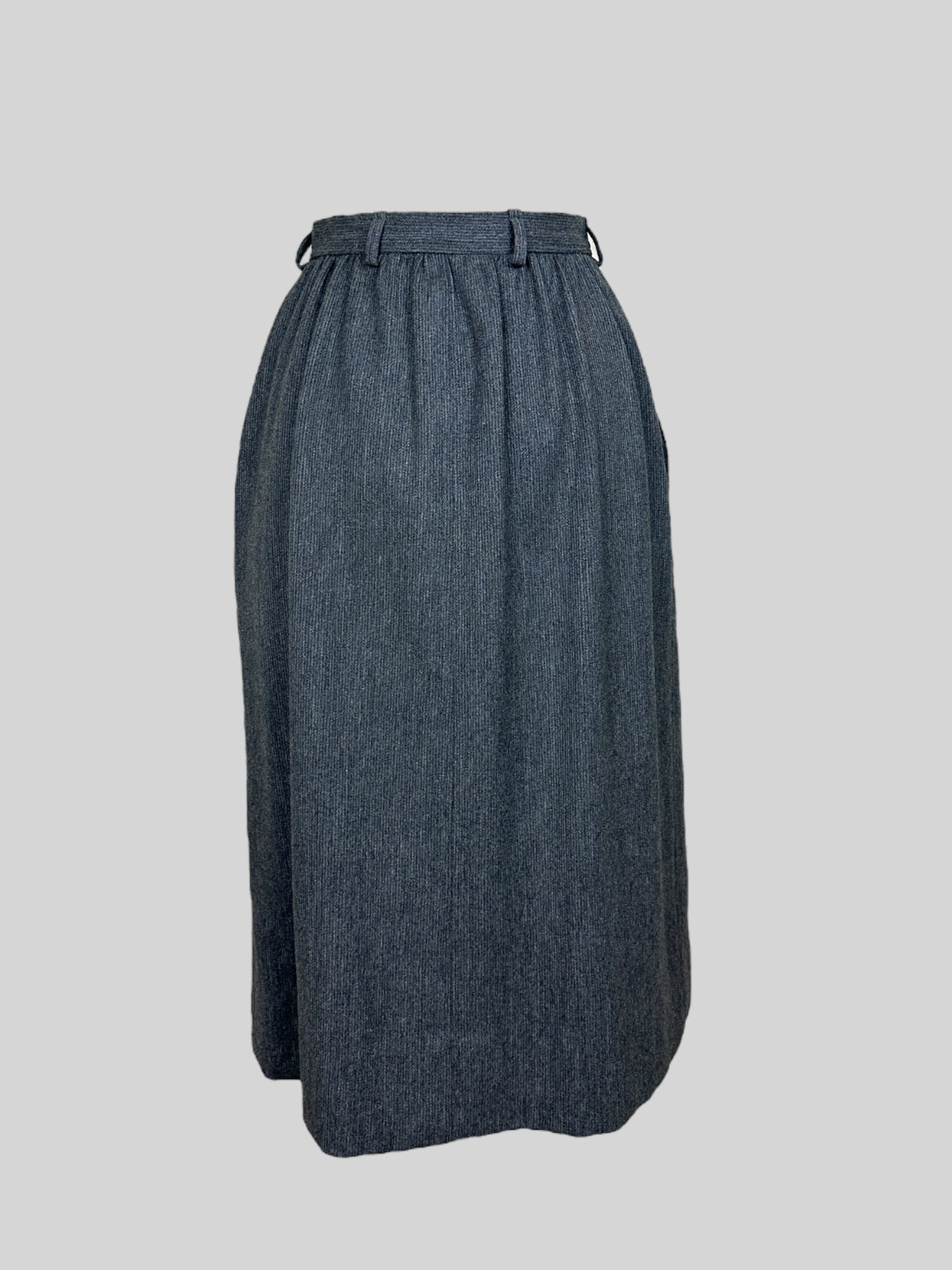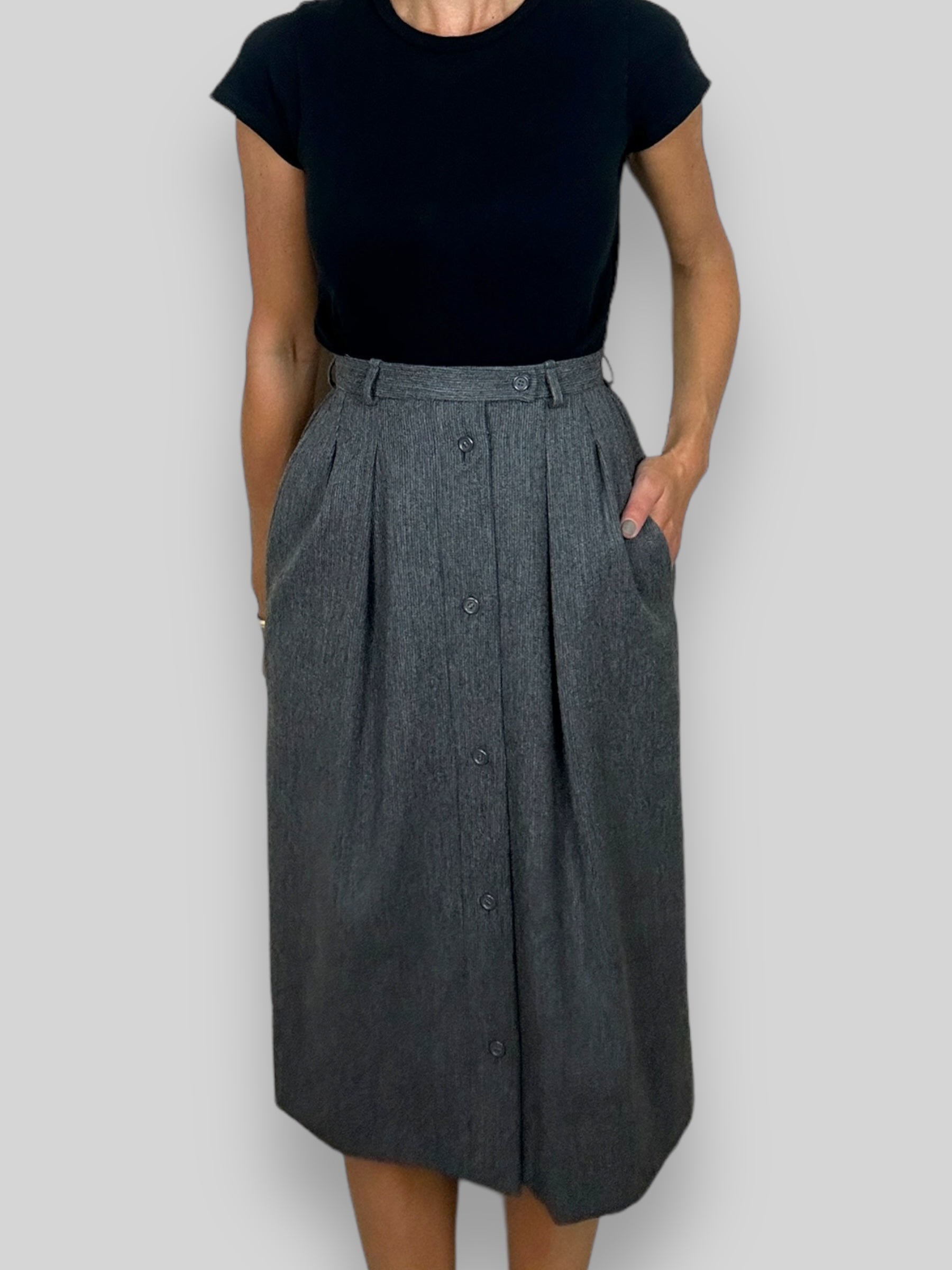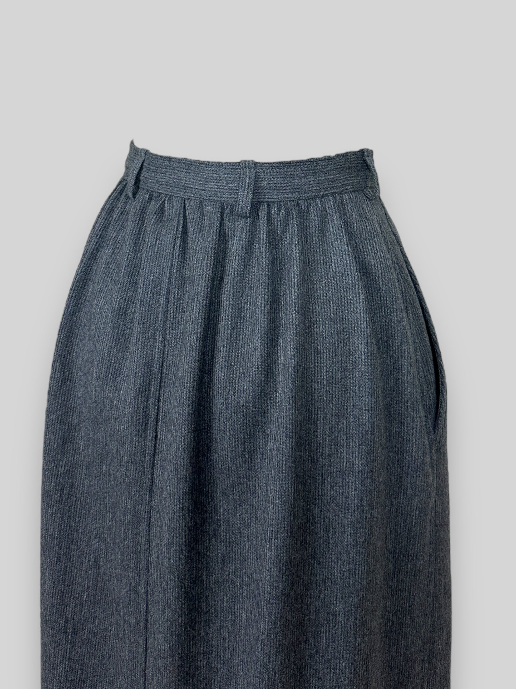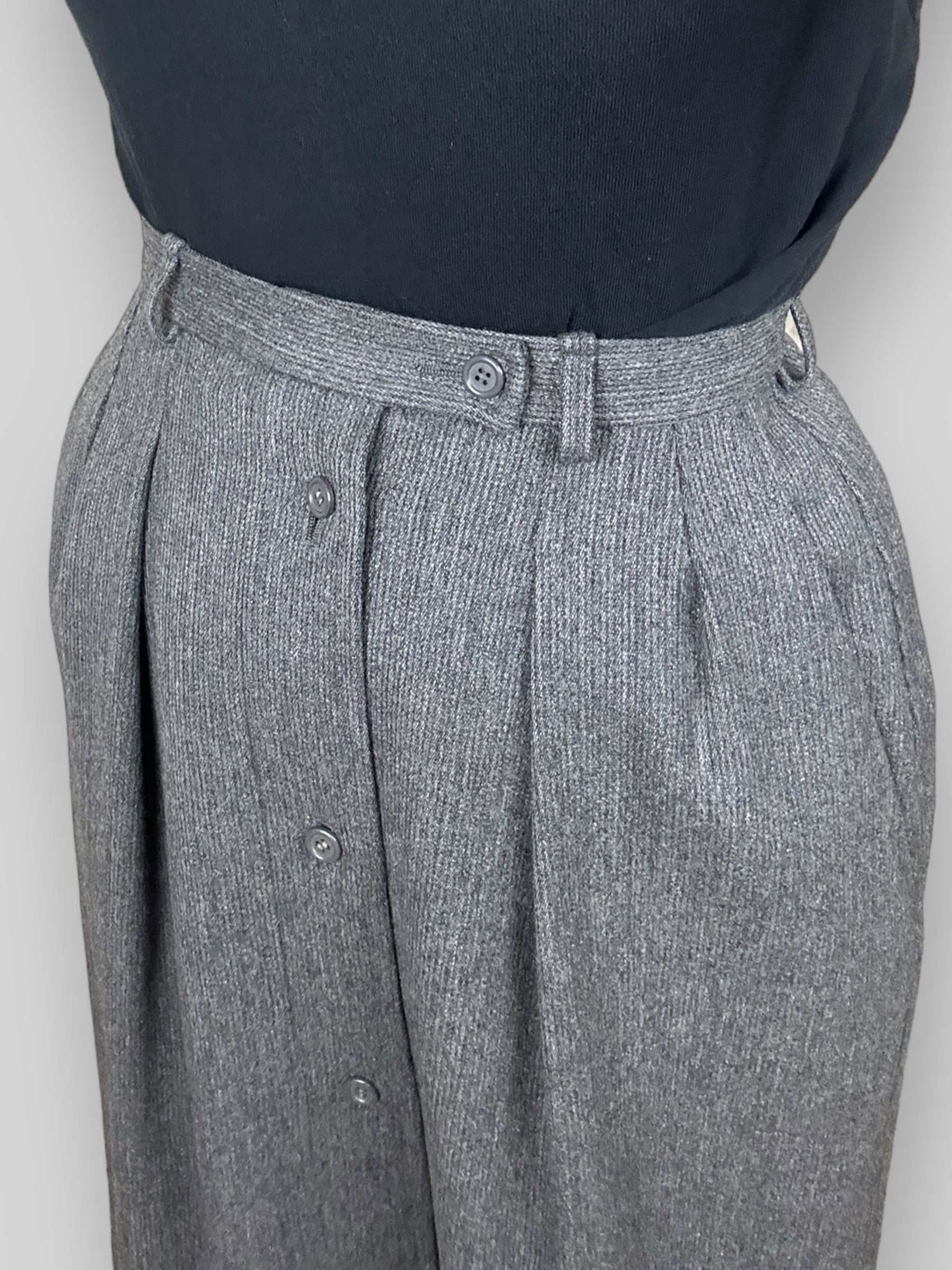 Vintage 90s Yves Saint Laurent Grey Midi Skirt. This vintage Yves Saint Laurent grey skirt is a true statement piece, crafted with the impeccable tailoring. The skirt features a row of buttons that run all the way down the front, allowing you to adjust the opening to show as much or as little leg as you like. With YSL's signature attention to detail, this skirt is a must-have for any vintage fashion enthusiast looking to add a piece of luxury to their collection.