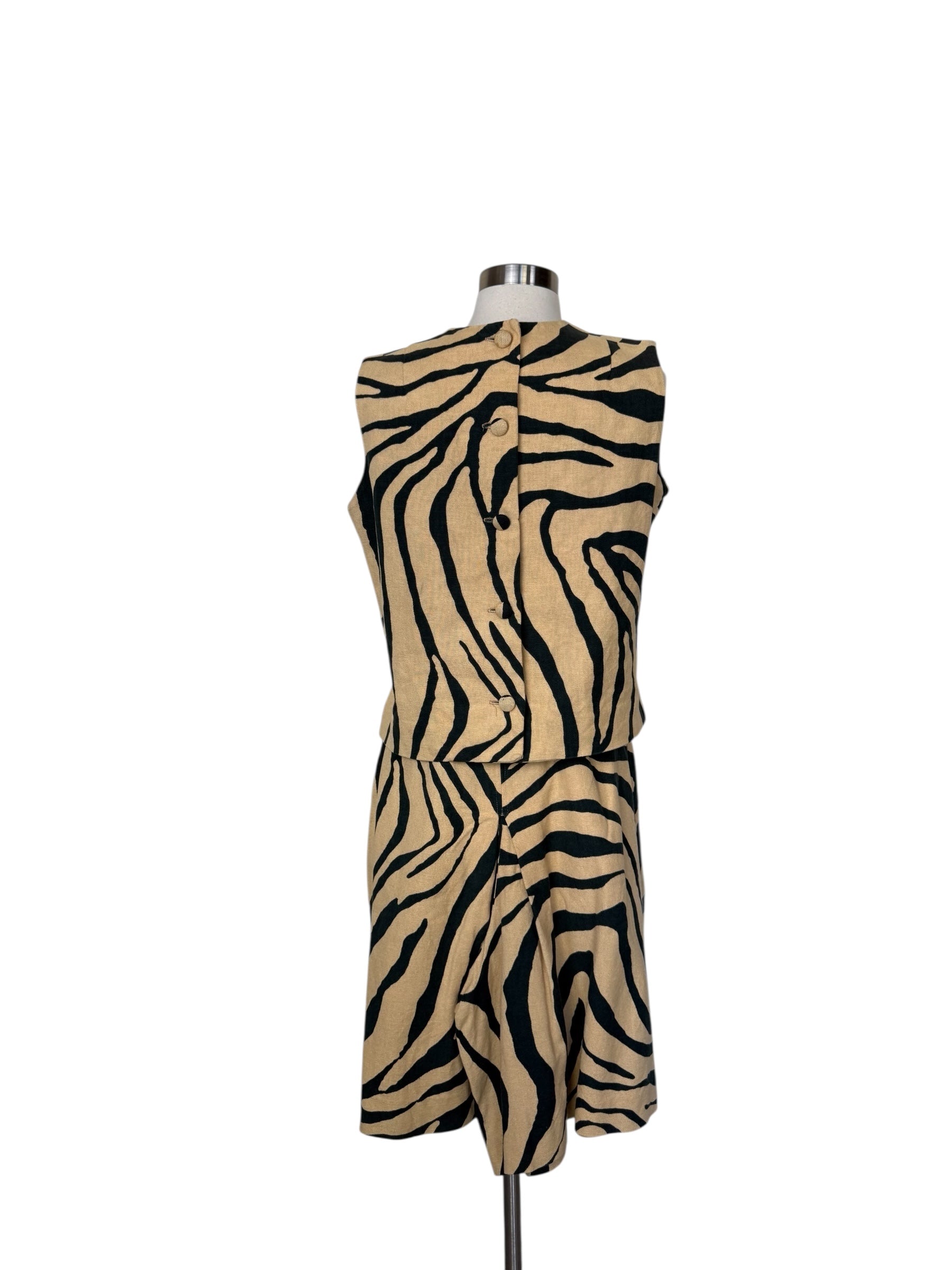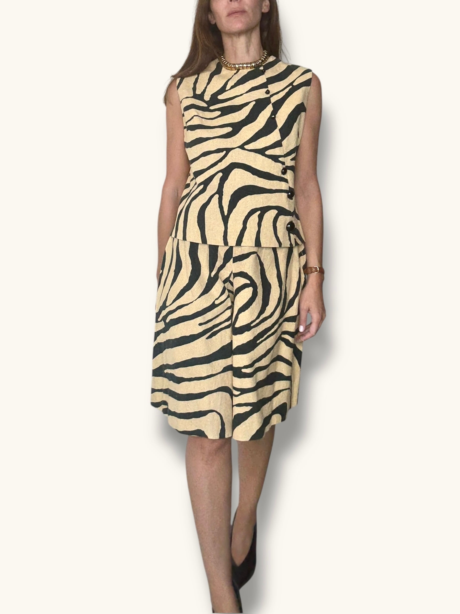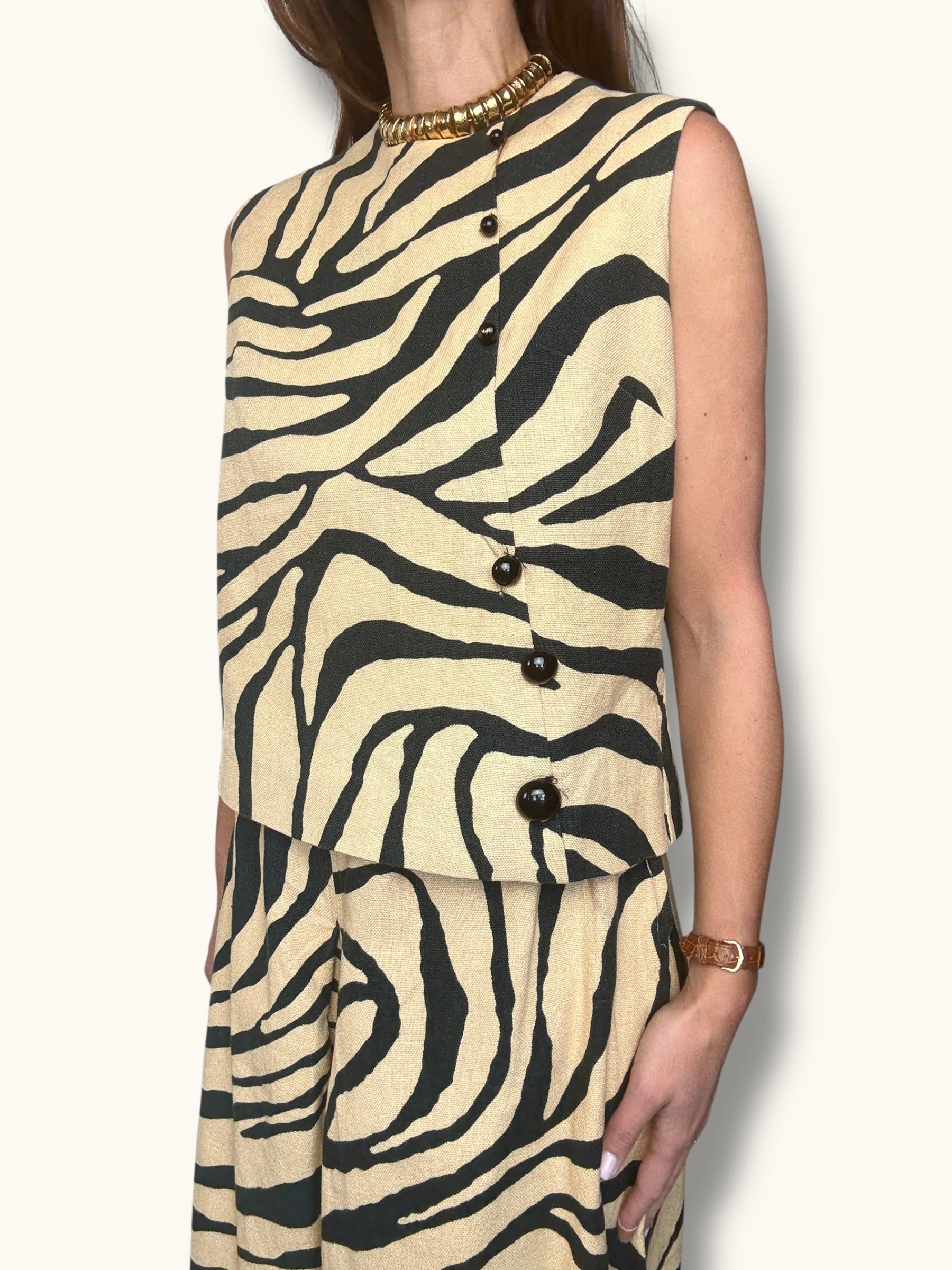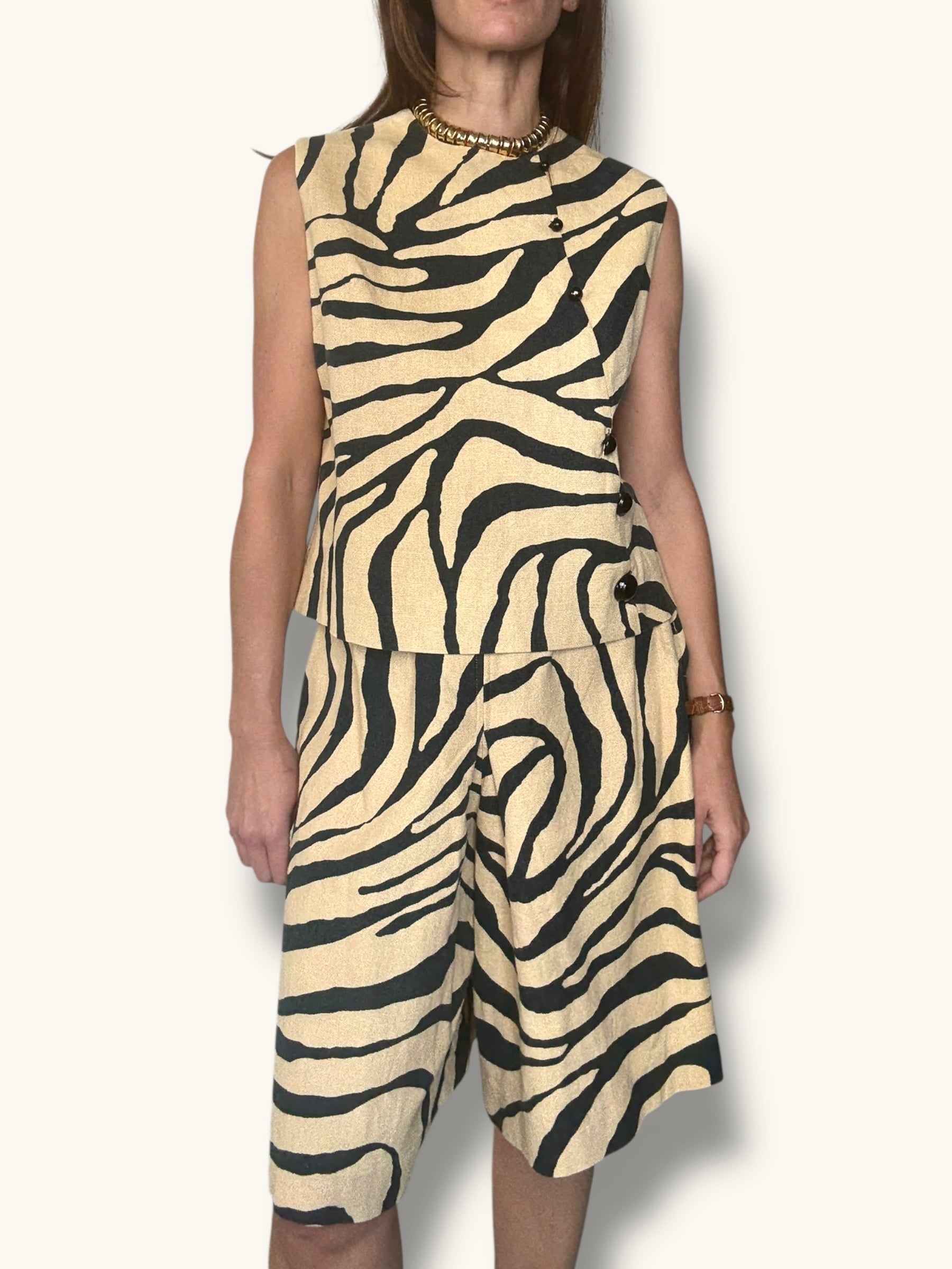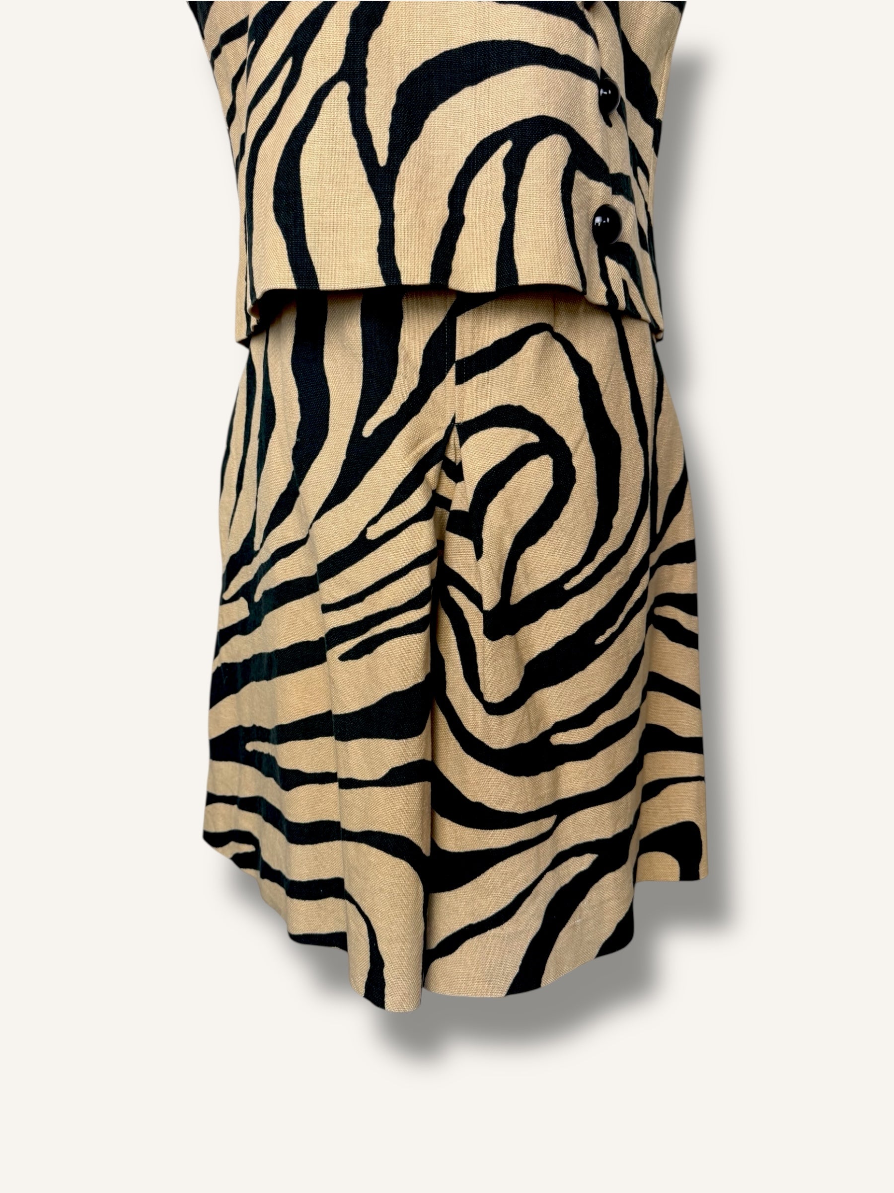 Two-piece vintage set in a bold zebra print. Made from 100% linen, this set includes a sleeveless top with an asymmetrical button front and additional button closure at the back, paired with high-waisted pleated bermuda shorts featuring a side zipper closure. Easy to style together or separately, it’s a versatile statement look with a classic cut.